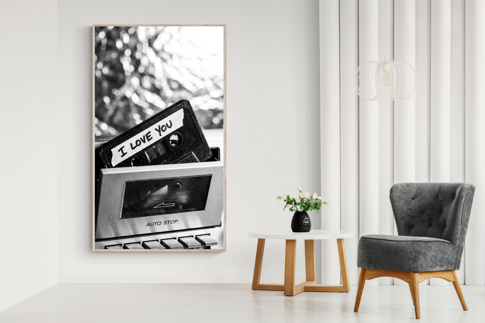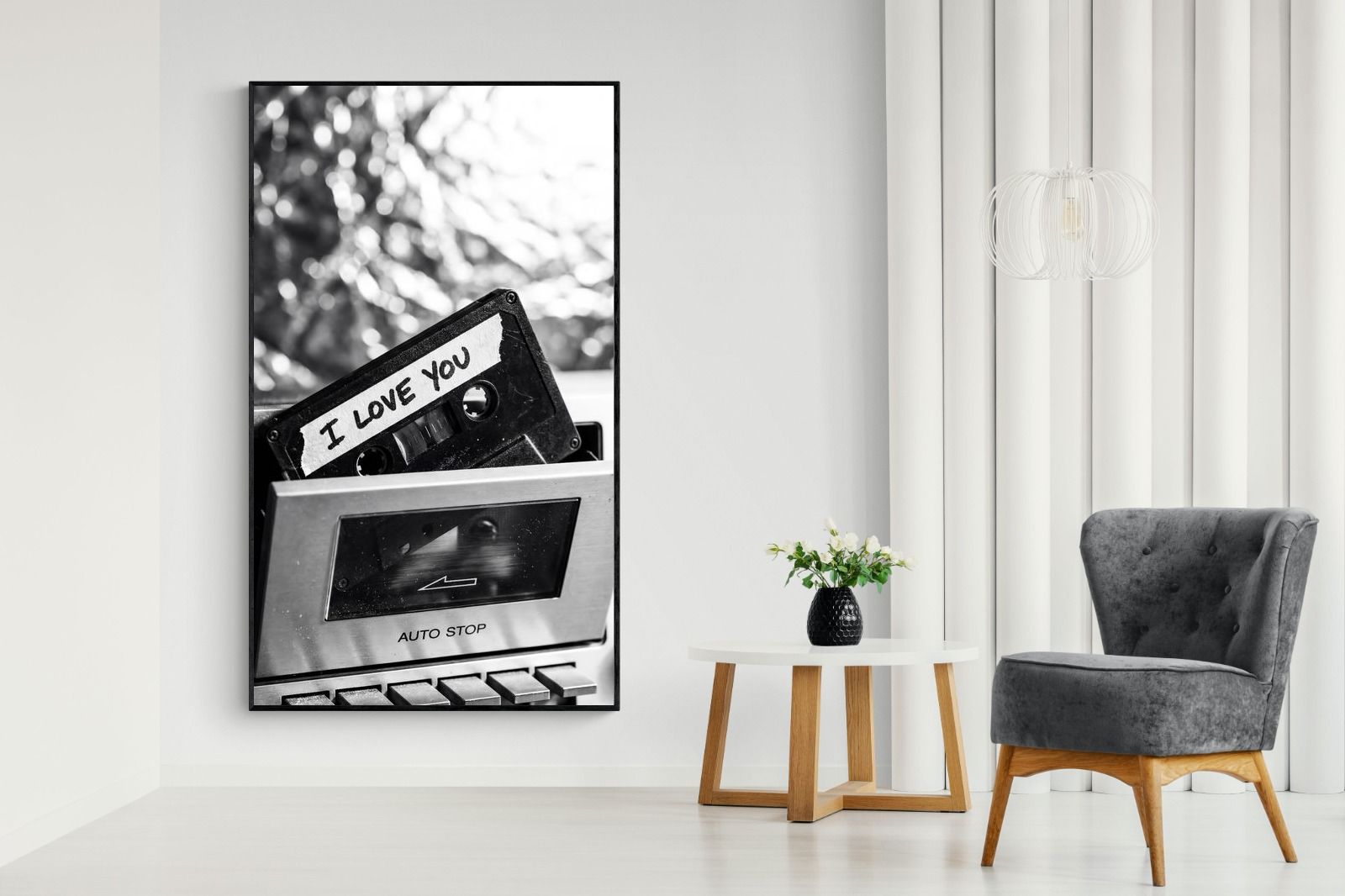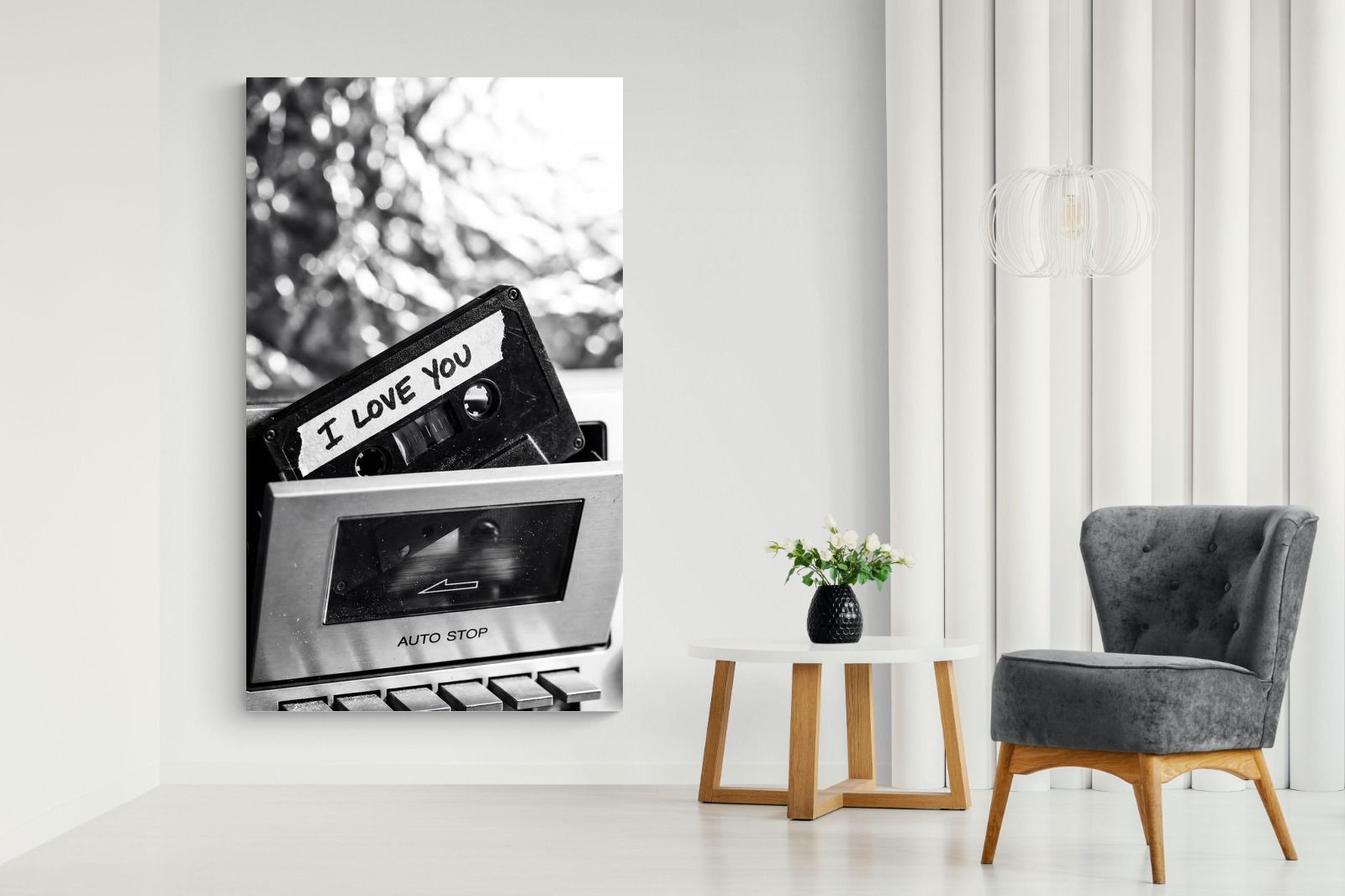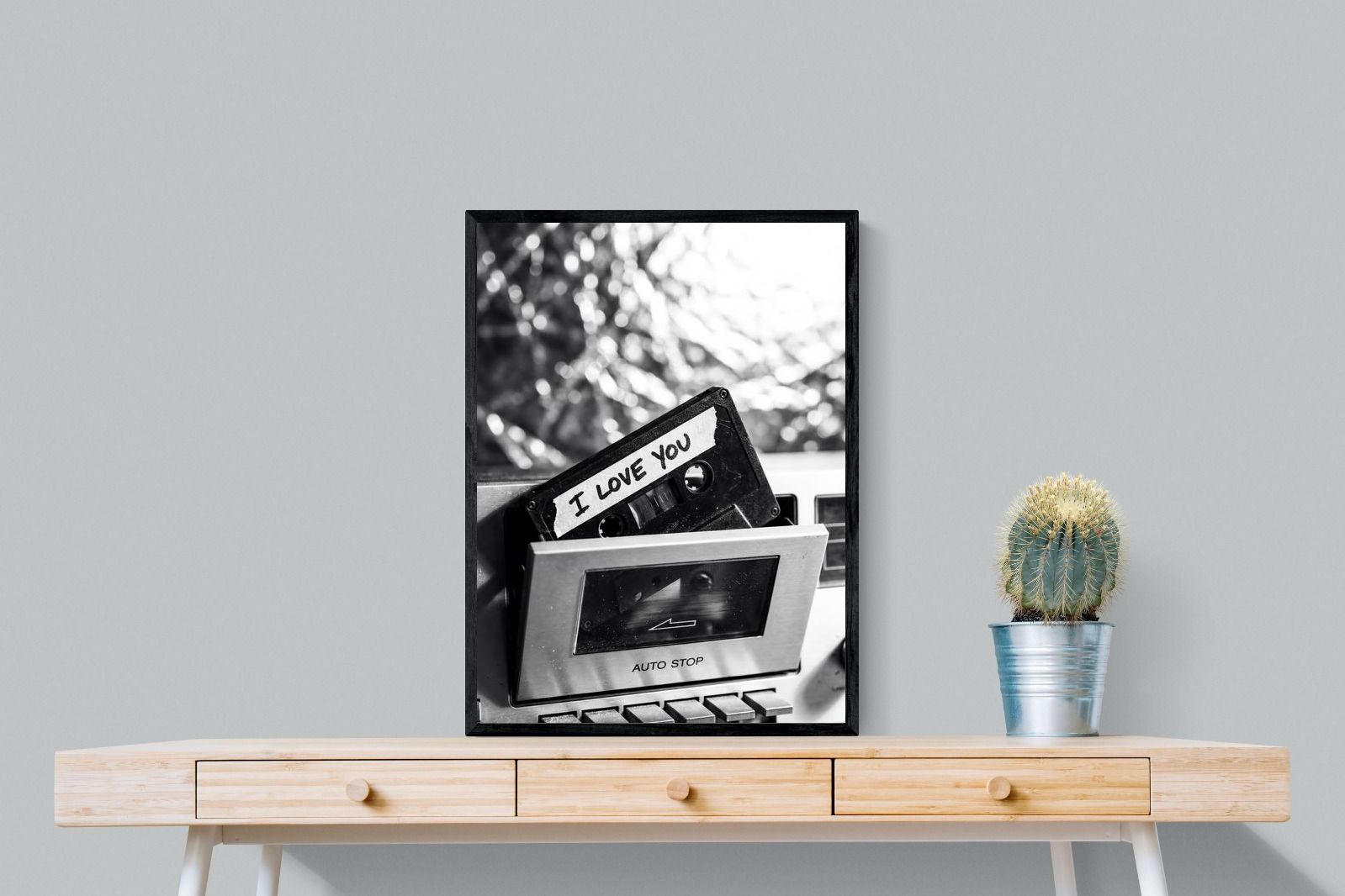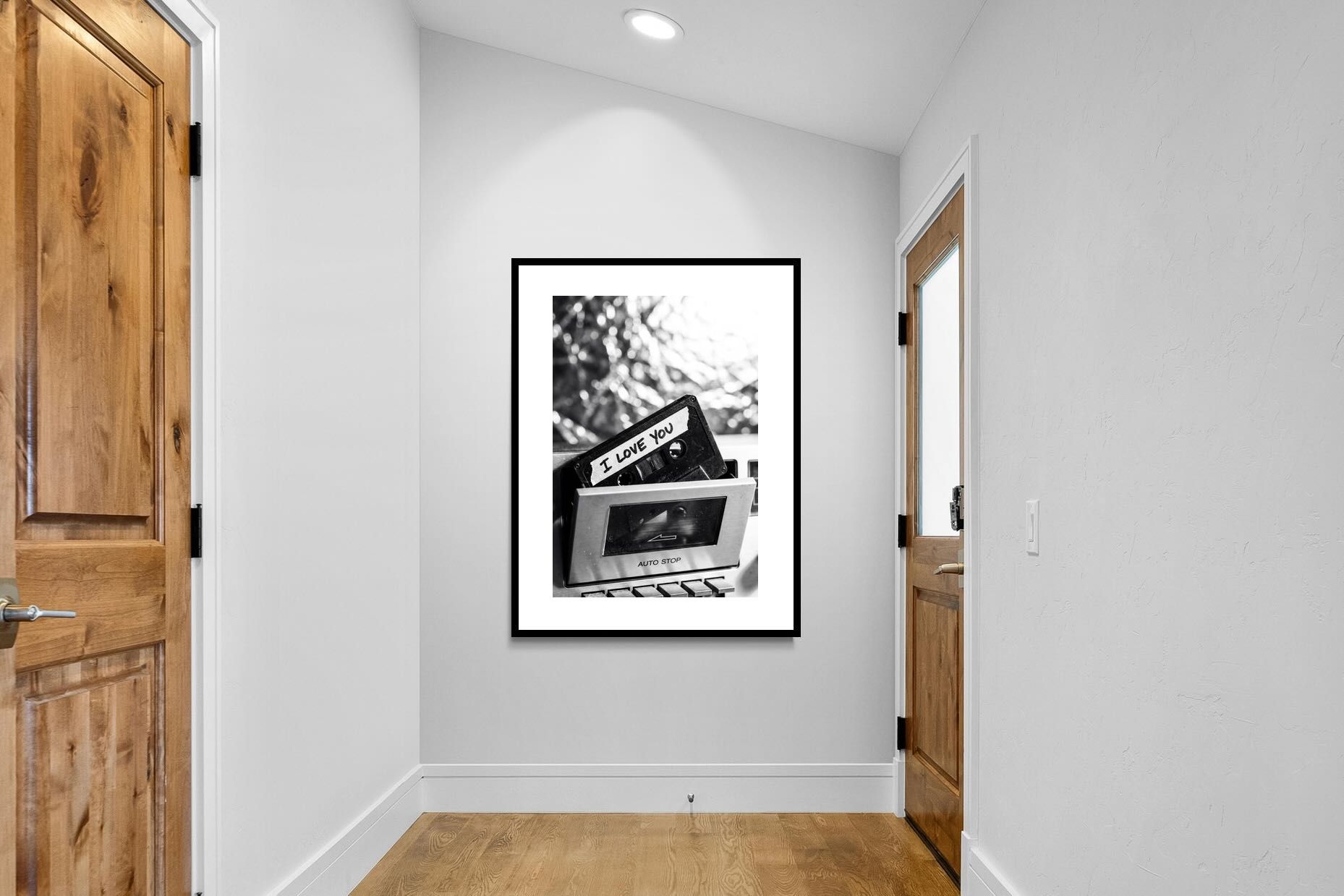 A nostalgic black-and-white photograph of a cassette tape labelled “I Love You” sliding into a retro tape deck. The grainy textures and soft highlights capture the tactile charm of analogue music culture, recalling an era when playlists were handmade and deeply personal. Perfect for music lovers and retro enthusiasts, the image carries both romance and nostalgia. It suits modern, industrial and eclectic interiors where vintage technology and storytelling photography bring personality to the space.