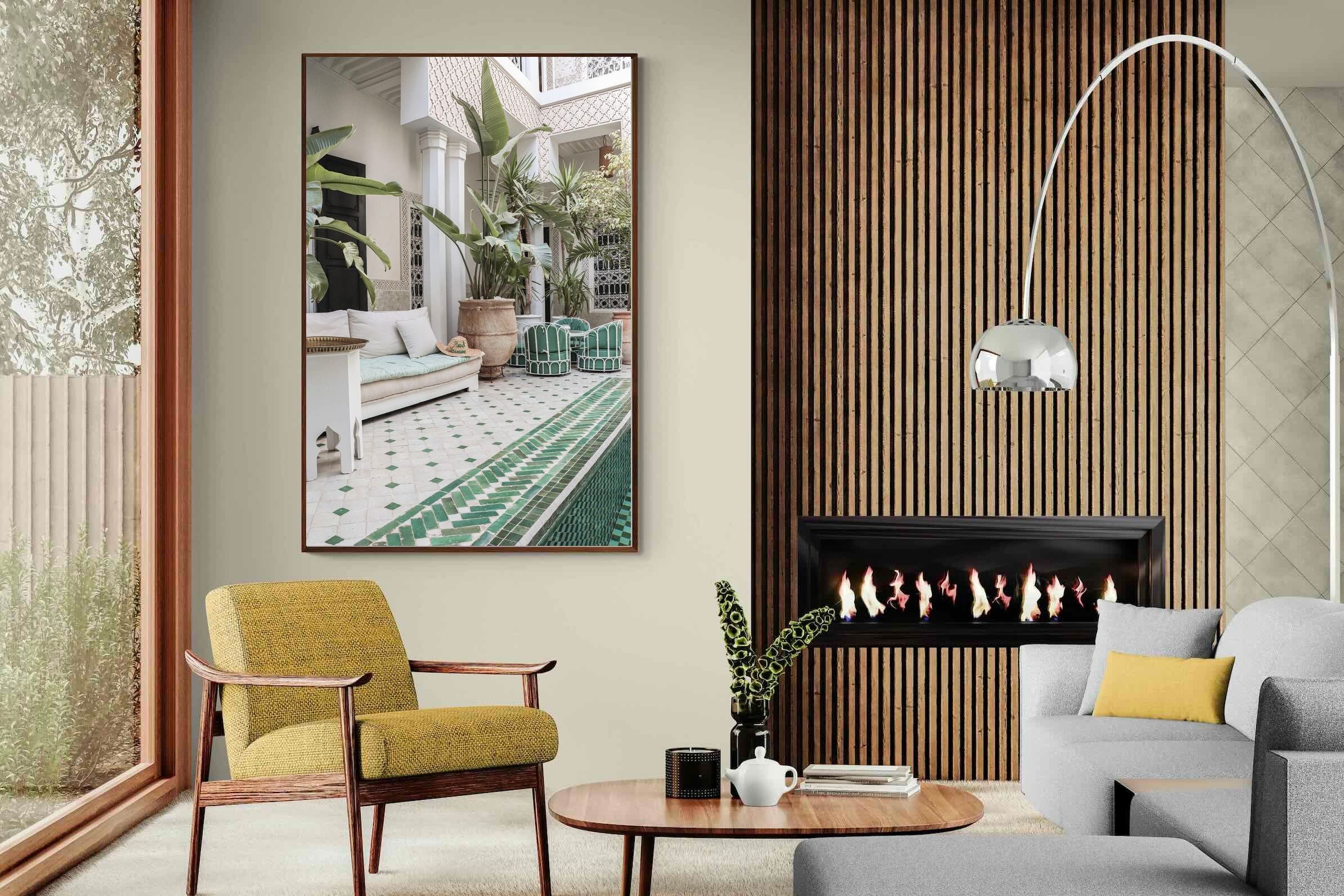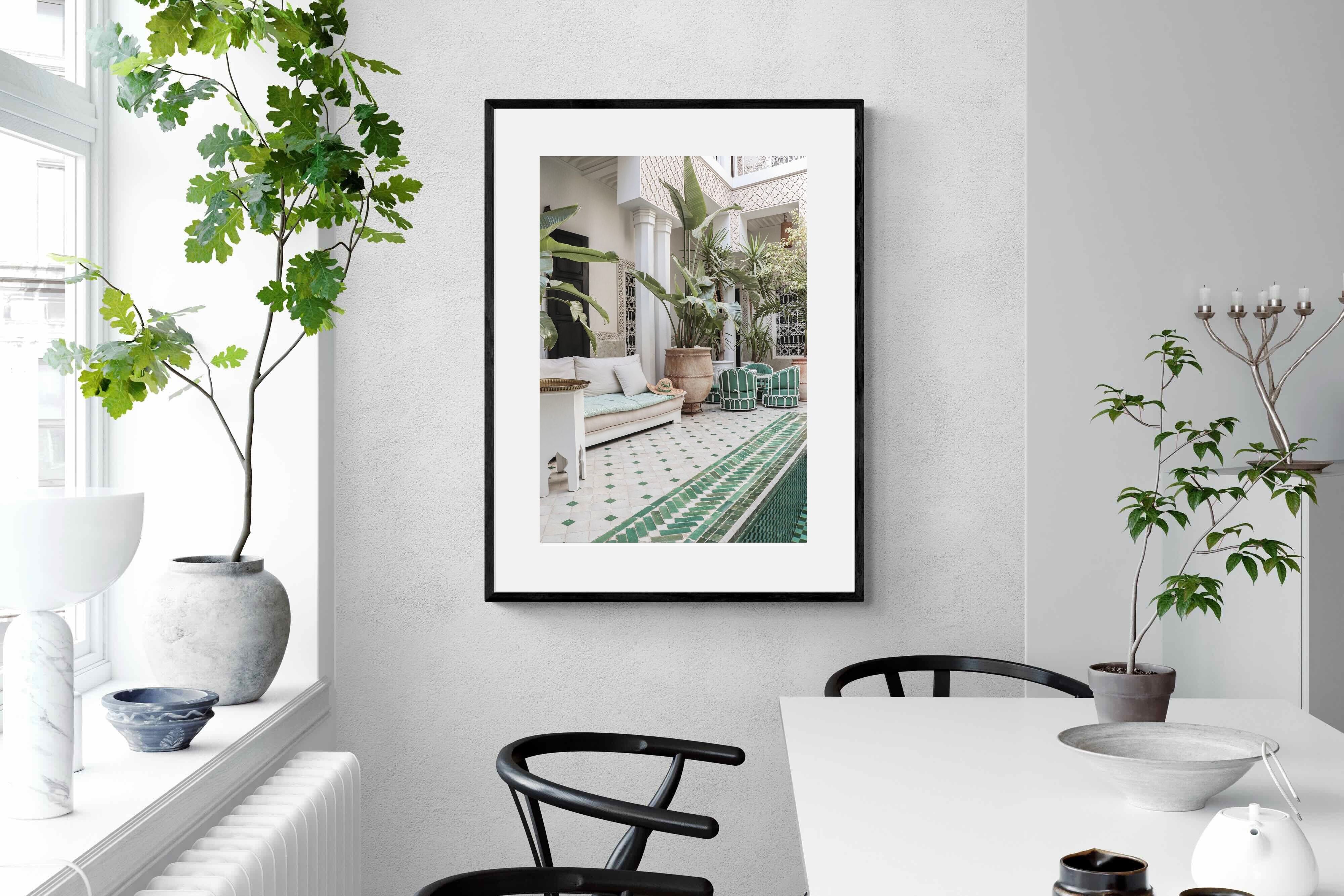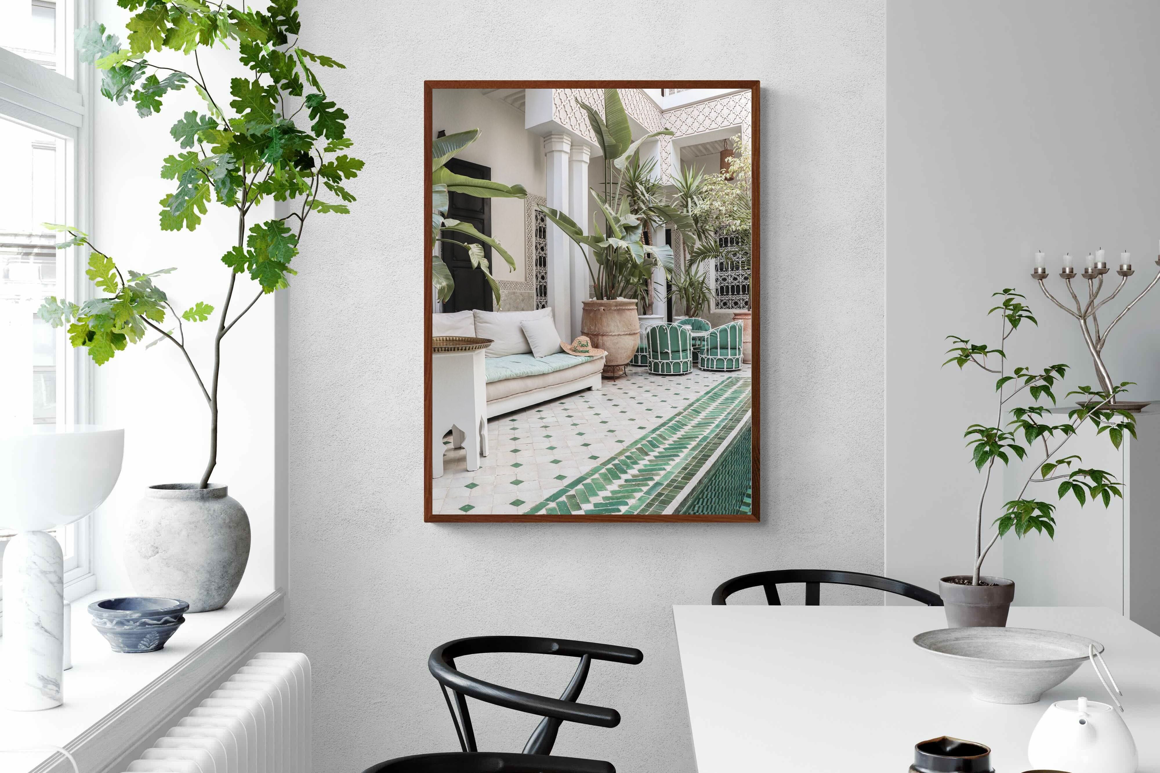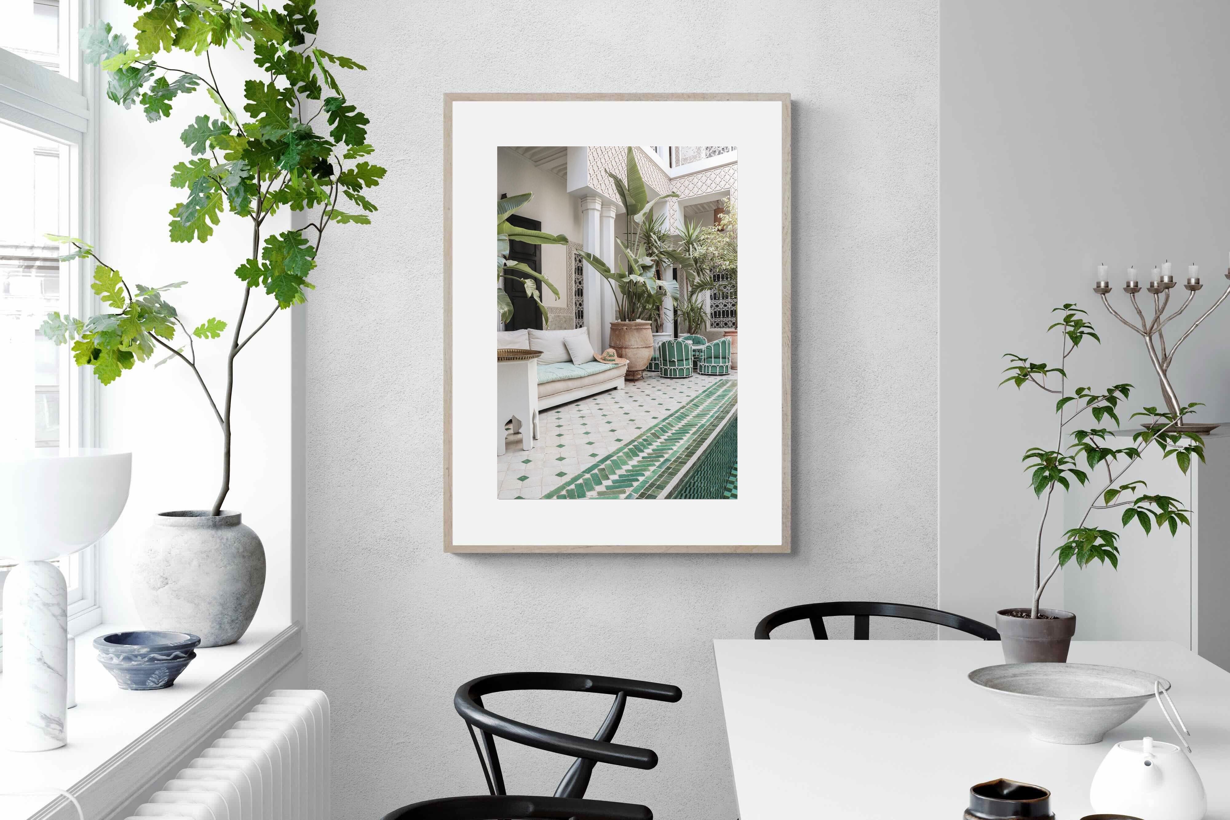 A serene Moroccan courtyard unfolds with carved plaster details, lush palms and geometric green tiling framing a tranquil pool. Soft neutral tones meet vibrant greenery, creating a harmonious blend of architecture and nature. This elegant composition brings warmth, texture and understated luxury to a space. Perfect for Mediterranean, bohemian or contemporary interiors, it works beautifully in living rooms, bedrooms or boutique-style spaces seeking calm sophistication and refined global character.