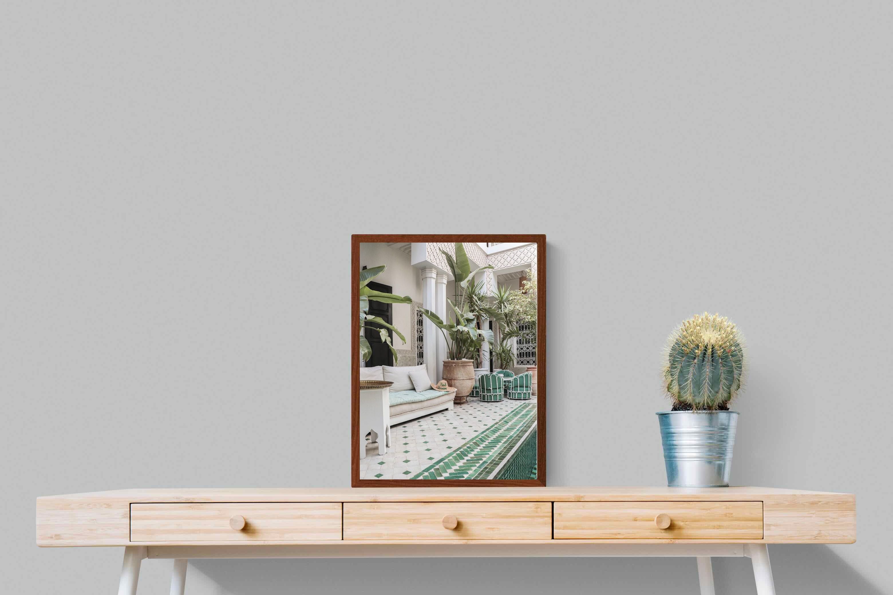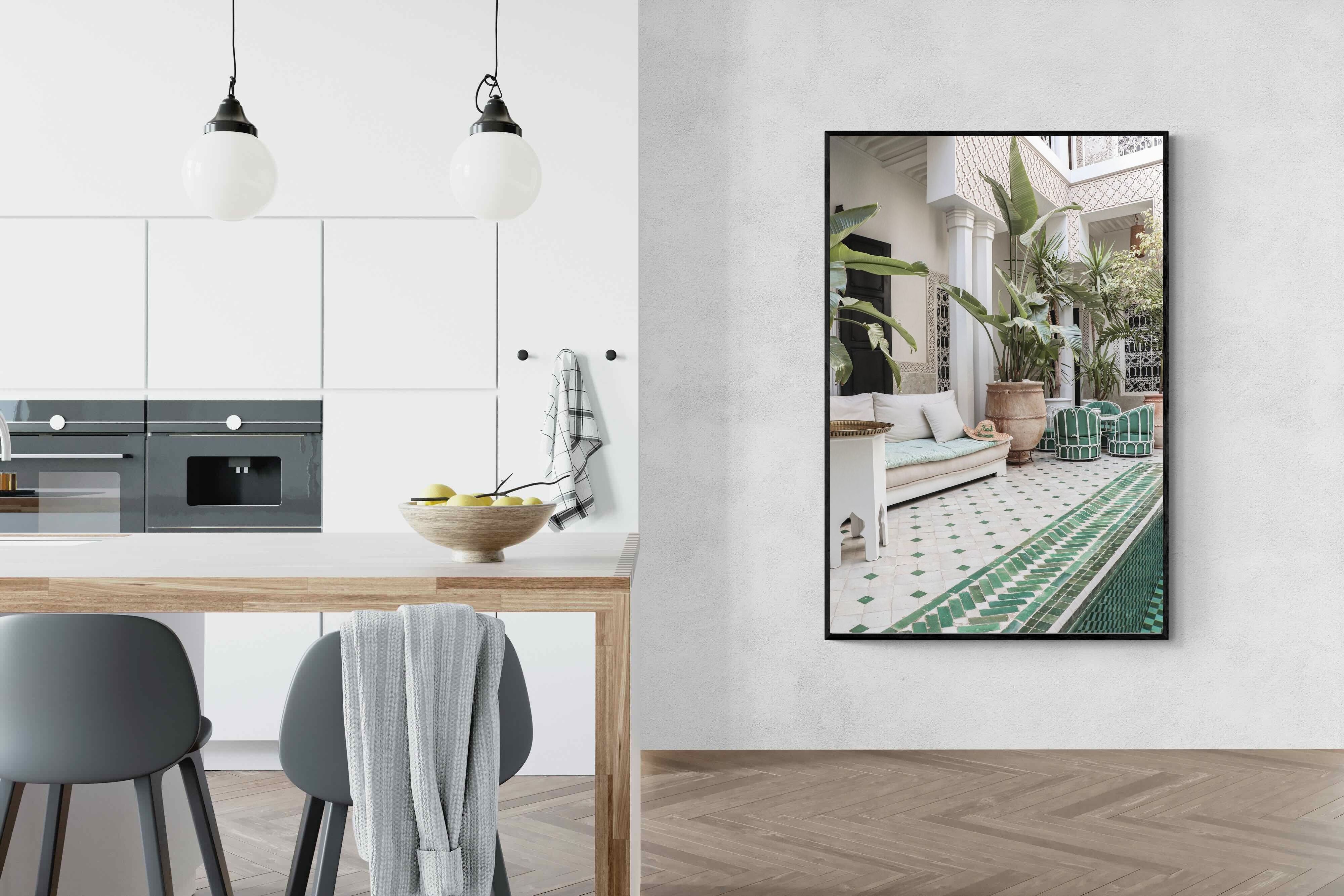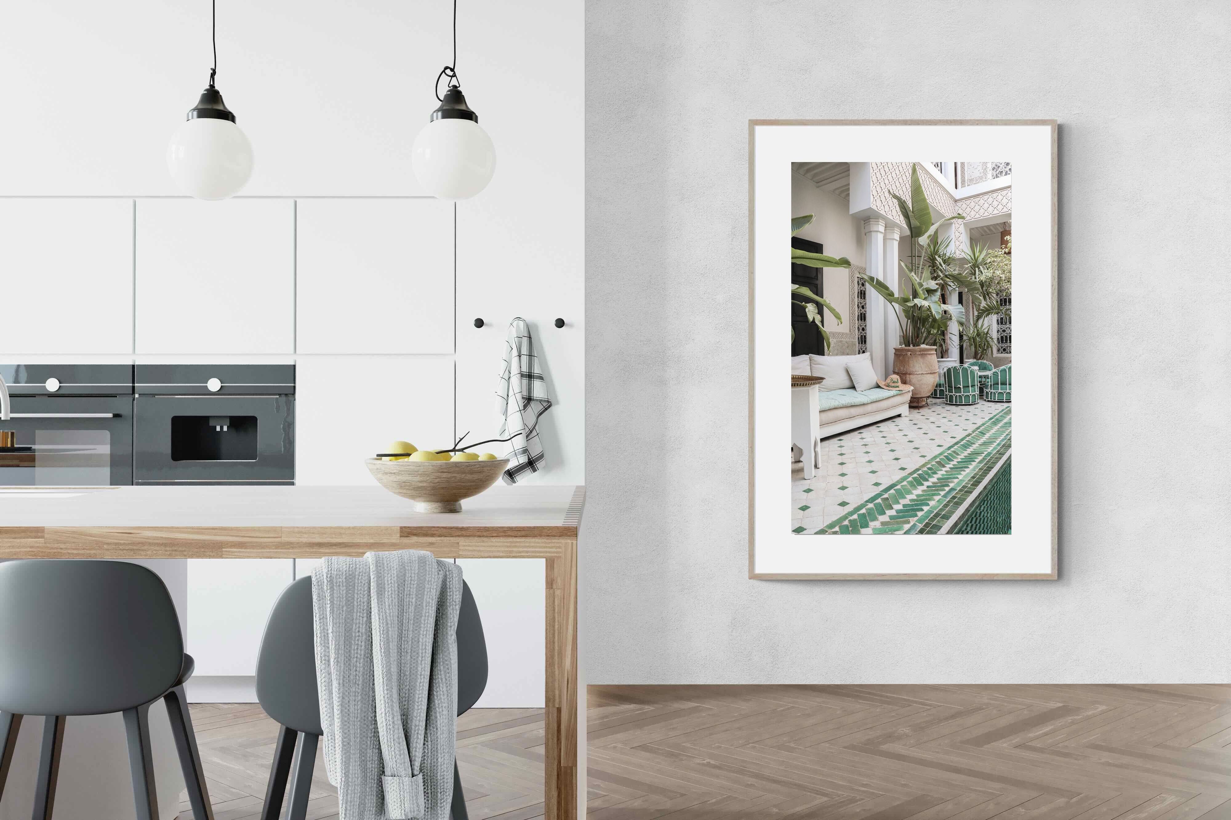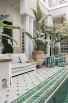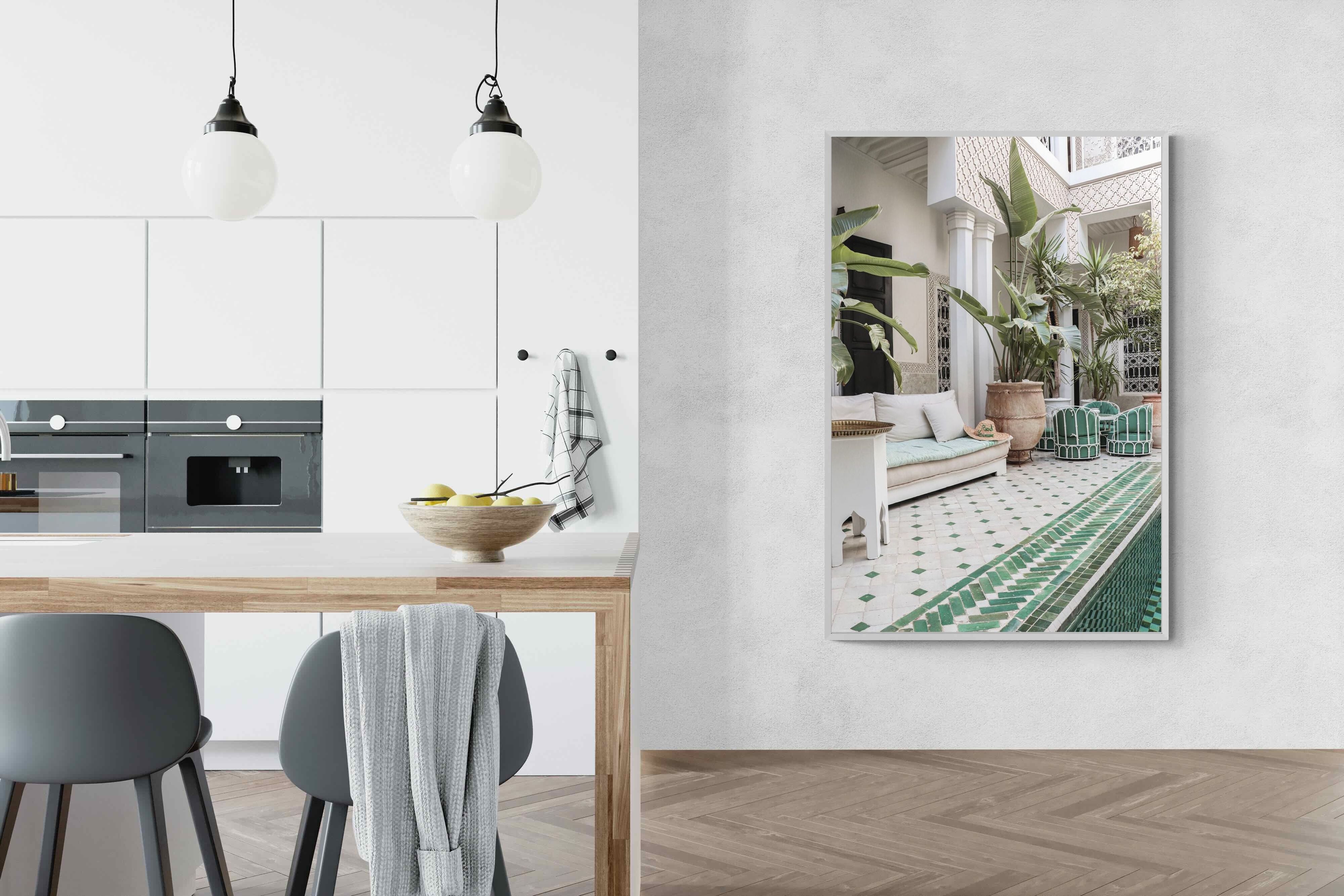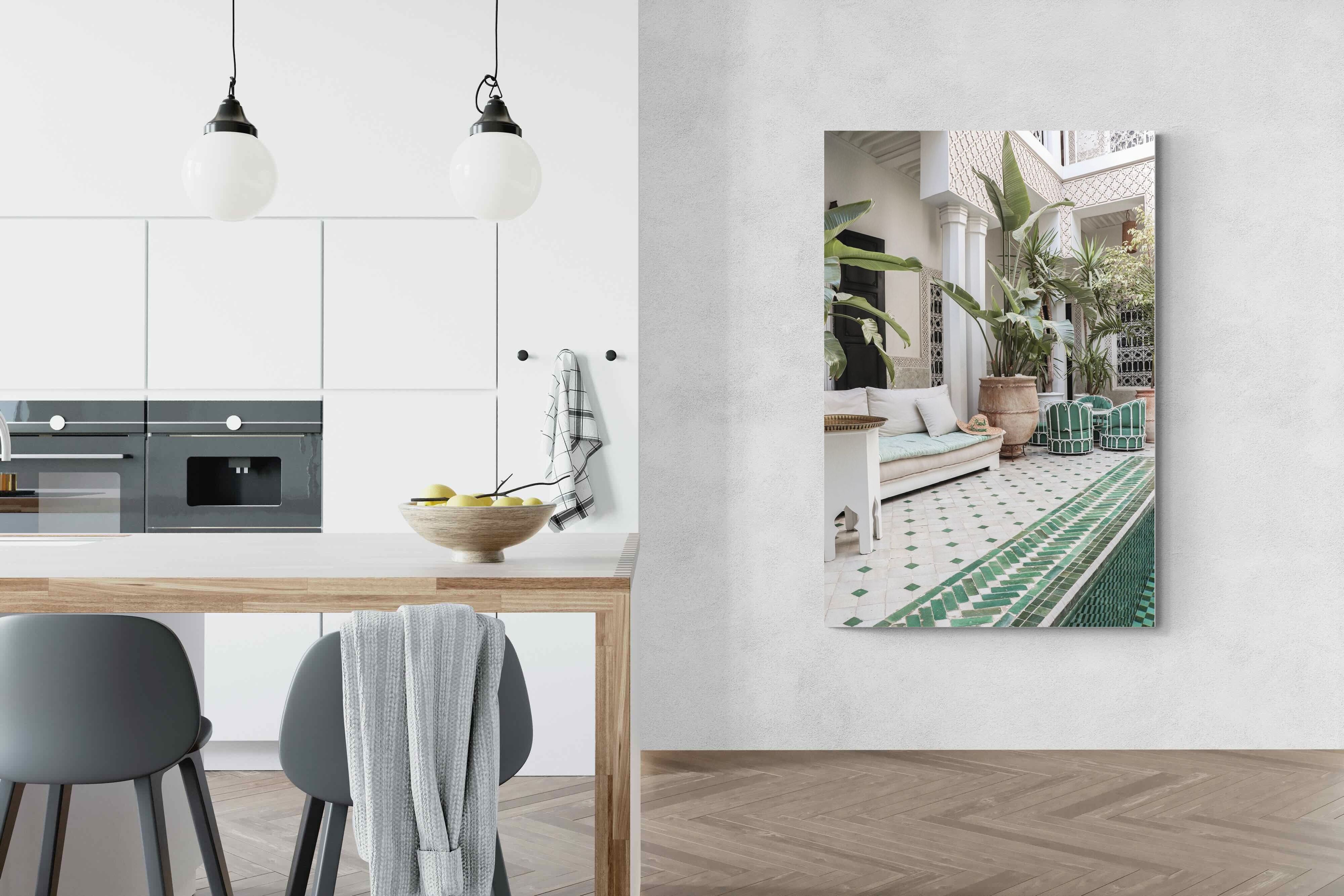 A serene Moroccan courtyard unfolds with carved plaster details, lush palms and geometric green tiling framing a tranquil pool. Soft neutral tones meet vibrant greenery, creating a harmonious blend of architecture and nature. This elegant composition brings warmth, texture and understated luxury to a space. Perfect for Mediterranean, bohemian or contemporary interiors, it works beautifully in living rooms, bedrooms or boutique-style spaces seeking calm sophistication and refined global character.