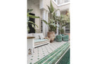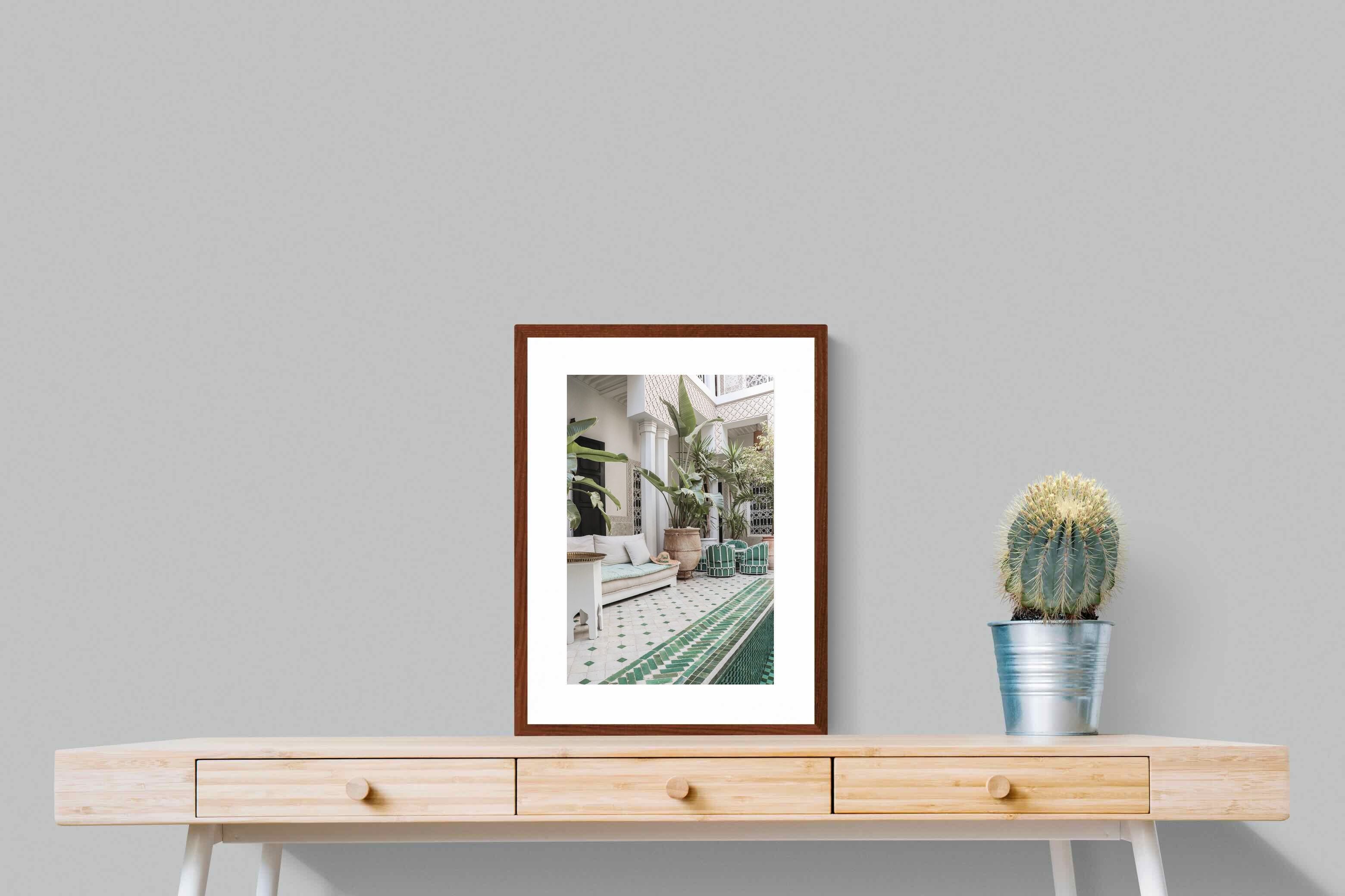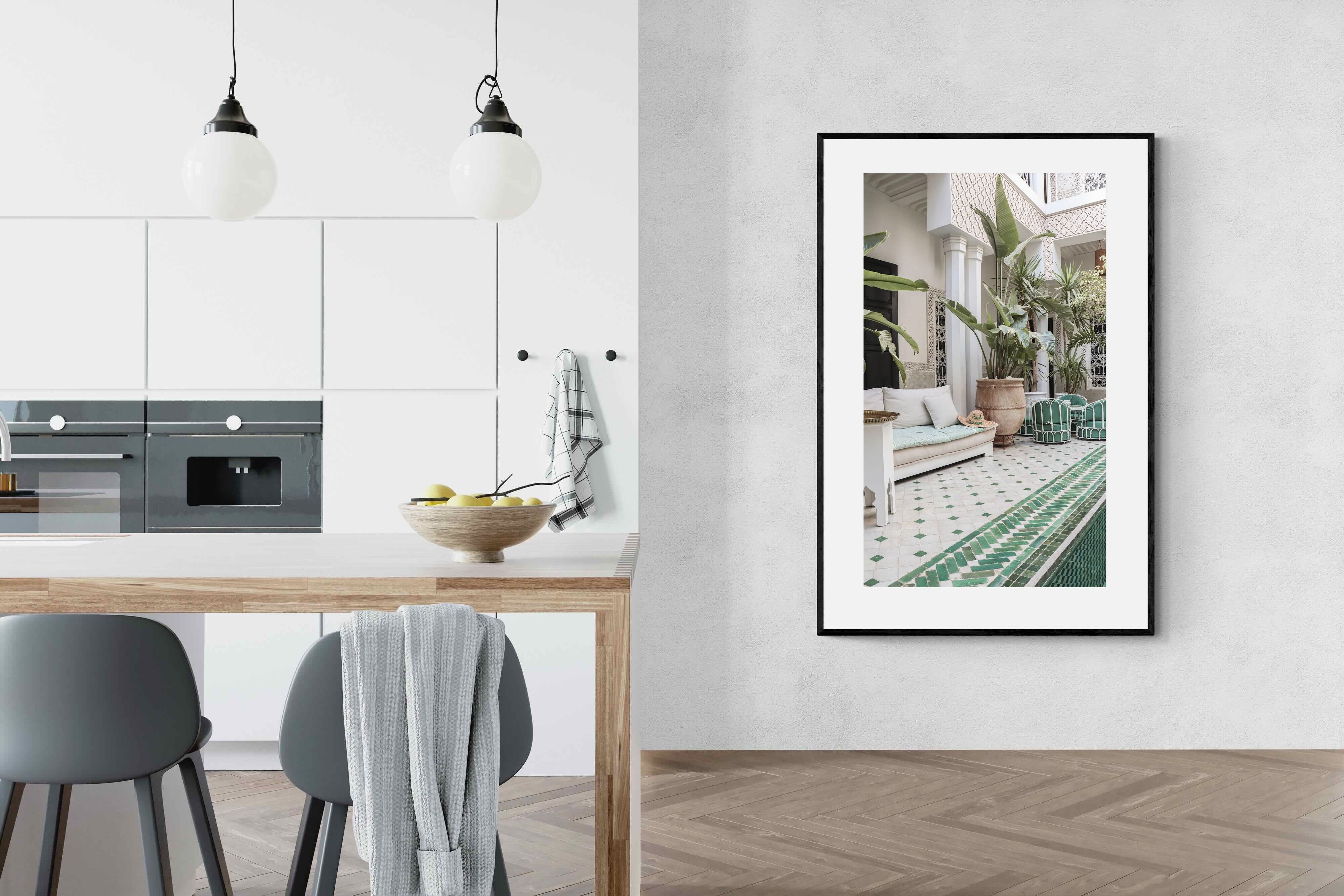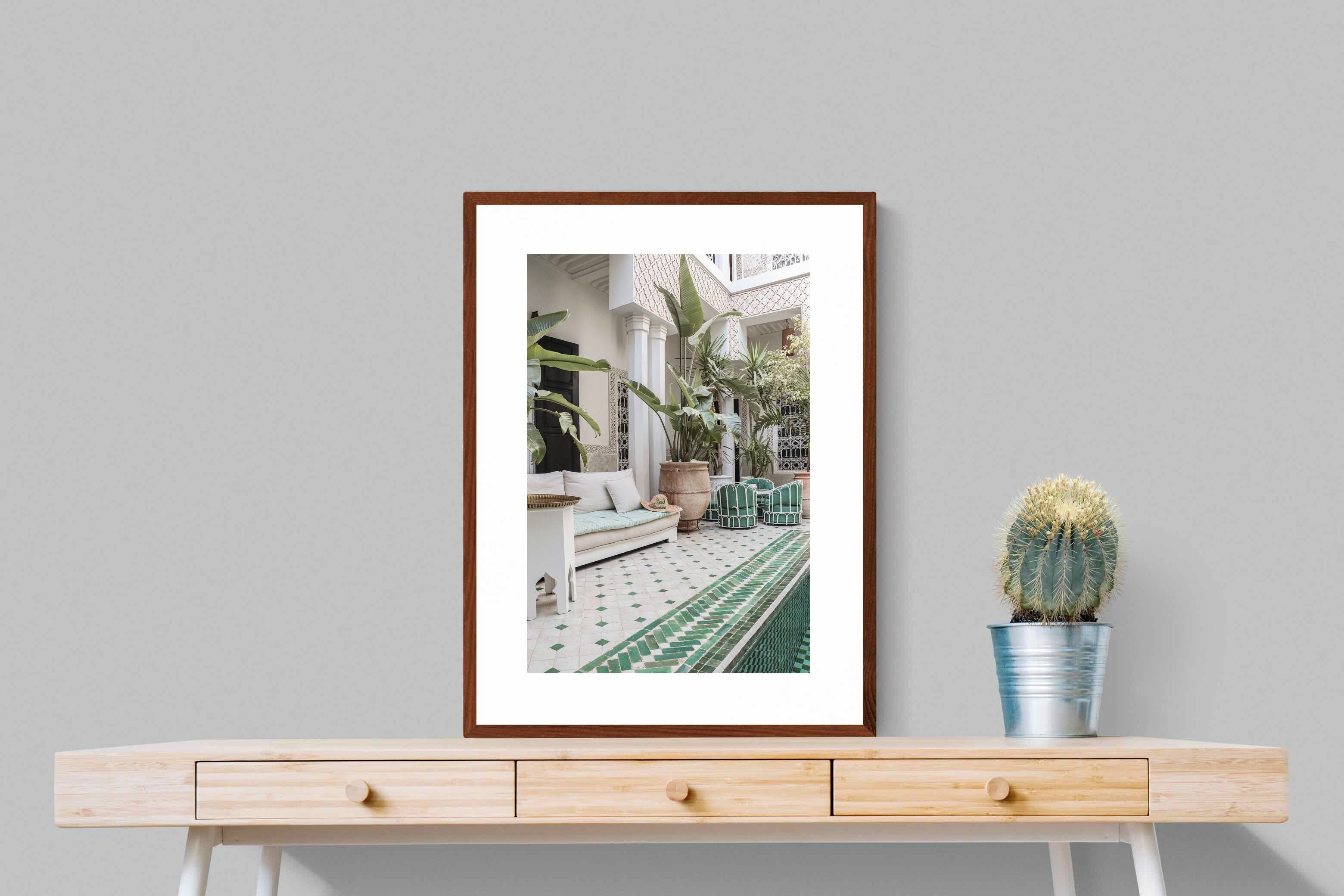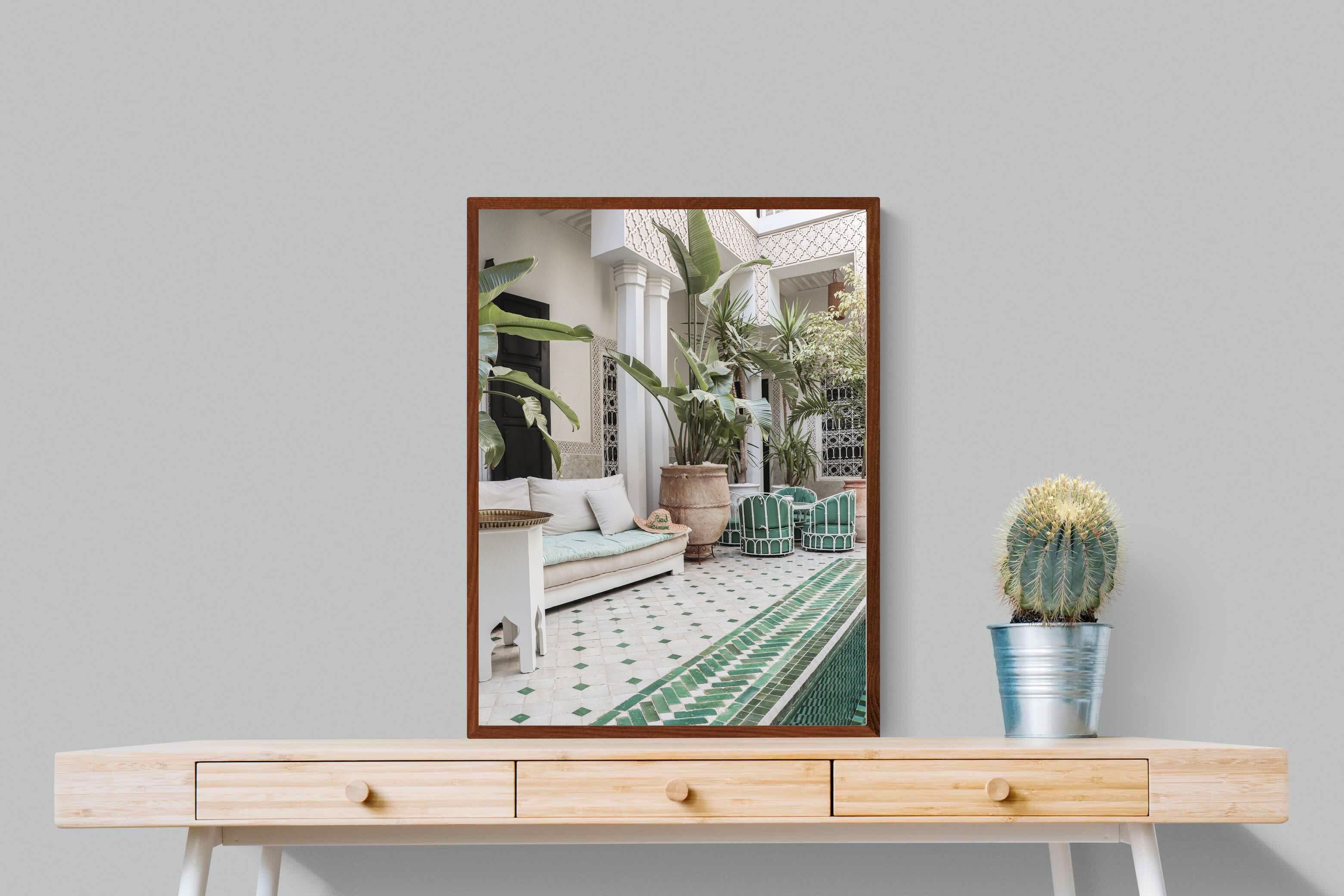 A serene Moroccan courtyard unfolds with carved plaster details, lush palms and geometric green tiling framing a tranquil pool. Soft neutral tones meet vibrant greenery, creating a harmonious blend of architecture and nature. This elegant composition brings warmth, texture and understated luxury to a space. Perfect for Mediterranean, bohemian or contemporary interiors, it works beautifully in living rooms, bedrooms or boutique-style spaces seeking calm sophistication and refined global character.