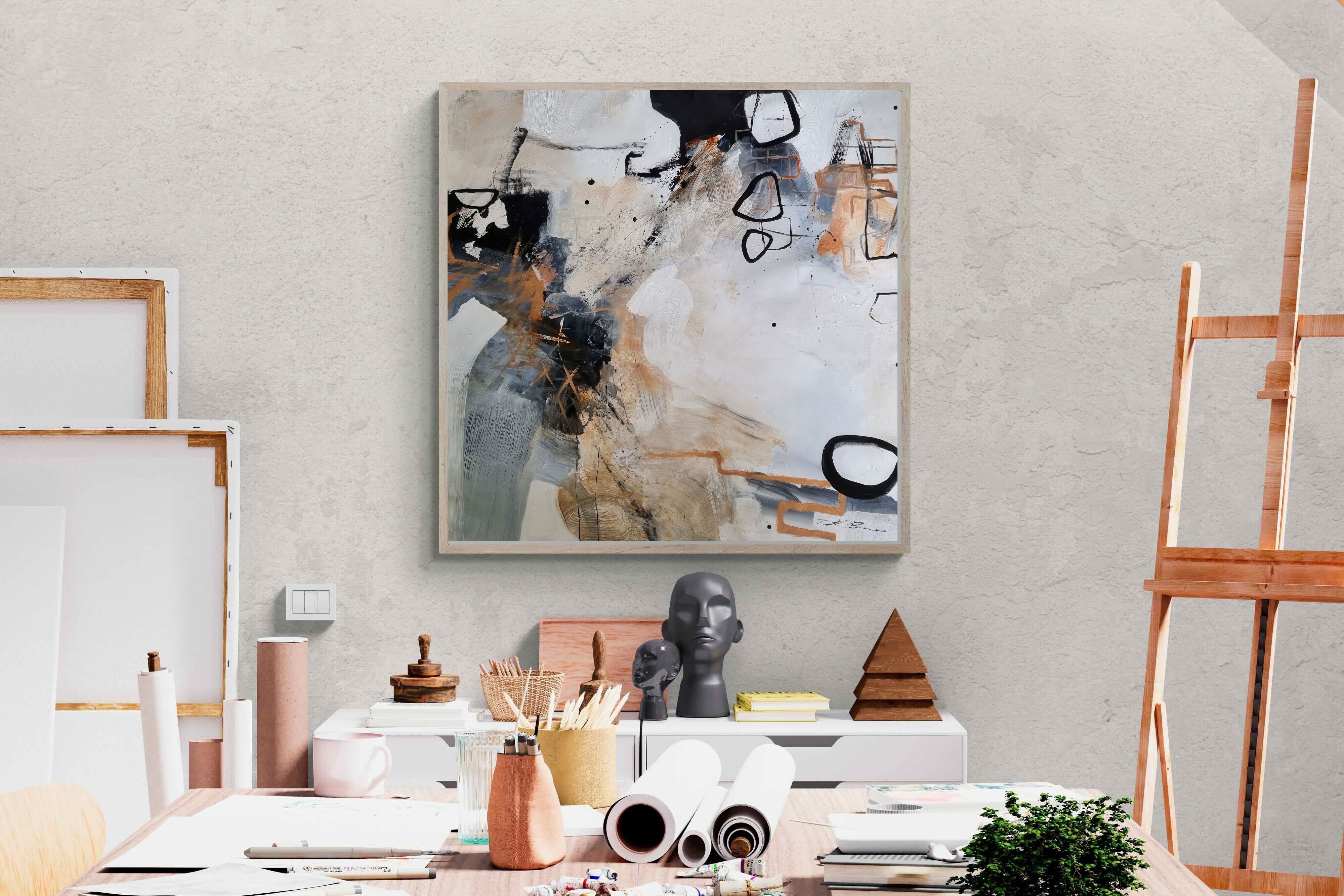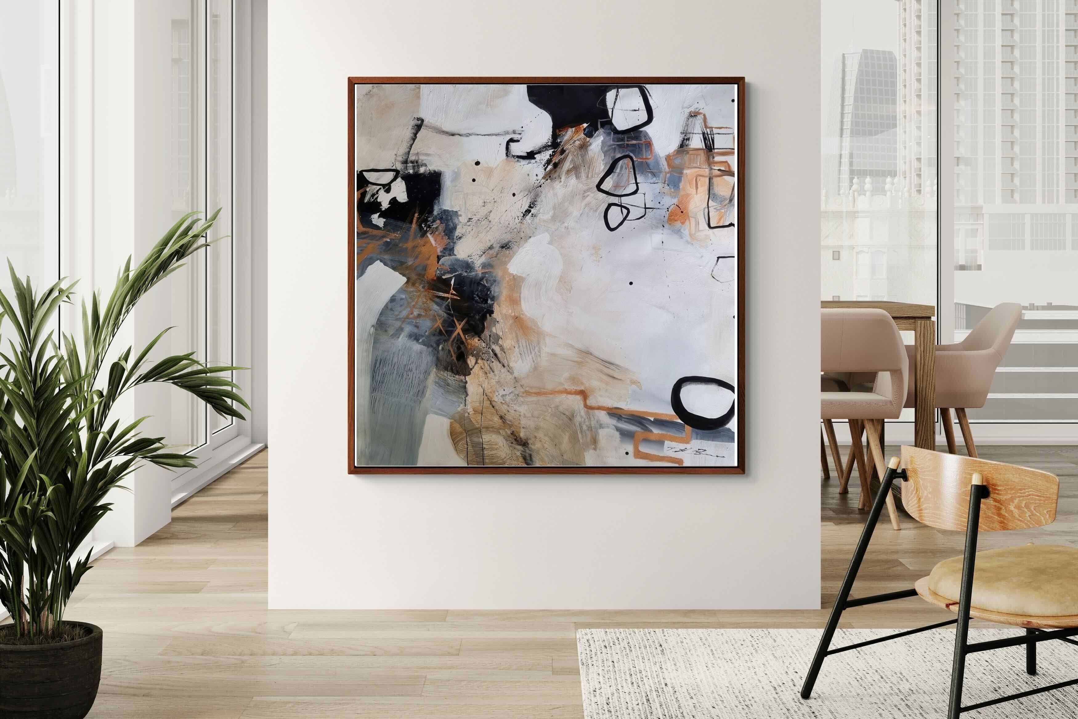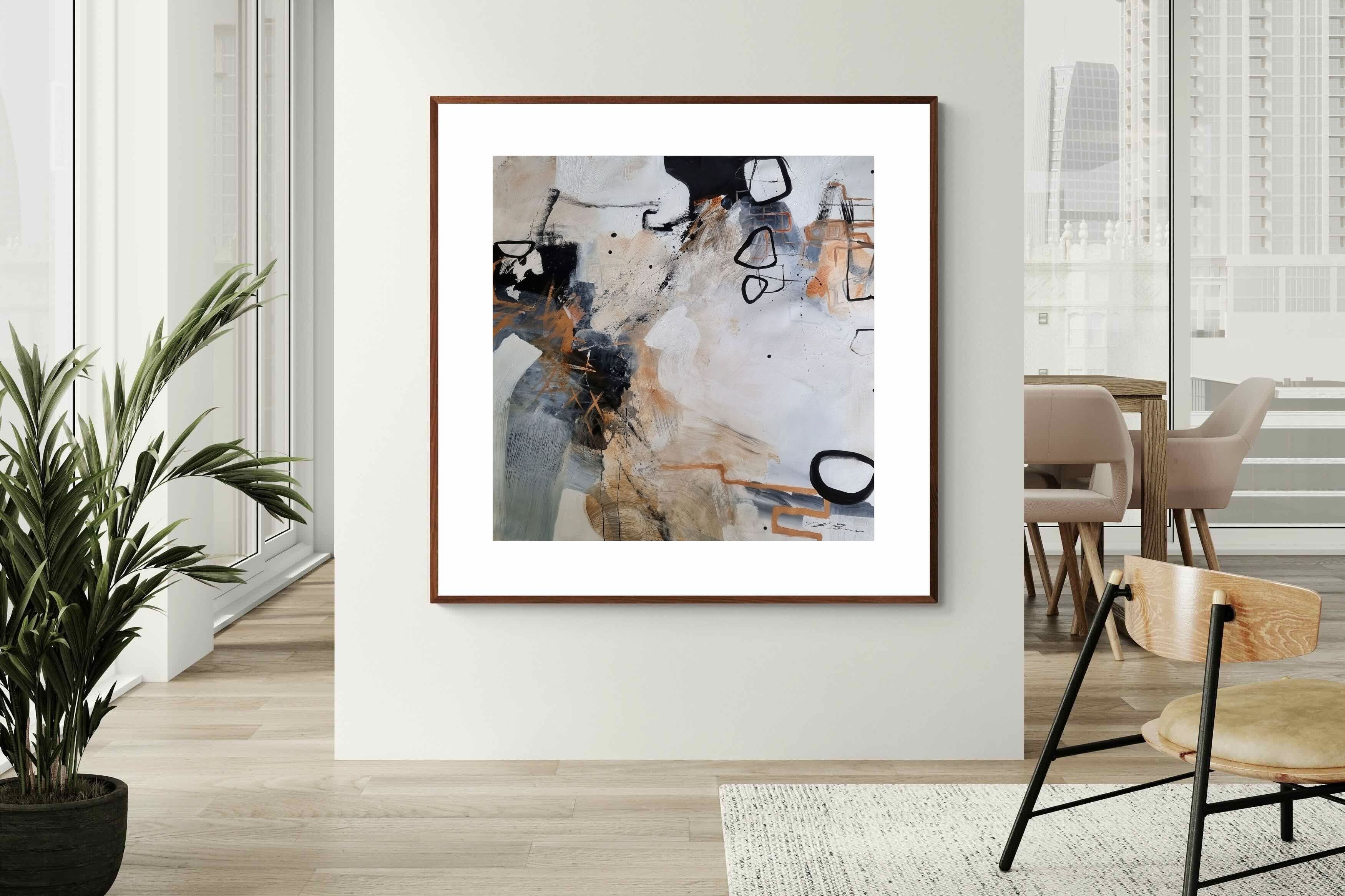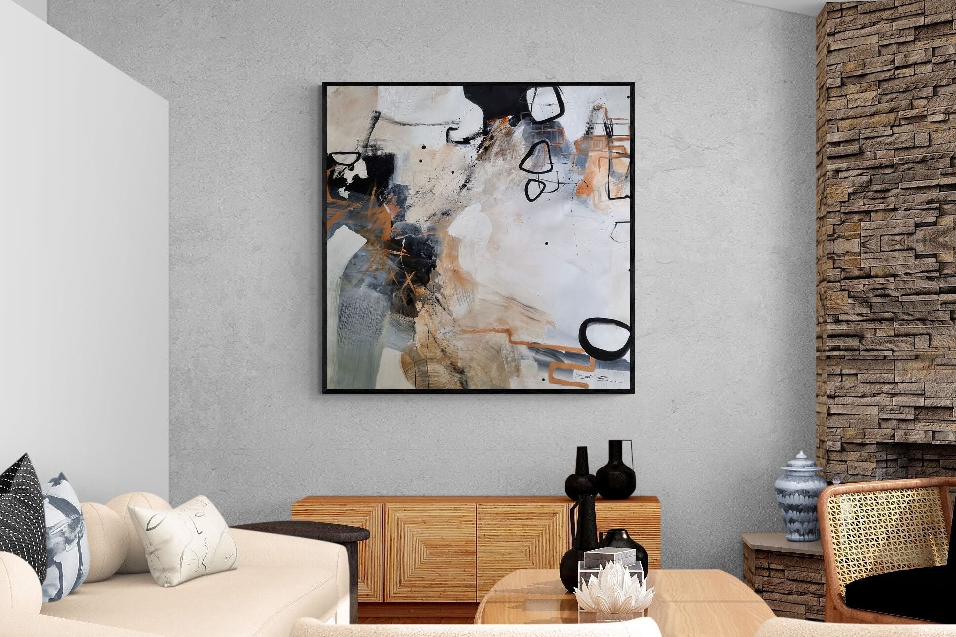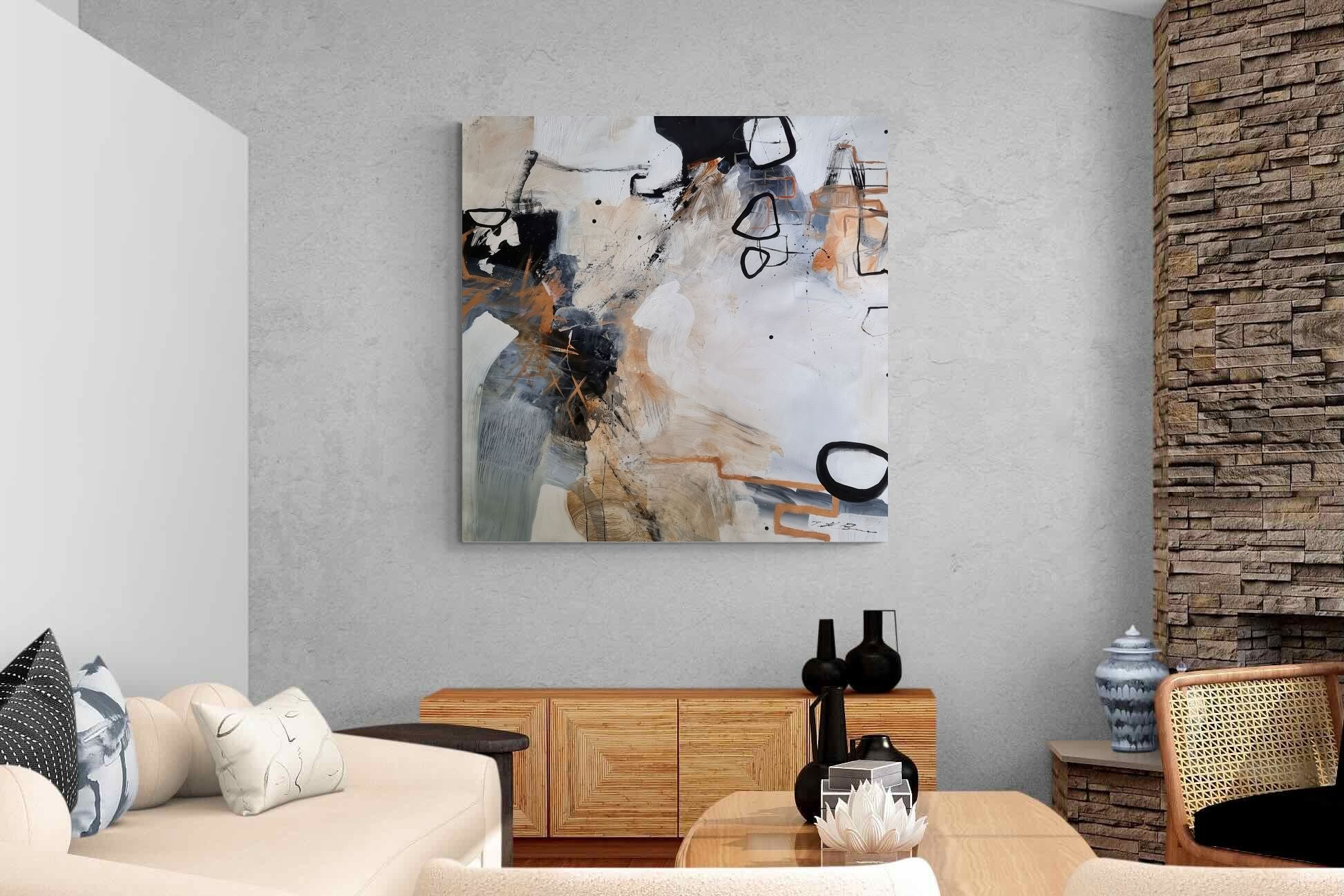 Quiet Geometry explores balance through soft neutrals, muted greys and confident black line work. The composition feels architectural yet organic, offering visual interest without heaviness. This artwork suits modern, minimalist and Scandinavian interiors, particularly open-plan living spaces or hallways where texture and form are preferred over bold colour statements.