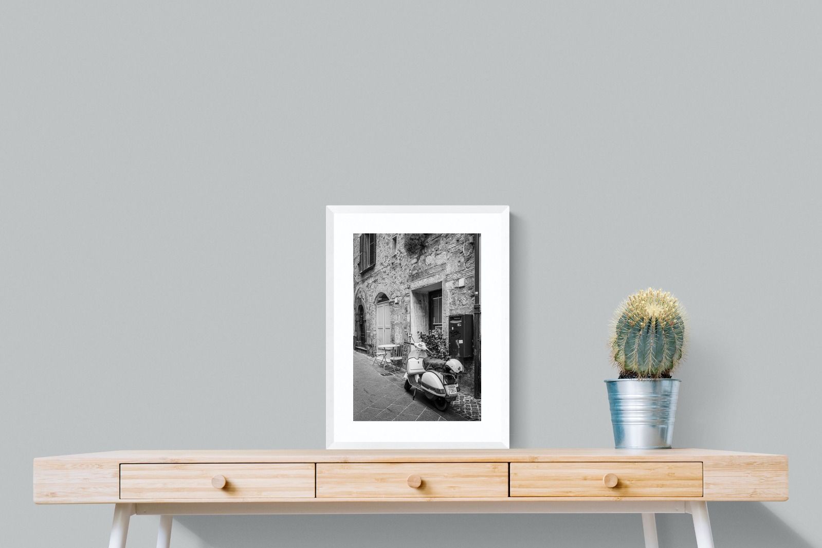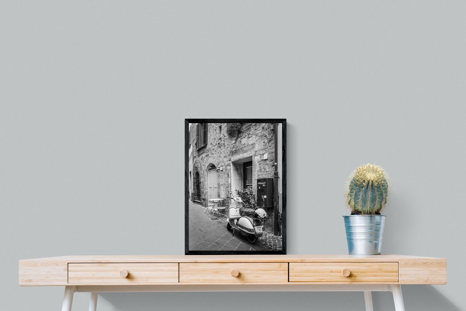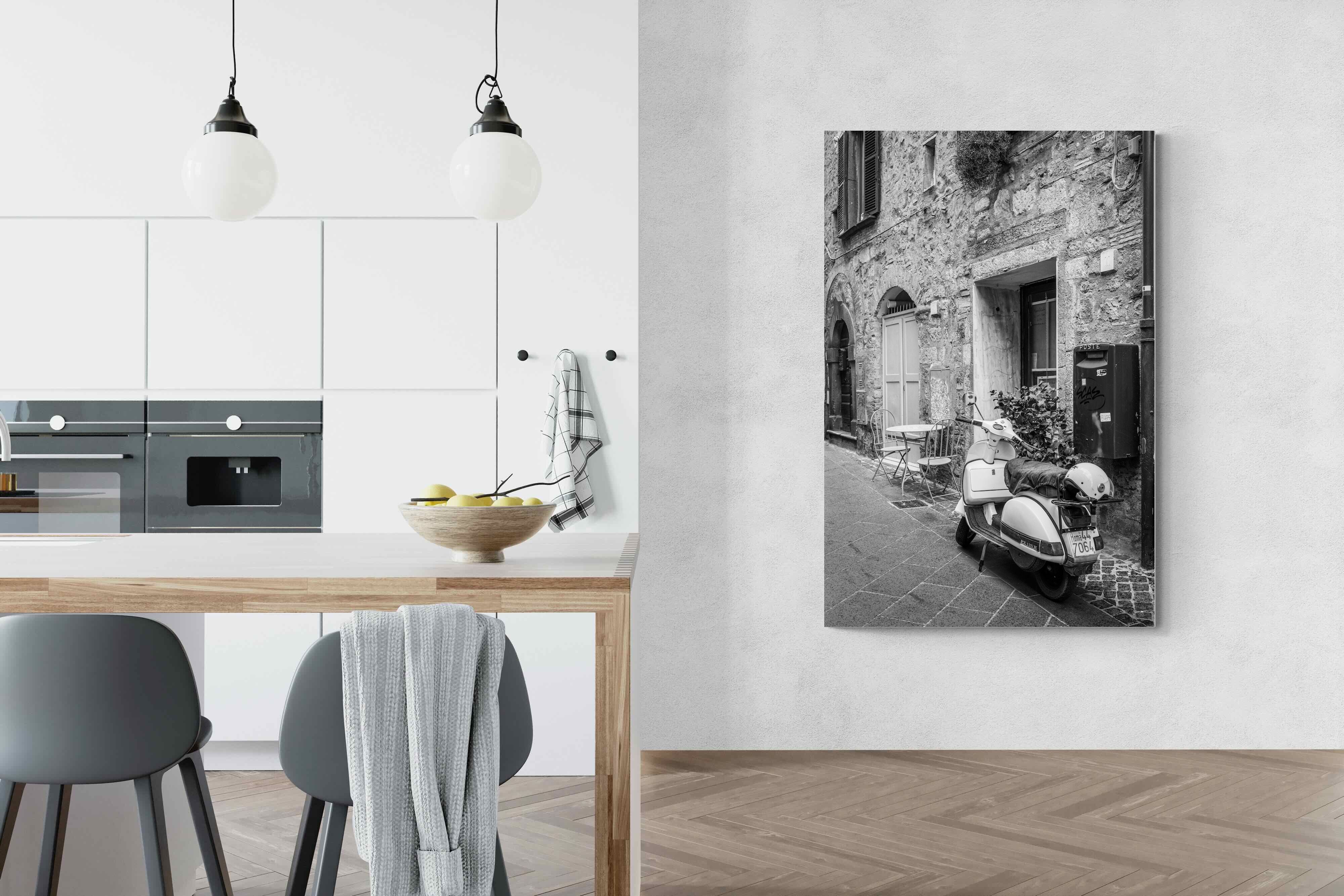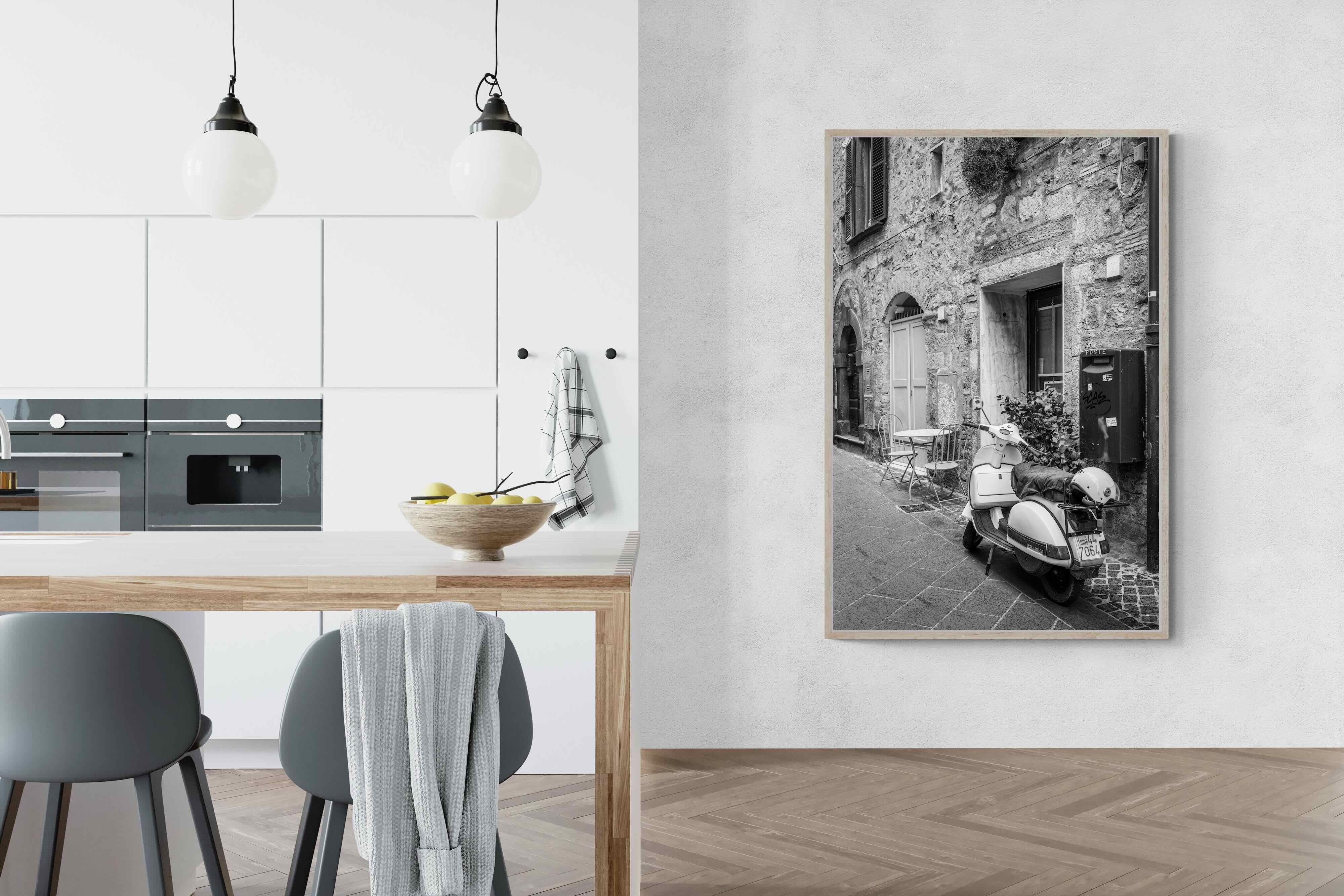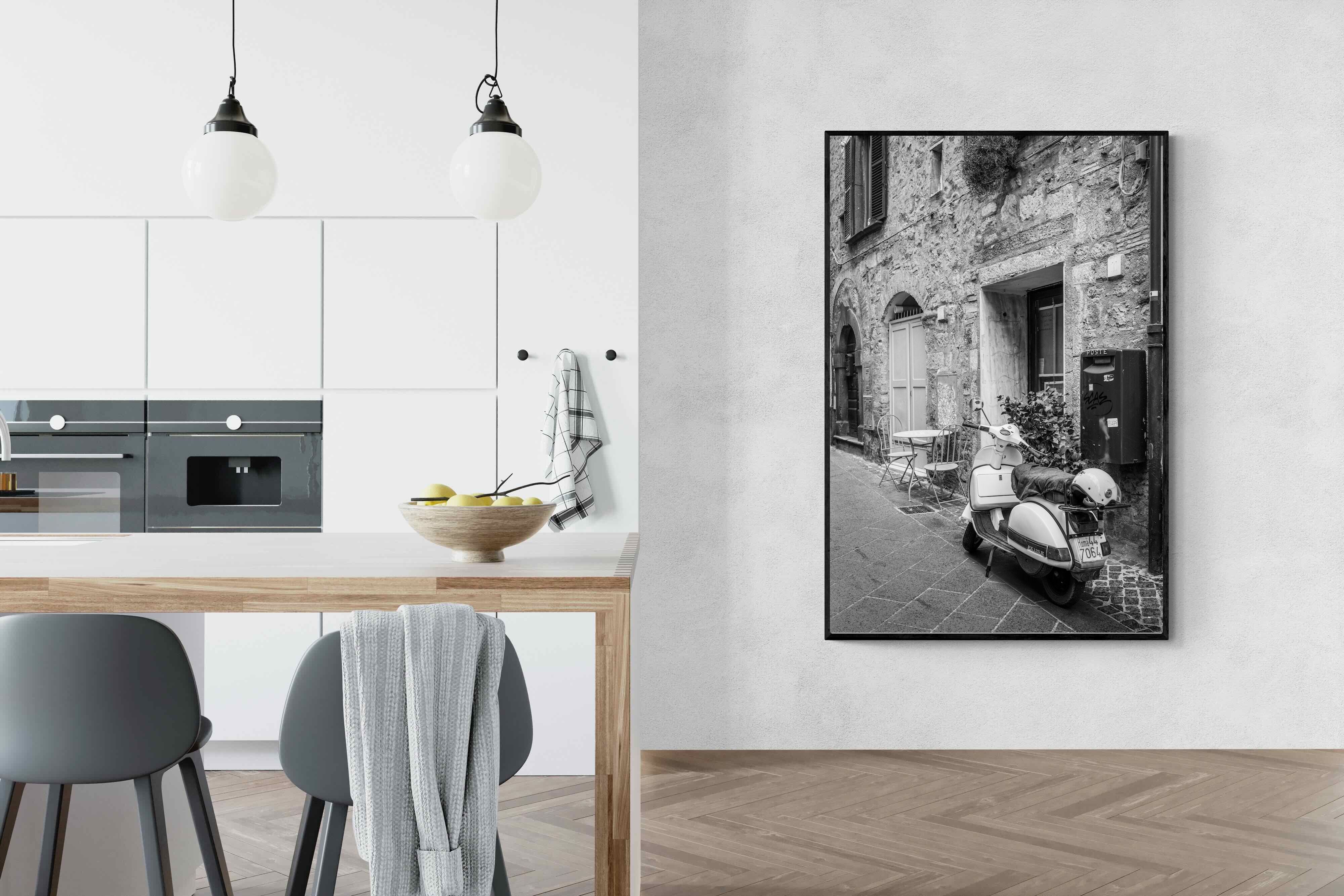 This atmospheric black-and-white photograph features a classic Vespa parked along a narrow Italian street, framed by textured stone walls and café-style seating. The composition captures everyday European life with effortless charm. Perfect for modern, minimalist or travel-inspired interiors, this artwork adds authenticity, calm and visual depth, making it an elegant choice for living rooms, hallways or creative spaces.