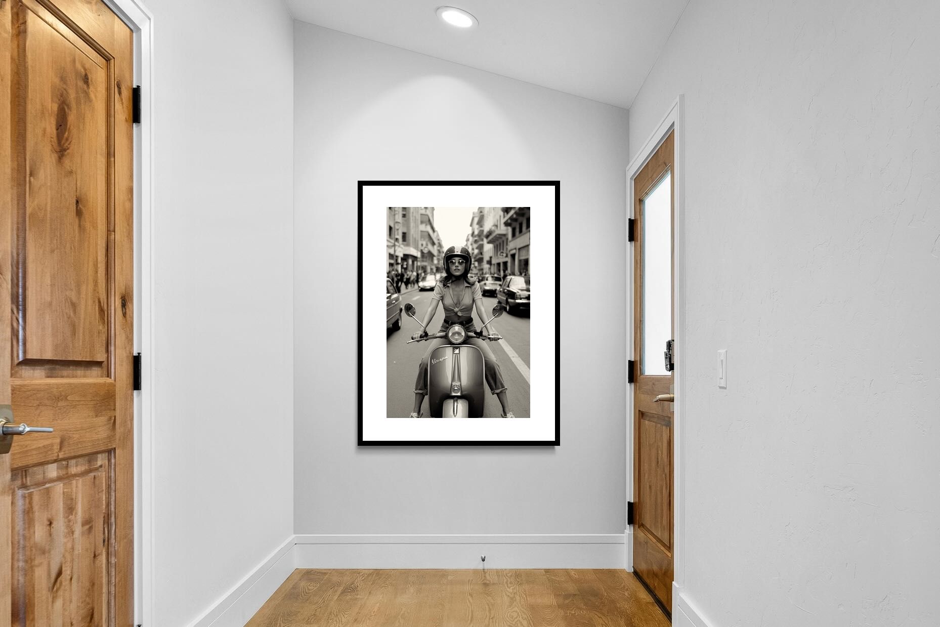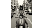 This striking black-and-white photograph captures a confident woman riding a classic Vespa through a bustling city street, framed by mid-century architecture and passing traffic. The centred composition and cinematic depth create a sense of movement, freedom and timeless style. Ideal for contemporary, urban or fashion-led interiors, this artwork adds attitude and sophistication, making it a bold focal point for living rooms, studios or modern apartments.