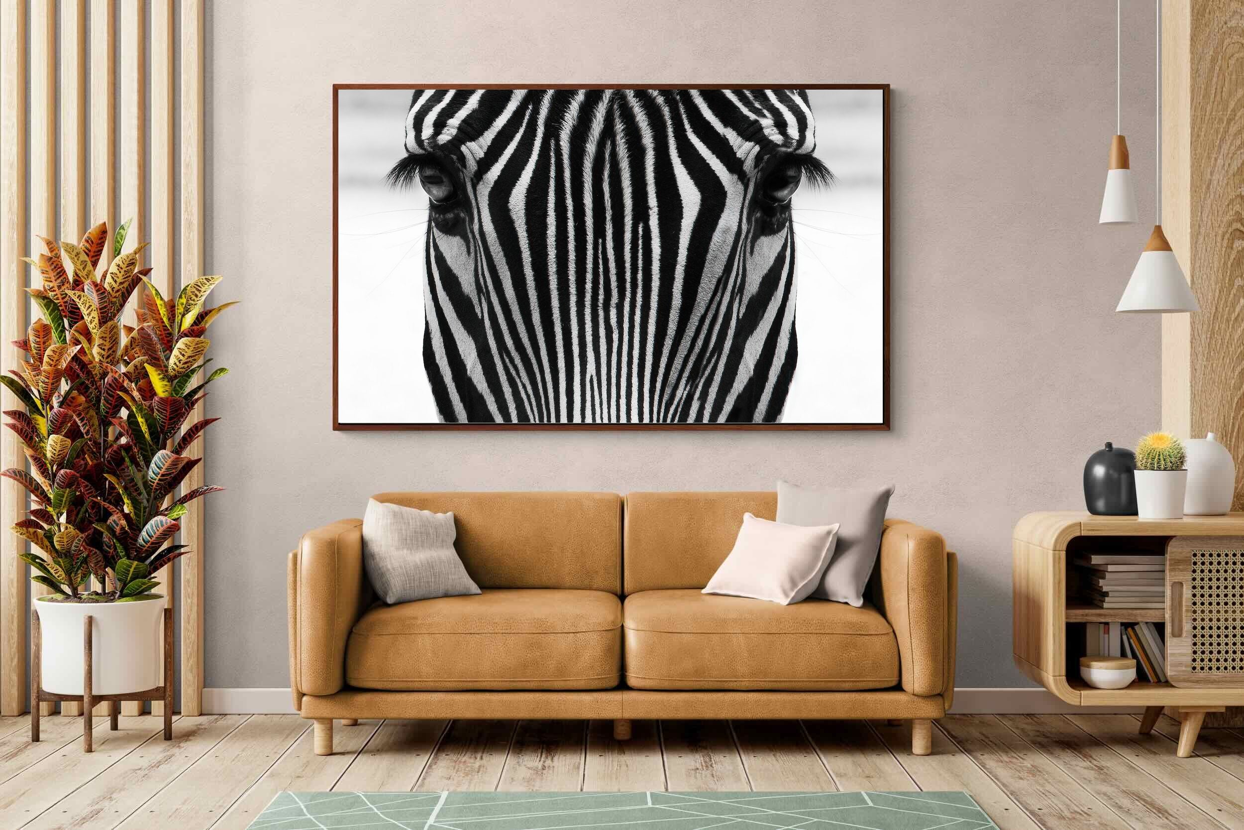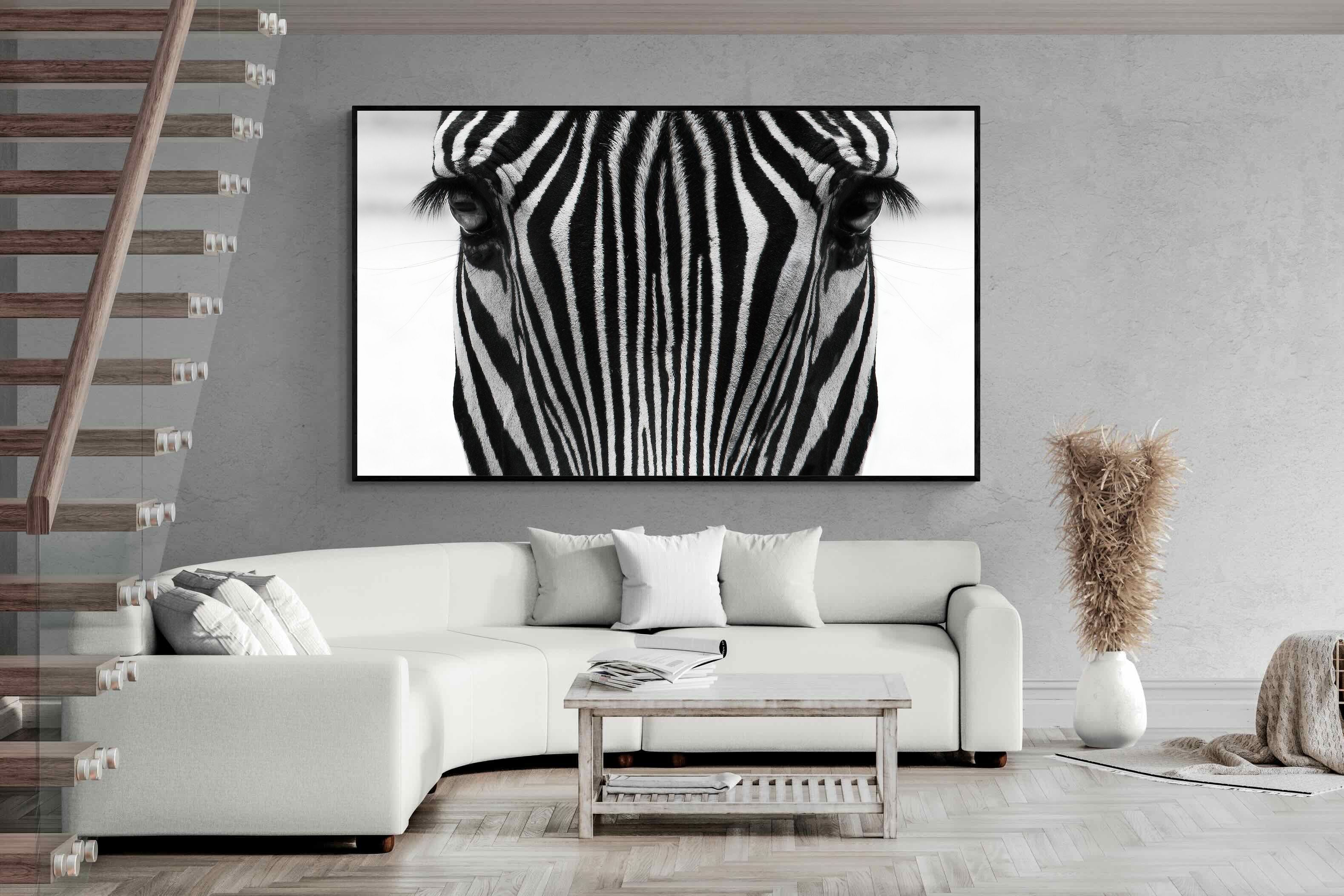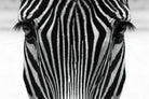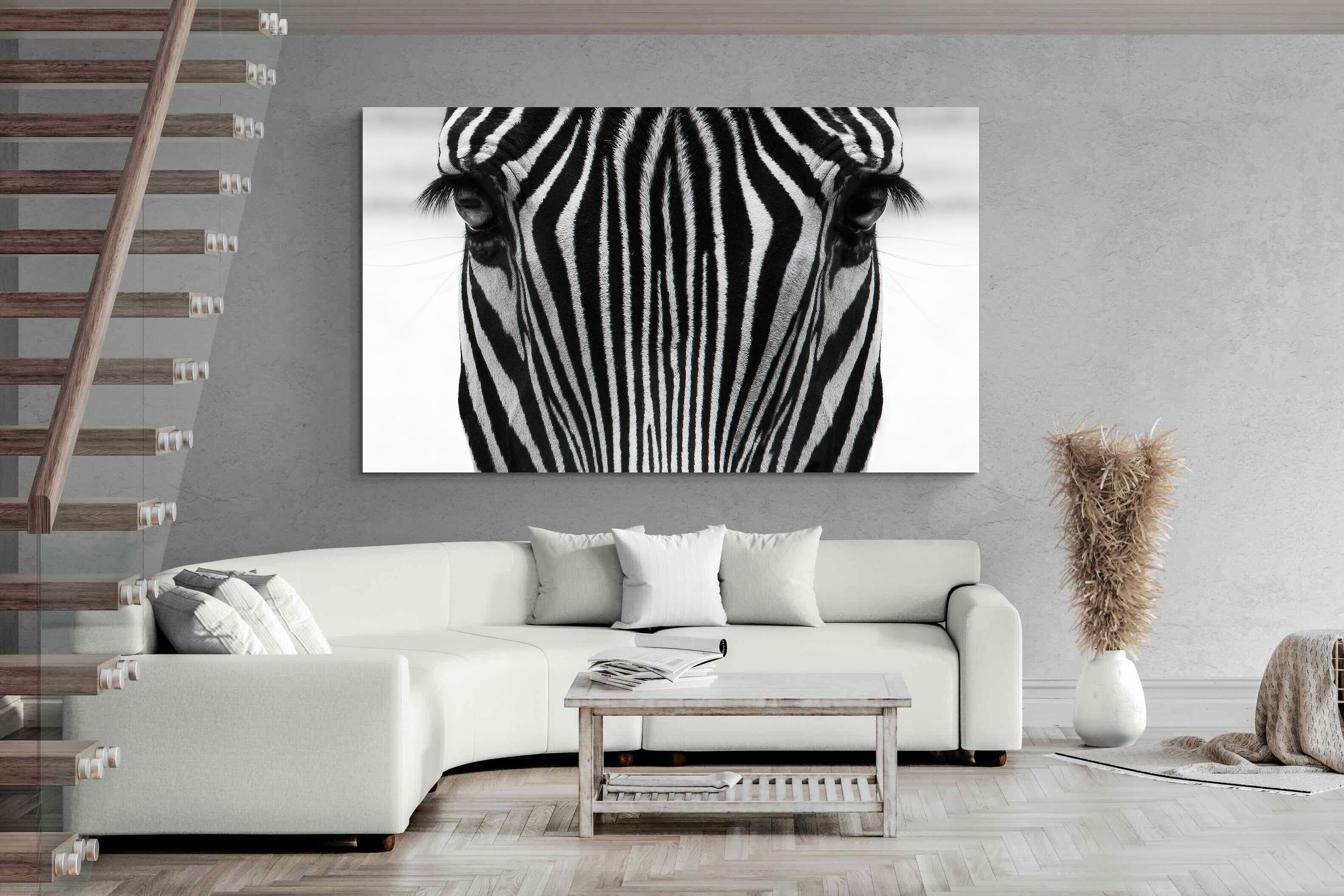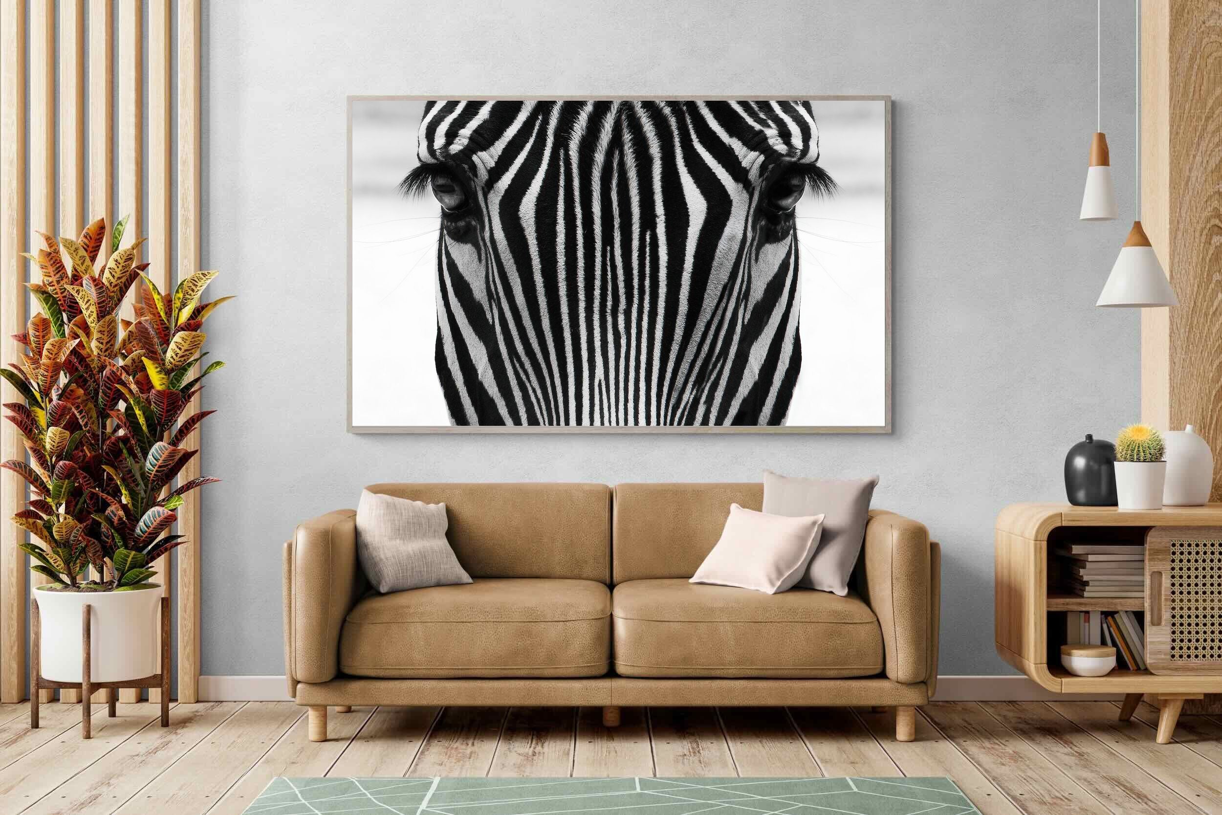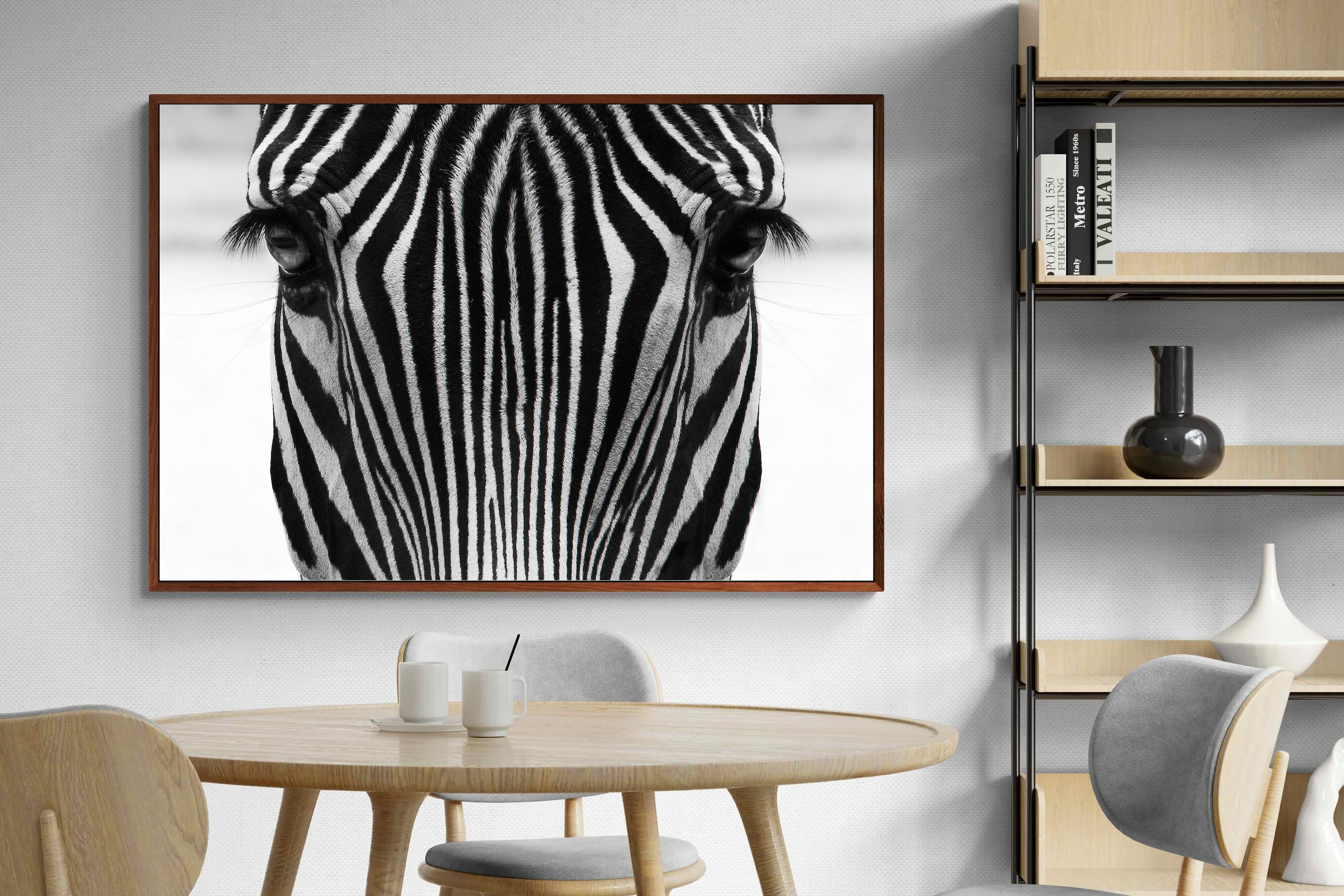 A tightly framed zebra portrait transforms natural pattern into graphic abstraction, with bold stripes creating rhythm and symmetry across the composition. The monochrome treatment sharpens contrast and highlights intricate detail, giving the piece a contemporary edge. Perfect for modern interiors, it works as both wildlife art and striking design element, adding visual interest without overwhelming the surrounding space.