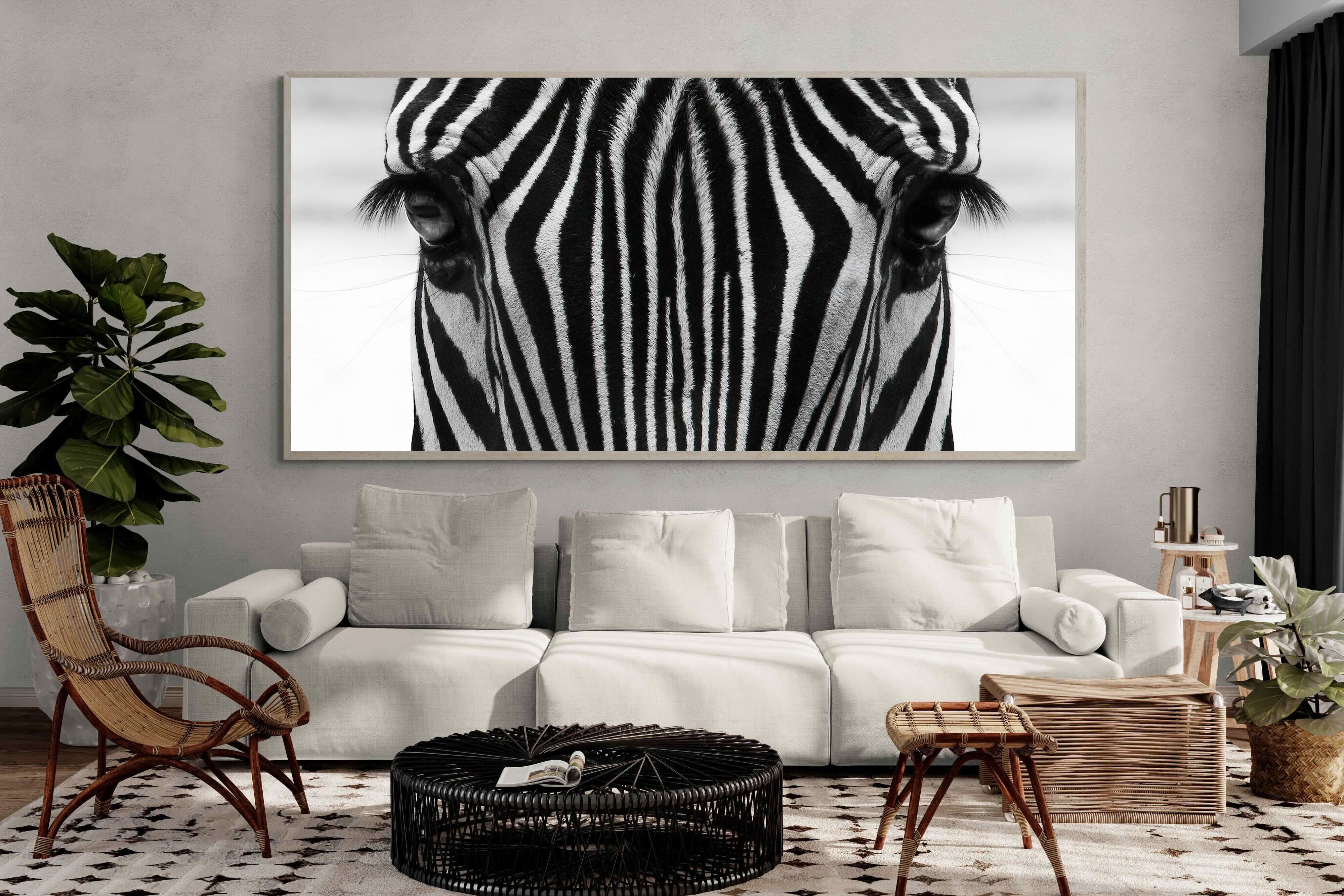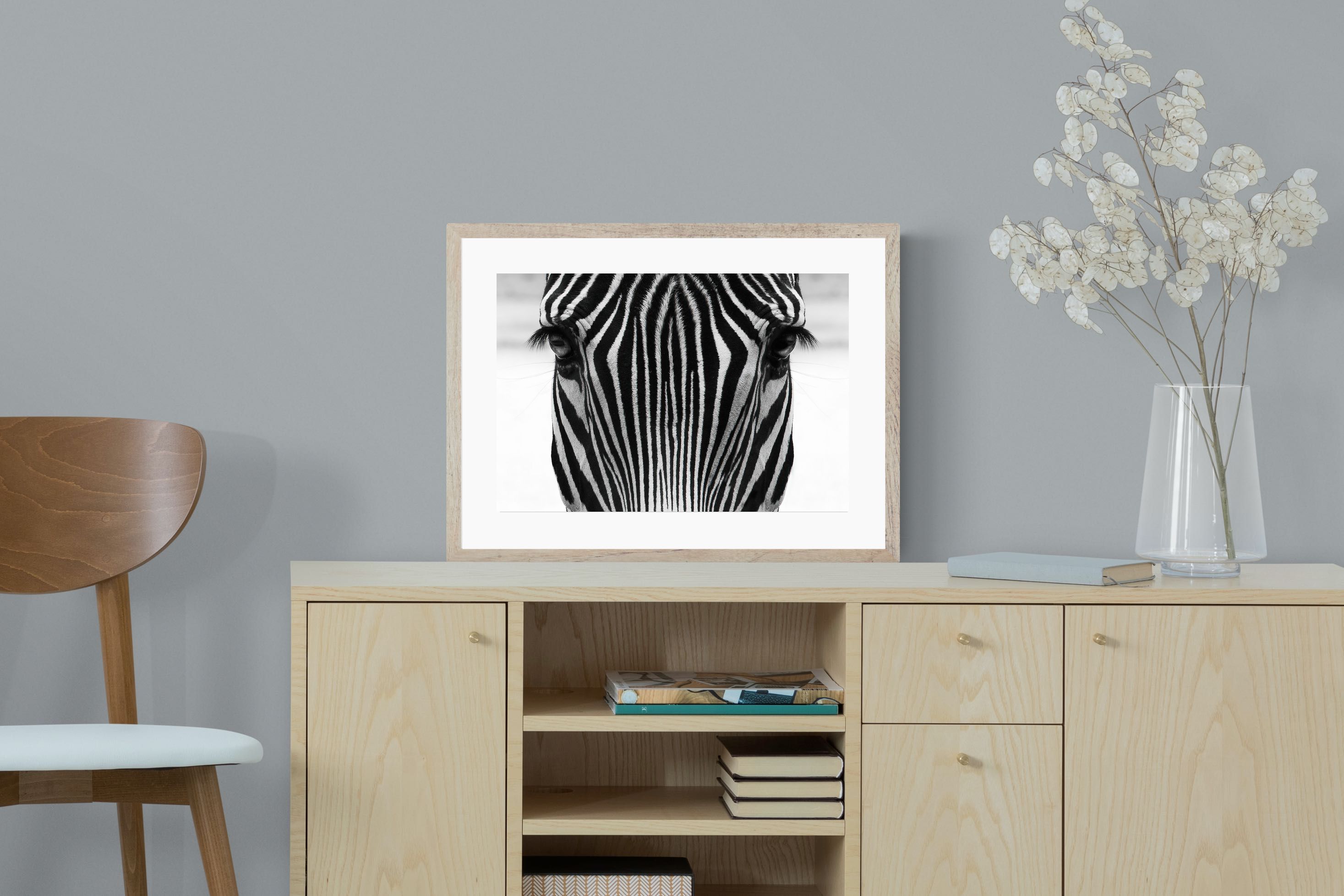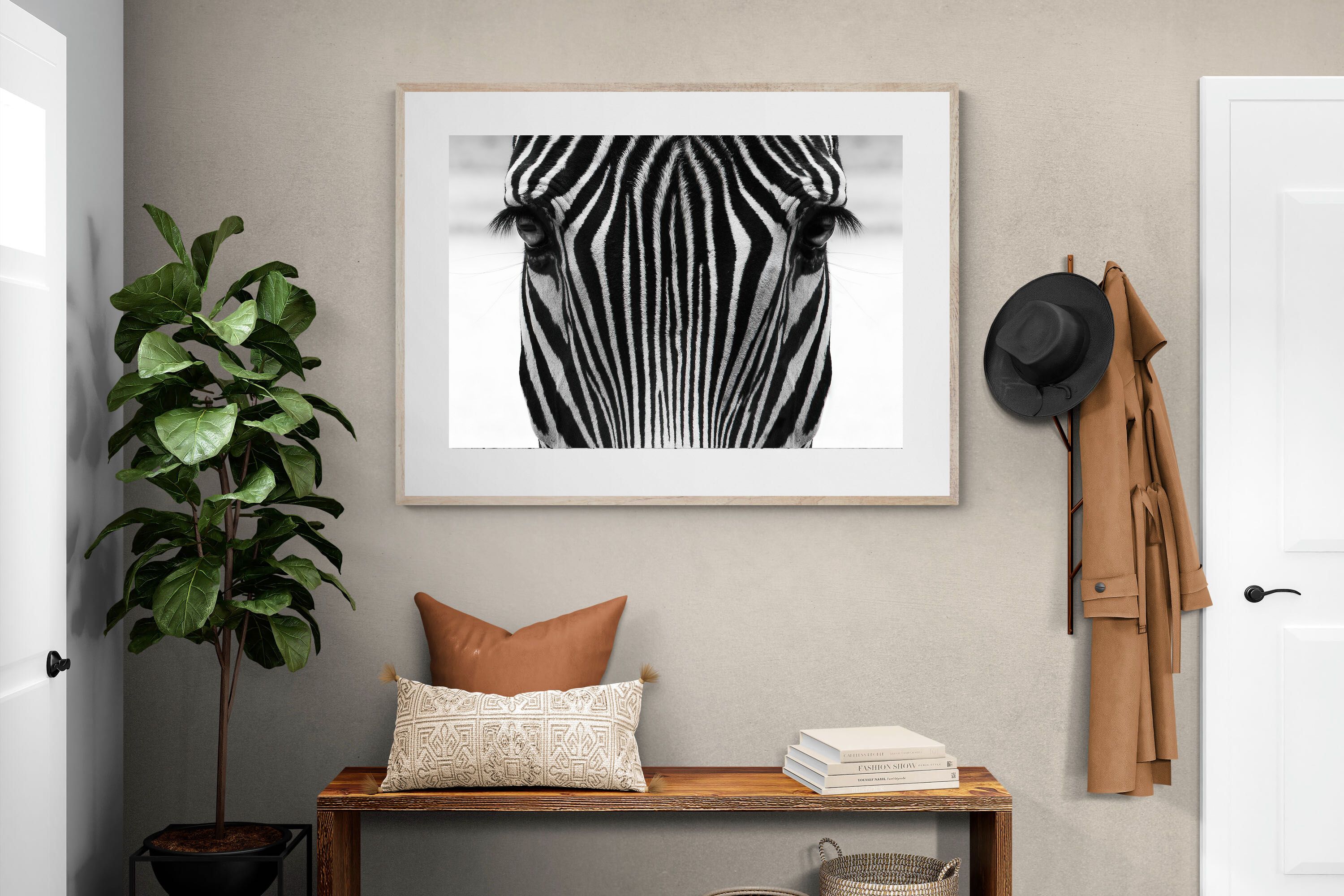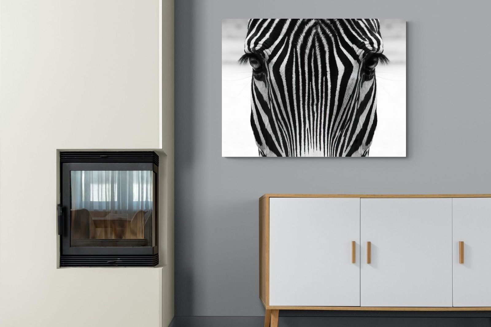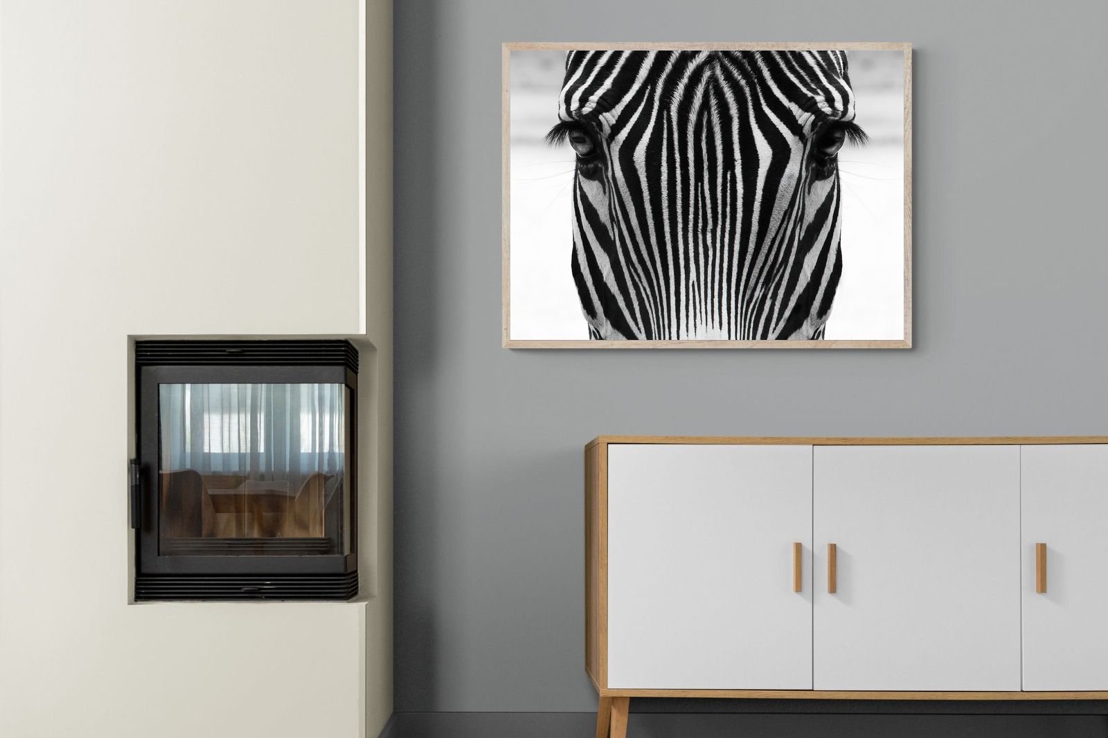 A tightly framed zebra portrait transforms natural pattern into graphic abstraction, with bold stripes creating rhythm and symmetry across the composition. The monochrome treatment sharpens contrast and highlights intricate detail, giving the piece a contemporary edge. Perfect for modern interiors, it works as both wildlife art and striking design element, adding visual interest without overwhelming the surrounding space.