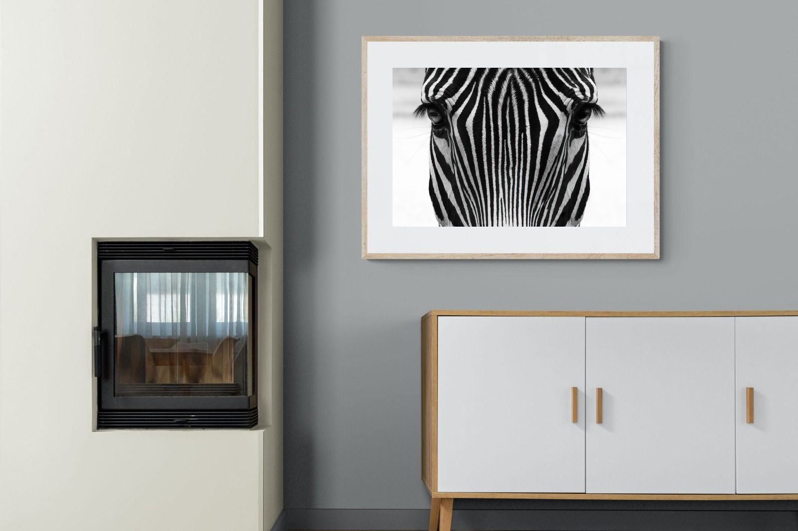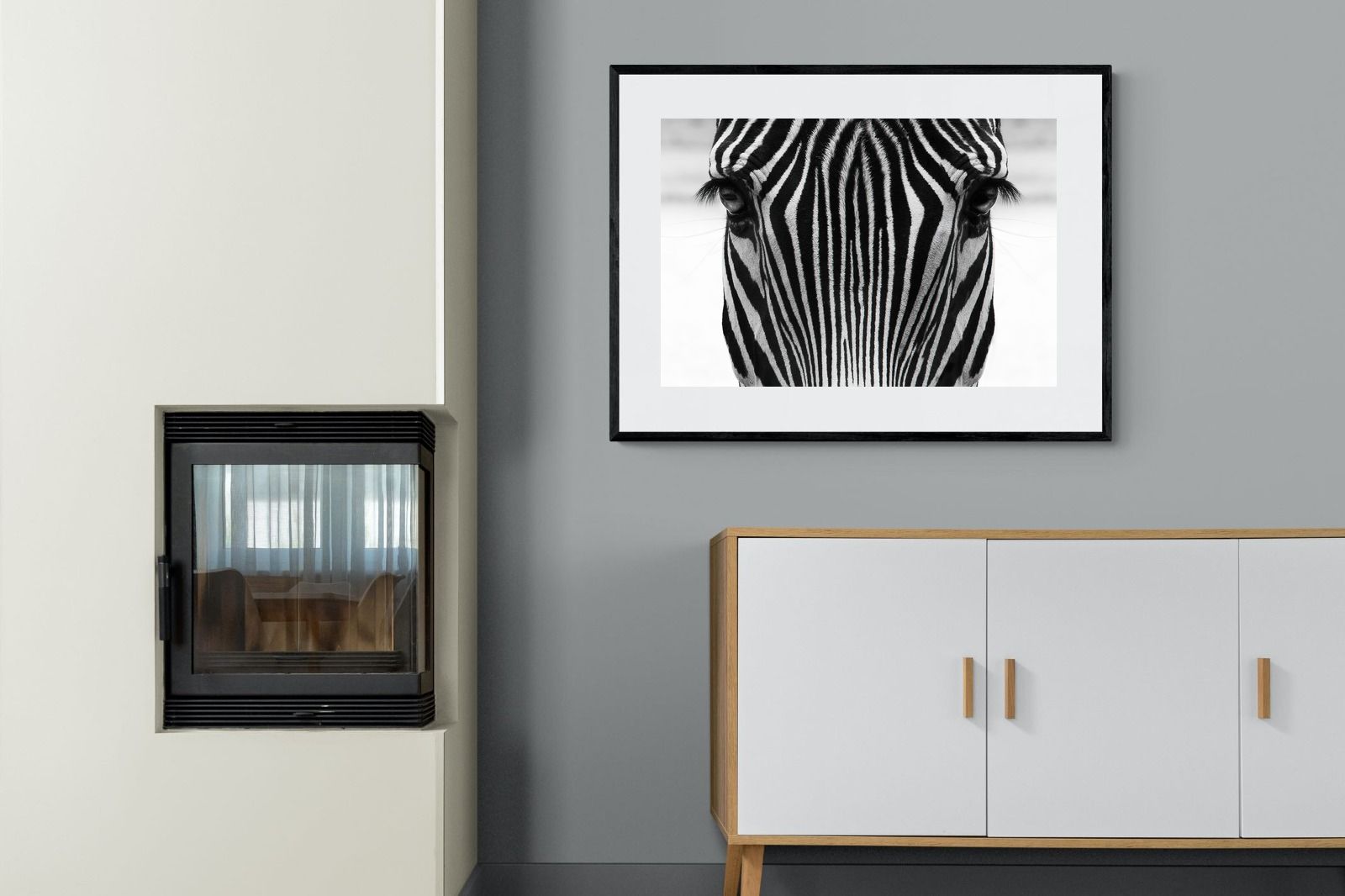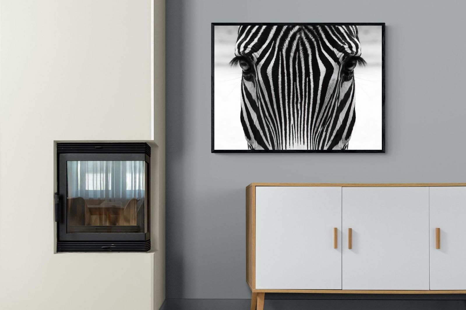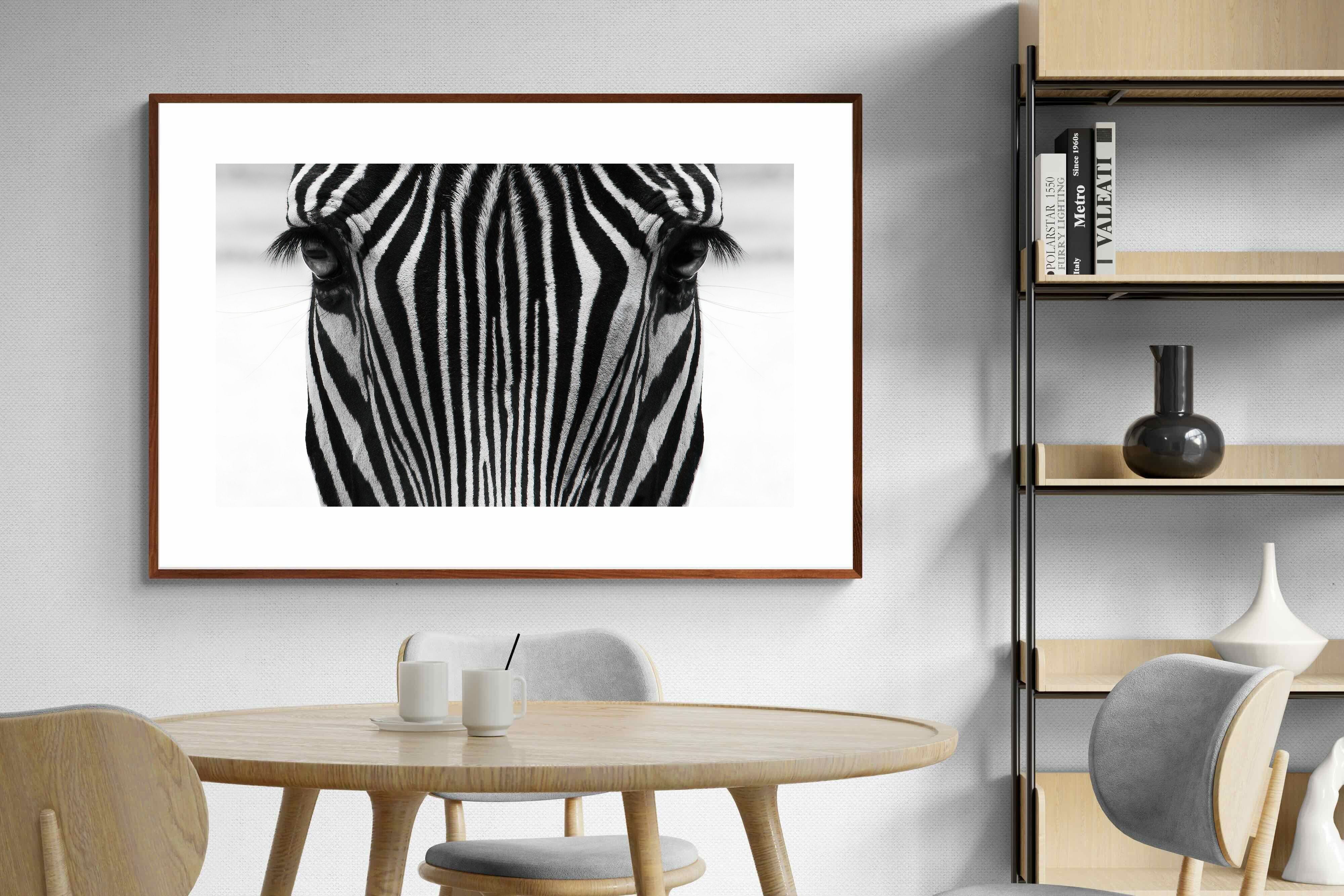 A tightly framed zebra portrait transforms natural pattern into graphic abstraction, with bold stripes creating rhythm and symmetry across the composition. The monochrome treatment sharpens contrast and highlights intricate detail, giving the piece a contemporary edge. Perfect for modern interiors, it works as both wildlife art and striking design element, adding visual interest without overwhelming the surrounding space.