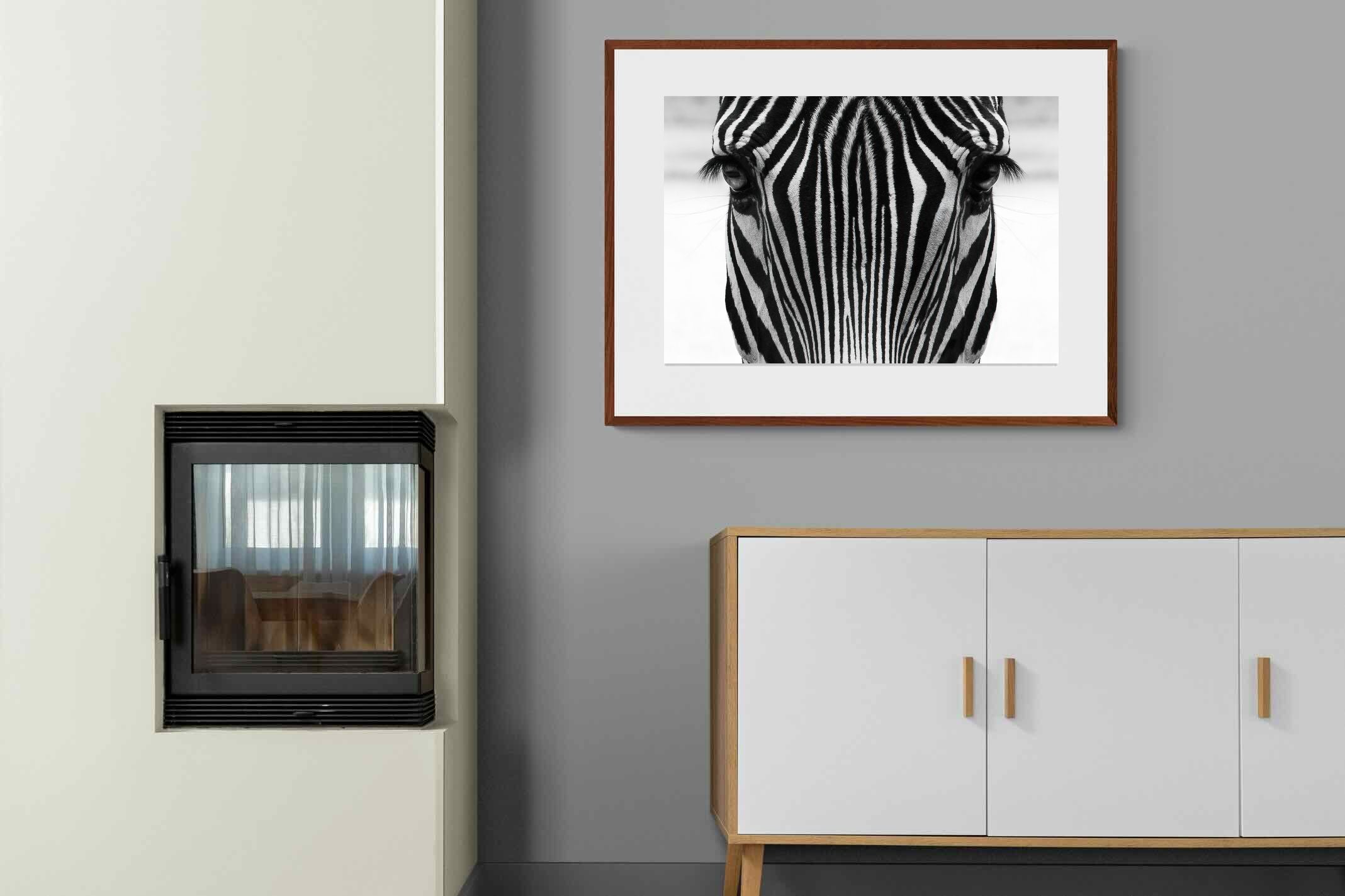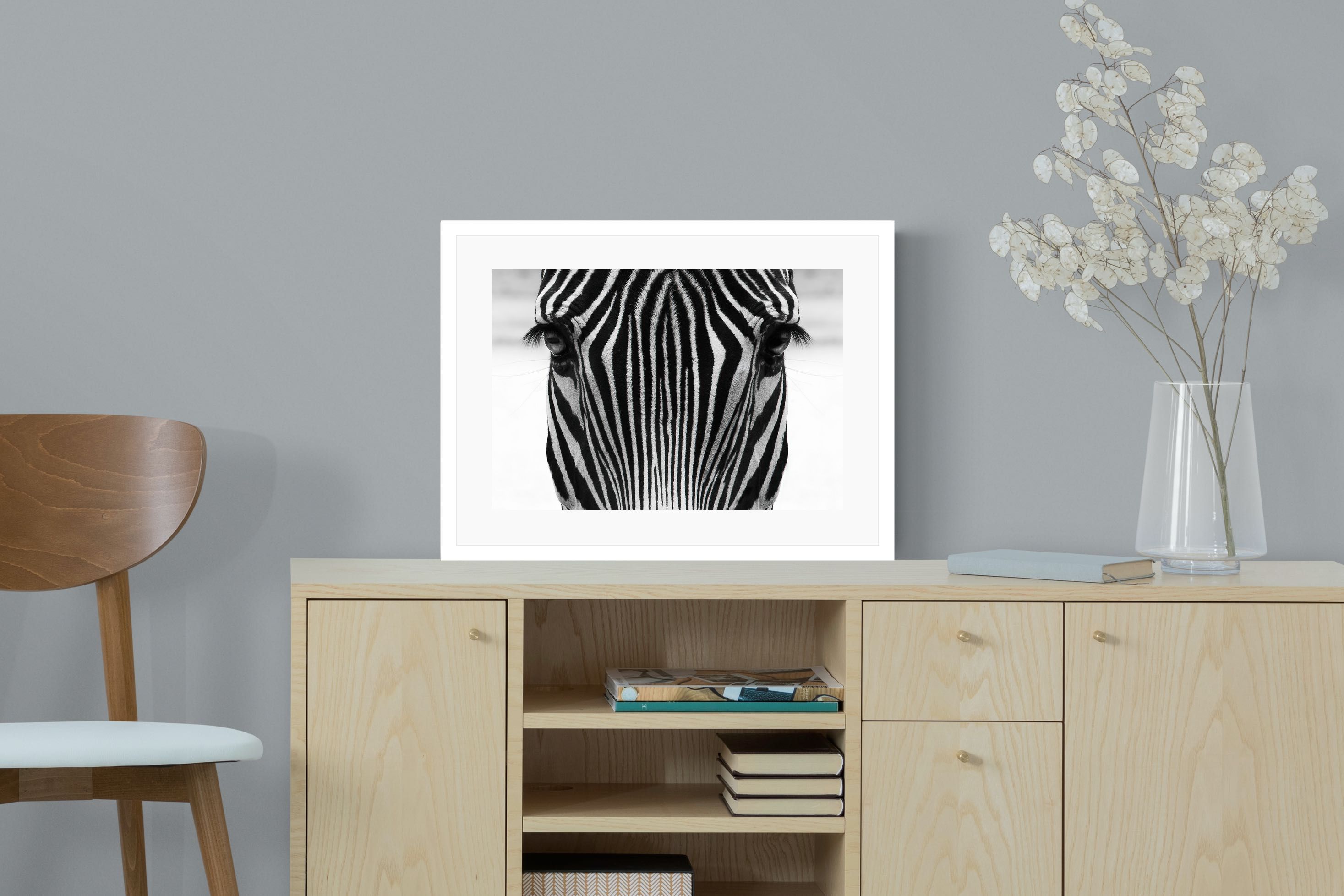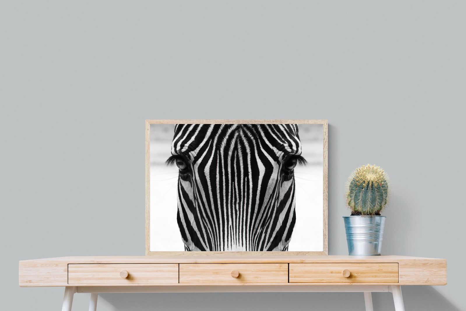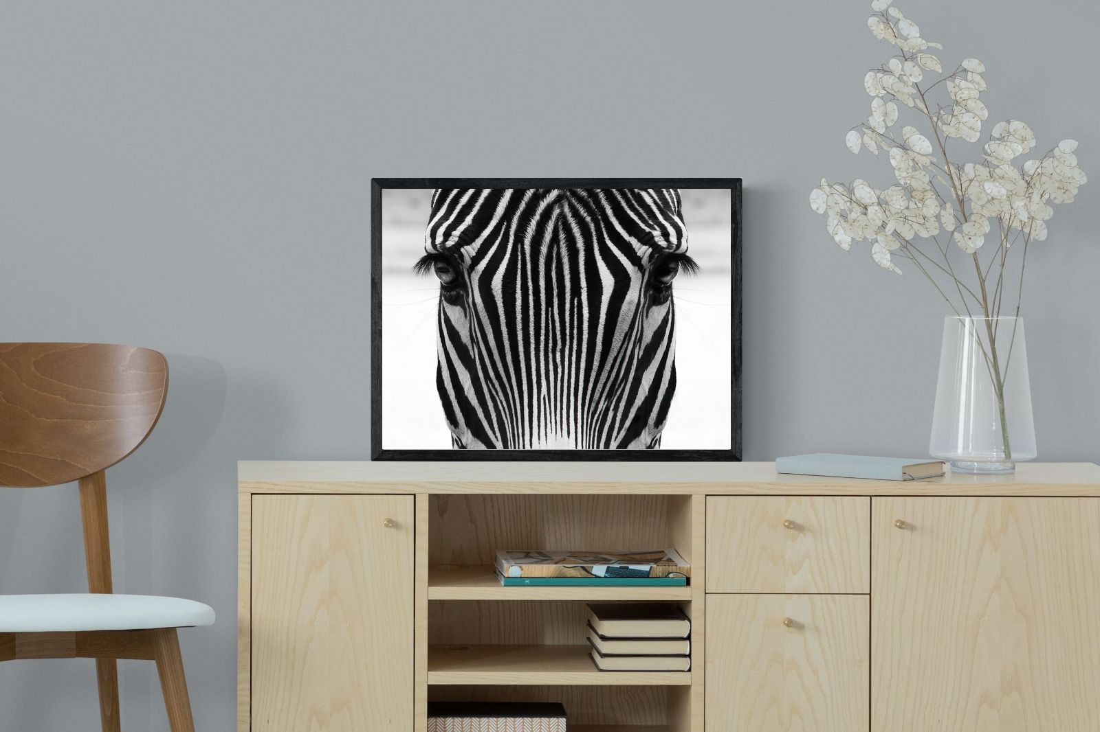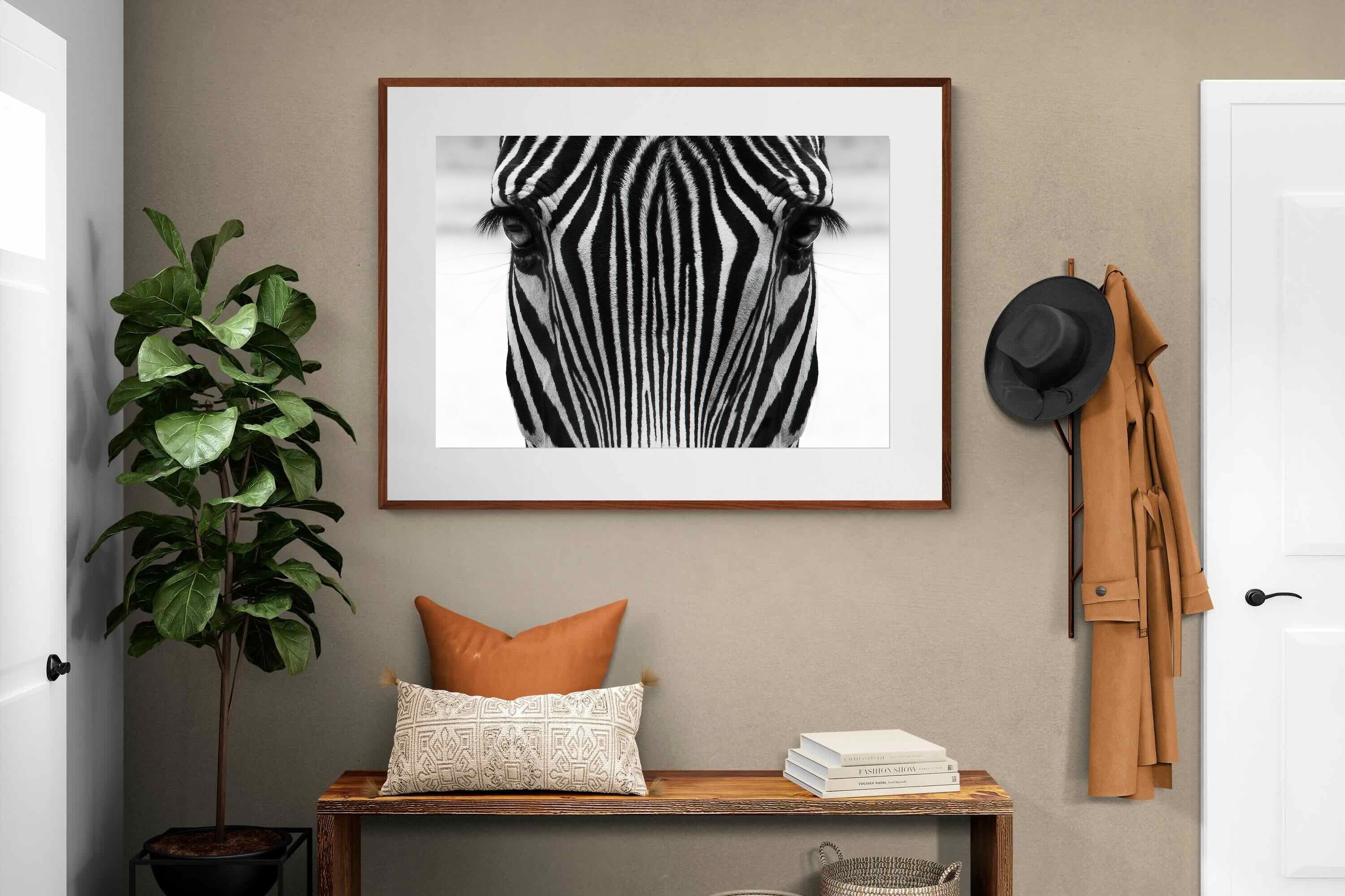 A tightly framed zebra portrait transforms natural pattern into graphic abstraction, with bold stripes creating rhythm and symmetry across the composition. The monochrome treatment sharpens contrast and highlights intricate detail, giving the piece a contemporary edge. Perfect for modern interiors, it works as both wildlife art and striking design element, adding visual interest without overwhelming the surrounding space.