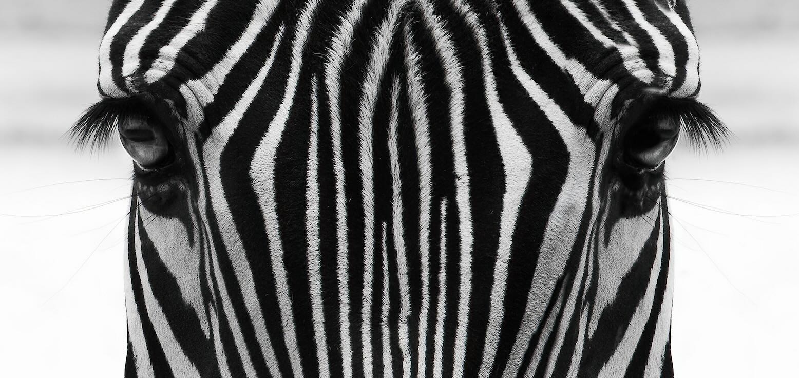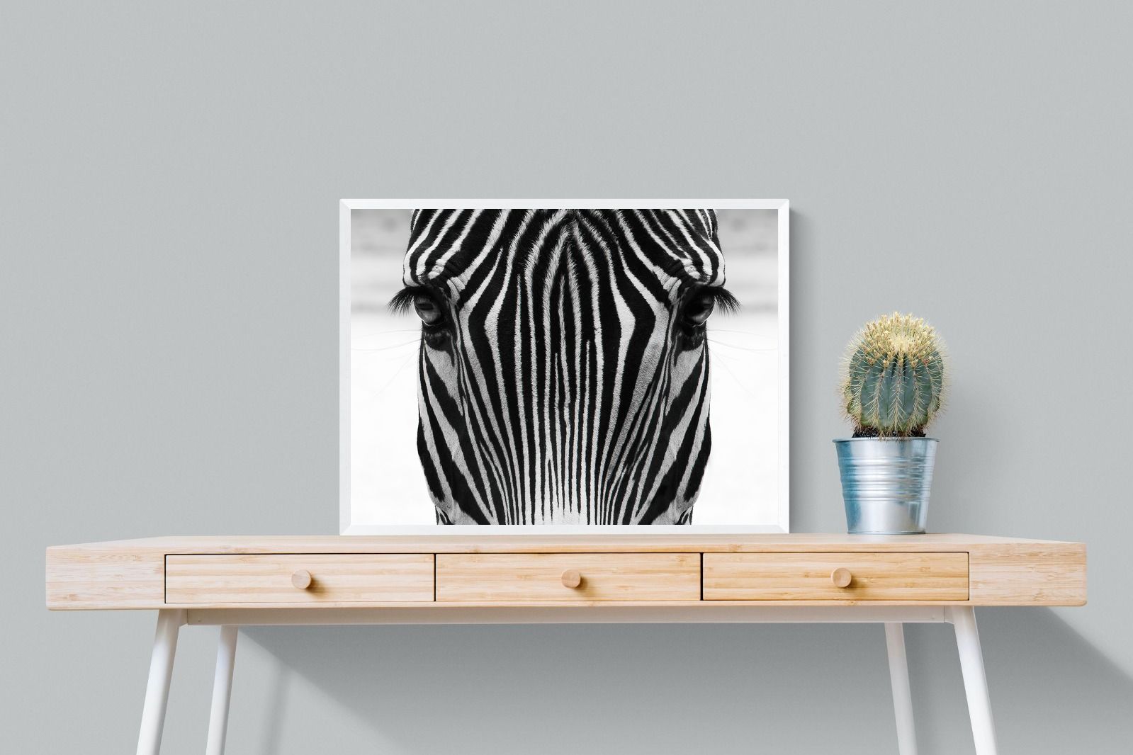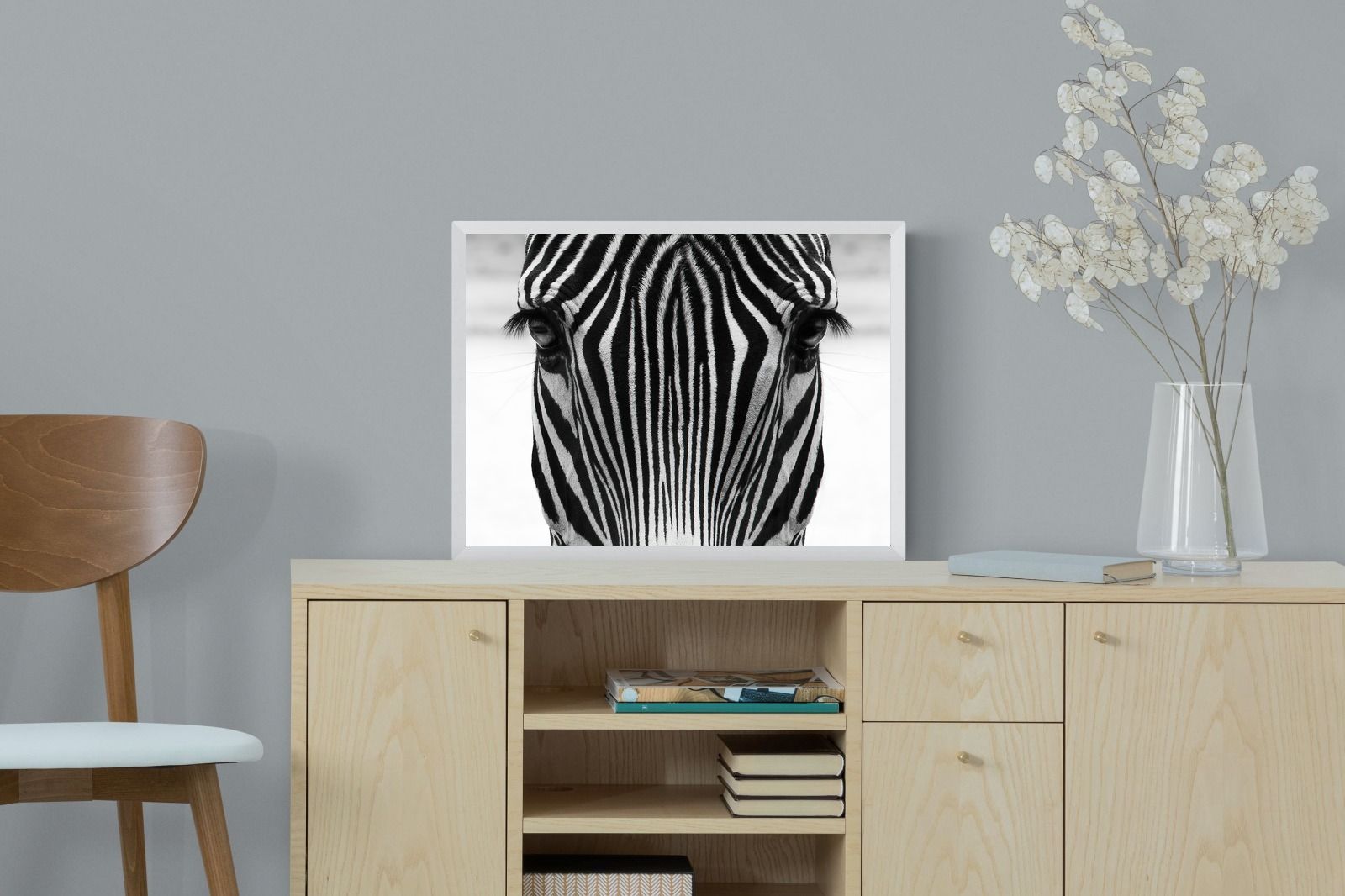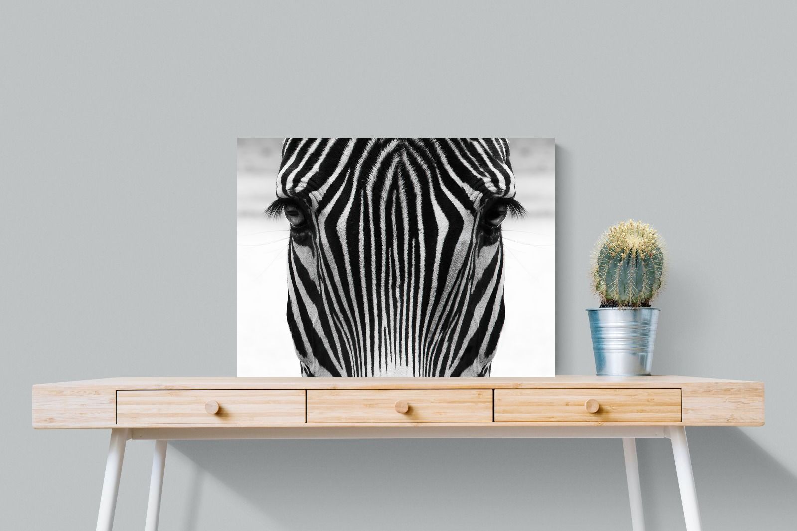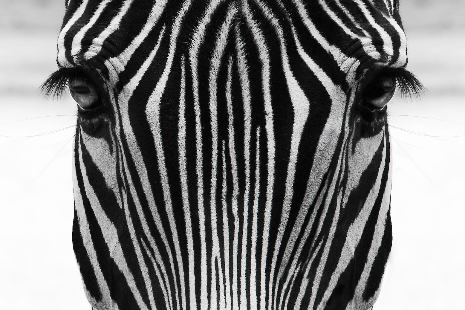 A tightly framed zebra portrait transforms natural pattern into graphic abstraction, with bold stripes creating rhythm and symmetry across the composition. The monochrome treatment sharpens contrast and highlights intricate detail, giving the piece a contemporary edge. Perfect for modern interiors, it works as both wildlife art and striking design element, adding visual interest without overwhelming the surrounding space.
