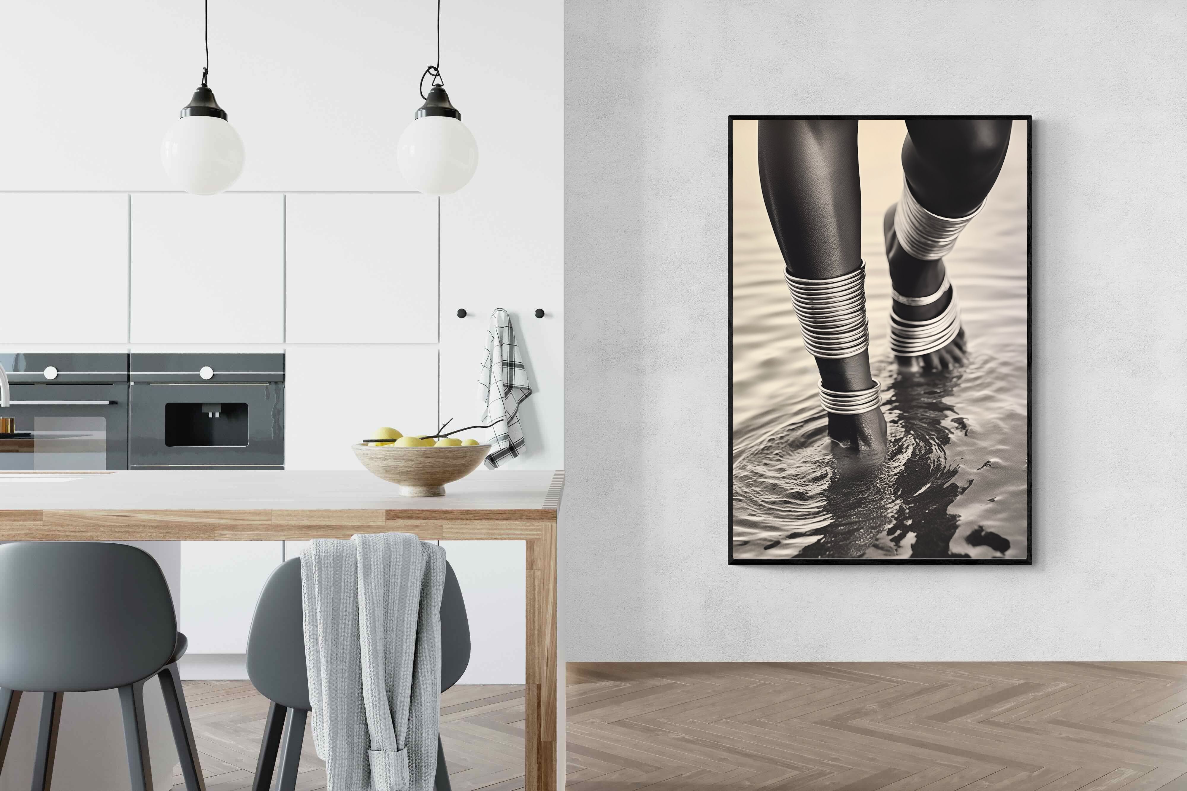 With exquisite detail, "Mucubal Anklet" showcases the beauty of traditional tribal jewellery, a testament to the artistry and history of the Mucubal women. The anklets, more than mere ornaments, are symbols of status and elegance, integral to the tribe's identity. The monochrome palette accentuates the textures and contours of the adornments, lending the subject a timeless grace.