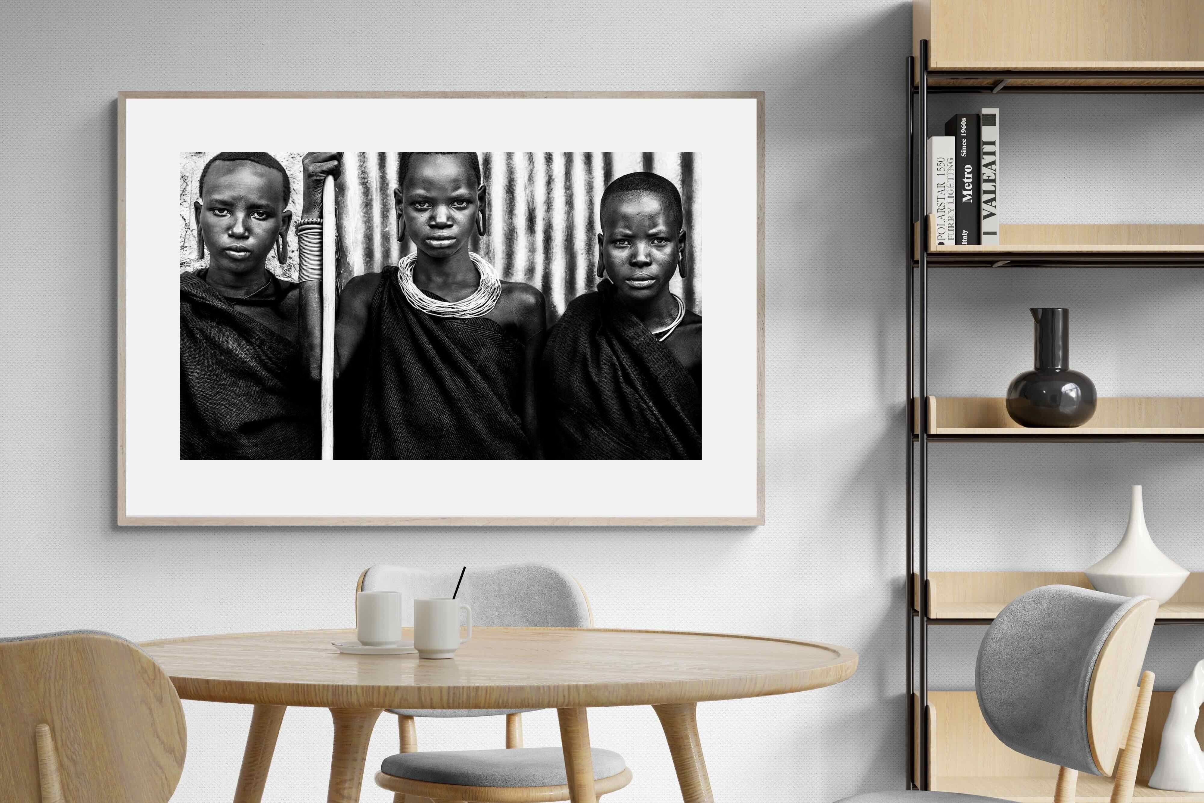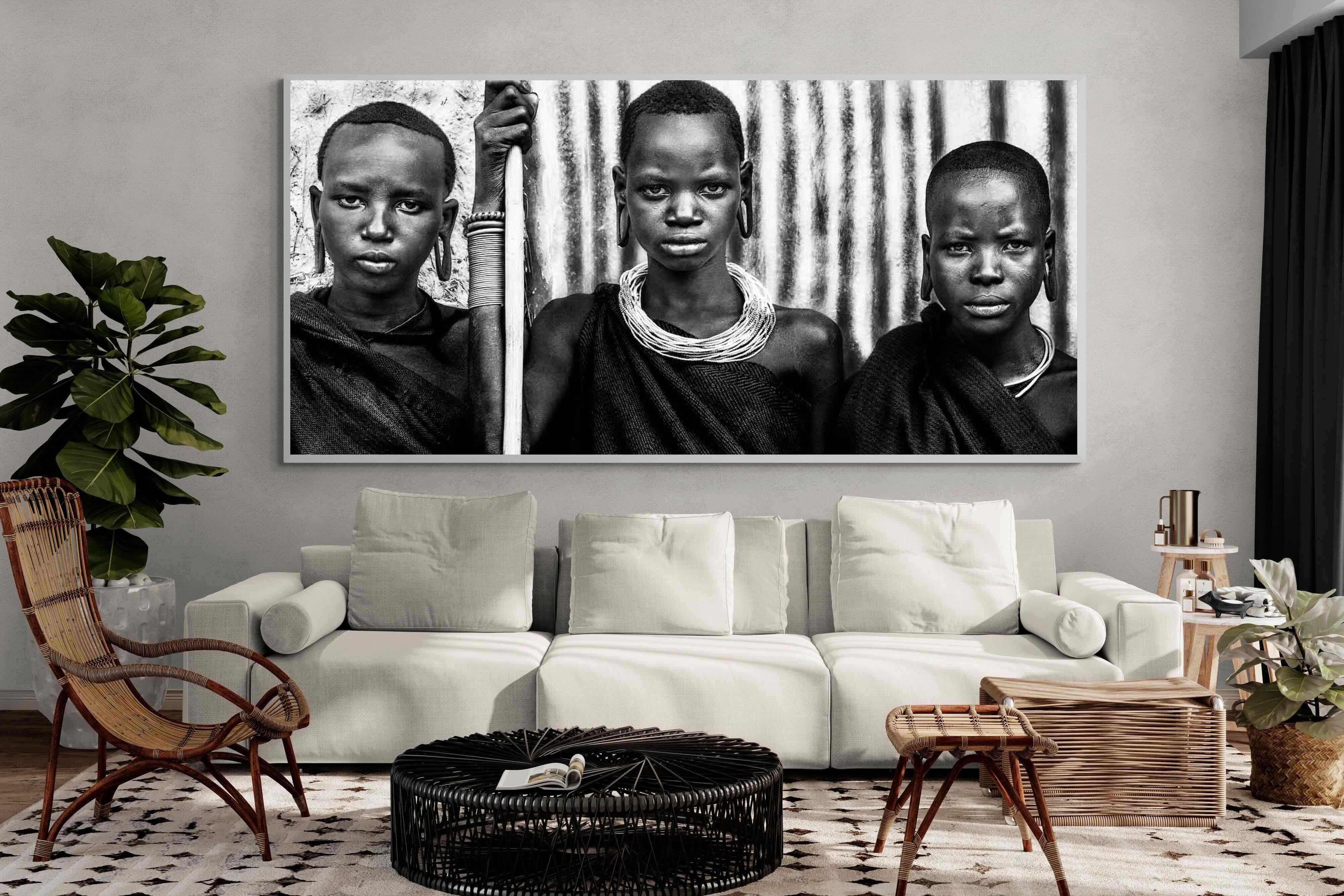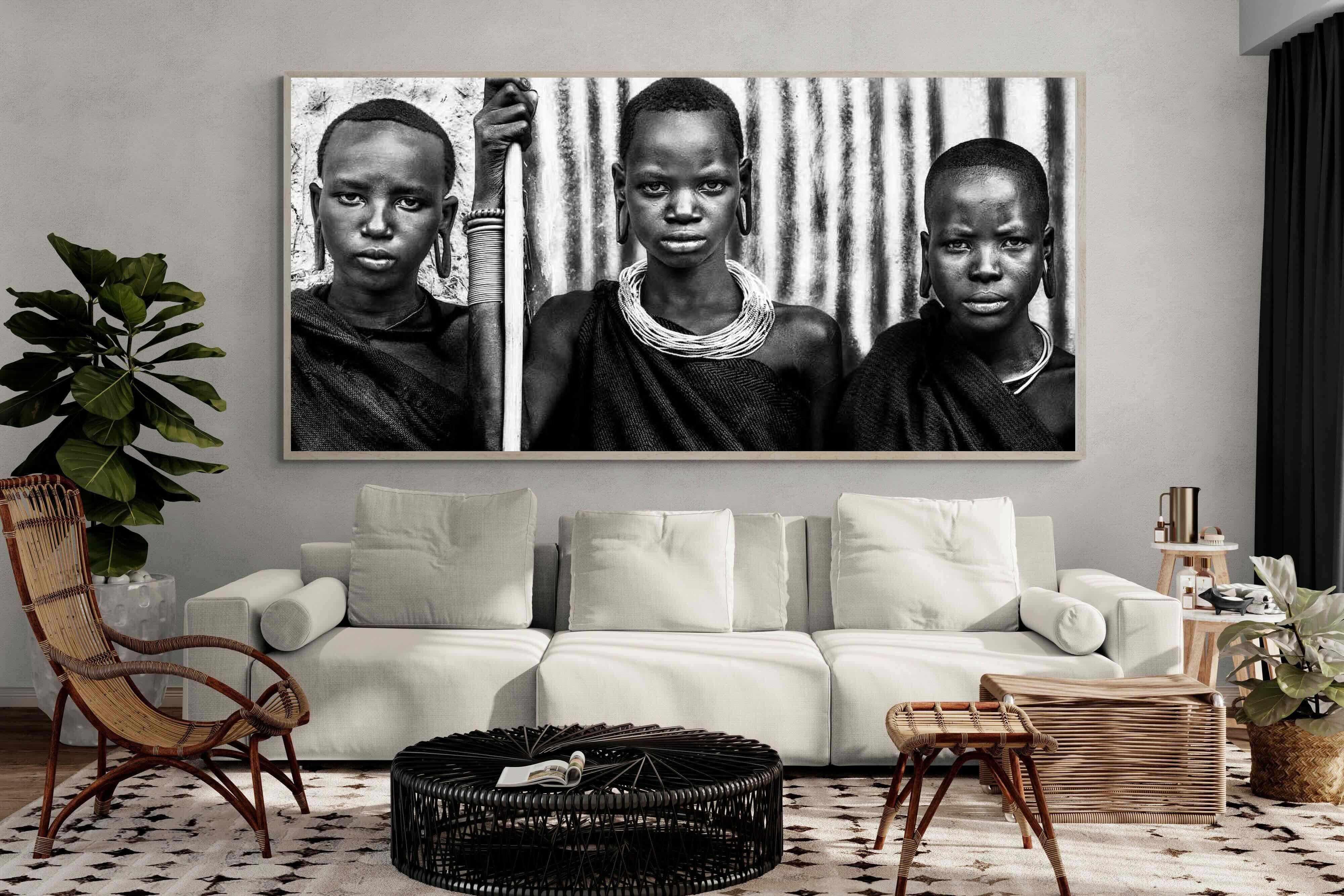 This striking black and white photograph captures the compelling presence of women from the Suri tribe in Ethiopia. Their gaze is direct and unwavering, traditional adornments underscoring their cultural heritage. The monochromatic tones highlight the textures of their attire and the fine details of their jewellry, conveying a narrative of strength and tribal identity.