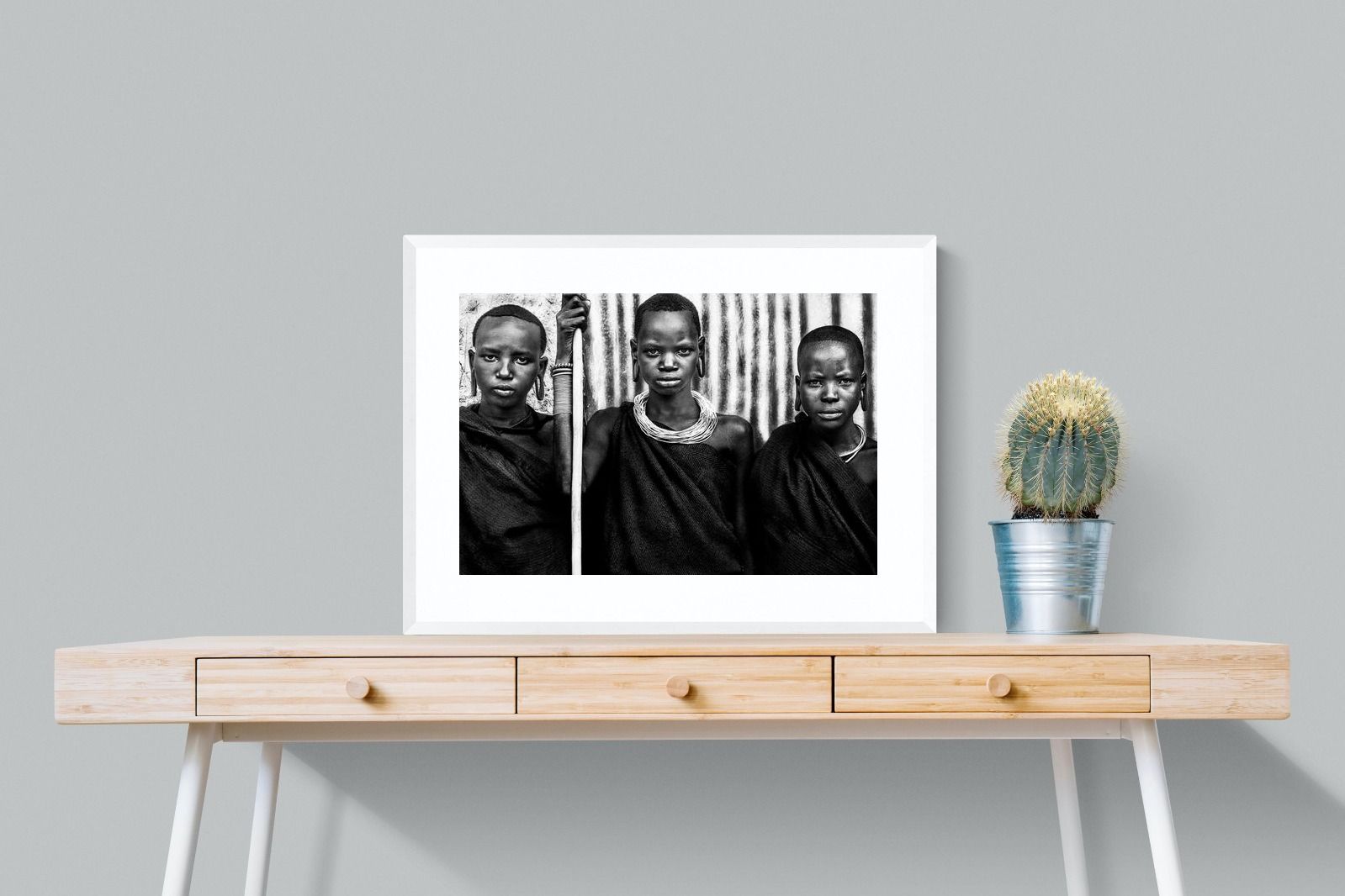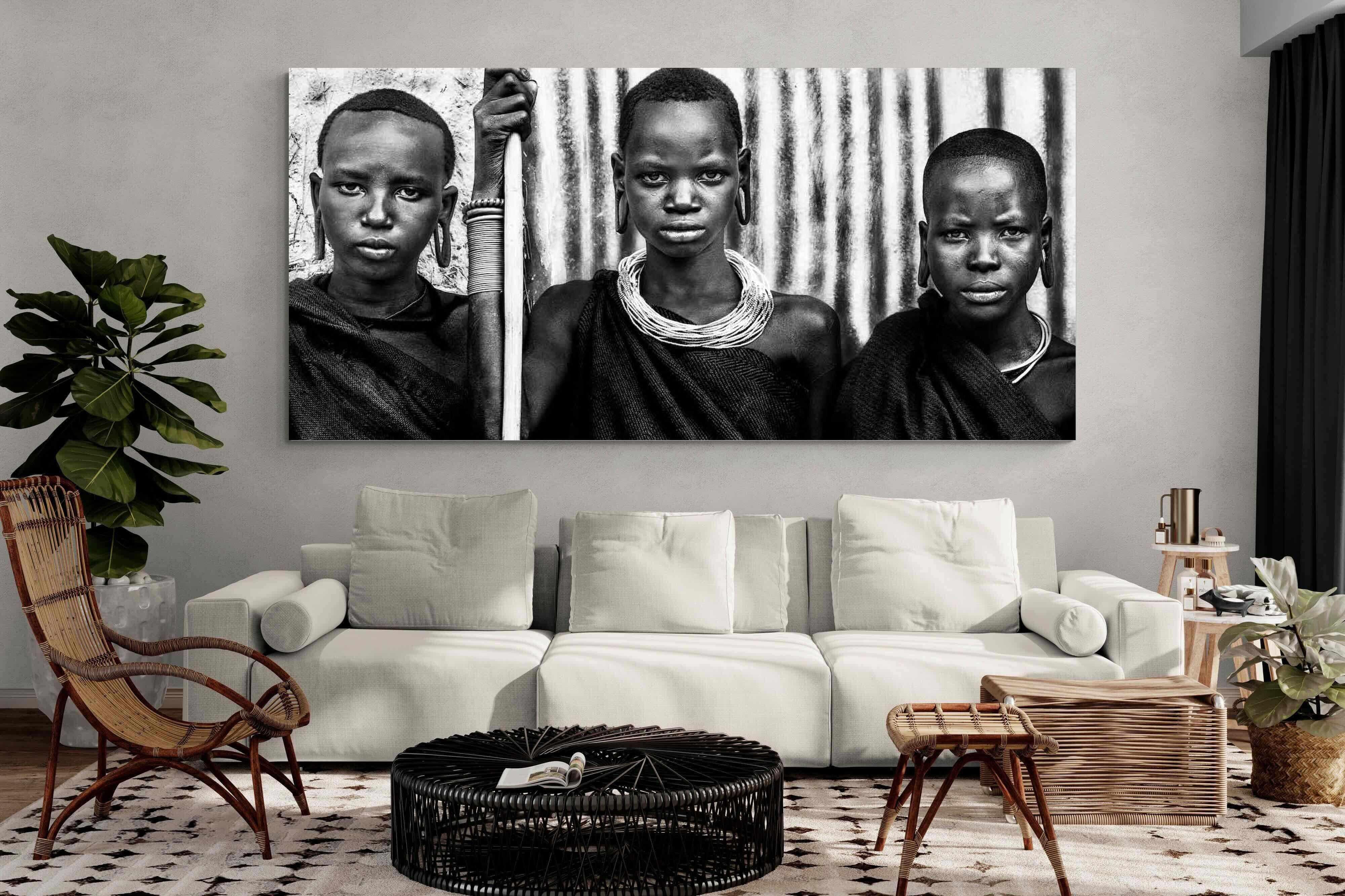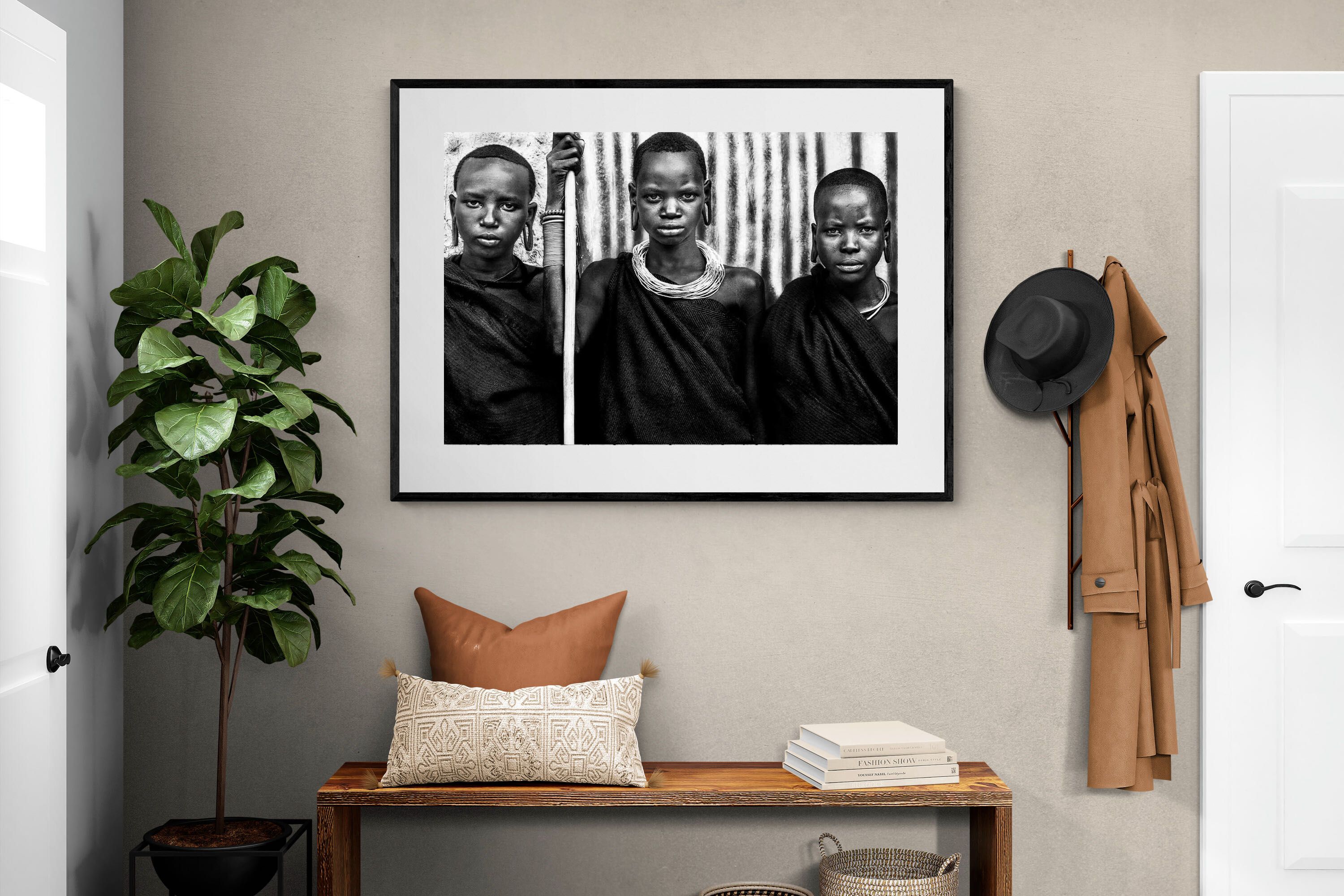 This striking black and white photograph captures the compelling presence of women from the Suri tribe in Ethiopia. Their gaze is direct and unwavering, traditional adornments underscoring their cultural heritage. The monochromatic tones highlight the textures of their attire and the fine details of their jewellry, conveying a narrative of strength and tribal identity.