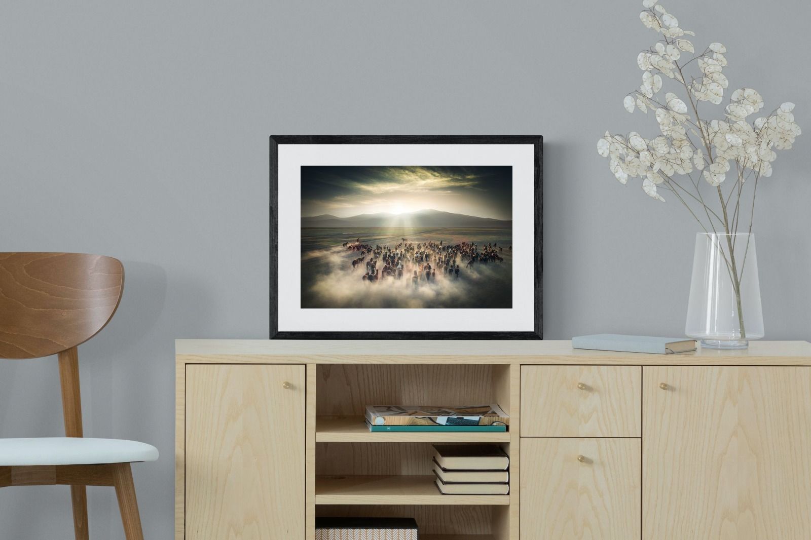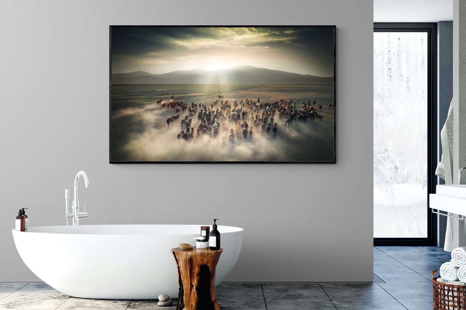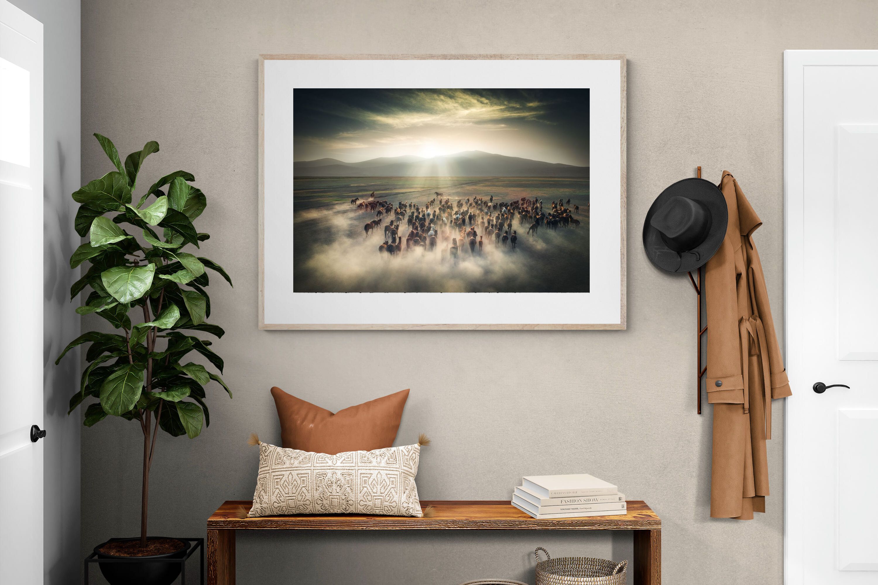 Breathtaking photo by Cuma Cevik, of a herd of wild horses migrating across a landscape with sunlight creeping over the distant mountain range.