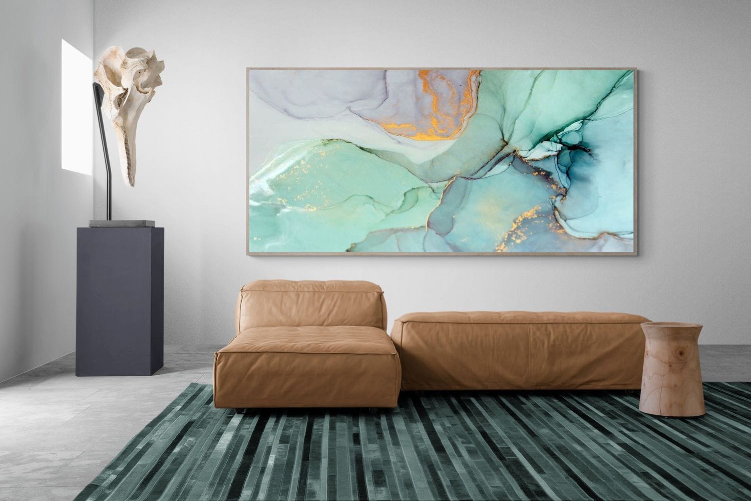 Soft washes of teal, mint, and lavender flow seamlessly together in this fluid ink artwork, enriched with shimmering gold accents. The organic shapes evoke underwater currents or marble veins, creating a luxurious yet tranquil atmosphere. Perfect for modern interiors, bedrooms or calm workspaces, this piece adds a touch of refined elegance and contemporary flair to any neutral or pastel colour scheme.