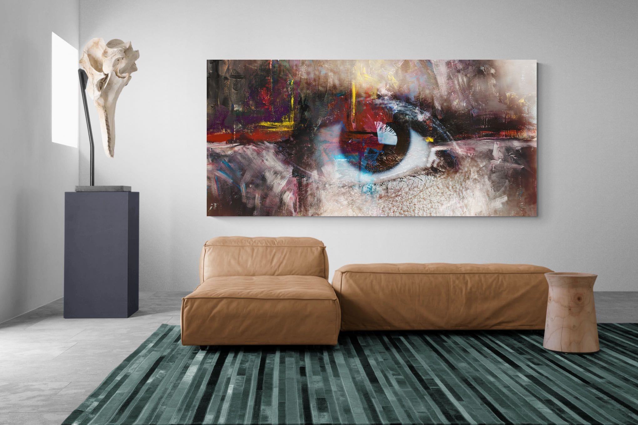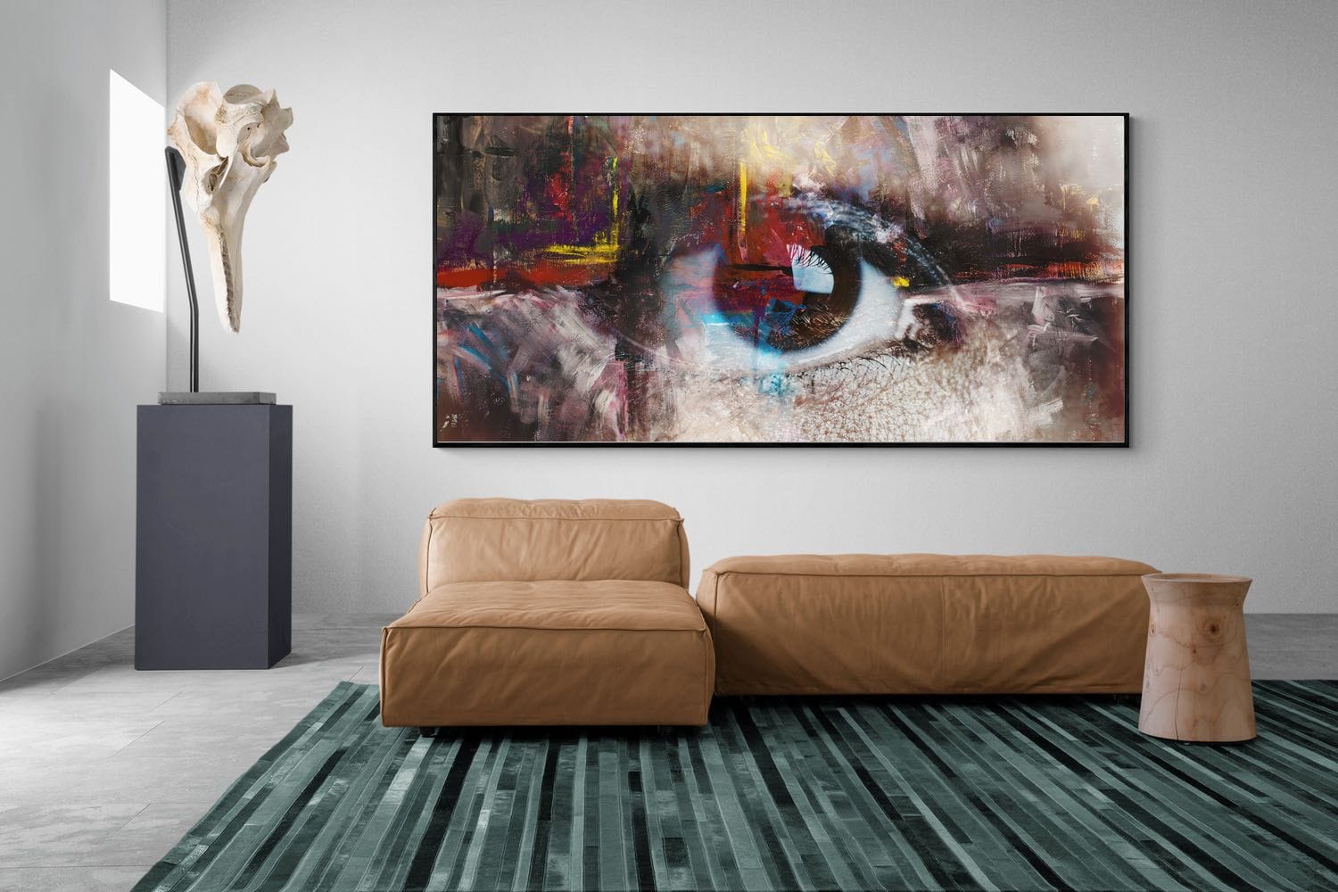 Layers of paint, texture and colour merge around a striking human eye, creating a powerful piece of abstract expression. Bold reds, blues and gold tones swirl through the composition, suggesting emotion, memory and imagination. The artwork balances realism with painterly abstraction, drawing the viewer into its layered visual story. A dramatic and contemporary statement piece suited to modern interiors, creative studios or bold living spaces.