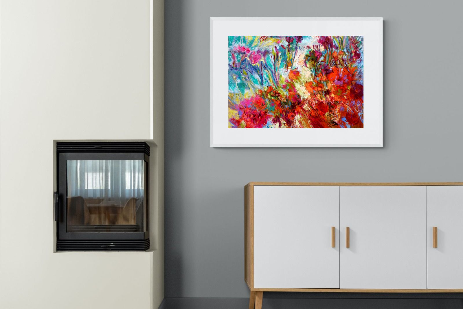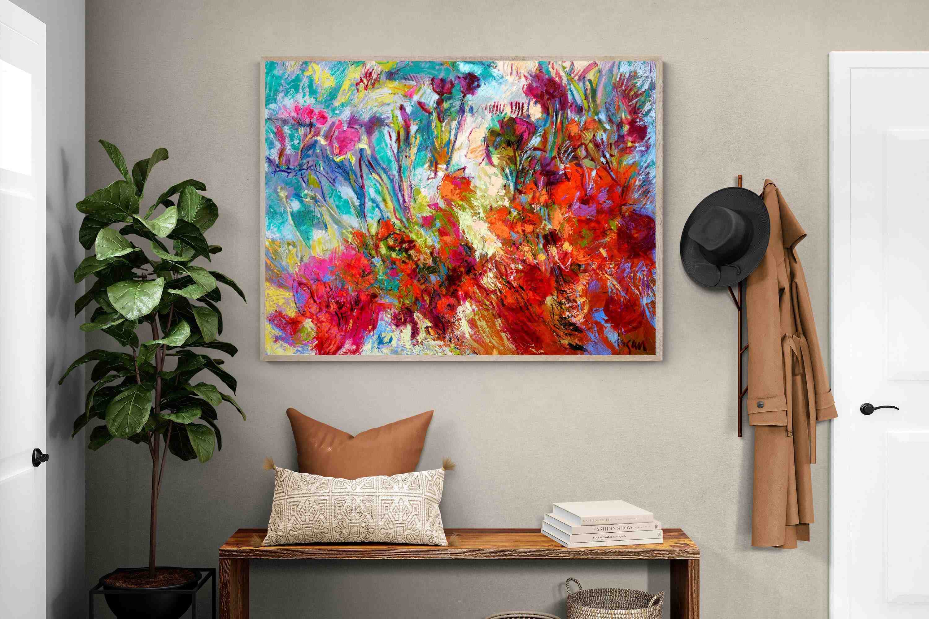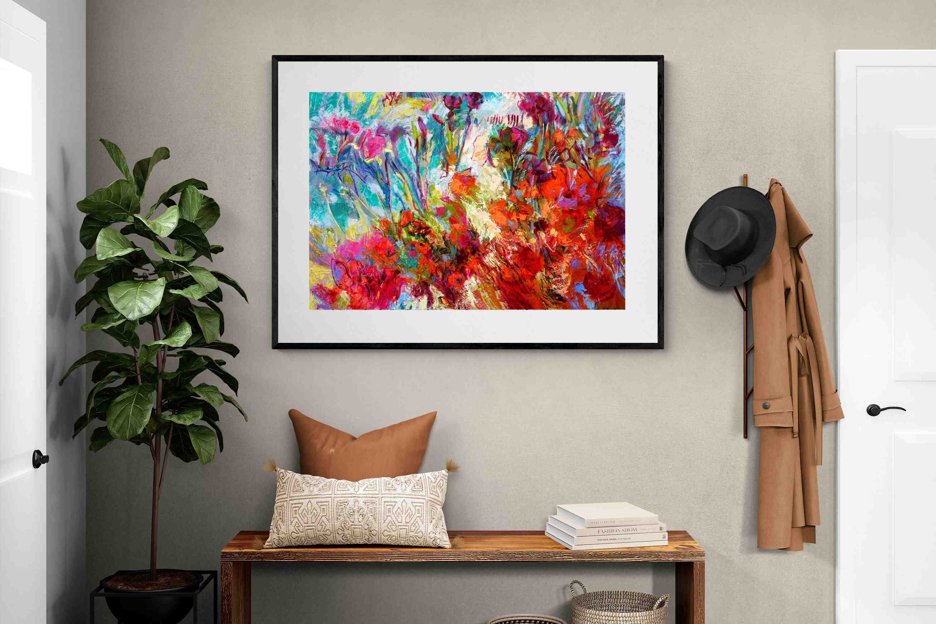 Our mounted canvas option is ready to hang and beautifully translates the vivacious energy and vibrant colours of this painting. Learn more about this option by watching this short video. Alternatively, you may opt for our floating frame in black, white, or natural wood, which can elegantly complement this vibrant artwork.