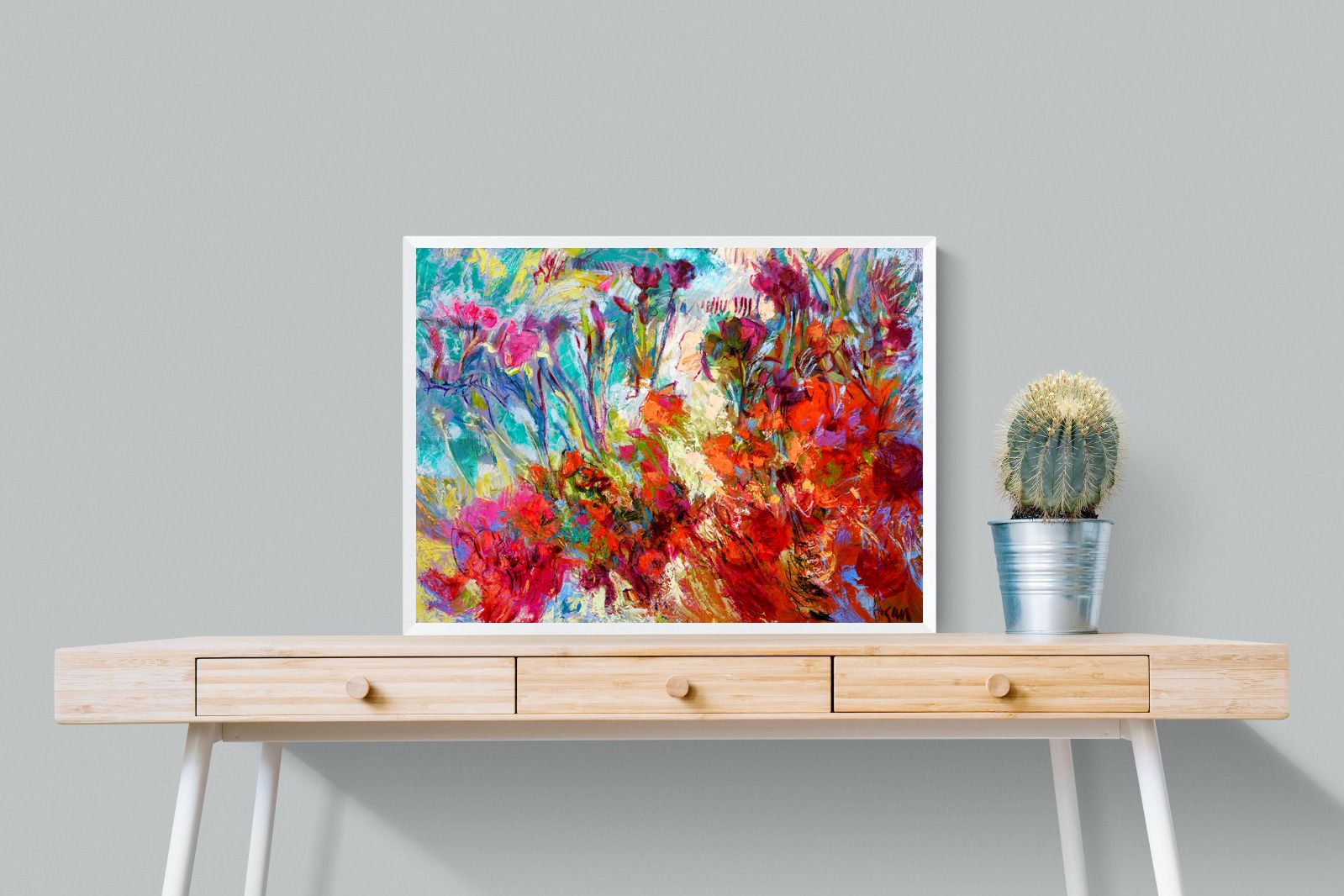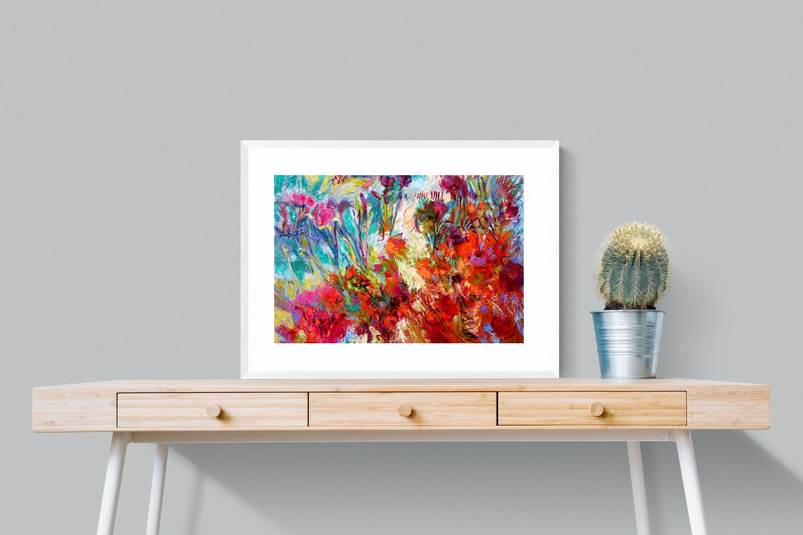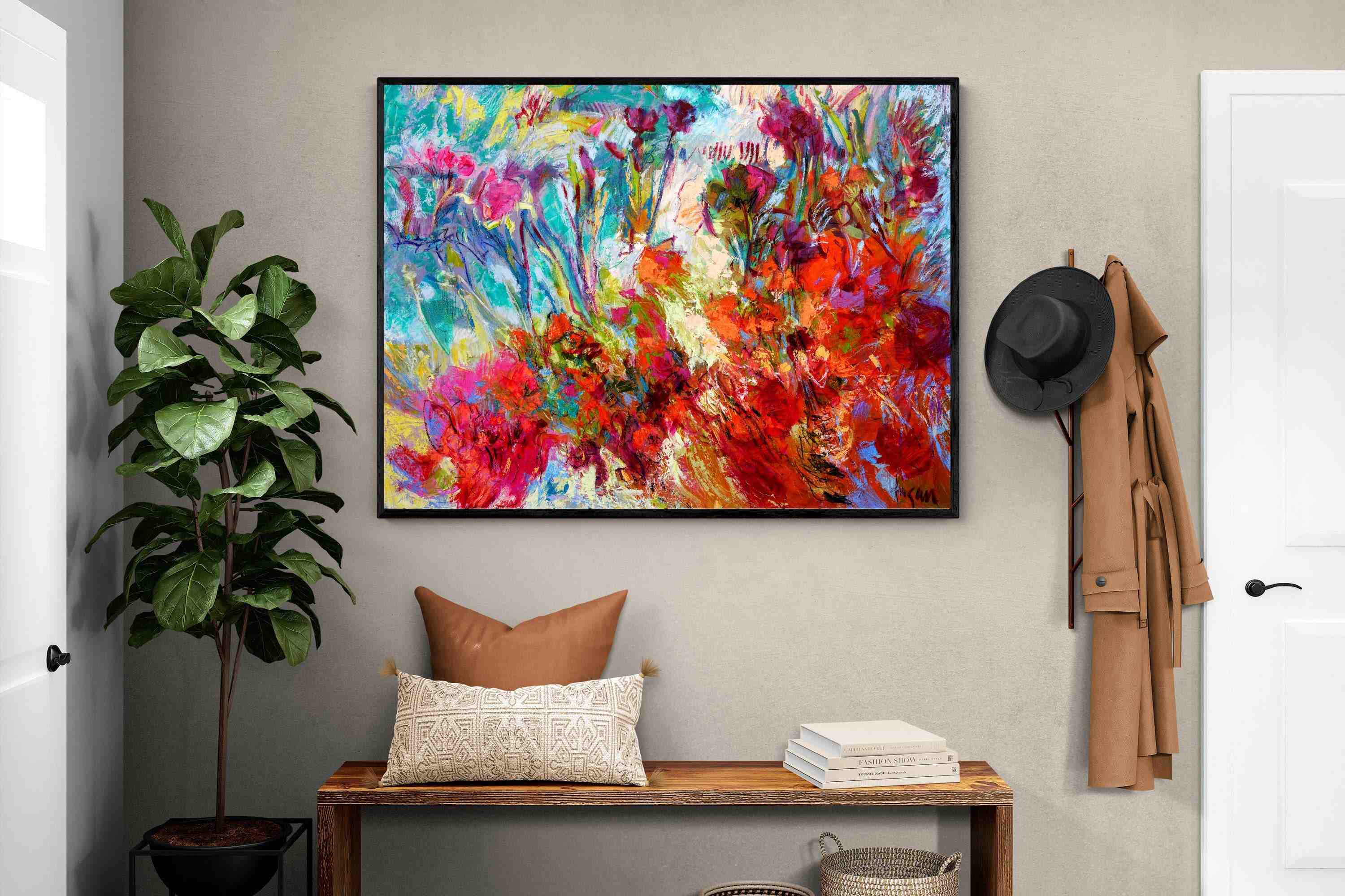 Our mounted canvas option is ready to hang and beautifully translates the vivacious energy and vibrant colours of this painting. Learn more about this option by watching this short video. Alternatively, you may opt for our floating frame in black, white, or natural wood, which can elegantly complement this vibrant artwork.