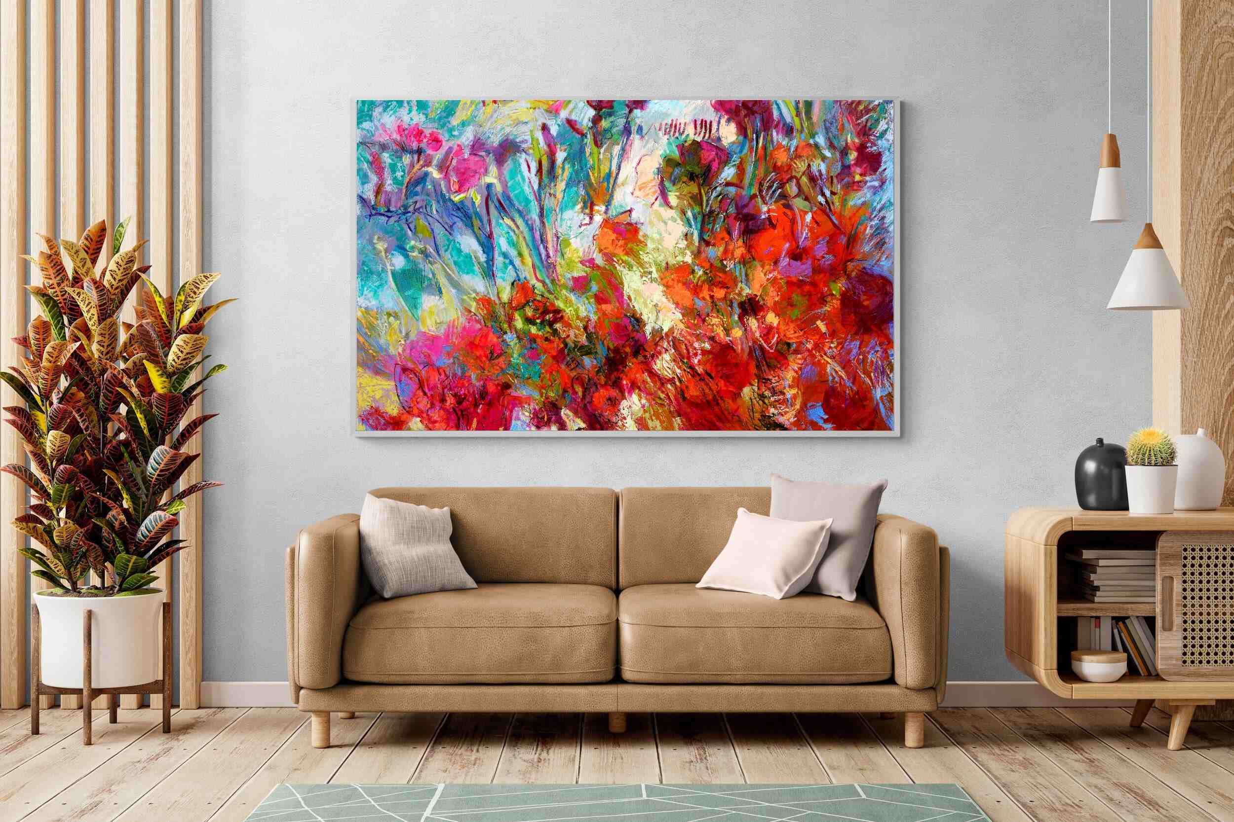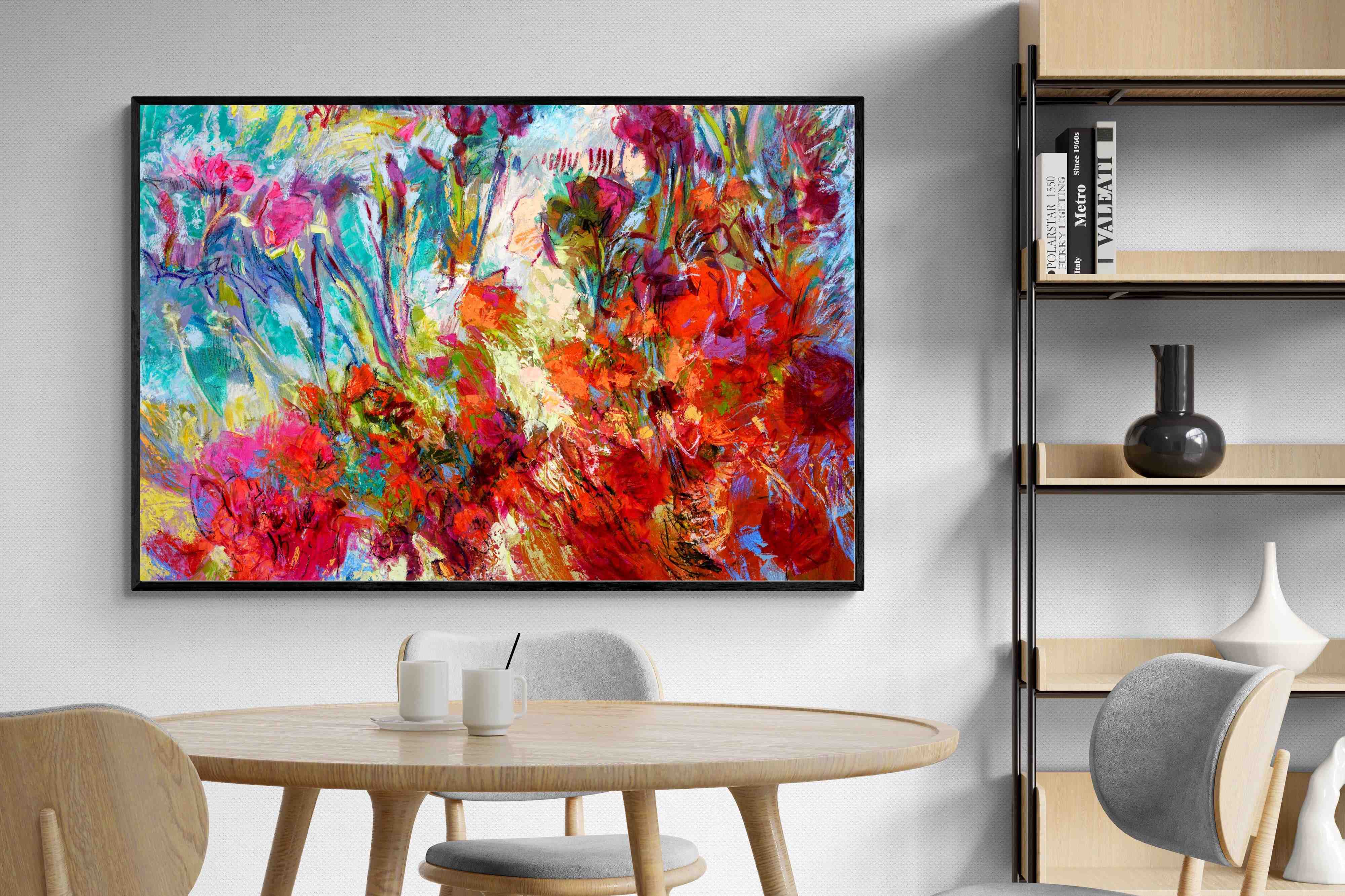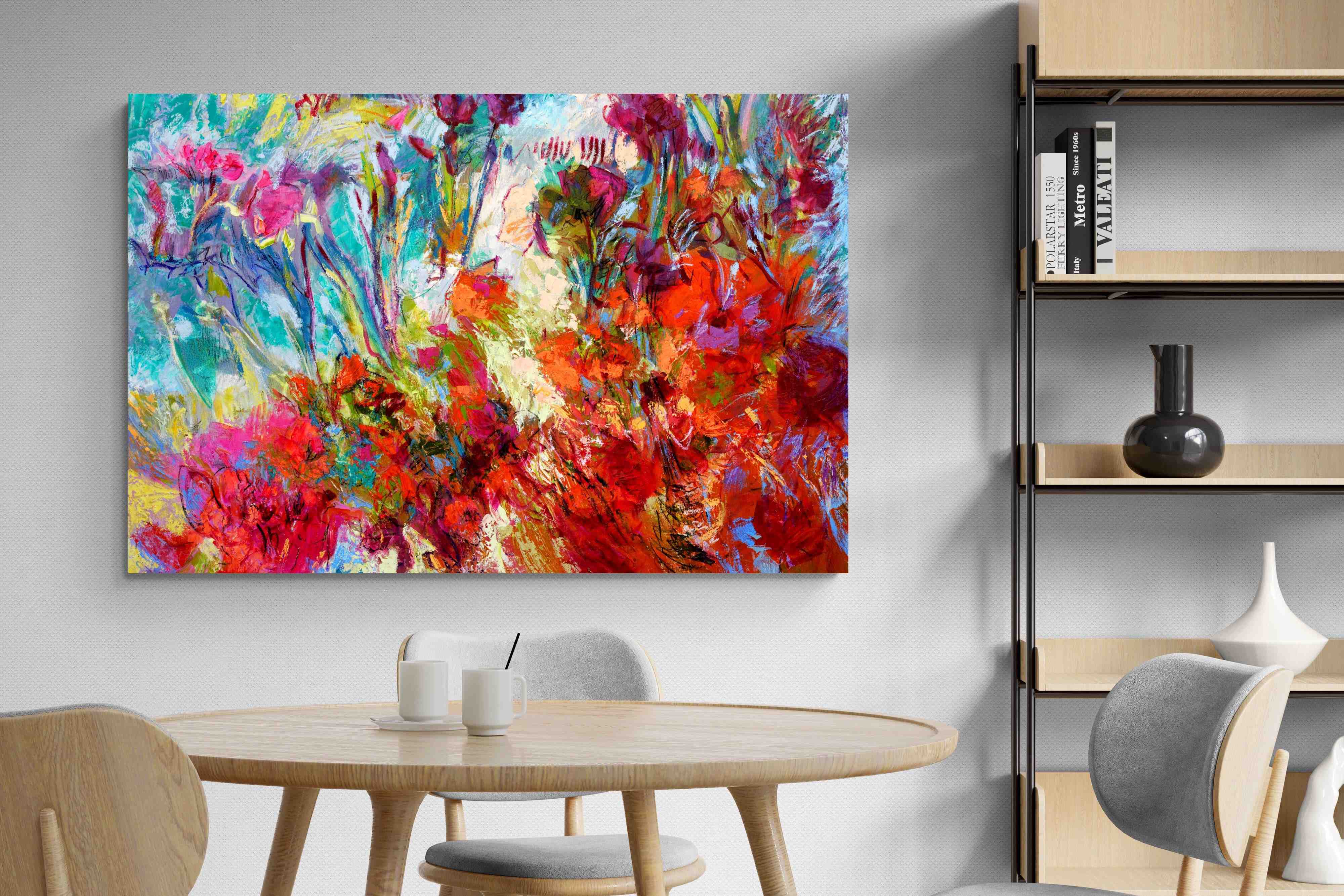 Presenting "Let Me Bloom" Wall Art, a breathtakingly vibrant painting by the acclaimed artist Dorothy Fagan. This abstract floral composition radiates with a burst of red, orange, and turquoise colours, embodying an intoxicating sense of life and growth.