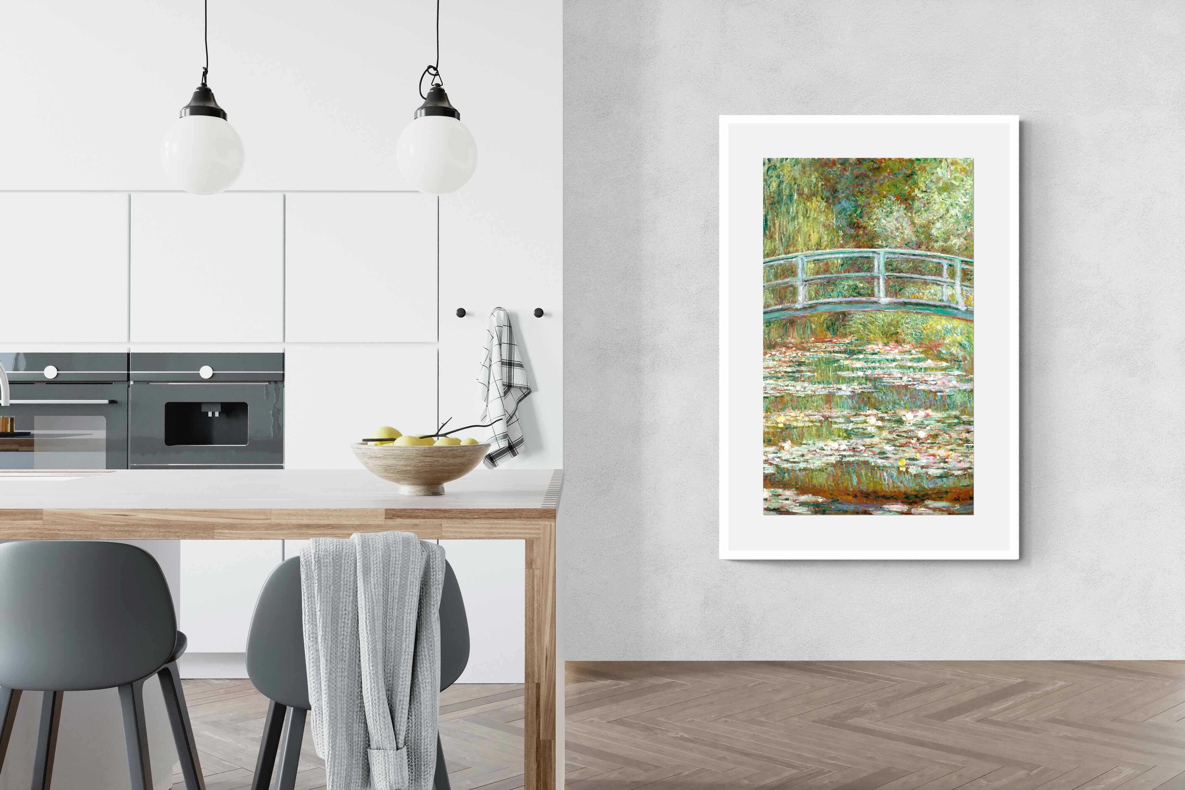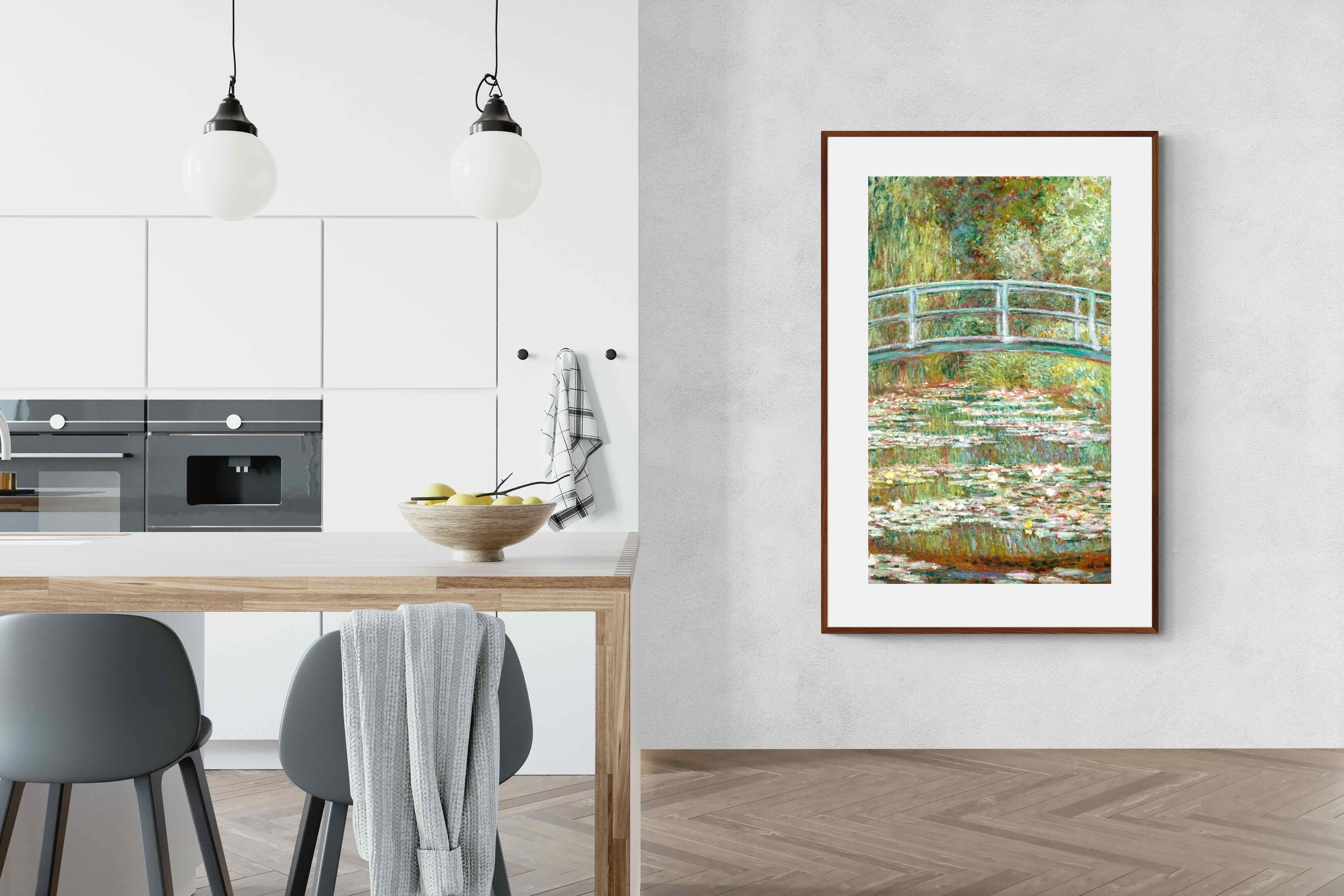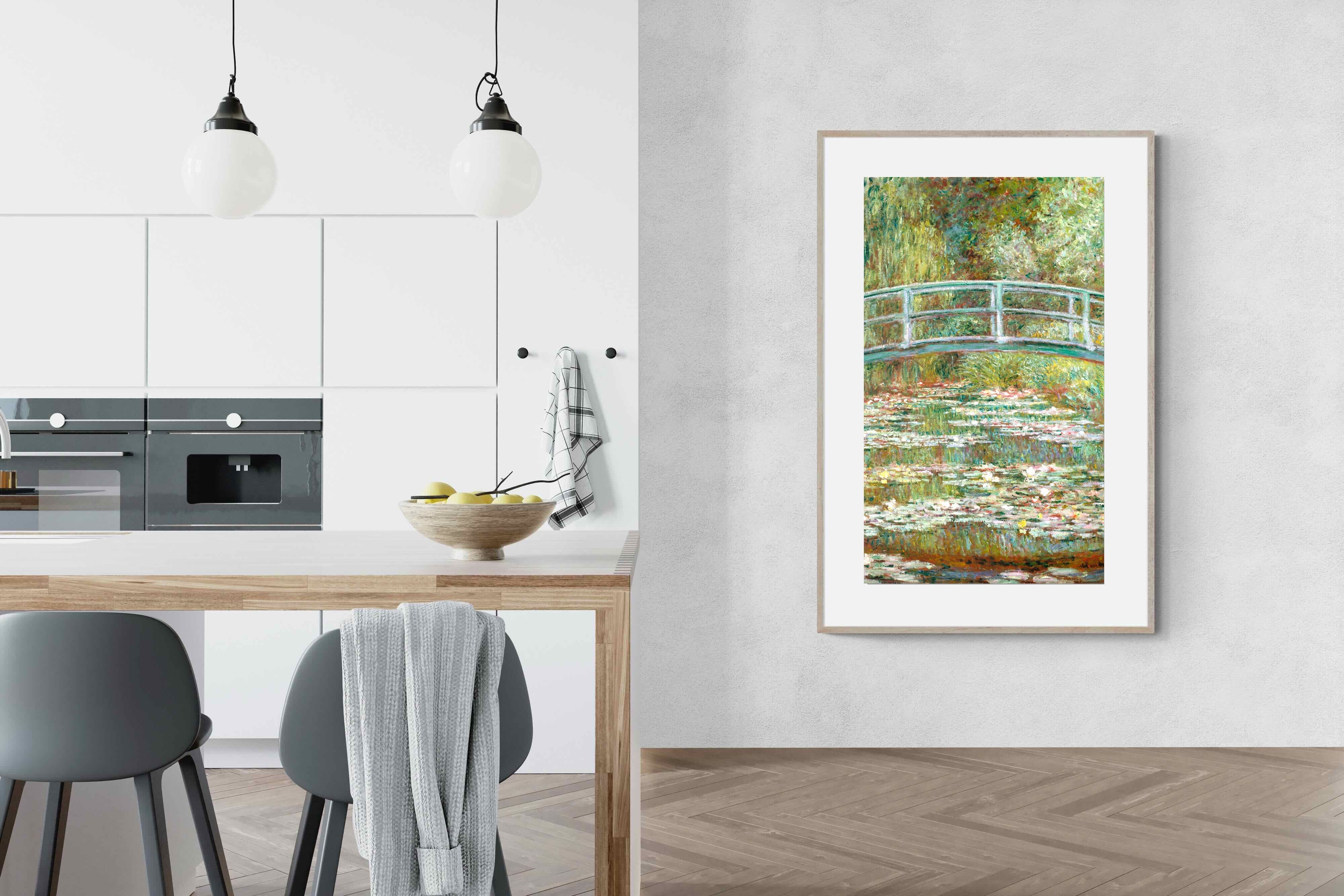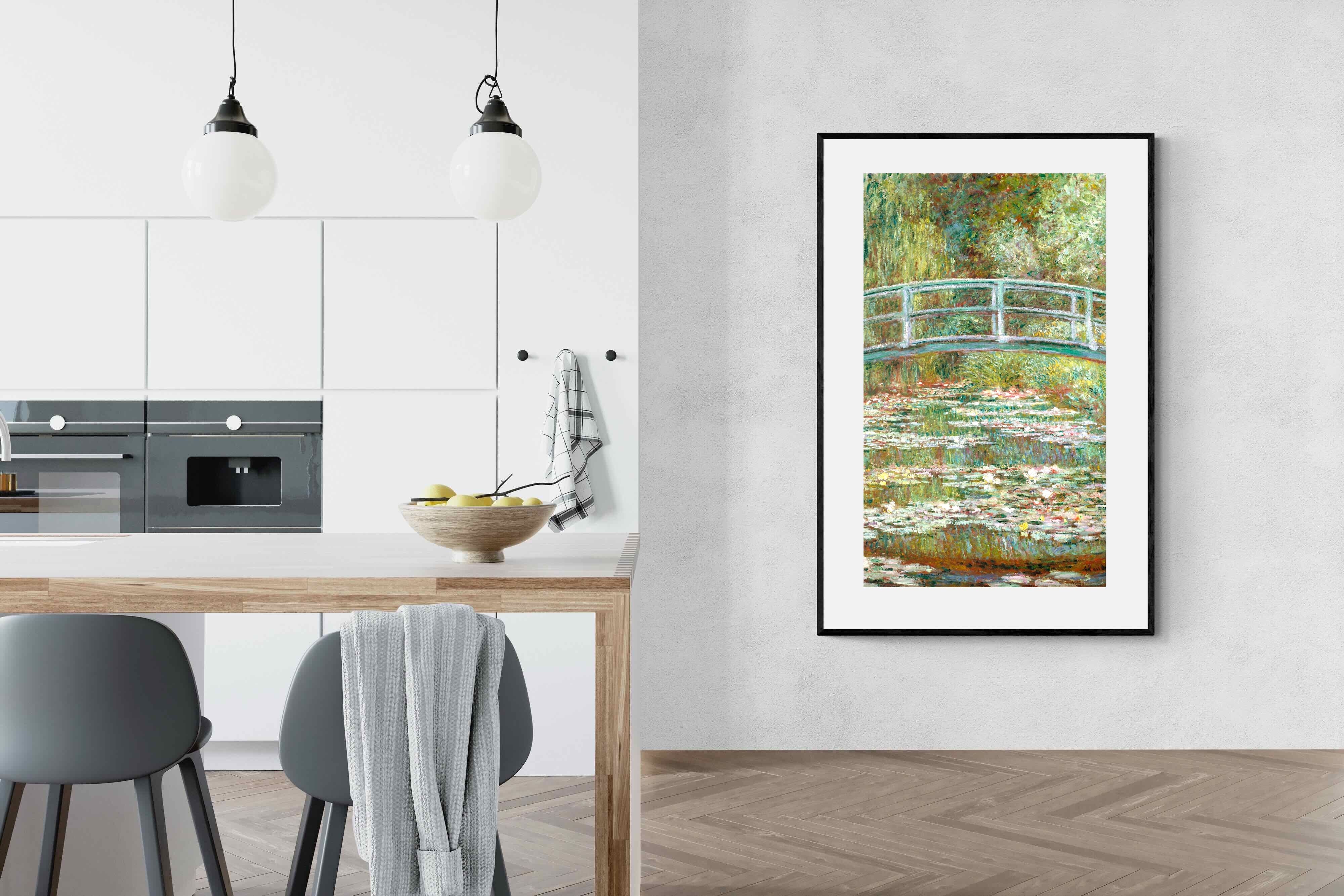 This 1899 painting is one of Monet's iconic depictions of his garden in Giverny. It captures the tranquility of a Japanese-style bridge arching gracefully over a pond filled with water lilies. Monet’s use of vivid greens and soft pastels, along with textured brushstrokes, conveys a peaceful yet dynamic scene, full of the shimmering effects of sunlight on water and foliage.