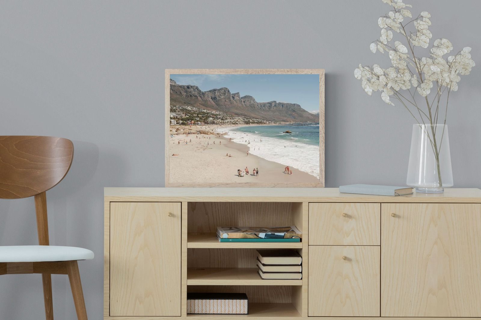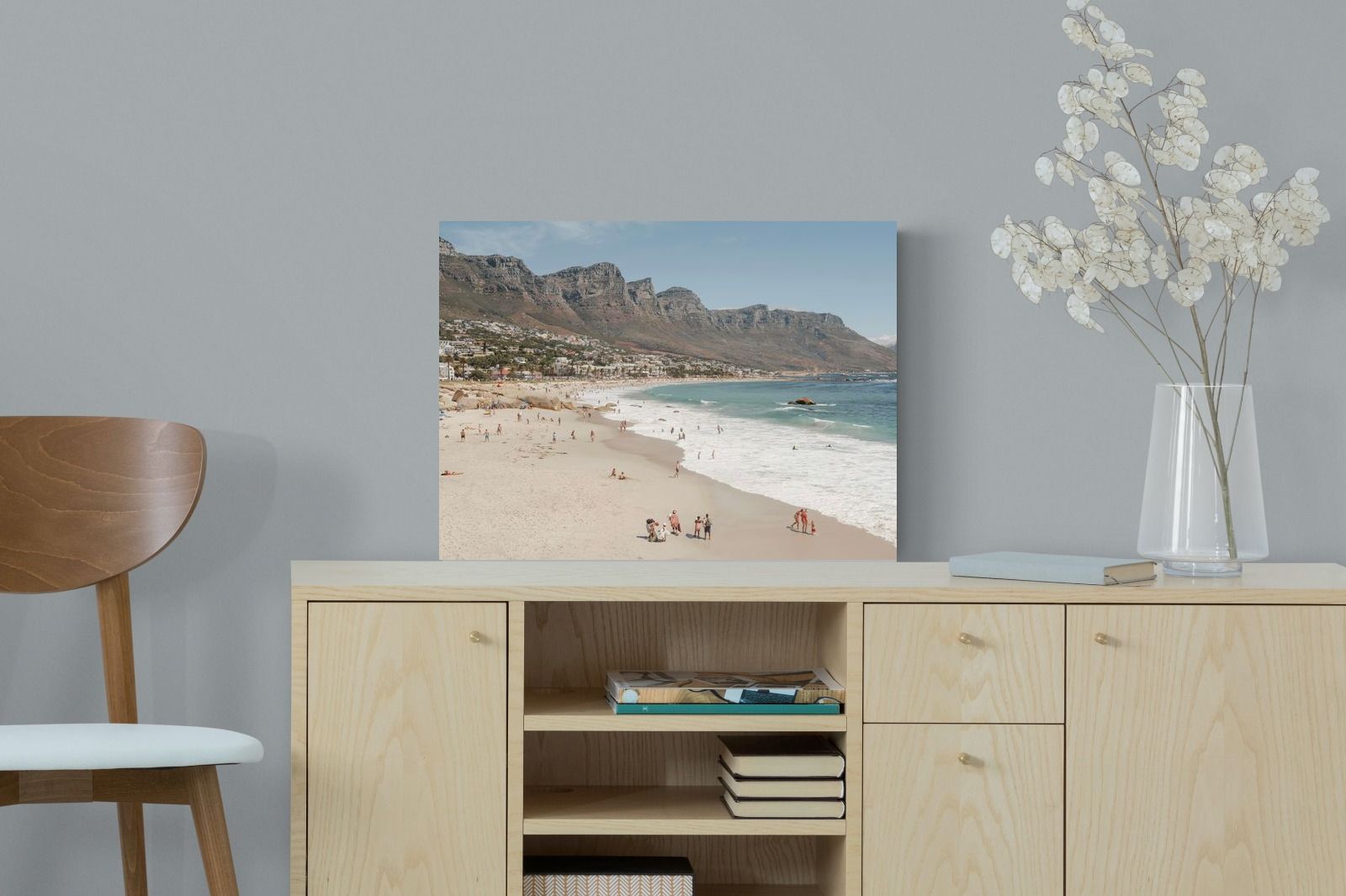 Camps Bay Beach unfolds beneath the dramatic Twelve Apostles mountain range in this expansive coastal scene. Golden sand meets rolling surf, while scattered beachgoers add scale and atmosphere. The layered composition balances mountain, ocean and shoreline in soft natural tones. Ideal for relaxed yet refined interiors, this artwork captures the vibrant energy and everyday beauty of one of Cape Town’s most celebrated beaches.