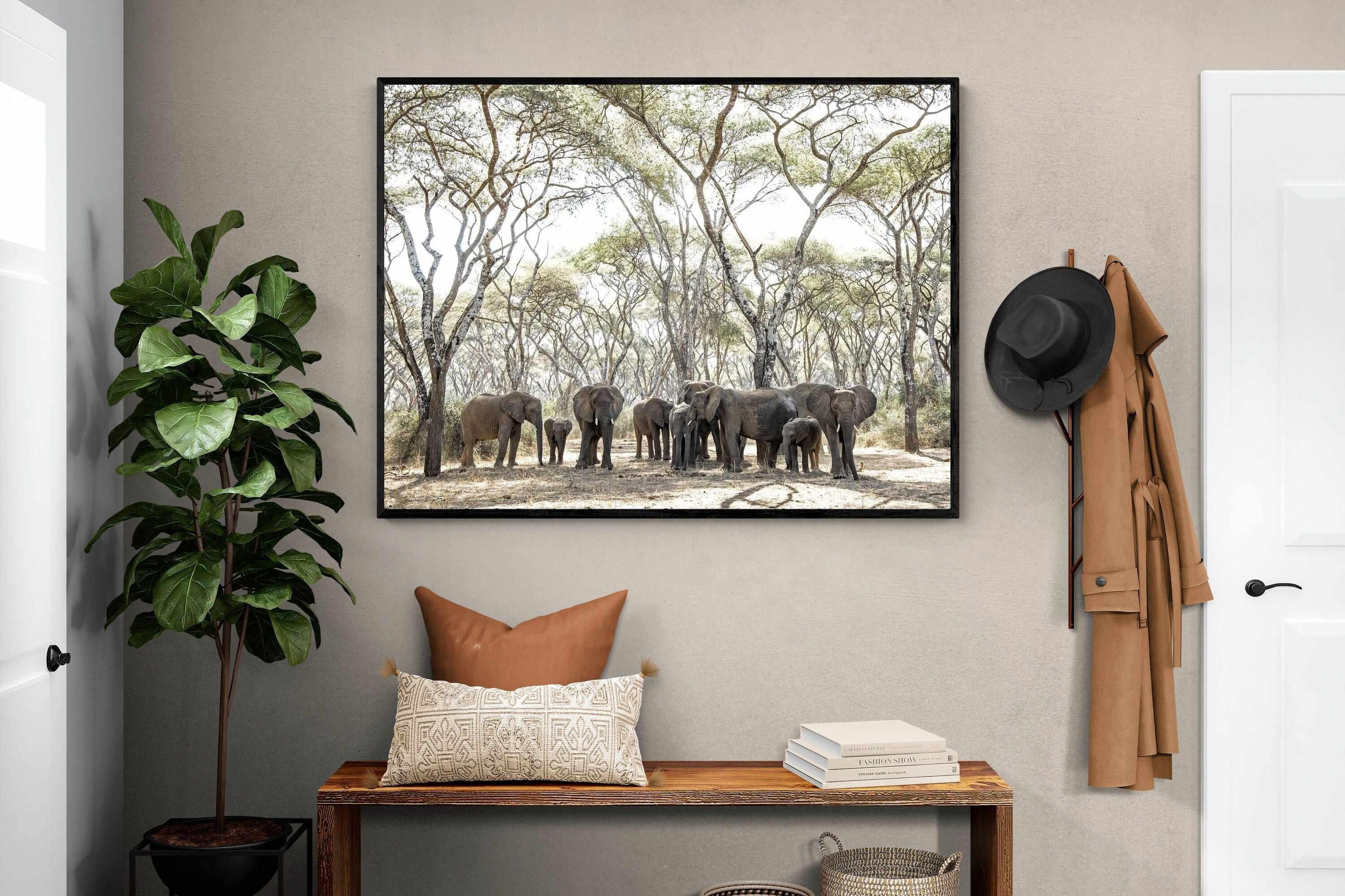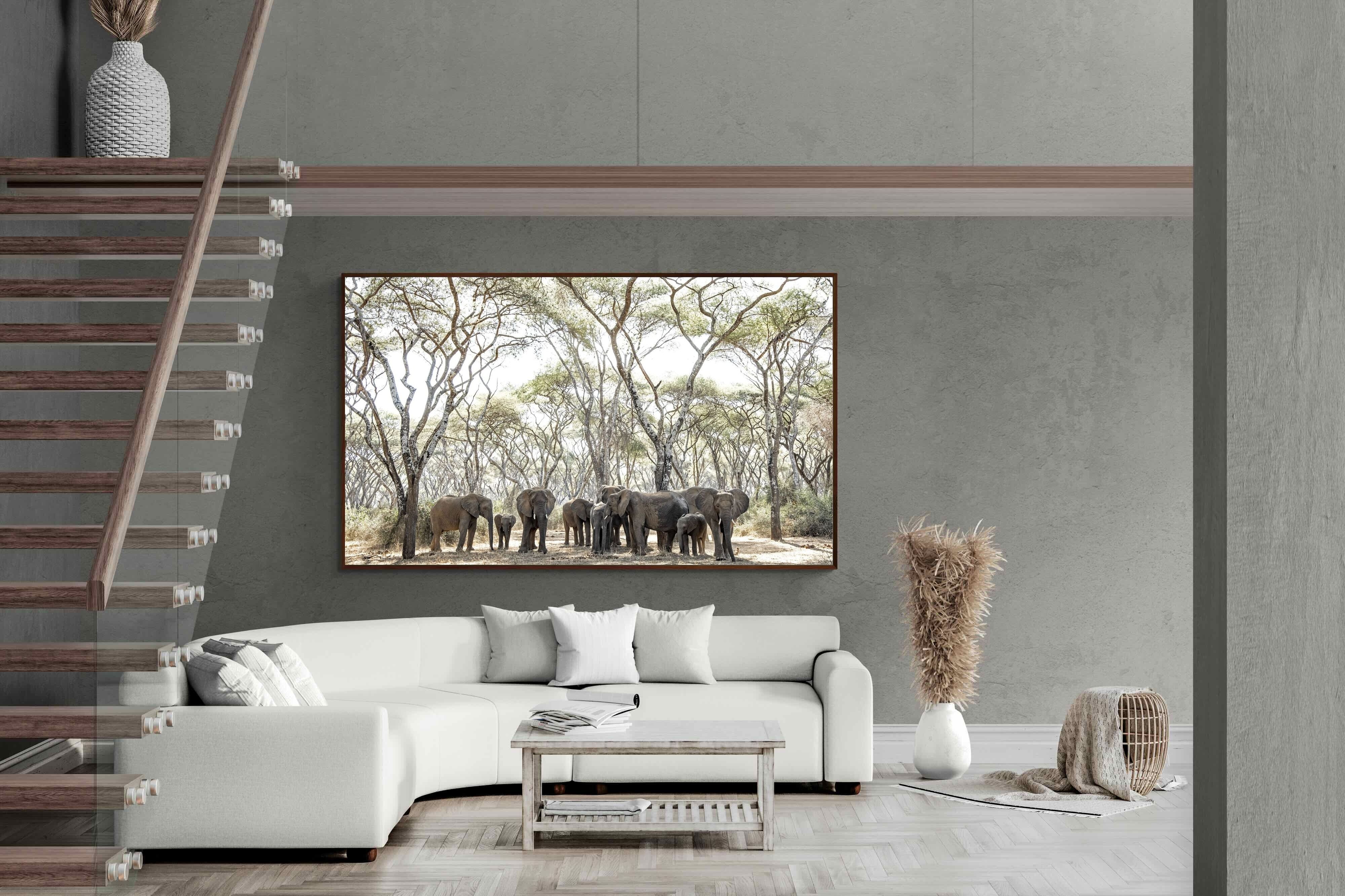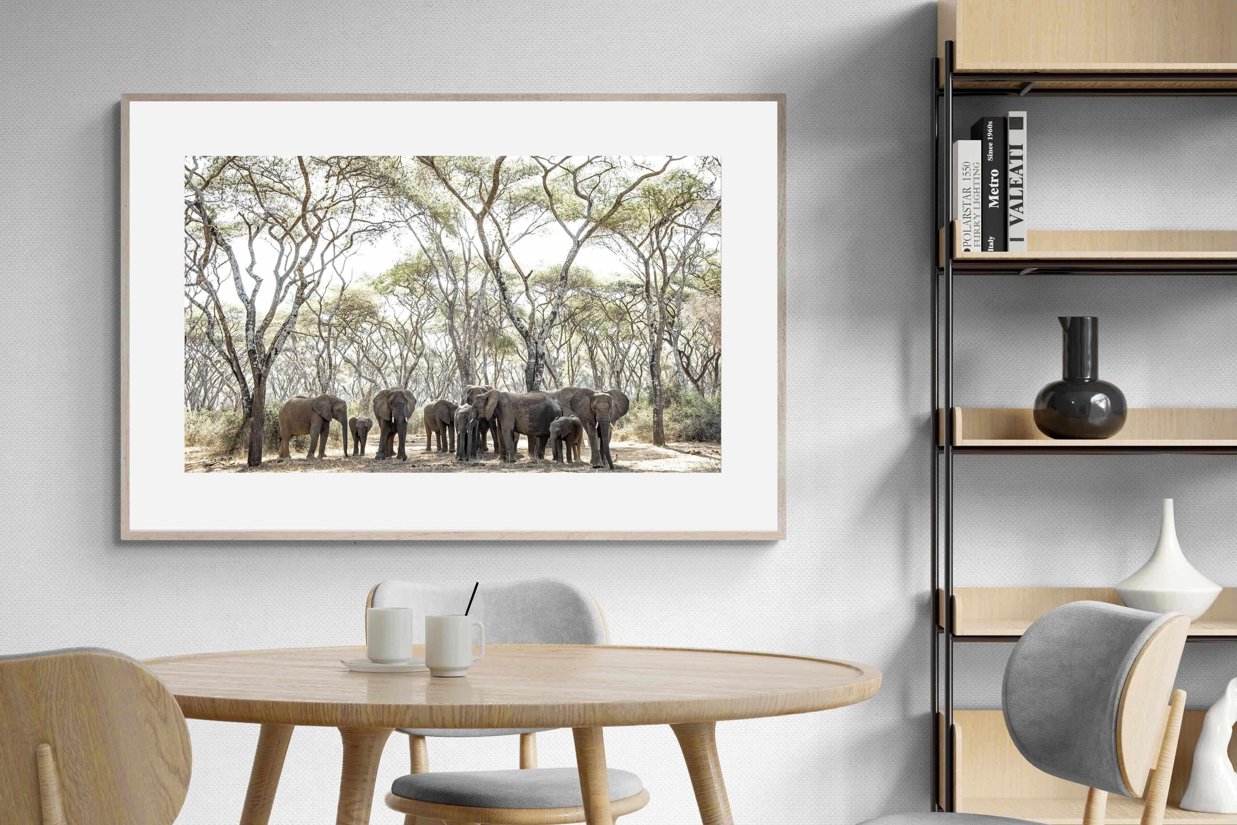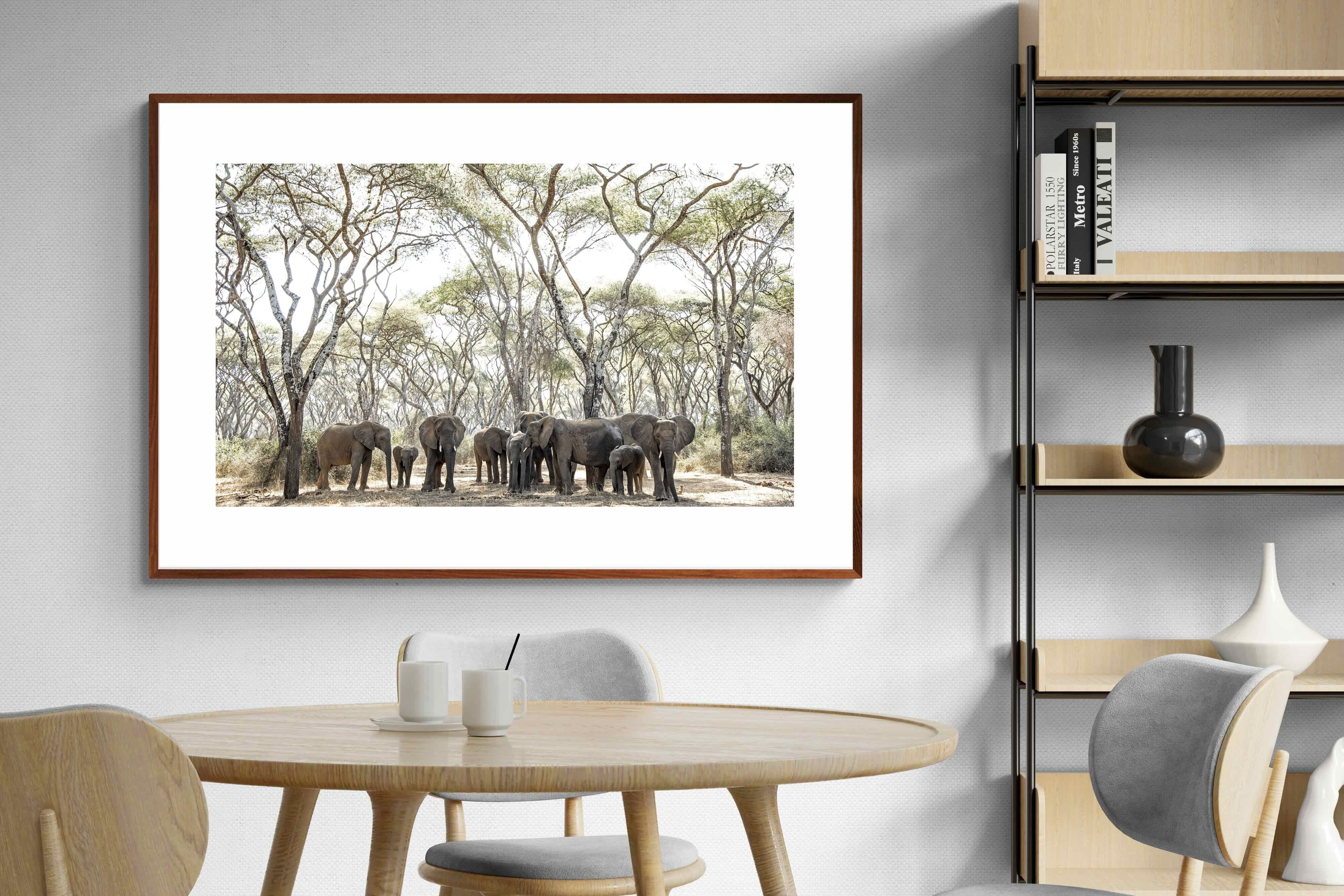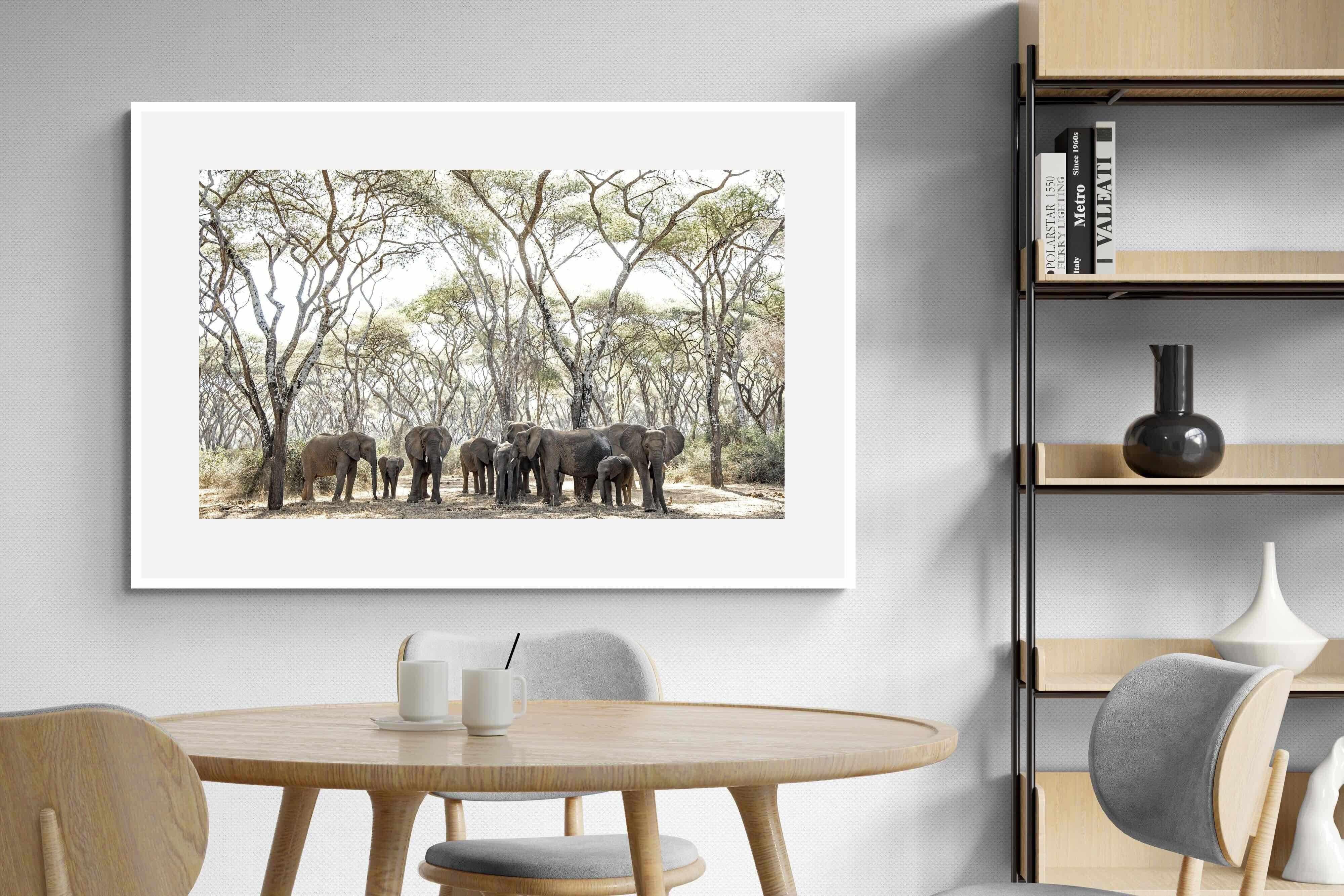 This fine art photograph by Jenny Hishin captures a tranquil herd of elephants beneath a canopy of light-filled umbrella trees. The soft tones of the forest and the majestic presence of the elephants create a peaceful, yet powerful connection with nature. Its calming earthy palette and minimalist composition make it ideal for contemporary home décor. The image invites contemplation and a sense of grounding, harmonising with modern aesthetics while bringing the beauty of wildlife into the space.