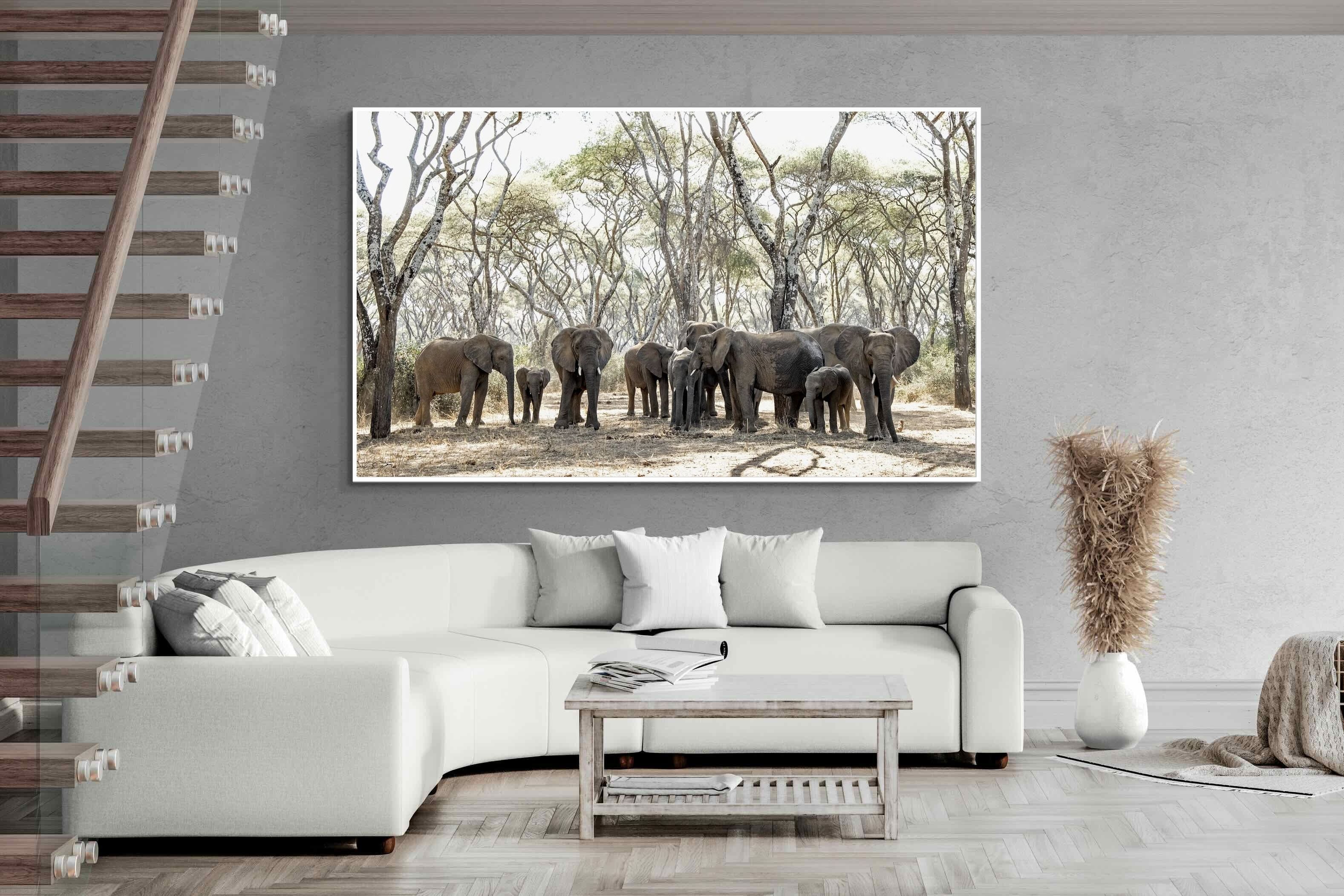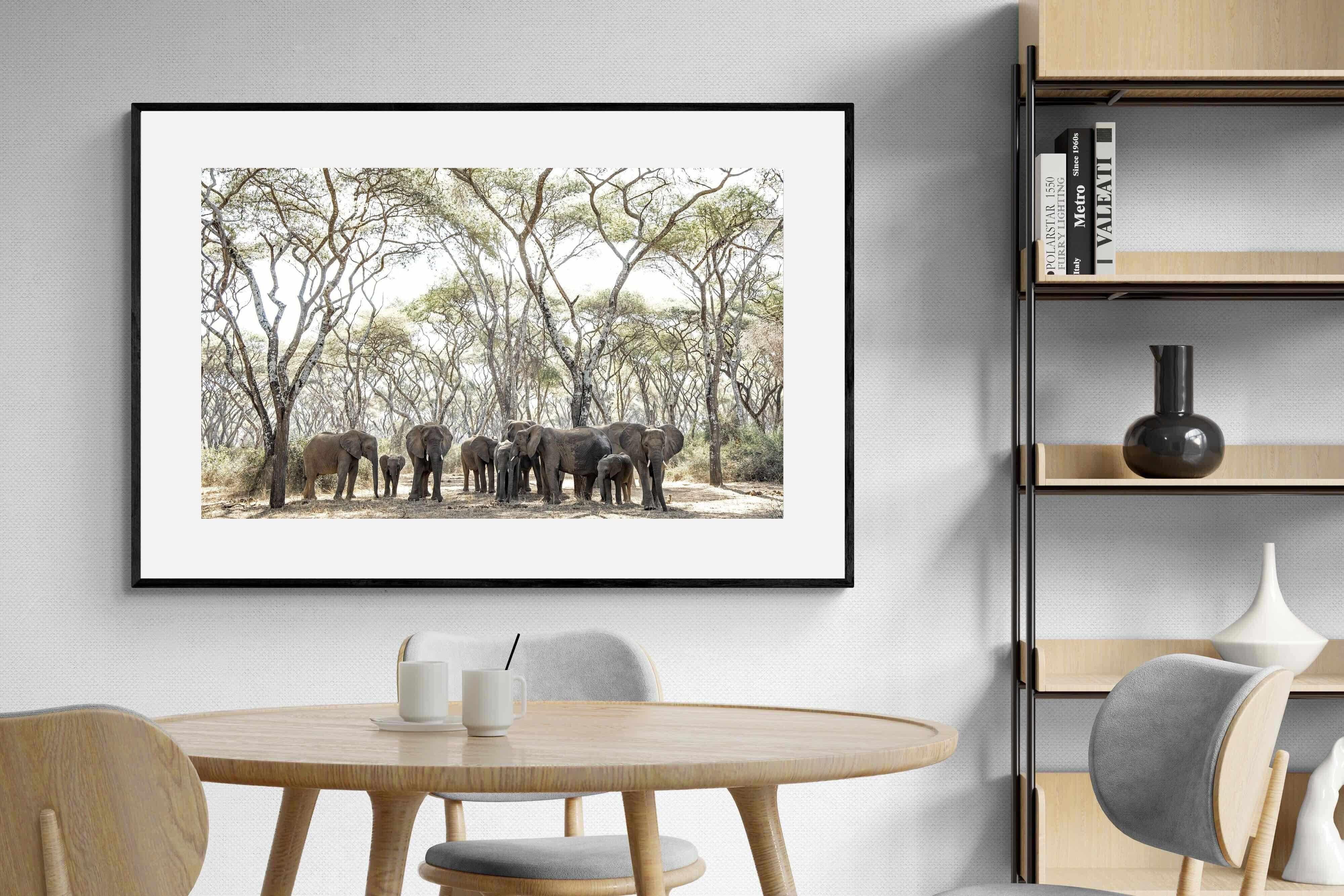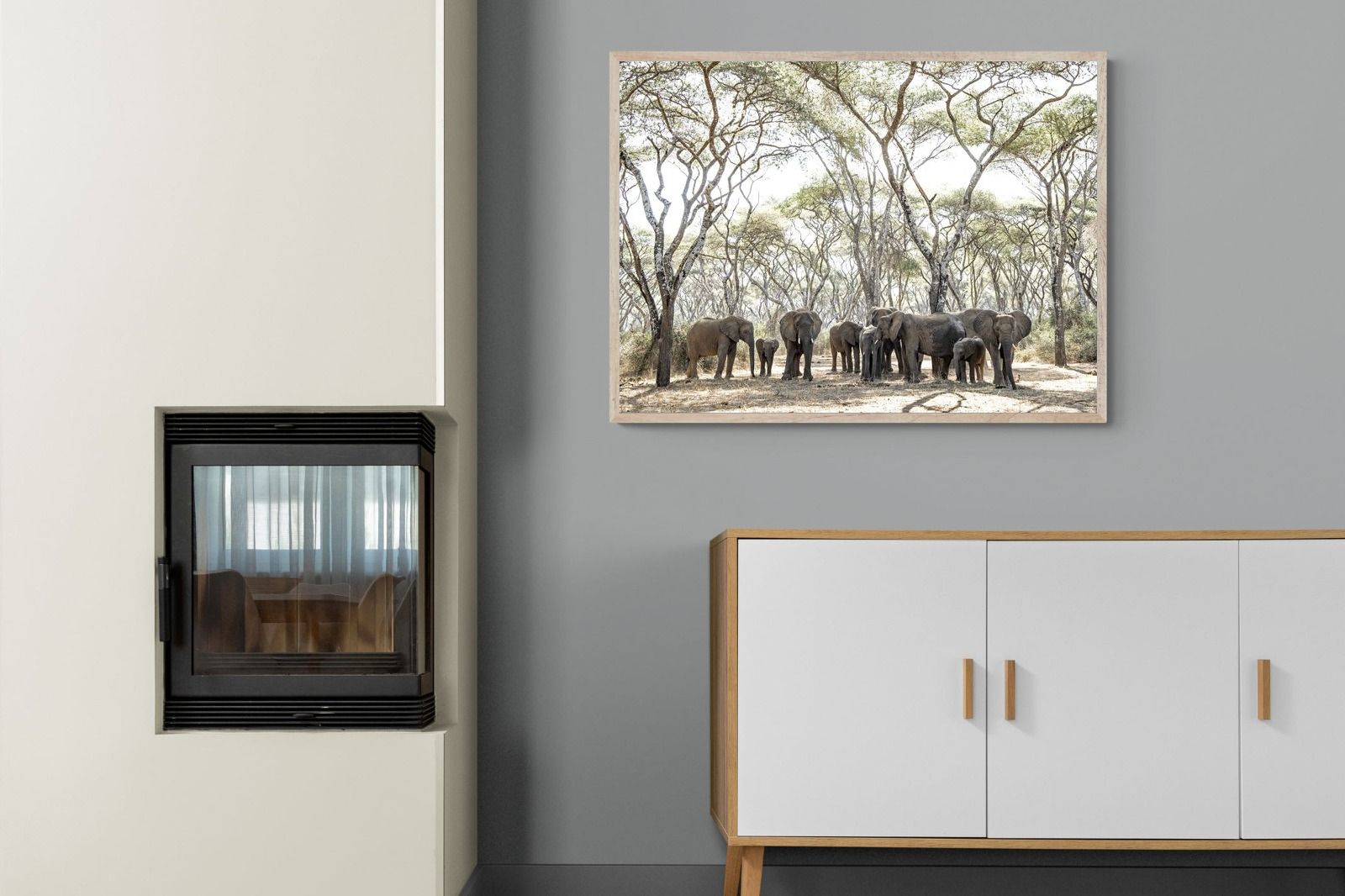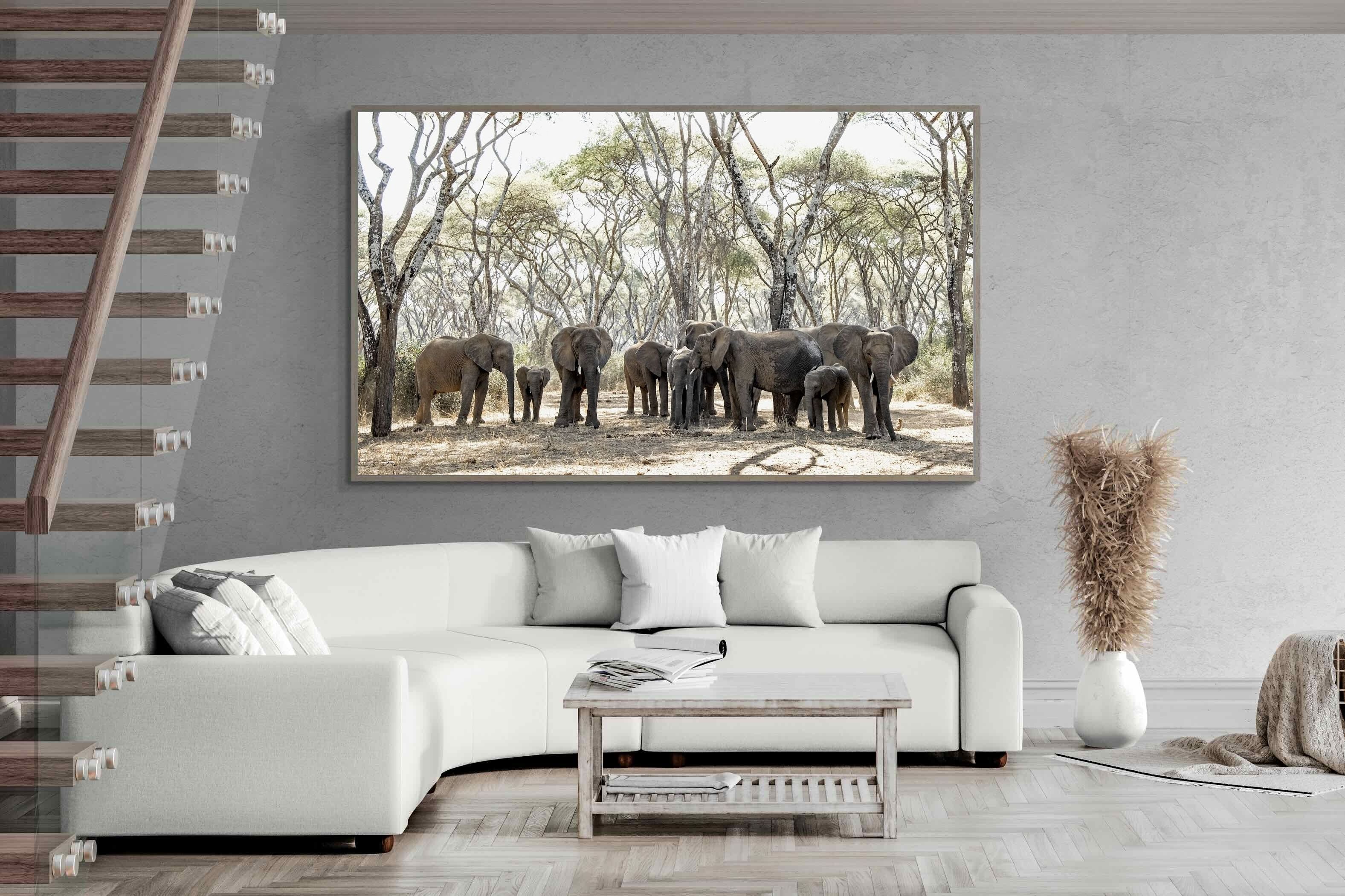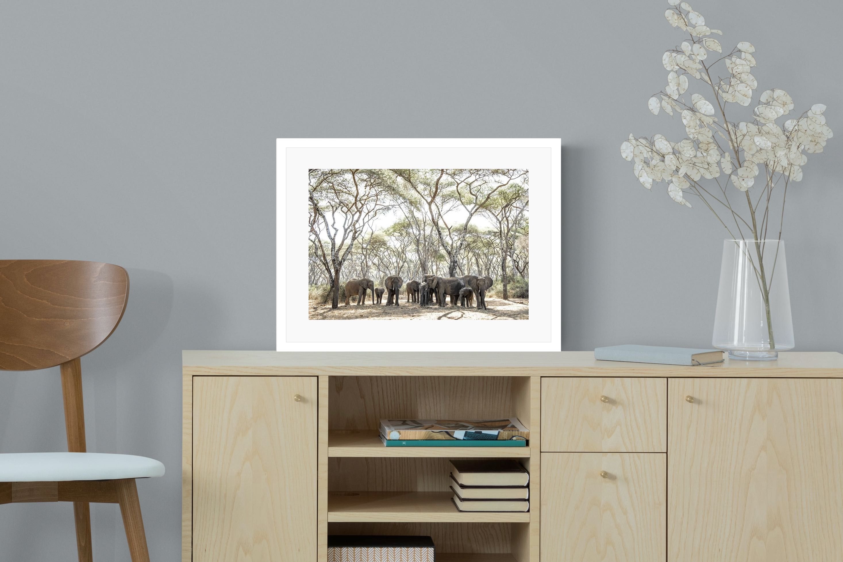 This fine art photograph by Jenny Hishin captures a tranquil herd of elephants beneath a canopy of light-filled umbrella trees. The soft tones of the forest and the majestic presence of the elephants create a peaceful, yet powerful connection with nature. Its calming earthy palette and minimalist composition make it ideal for contemporary home décor. The image invites contemplation and a sense of grounding, harmonising with modern aesthetics while bringing the beauty of wildlife into the space.