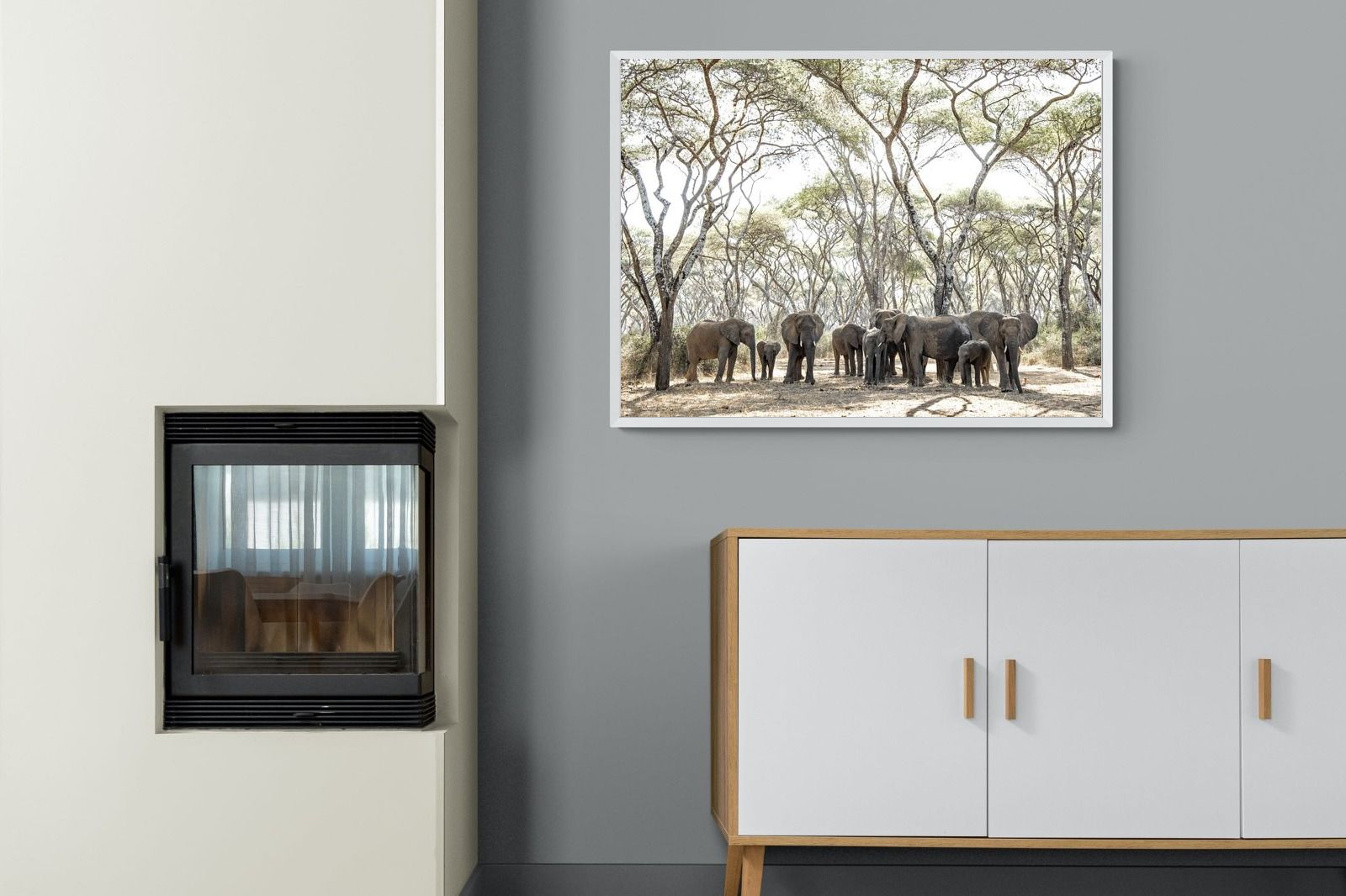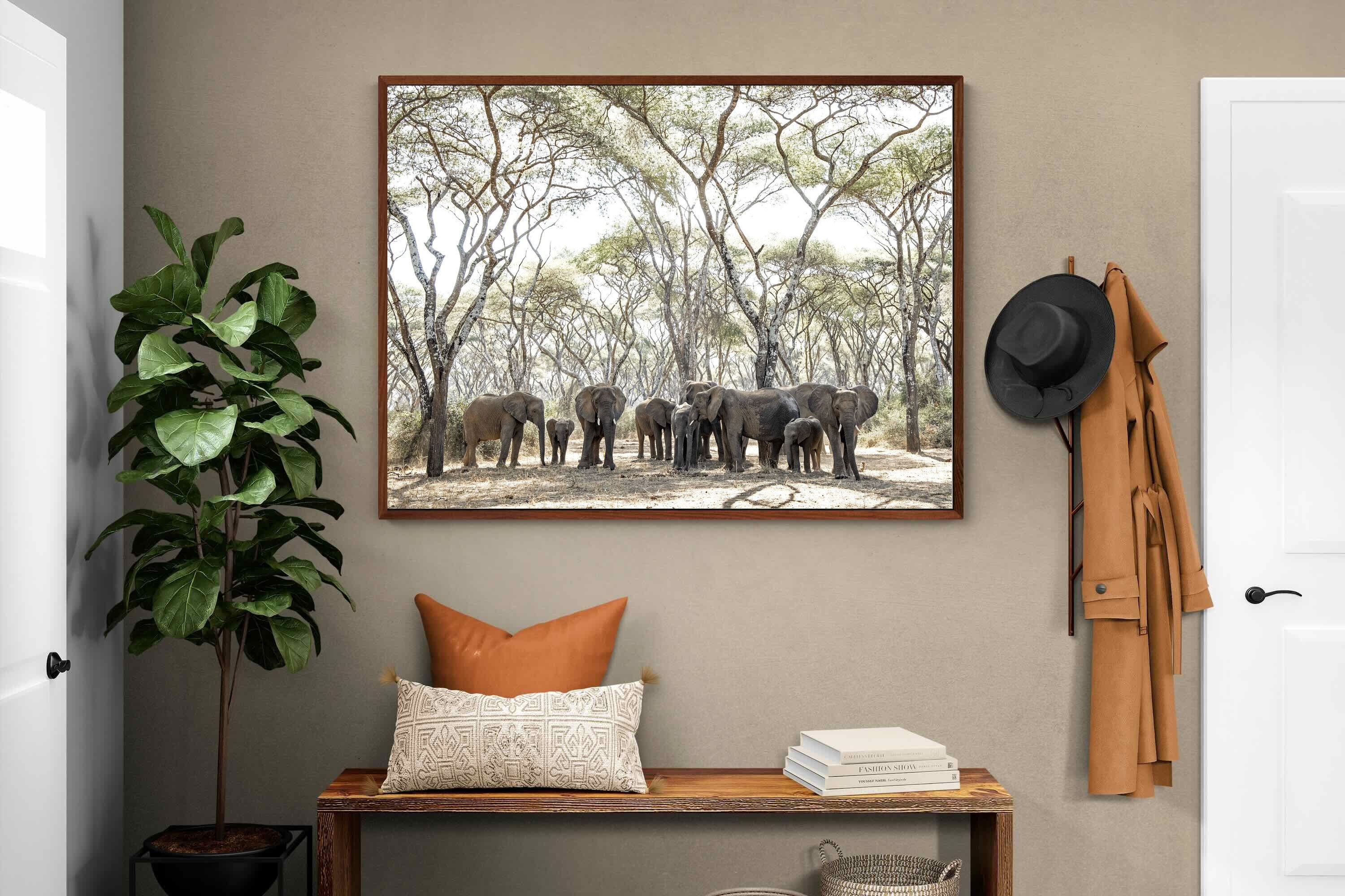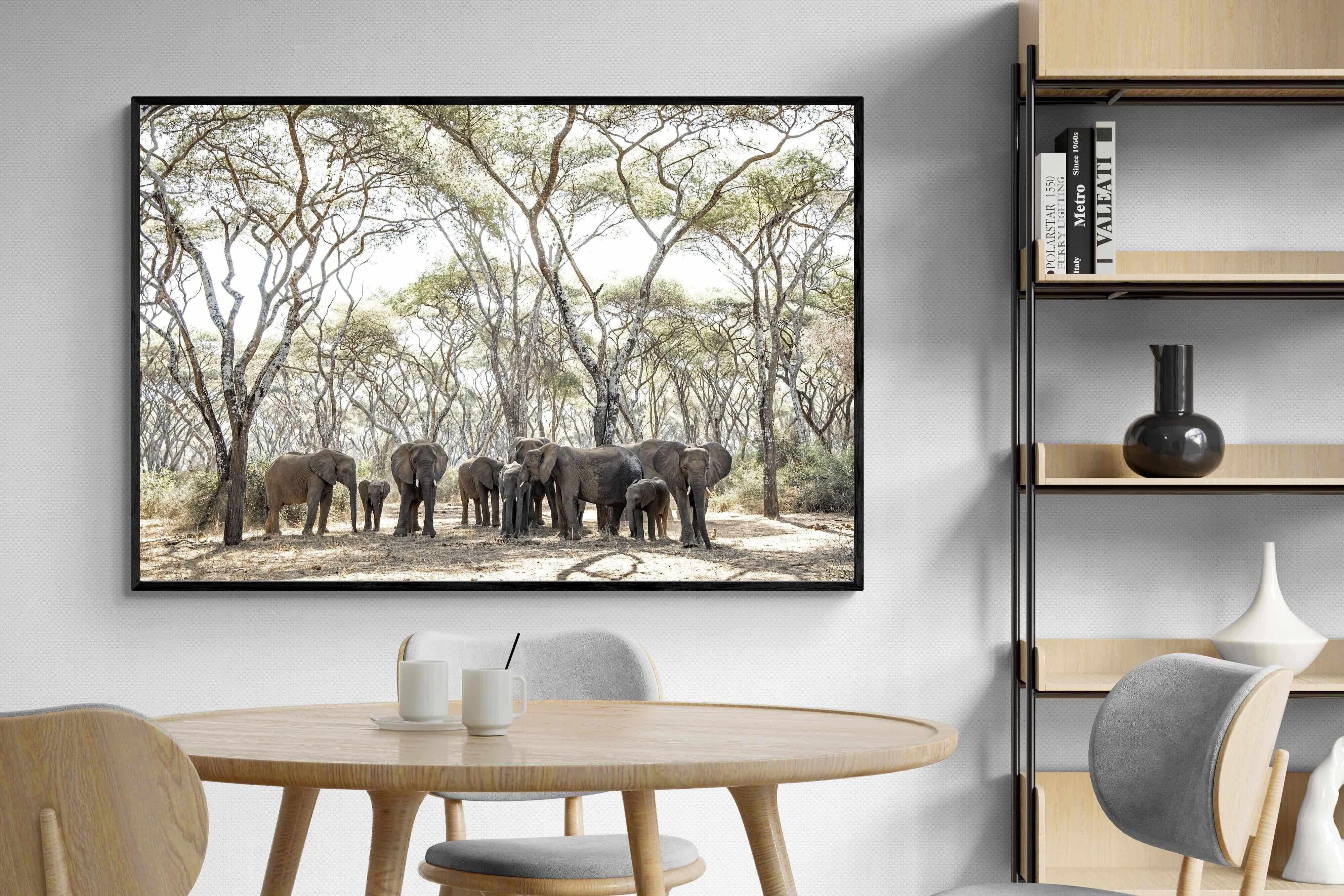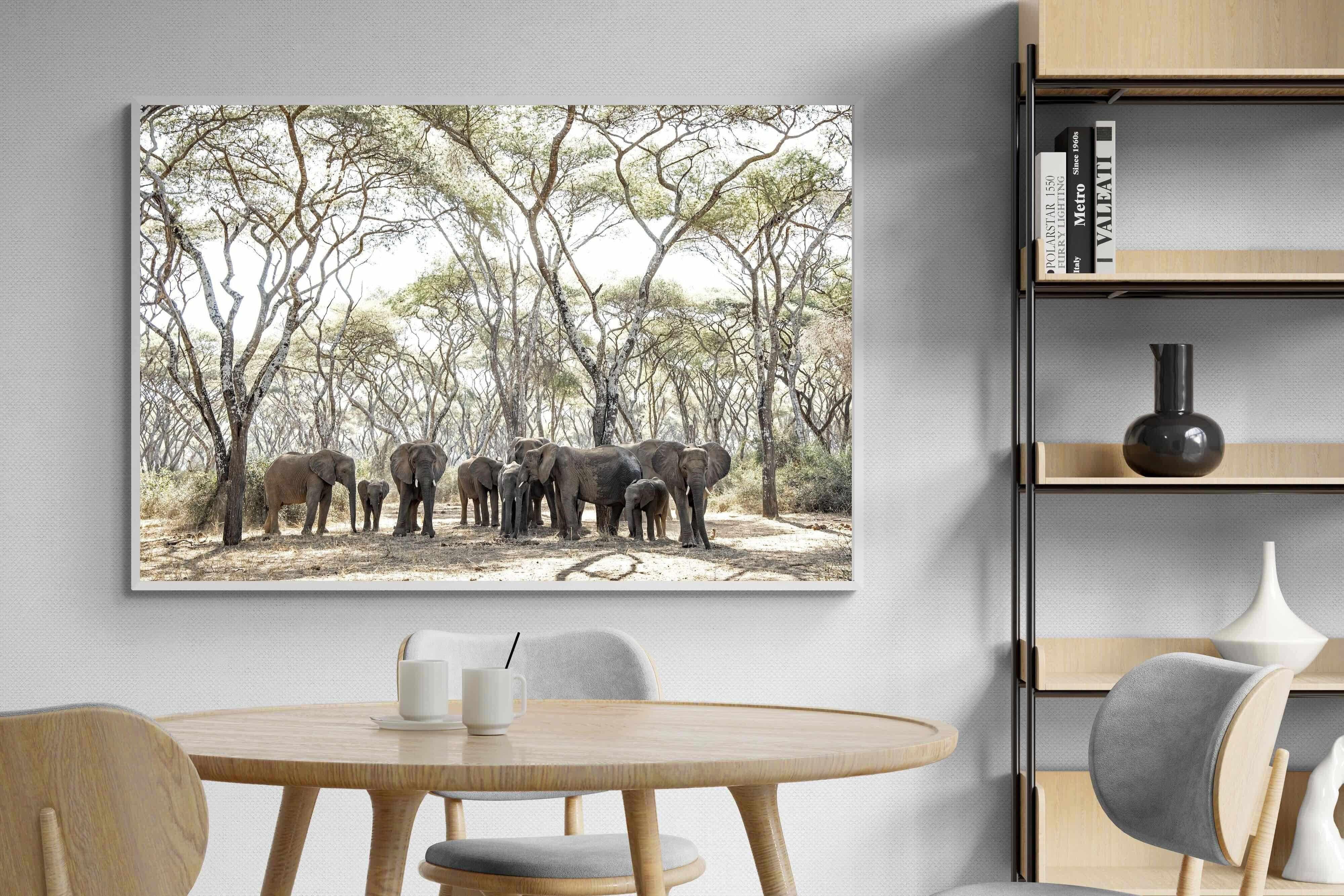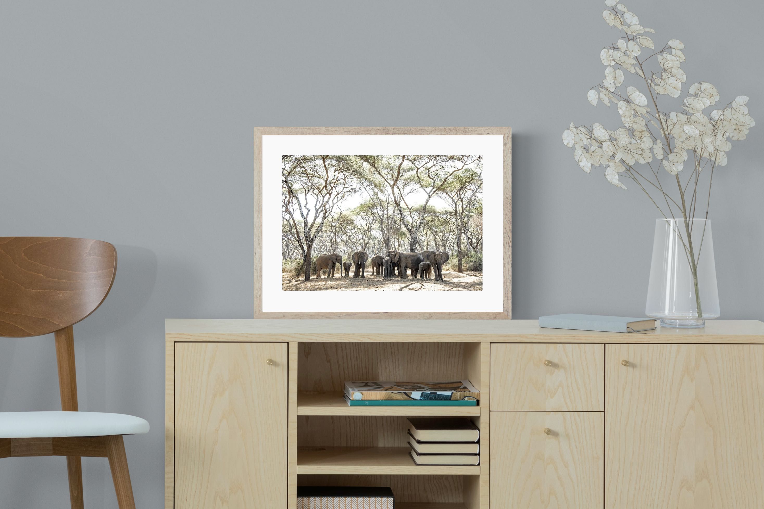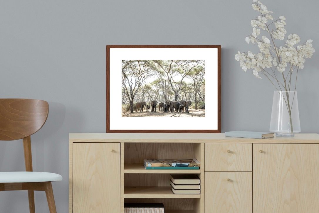 This fine art photograph by Jenny Hishin captures a tranquil herd of elephants beneath a canopy of light-filled umbrella trees. The soft tones of the forest and the majestic presence of the elephants create a peaceful, yet powerful connection with nature. Its calming earthy palette and minimalist composition make it ideal for contemporary home décor. The image invites contemplation and a sense of grounding, harmonising with modern aesthetics while bringing the beauty of wildlife into the space.