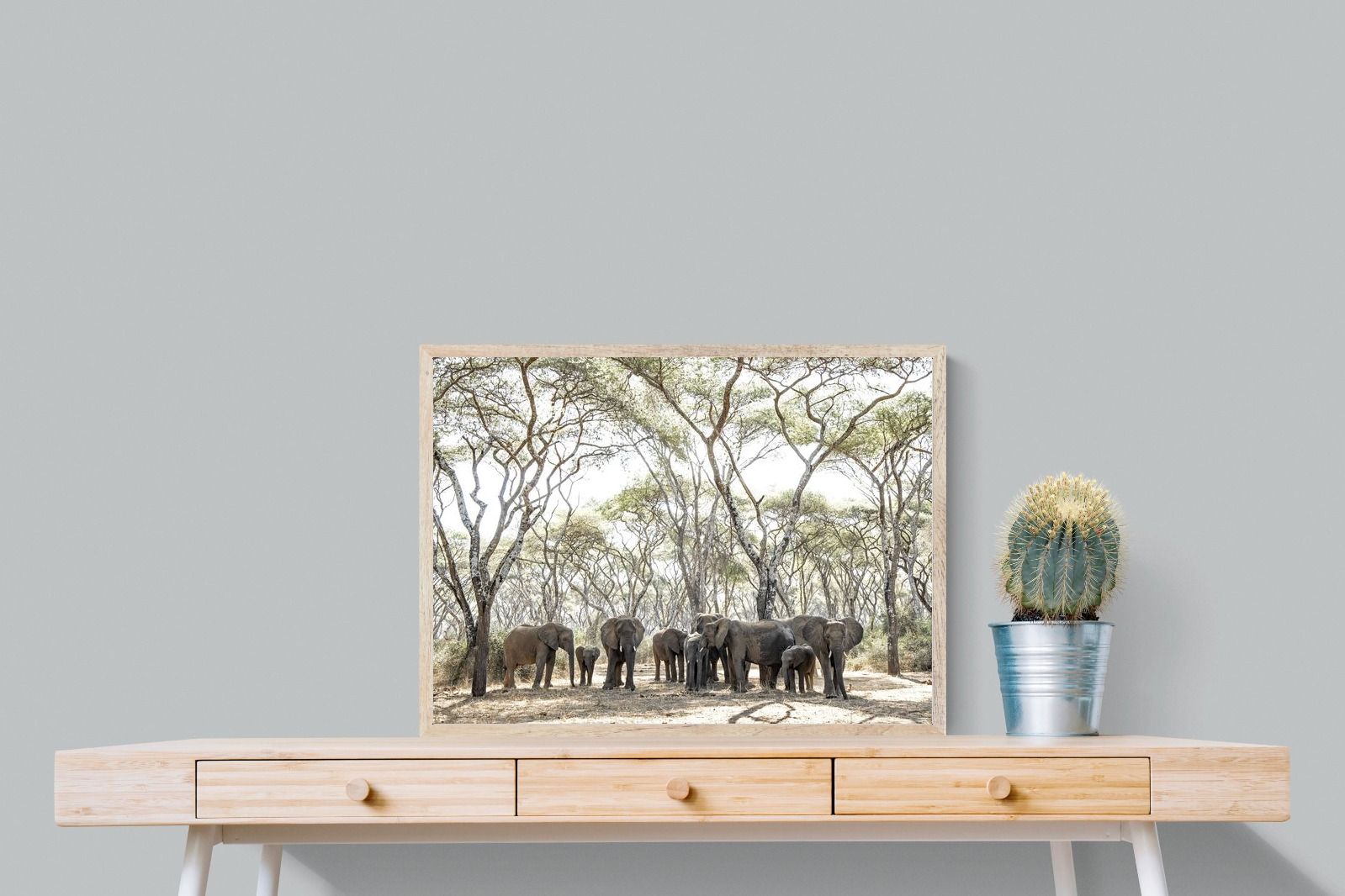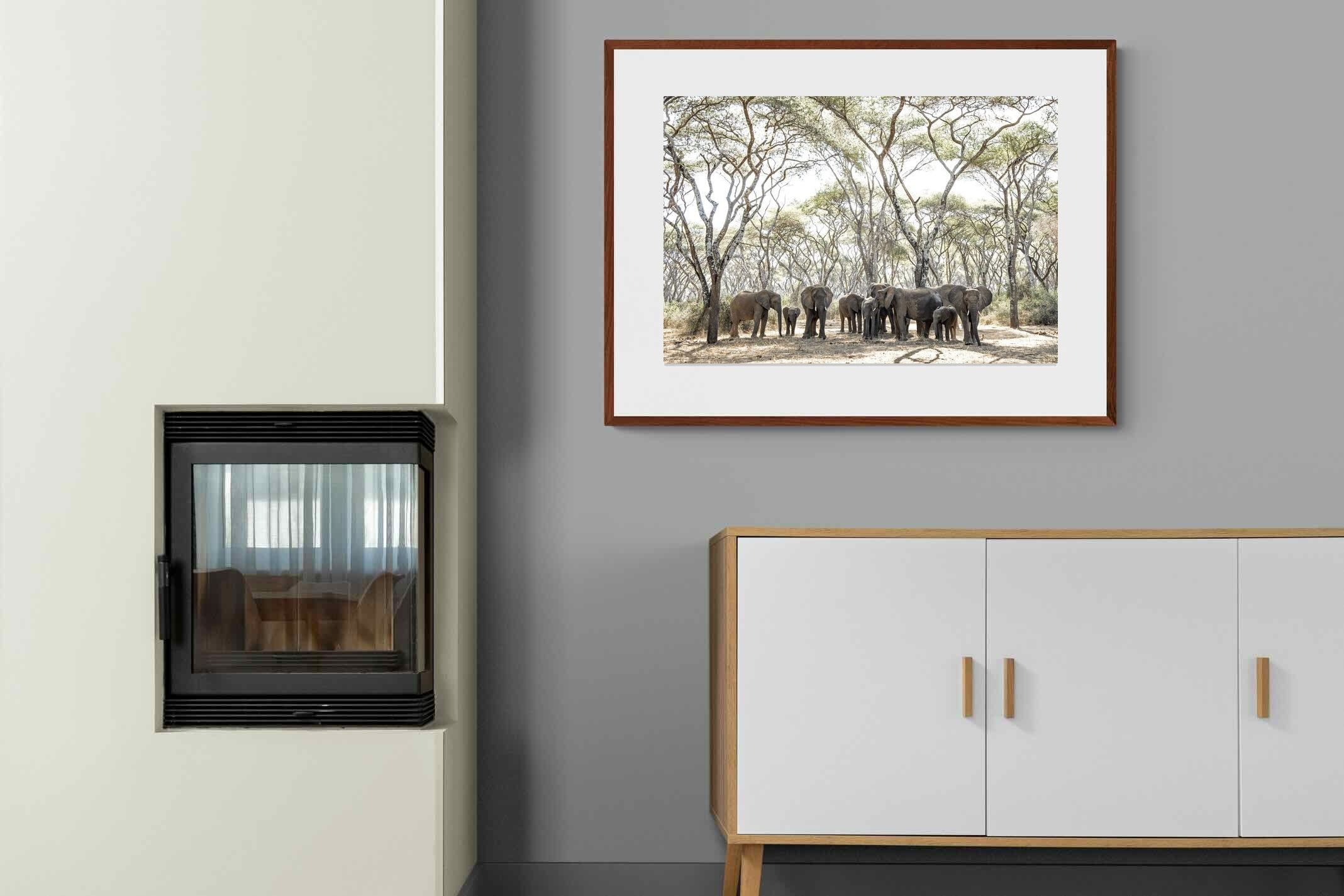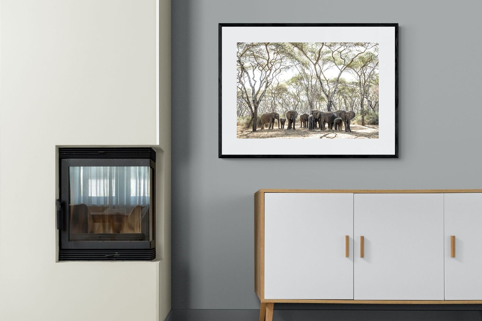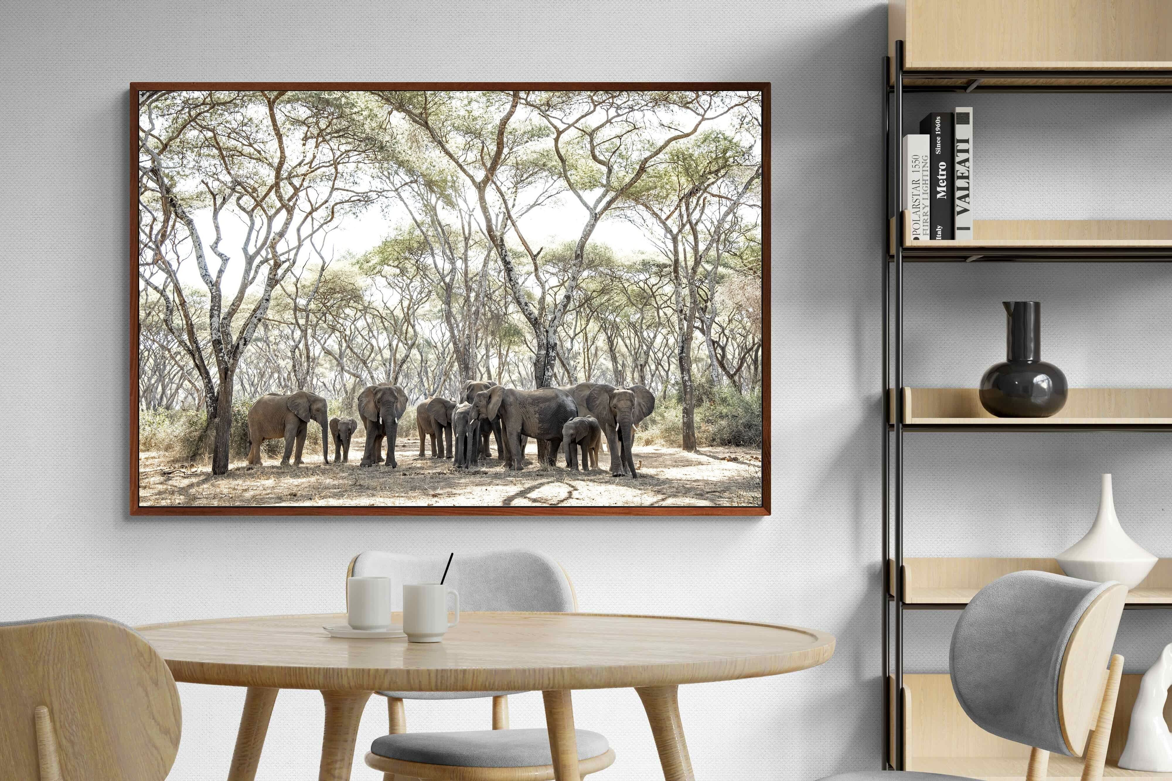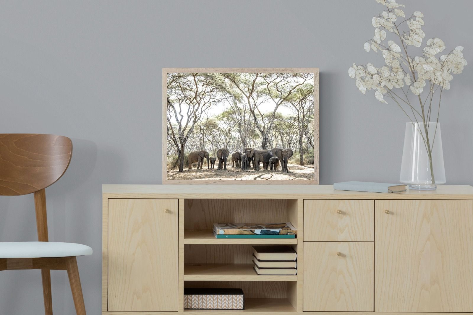 This fine art photograph by Jenny Hishin captures a tranquil herd of elephants beneath a canopy of light-filled umbrella trees. The soft tones of the forest and the majestic presence of the elephants create a peaceful, yet powerful connection with nature. Its calming earthy palette and minimalist composition make it ideal for contemporary home décor. The image invites contemplation and a sense of grounding, harmonising with modern aesthetics while bringing the beauty of wildlife into the space.