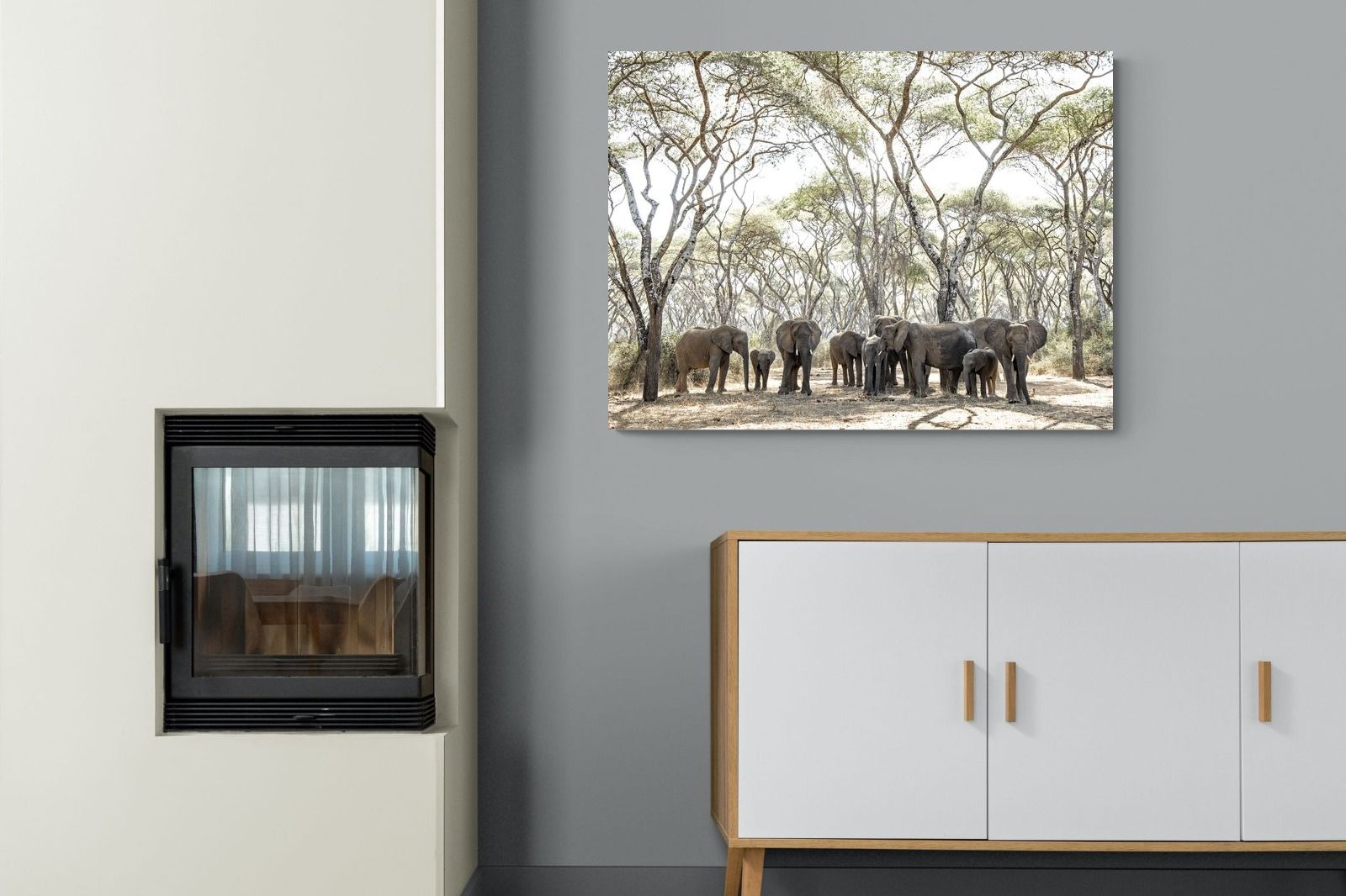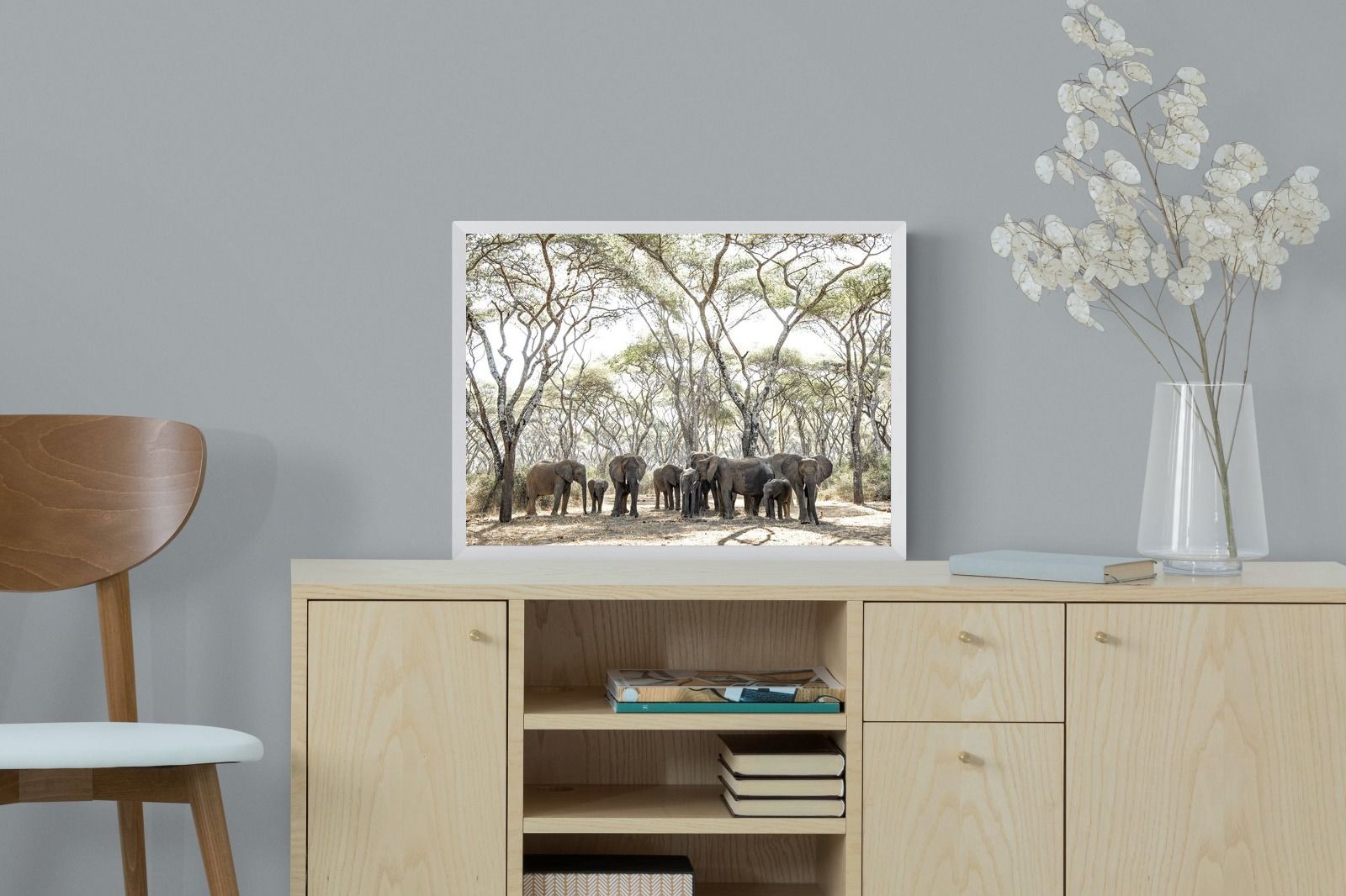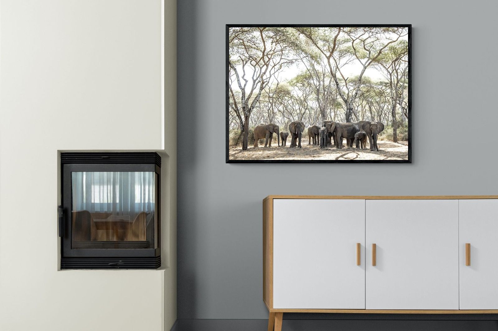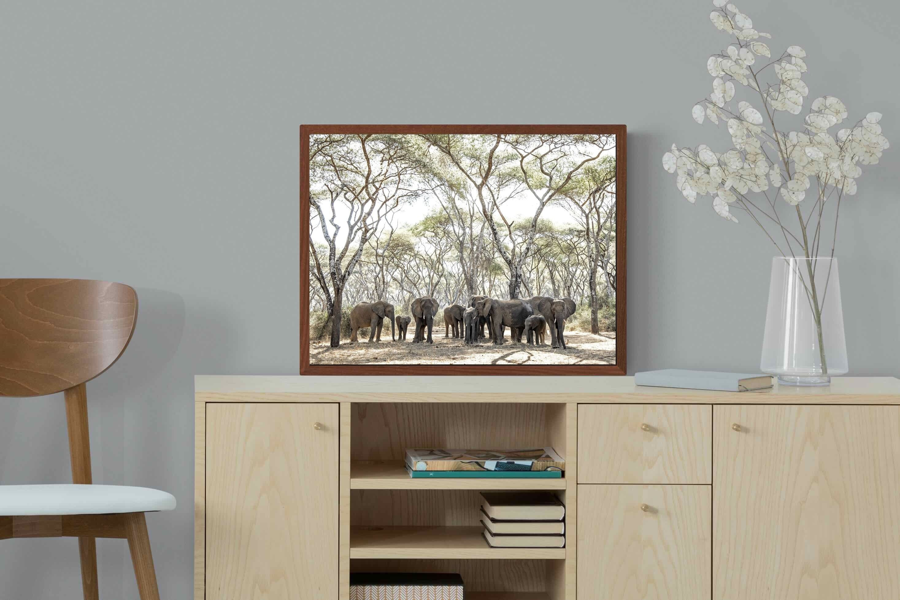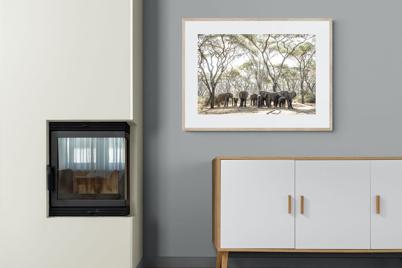 This fine art photograph by Jenny Hishin captures a tranquil herd of elephants beneath a canopy of light-filled umbrella trees. The soft tones of the forest and the majestic presence of the elephants create a peaceful, yet powerful connection with nature. Its calming earthy palette and minimalist composition make it ideal for contemporary home décor. The image invites contemplation and a sense of grounding, harmonising with modern aesthetics while bringing the beauty of wildlife into the space.
