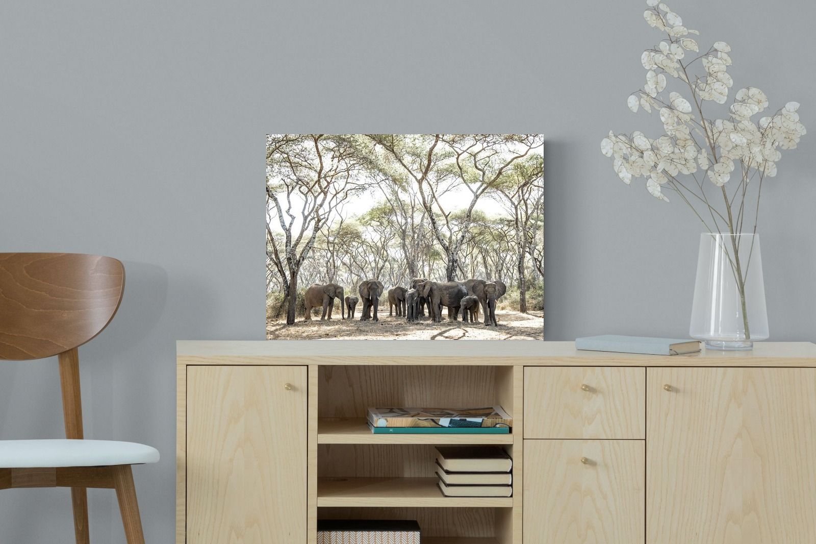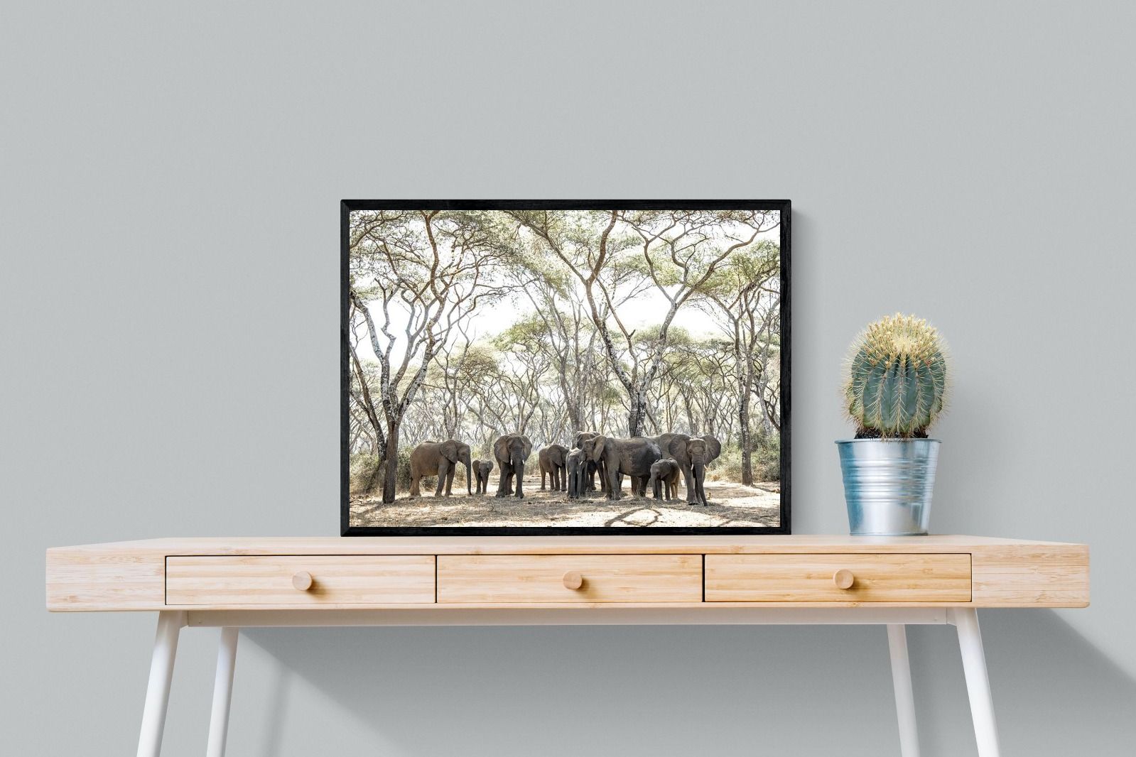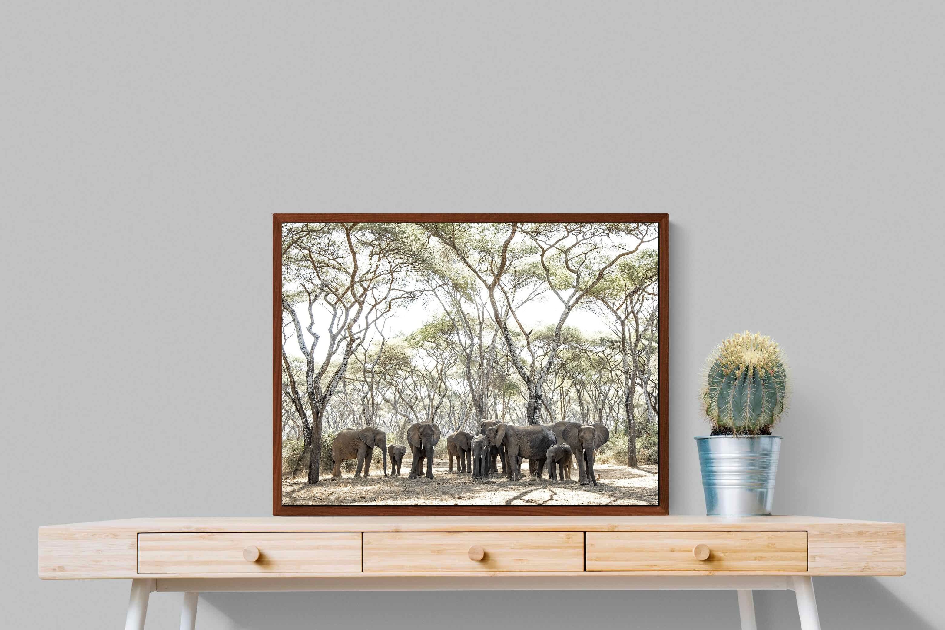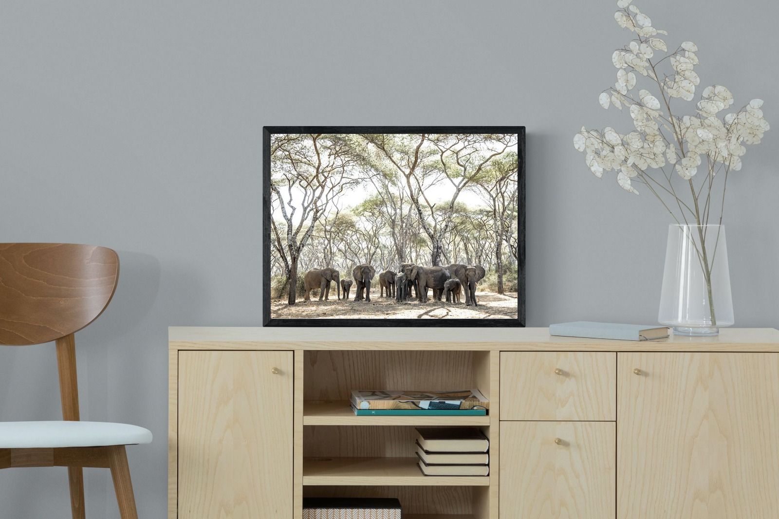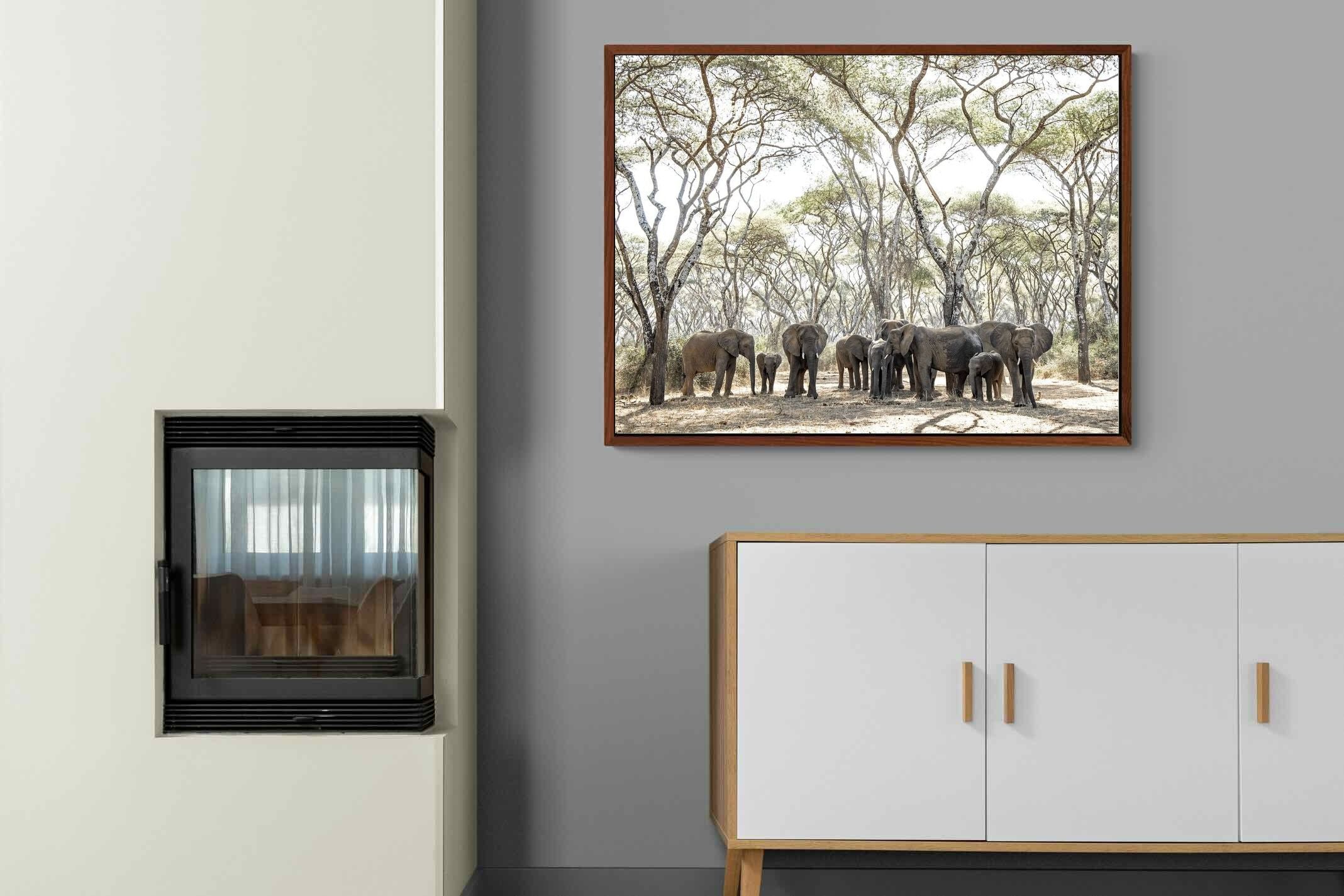 This fine art photograph by Jenny Hishin captures a tranquil herd of elephants beneath a canopy of light-filled umbrella trees. The soft tones of the forest and the majestic presence of the elephants create a peaceful, yet powerful connection with nature. Its calming earthy palette and minimalist composition make it ideal for contemporary home décor. The image invites contemplation and a sense of grounding, harmonising with modern aesthetics while bringing the beauty of wildlife into the space.