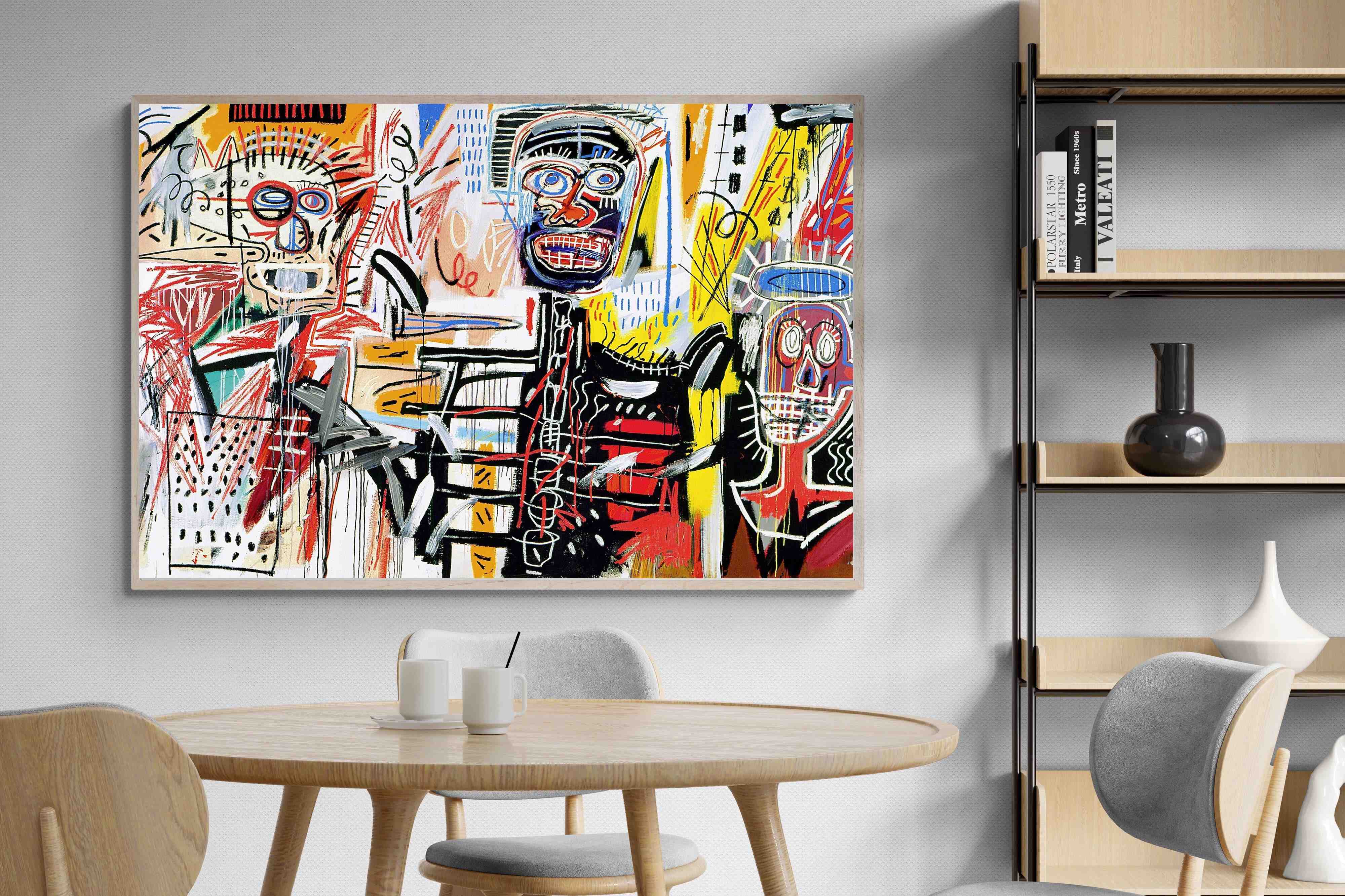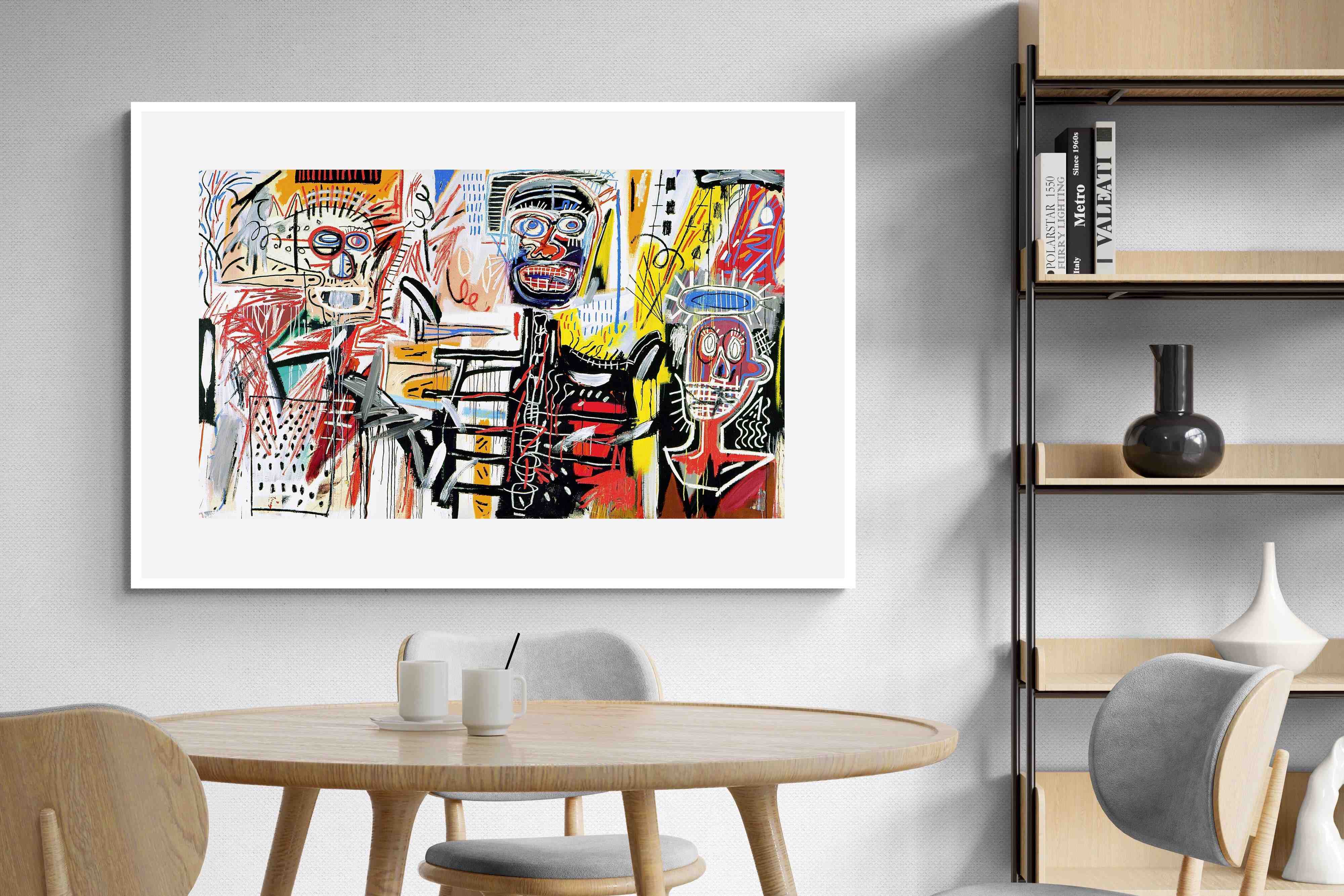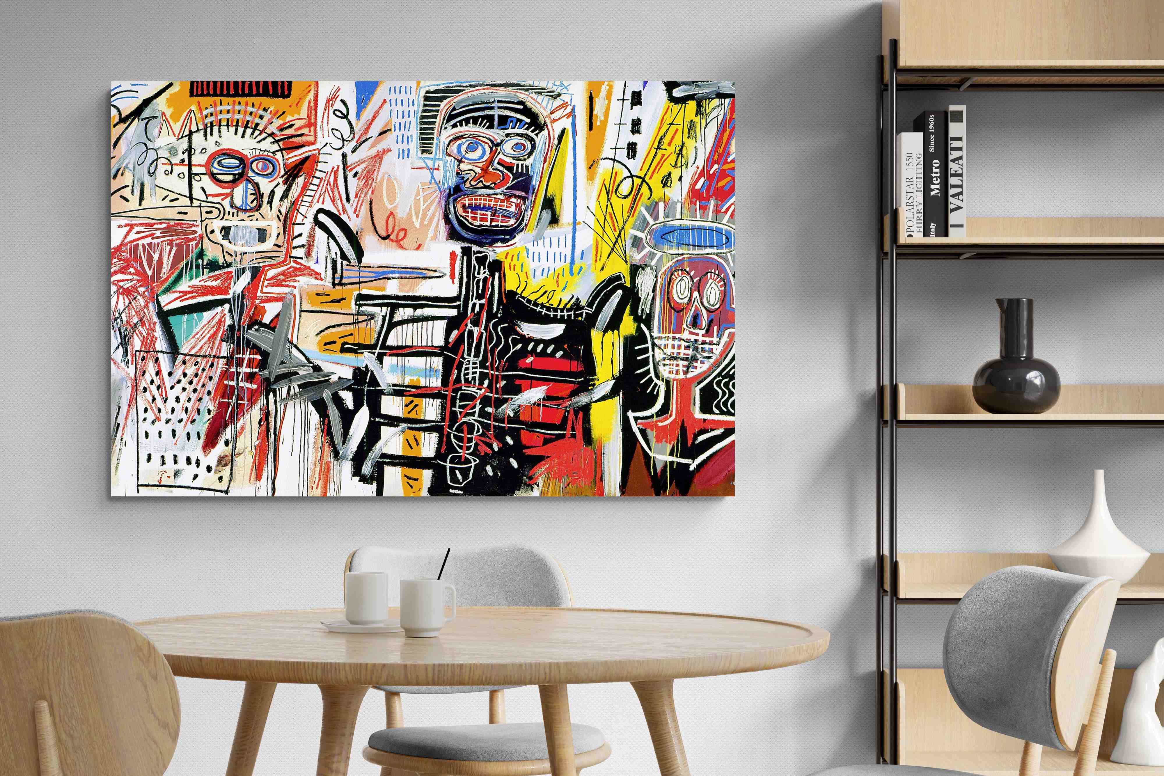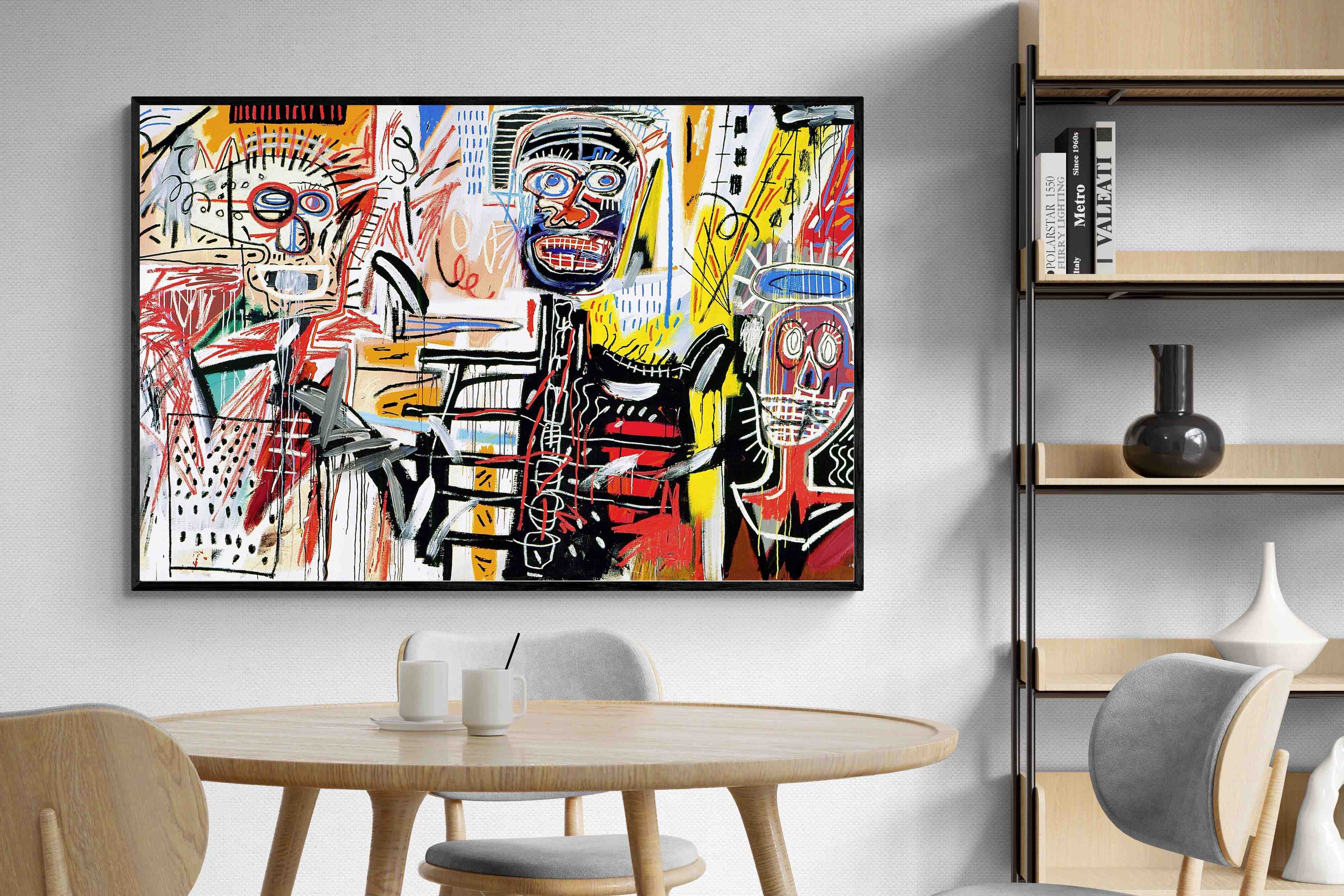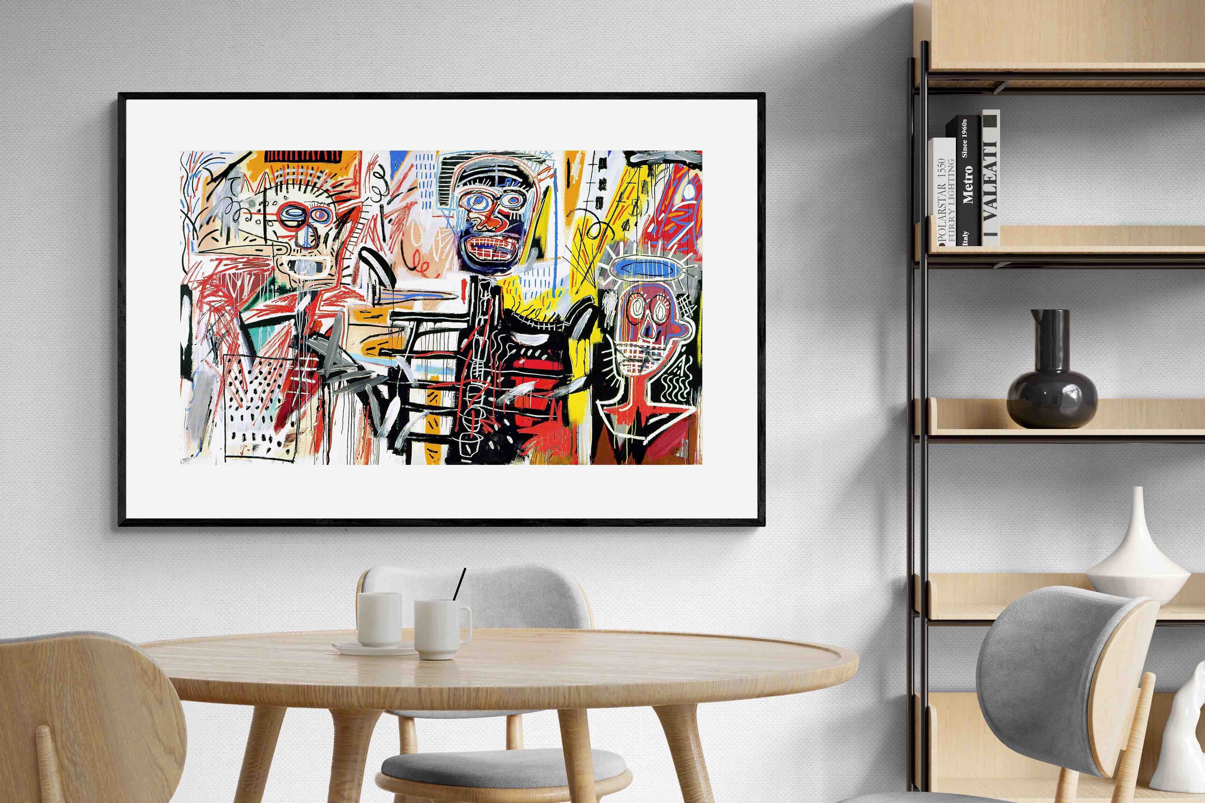 Introducing "Philistines," a masterful print that captures the soul of Jean-Michel Basquiat's iconic original artwork. This captivating piece serves as a testament to Basquiat's unique ability to meld vibrant imagery with incisive social critique.