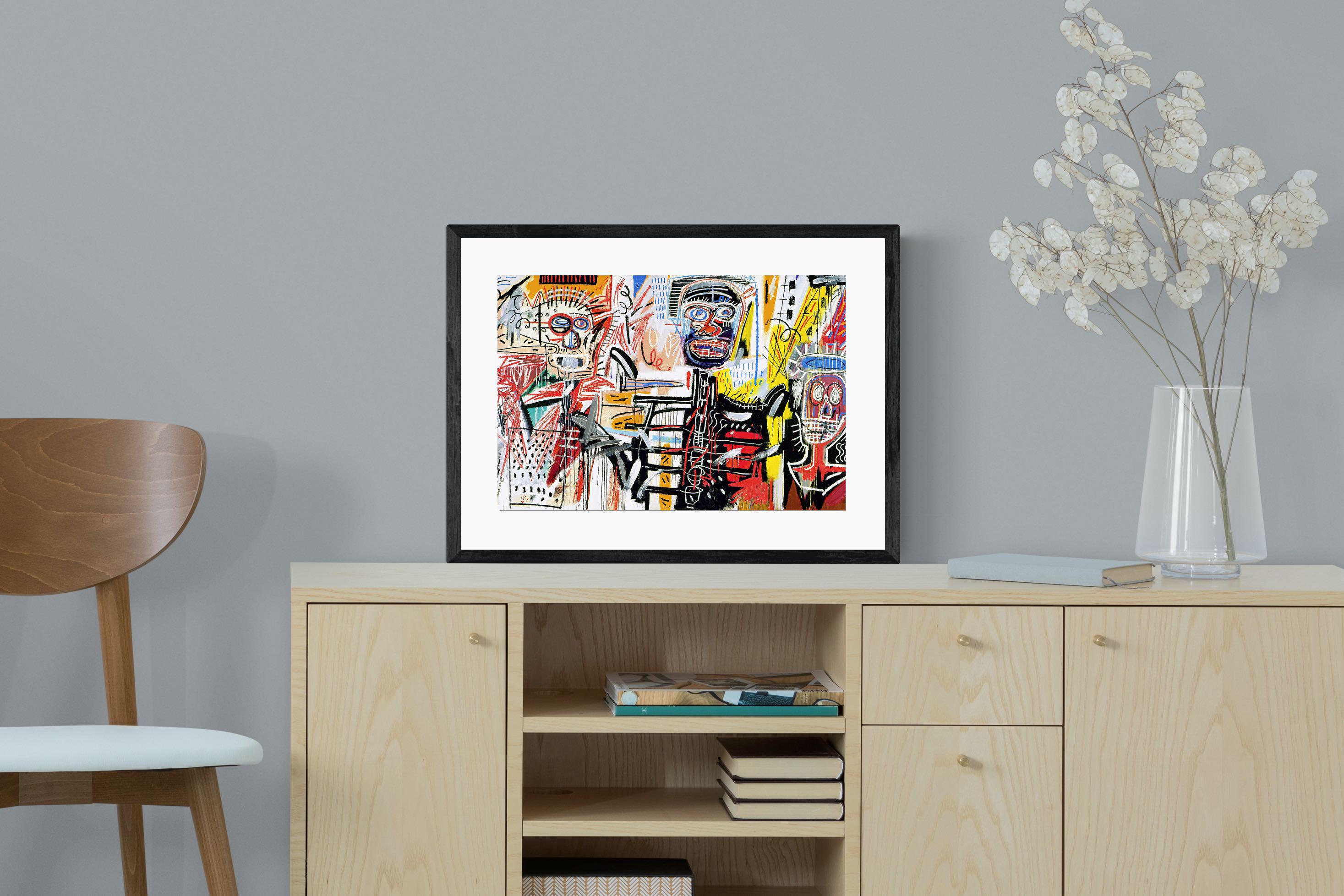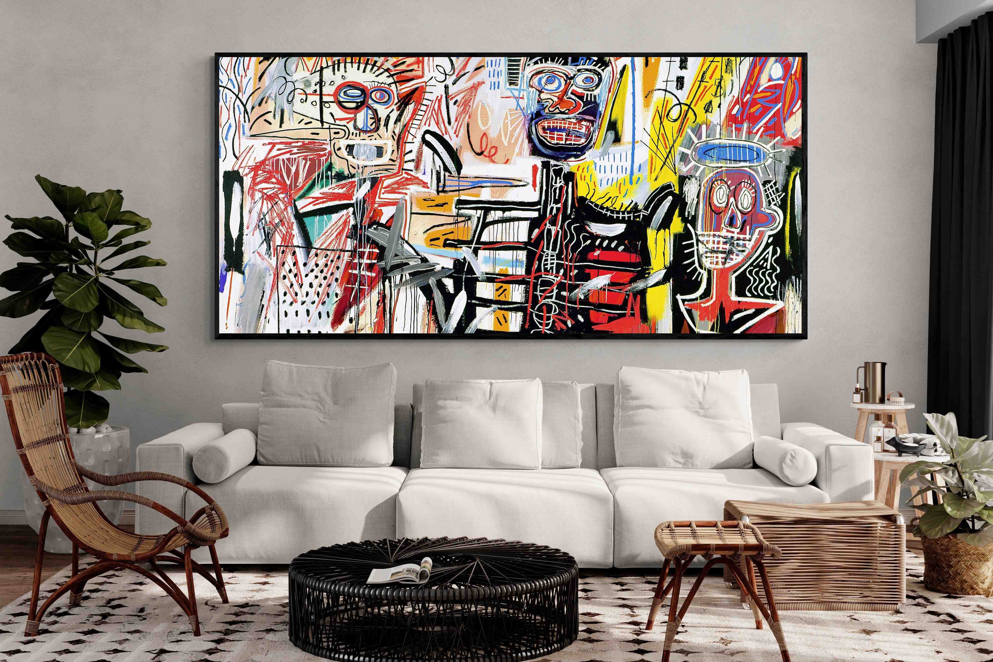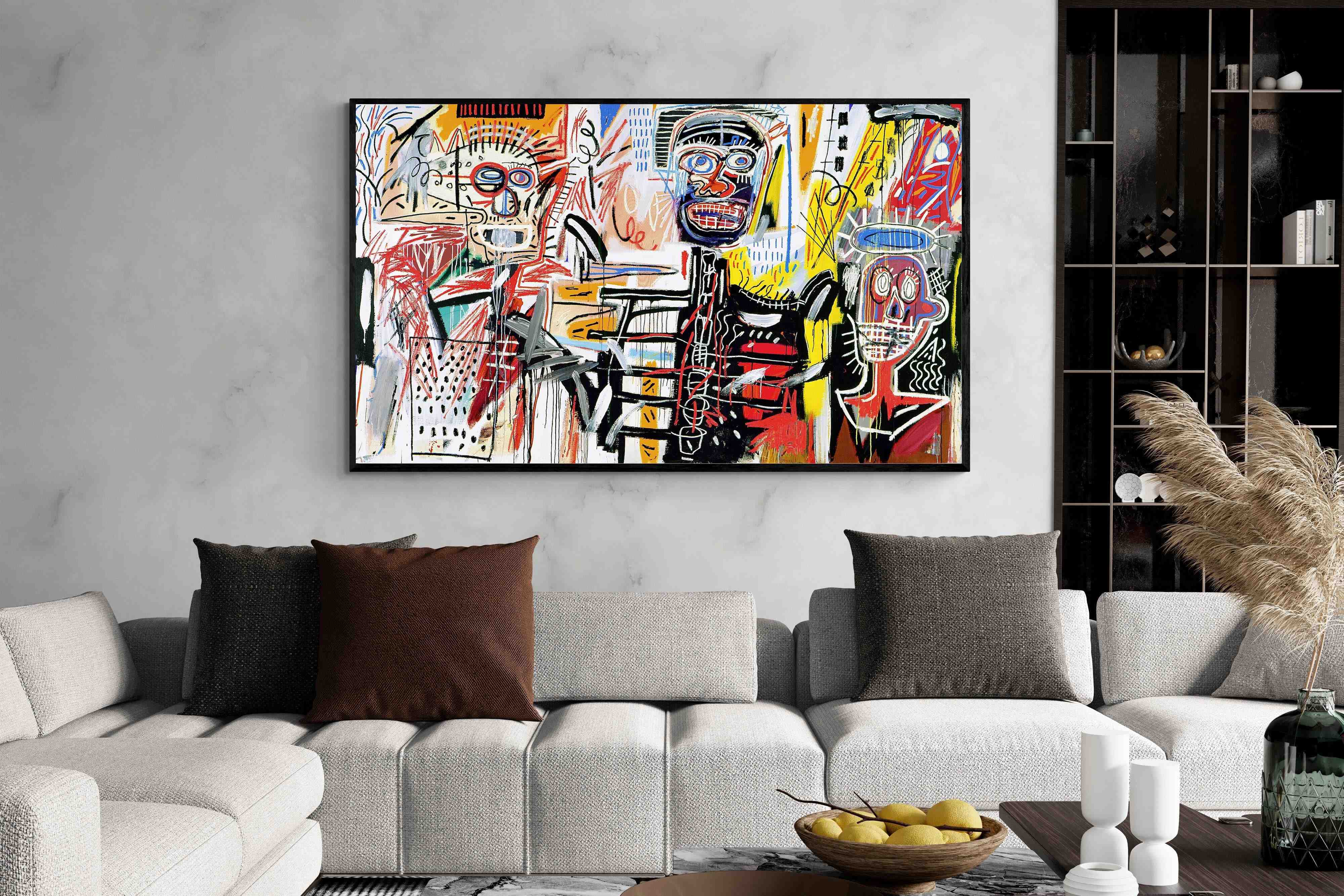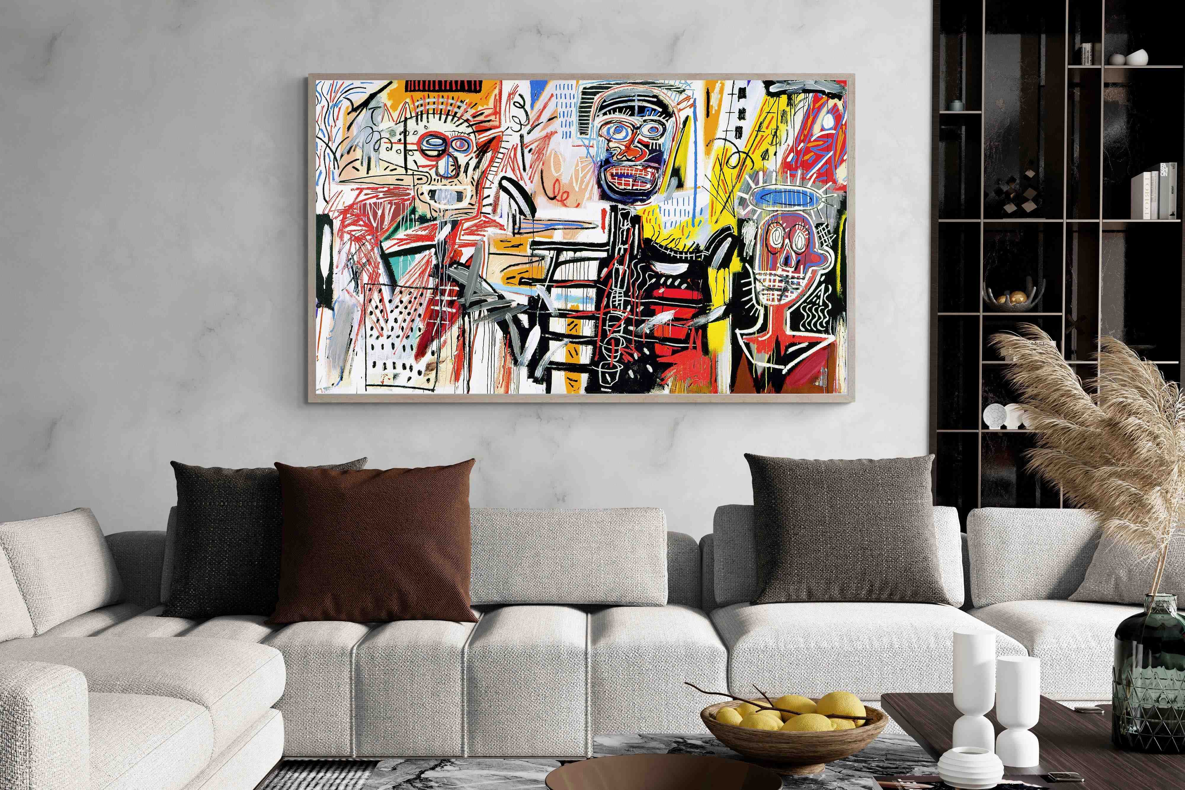 Introducing "Philistines," a masterful print that captures the soul of Jean-Michel Basquiat's iconic original artwork. This captivating piece serves as a testament to Basquiat's unique ability to meld vibrant imagery with incisive social critique.