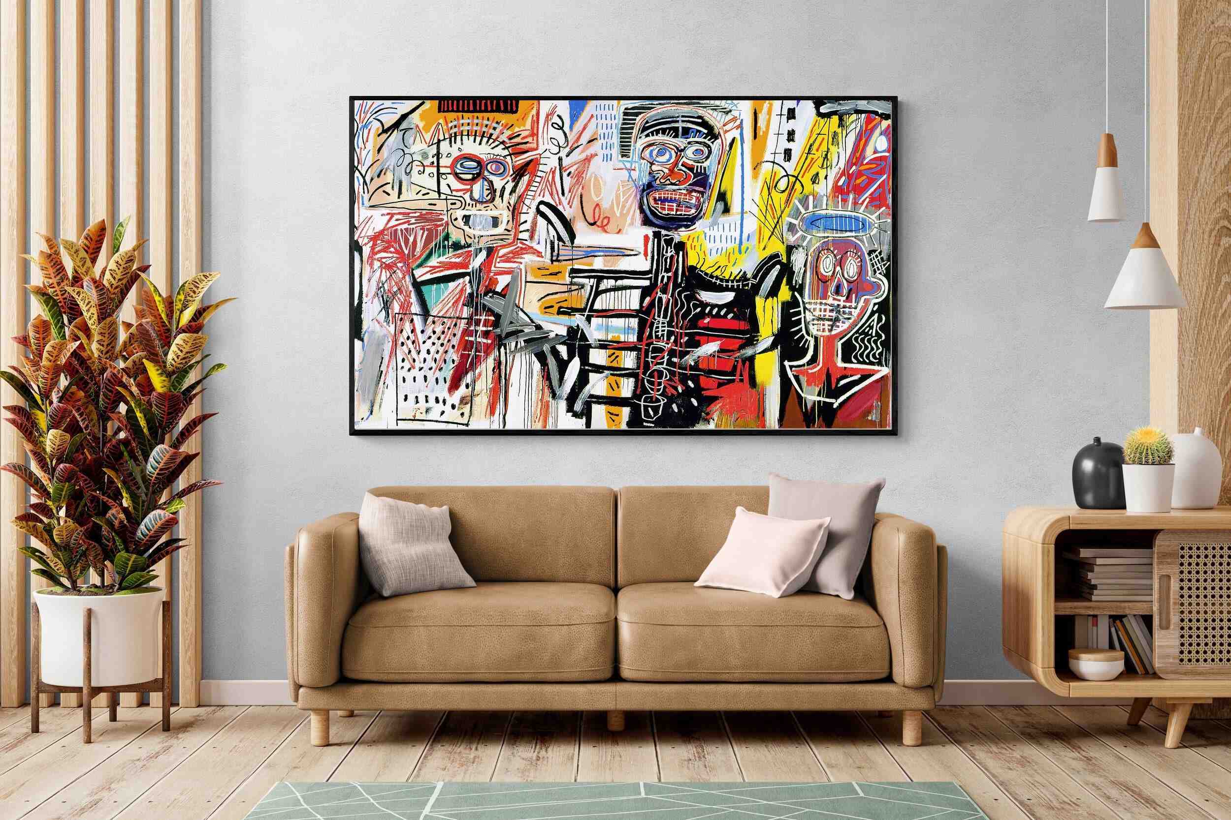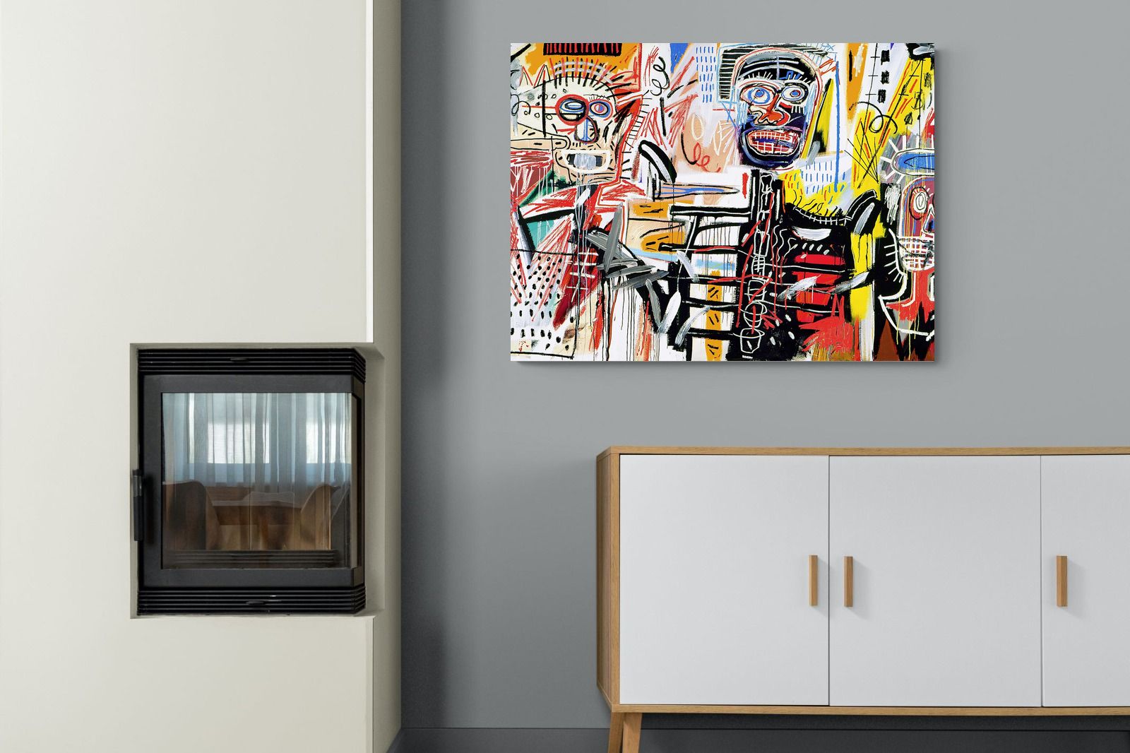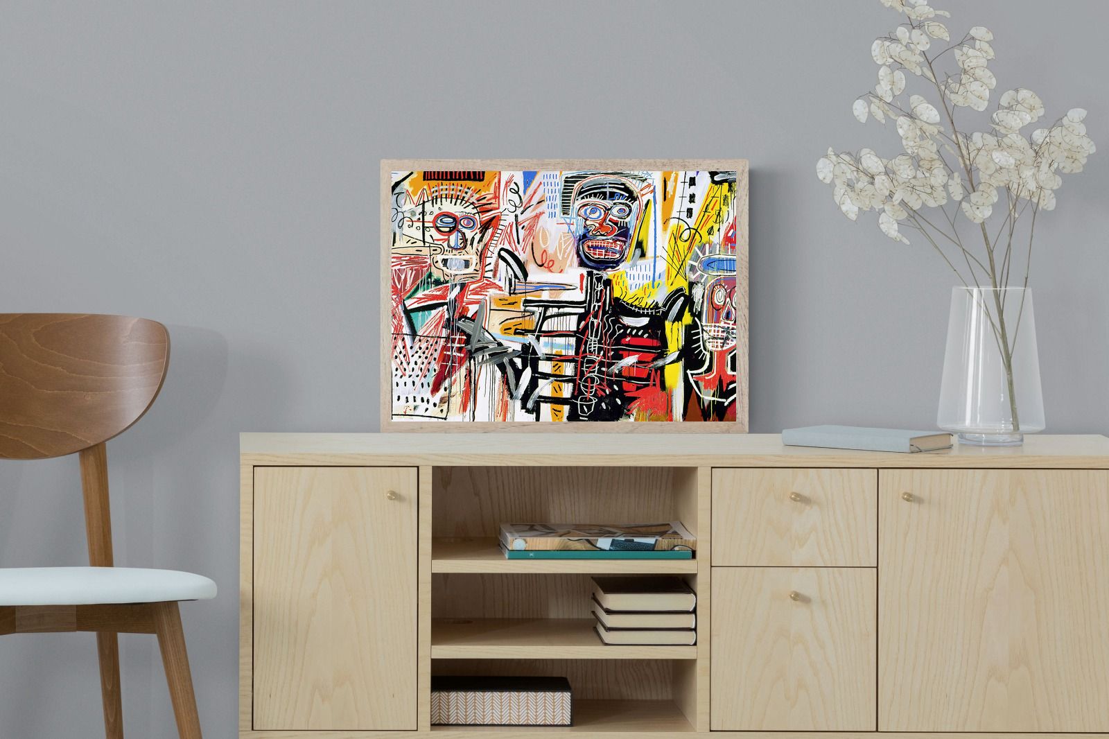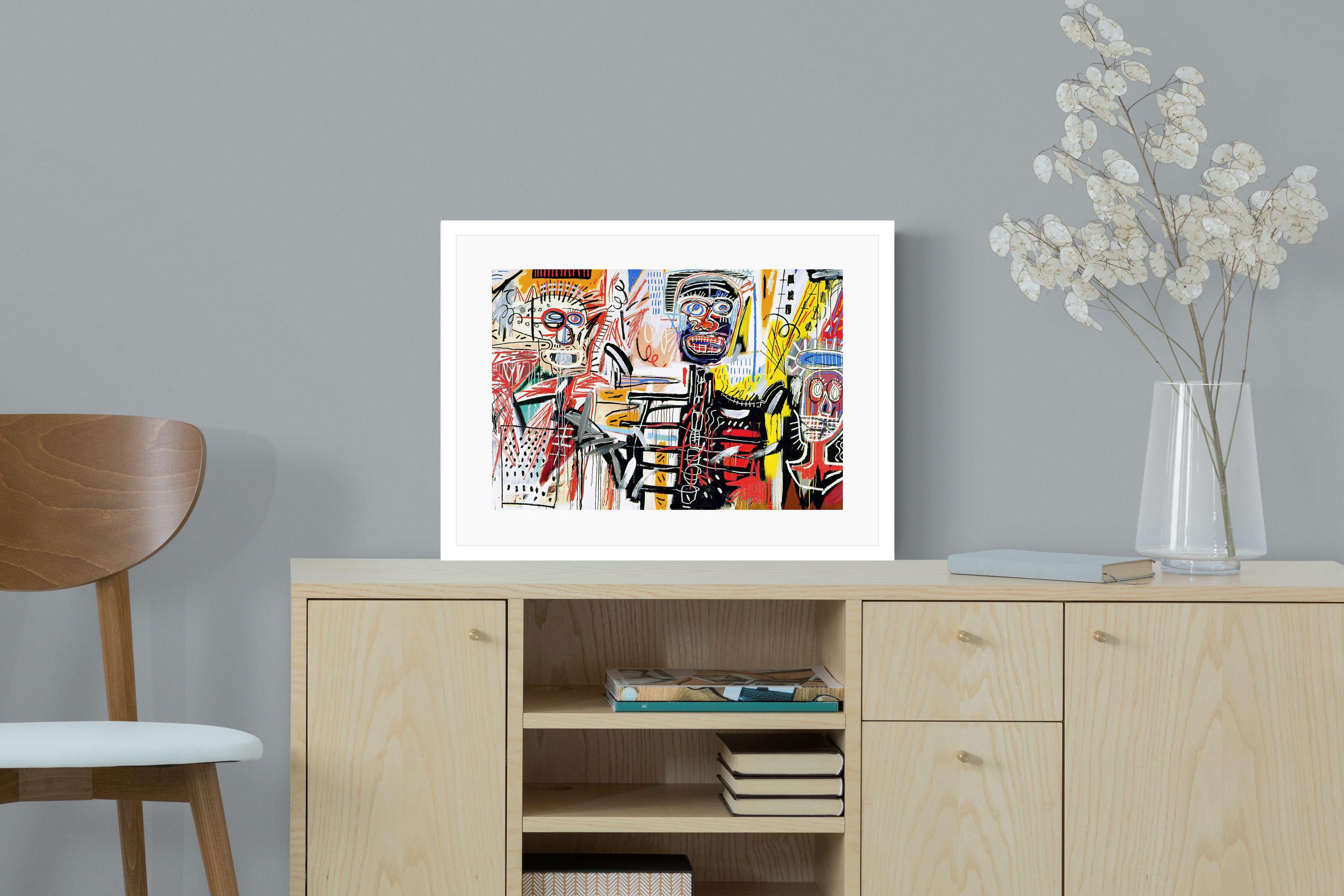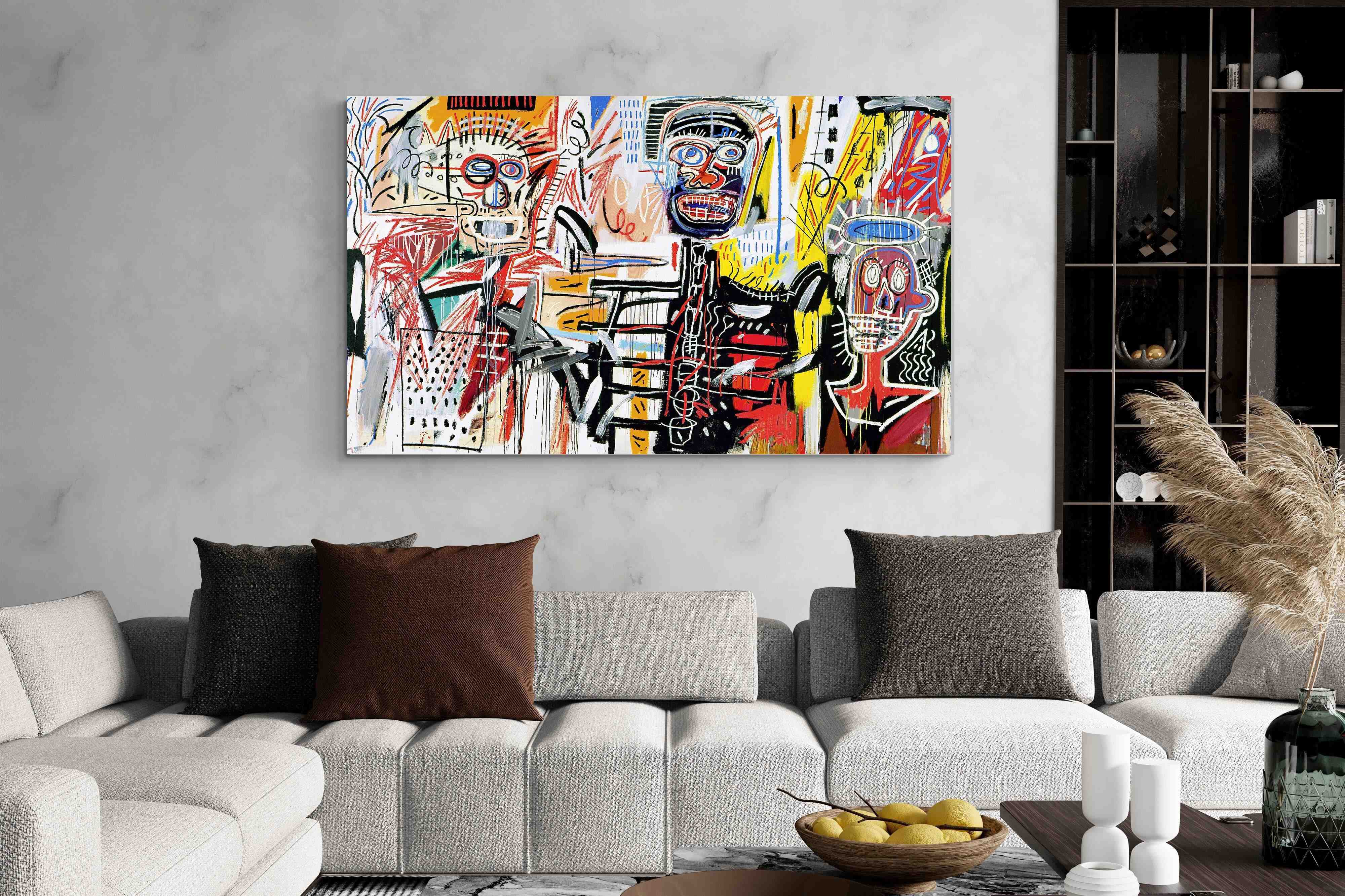 Introducing "Philistines," a masterful print that captures the soul of Jean-Michel Basquiat's iconic original artwork. This captivating piece serves as a testament to Basquiat's unique ability to meld vibrant imagery with incisive social critique.