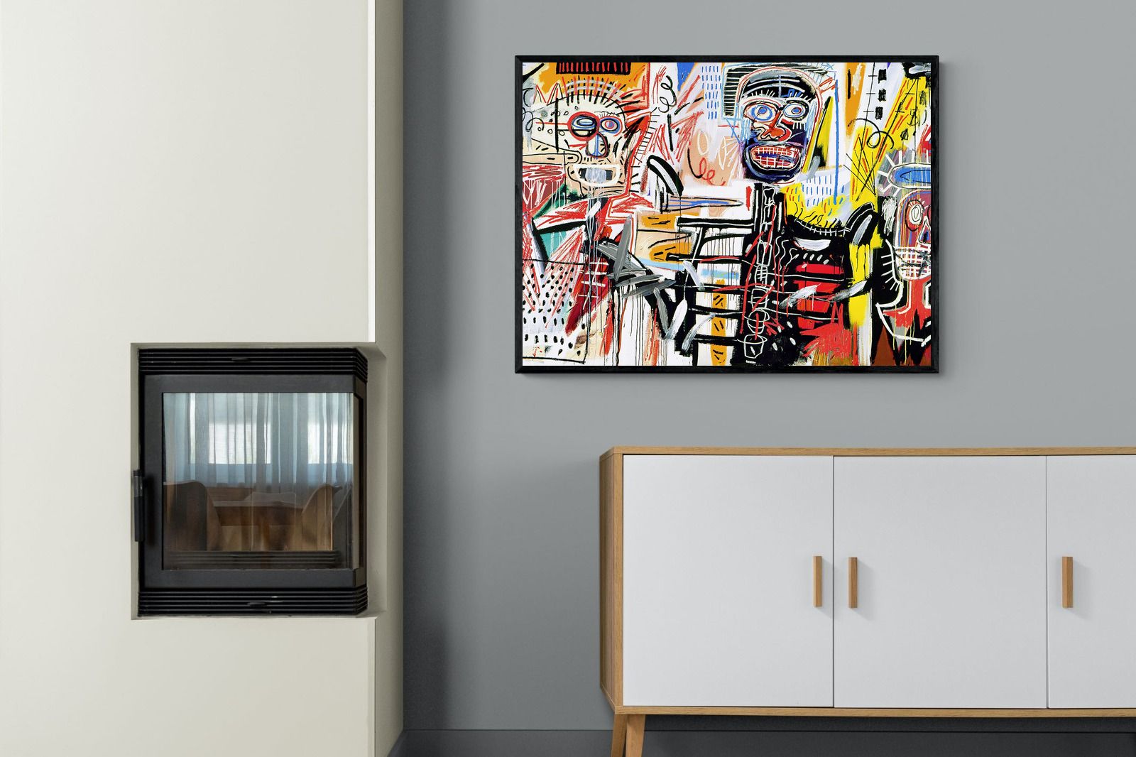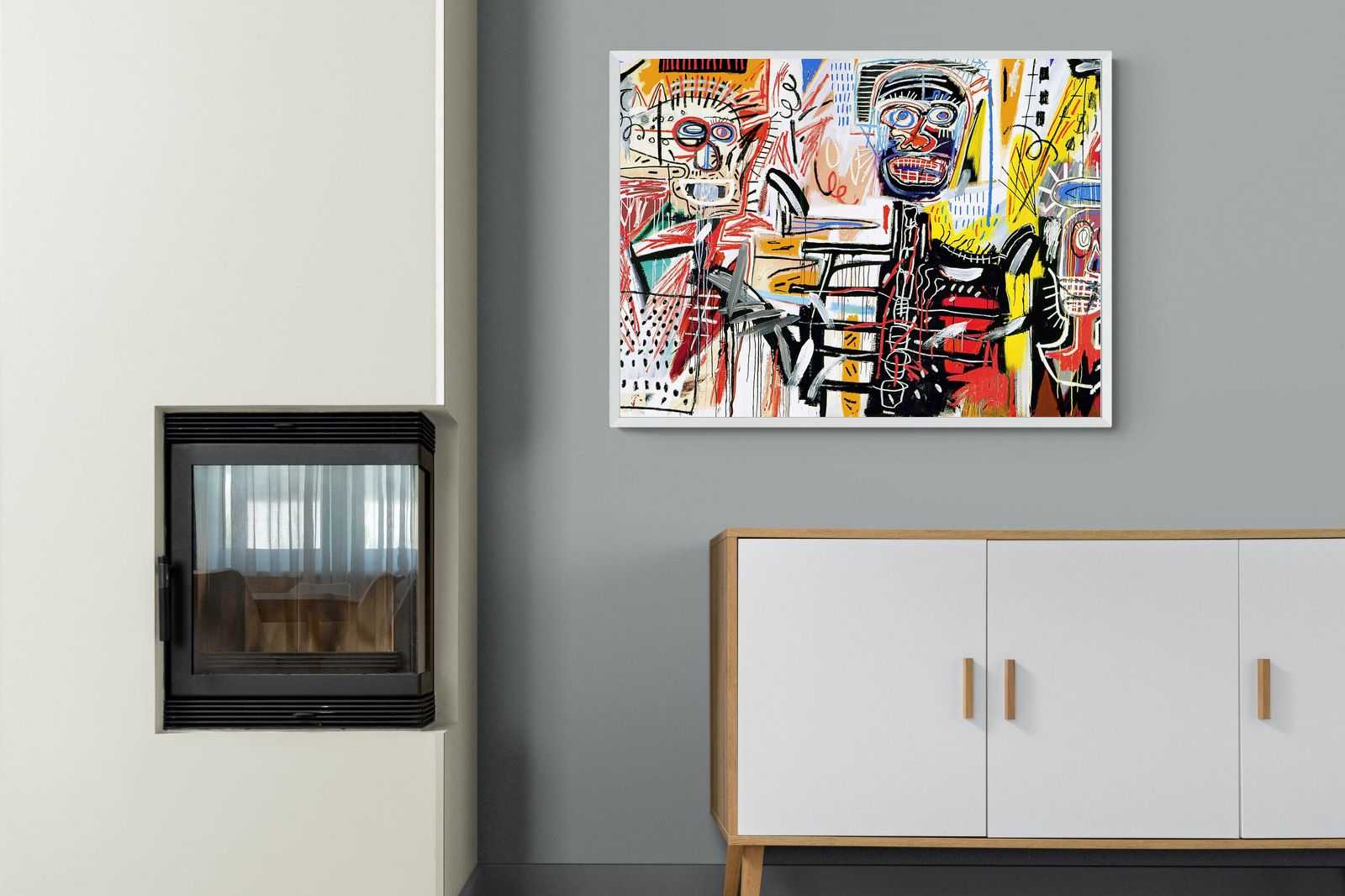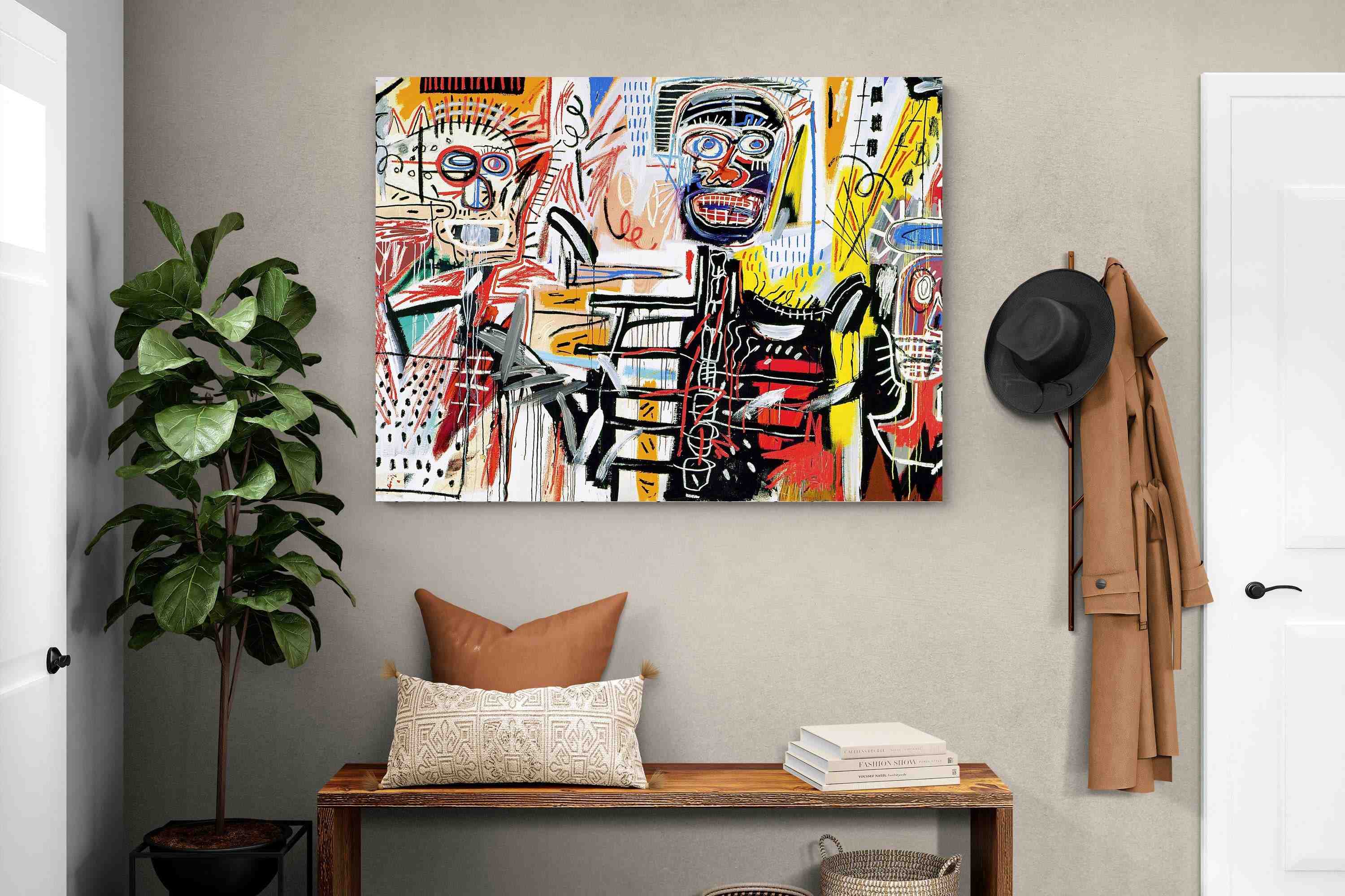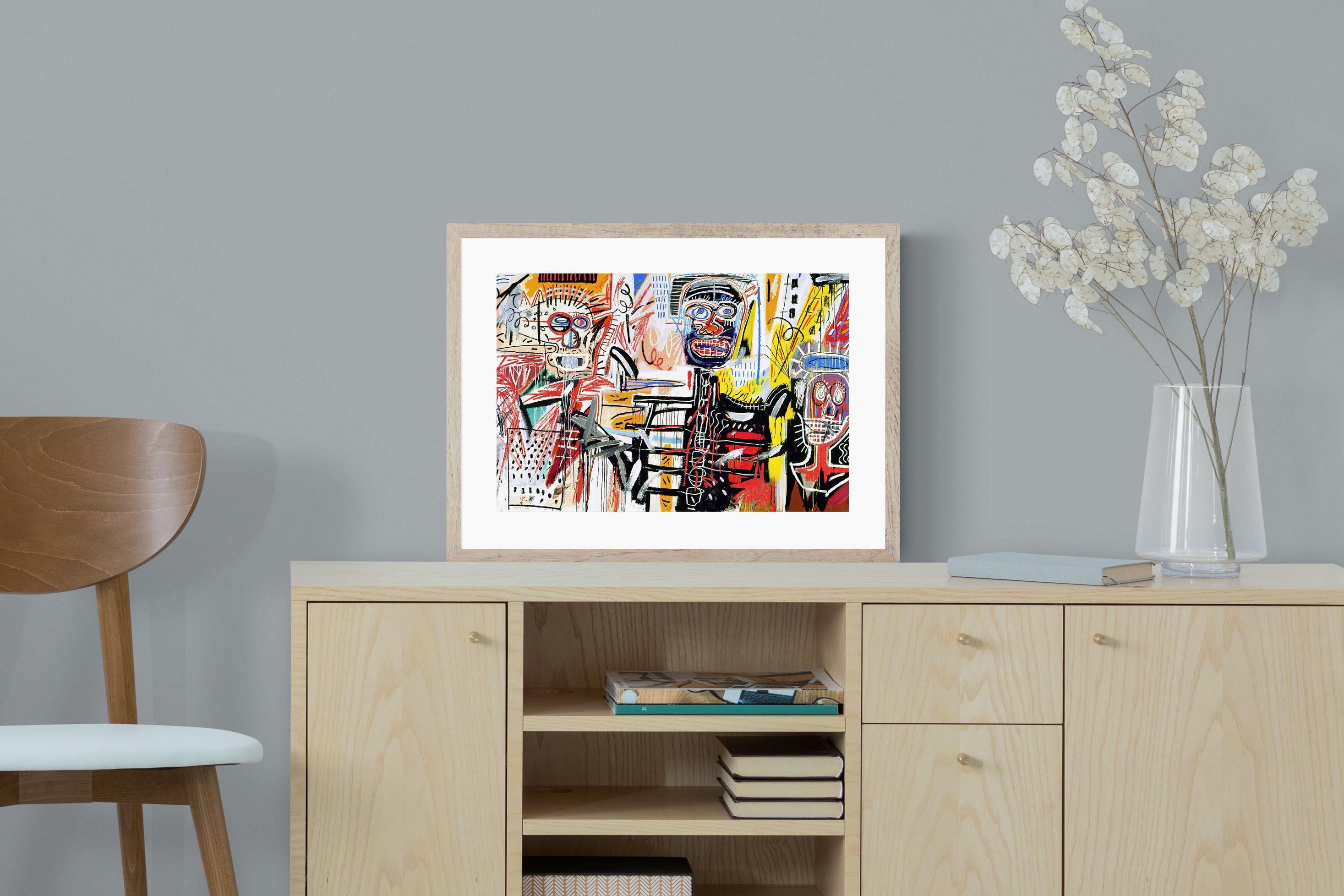 Introducing "Philistines," a masterful print that captures the soul of Jean-Michel Basquiat's iconic original artwork. This captivating piece serves as a testament to Basquiat's unique ability to meld vibrant imagery with incisive social critique.