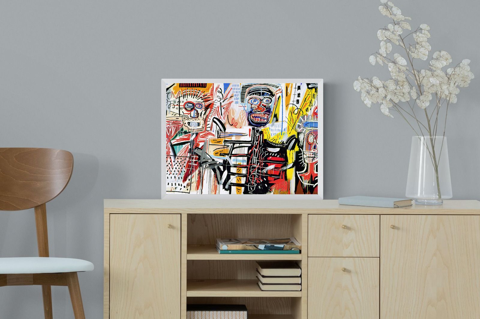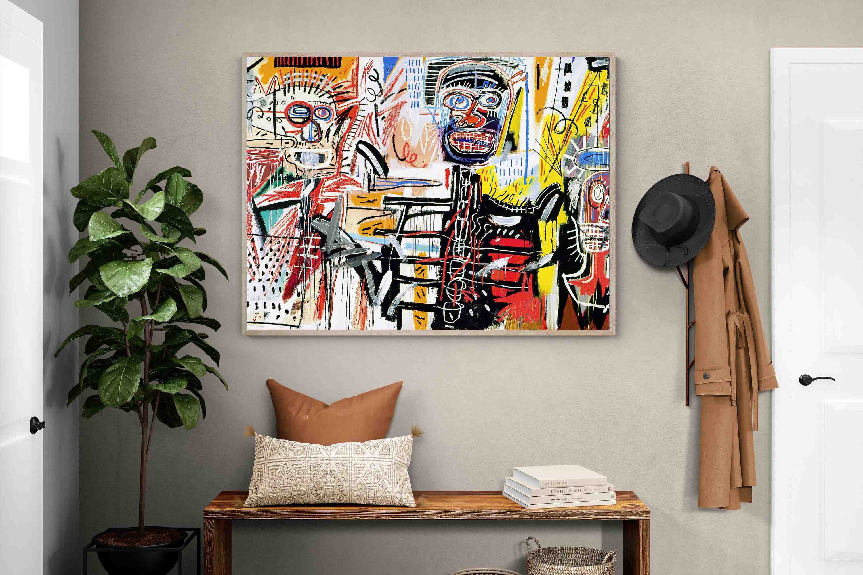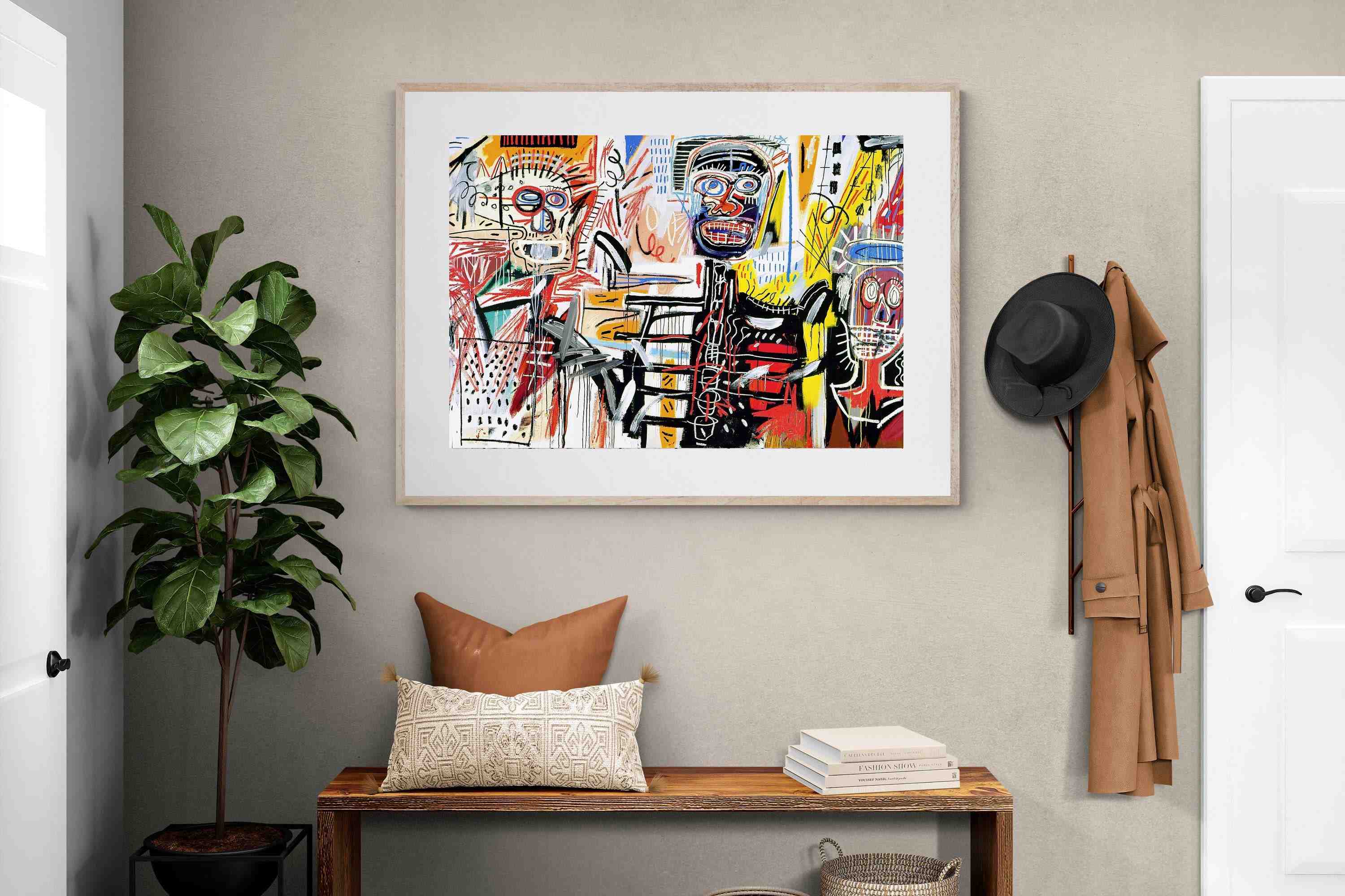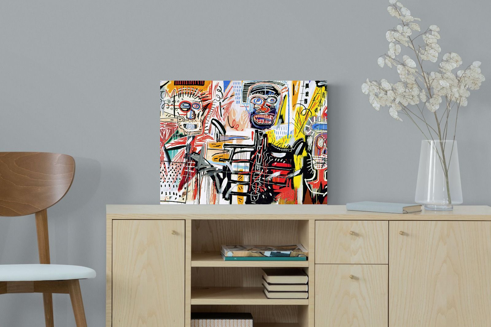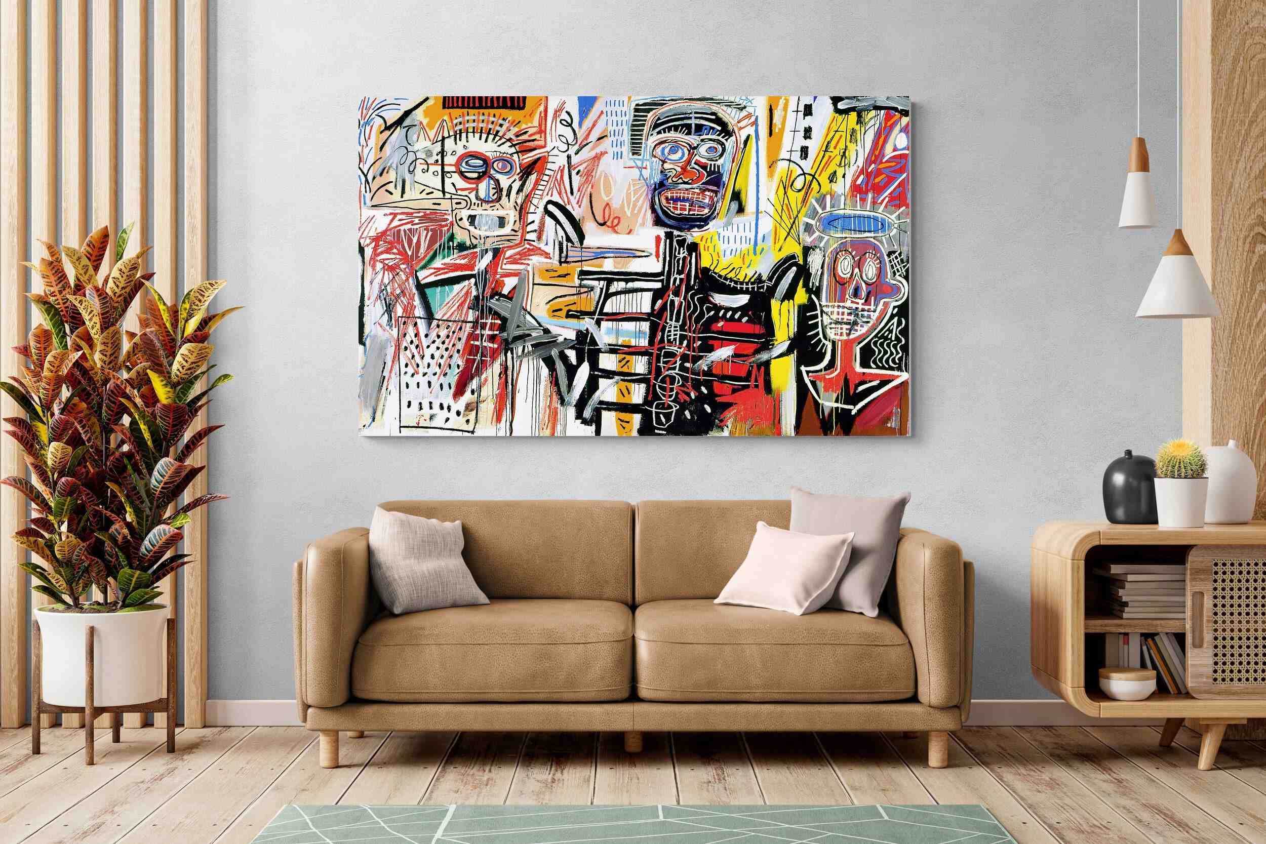 Introducing "Philistines," a masterful print that captures the soul of Jean-Michel Basquiat's iconic original artwork. This captivating piece serves as a testament to Basquiat's unique ability to meld vibrant imagery with incisive social critique.