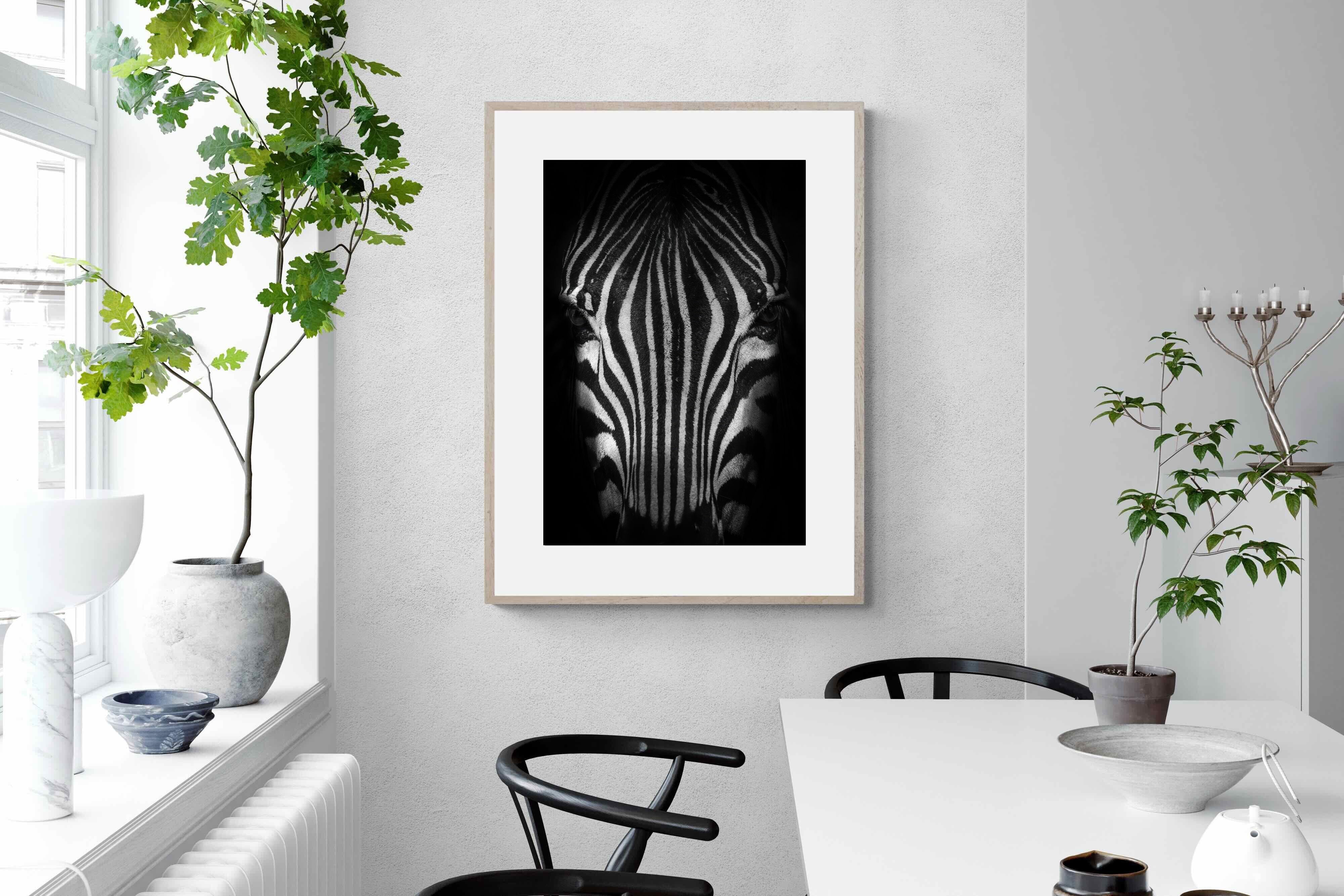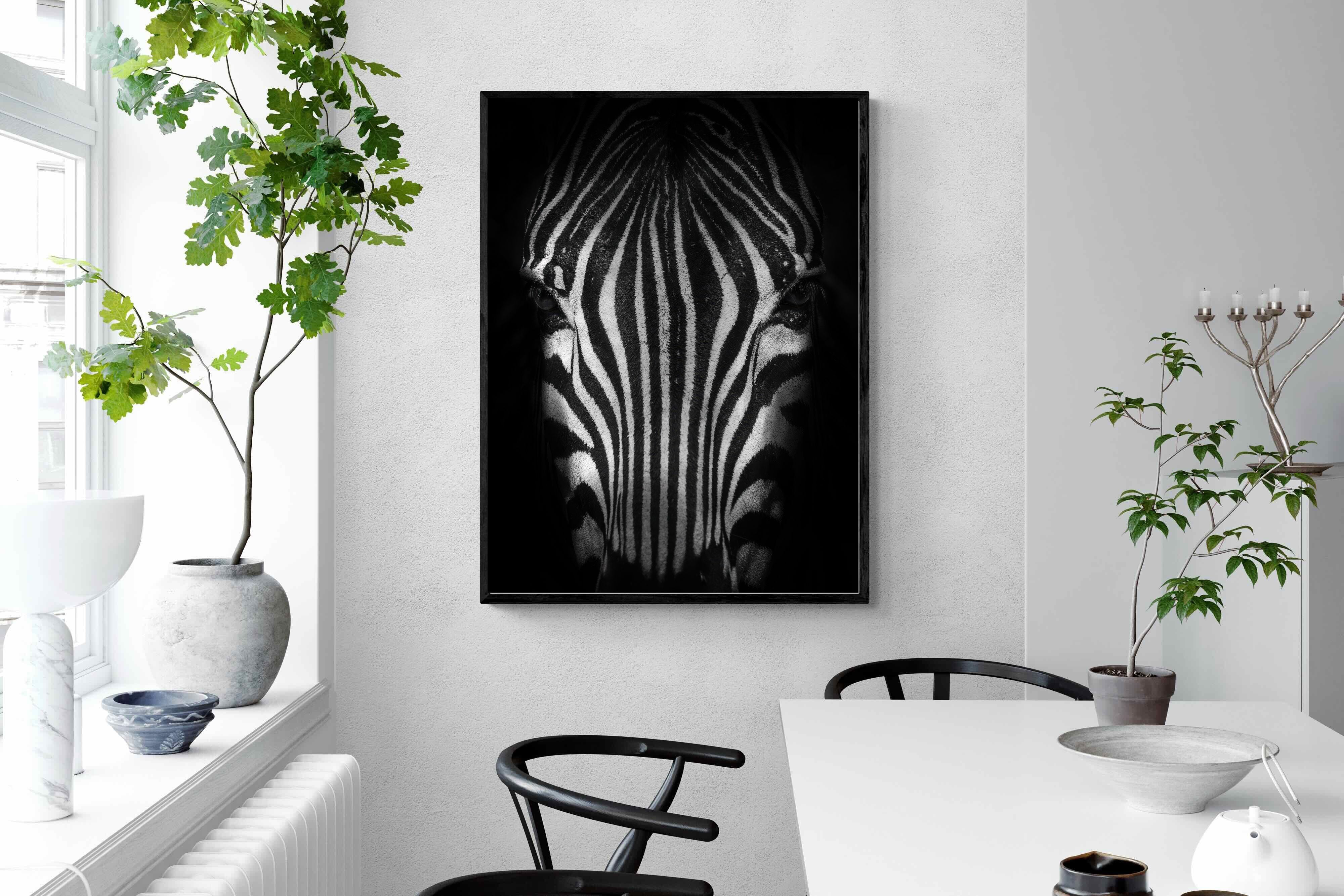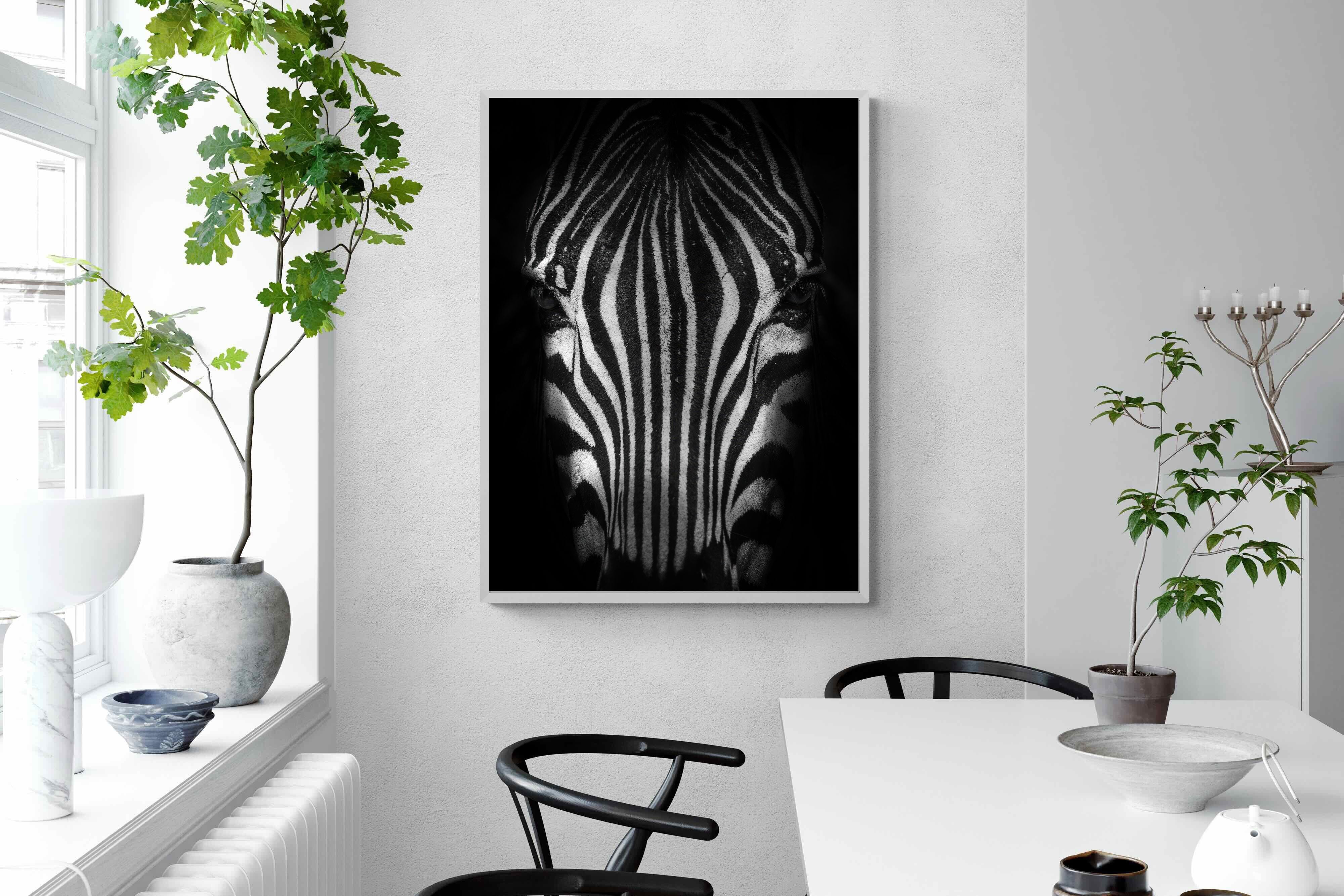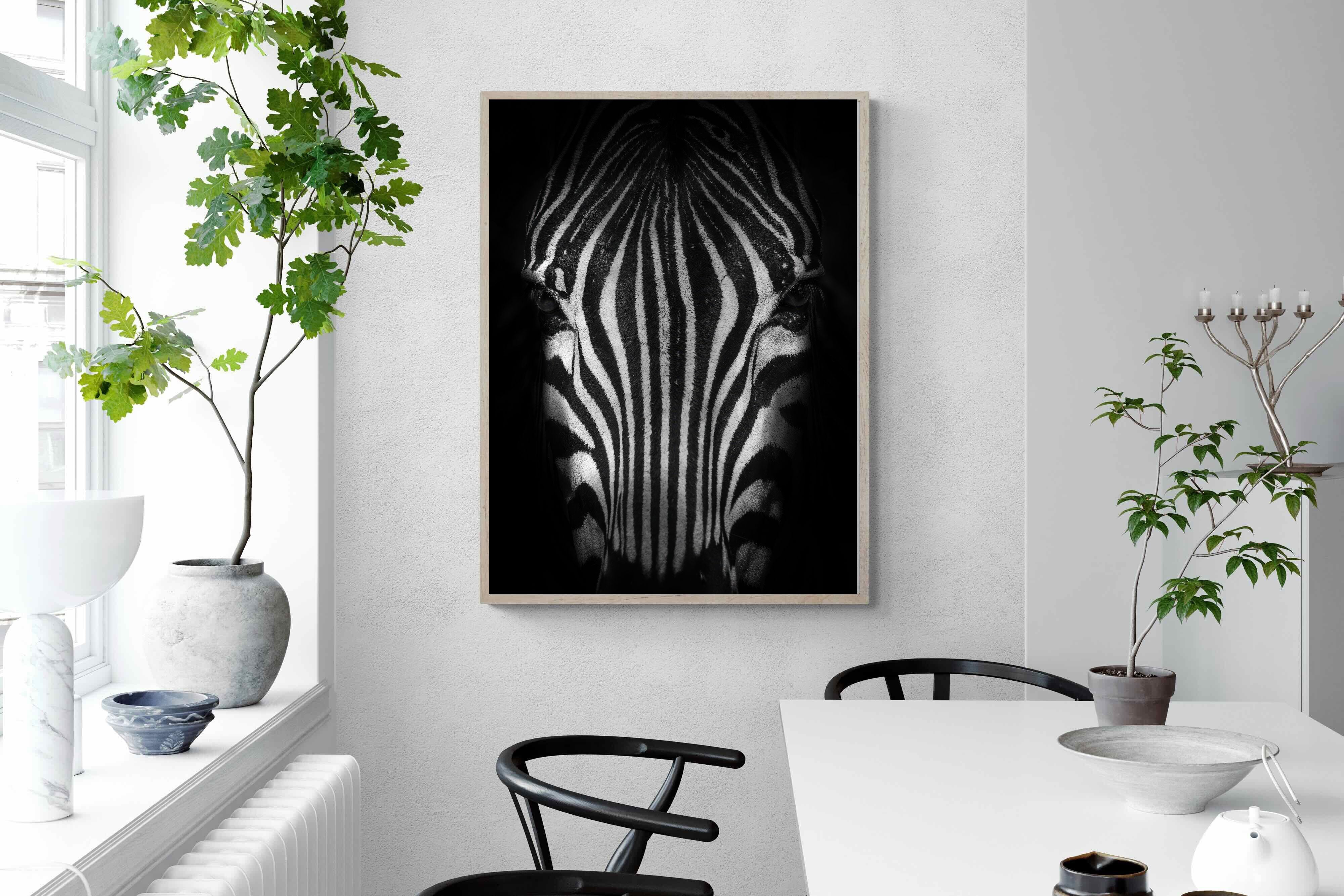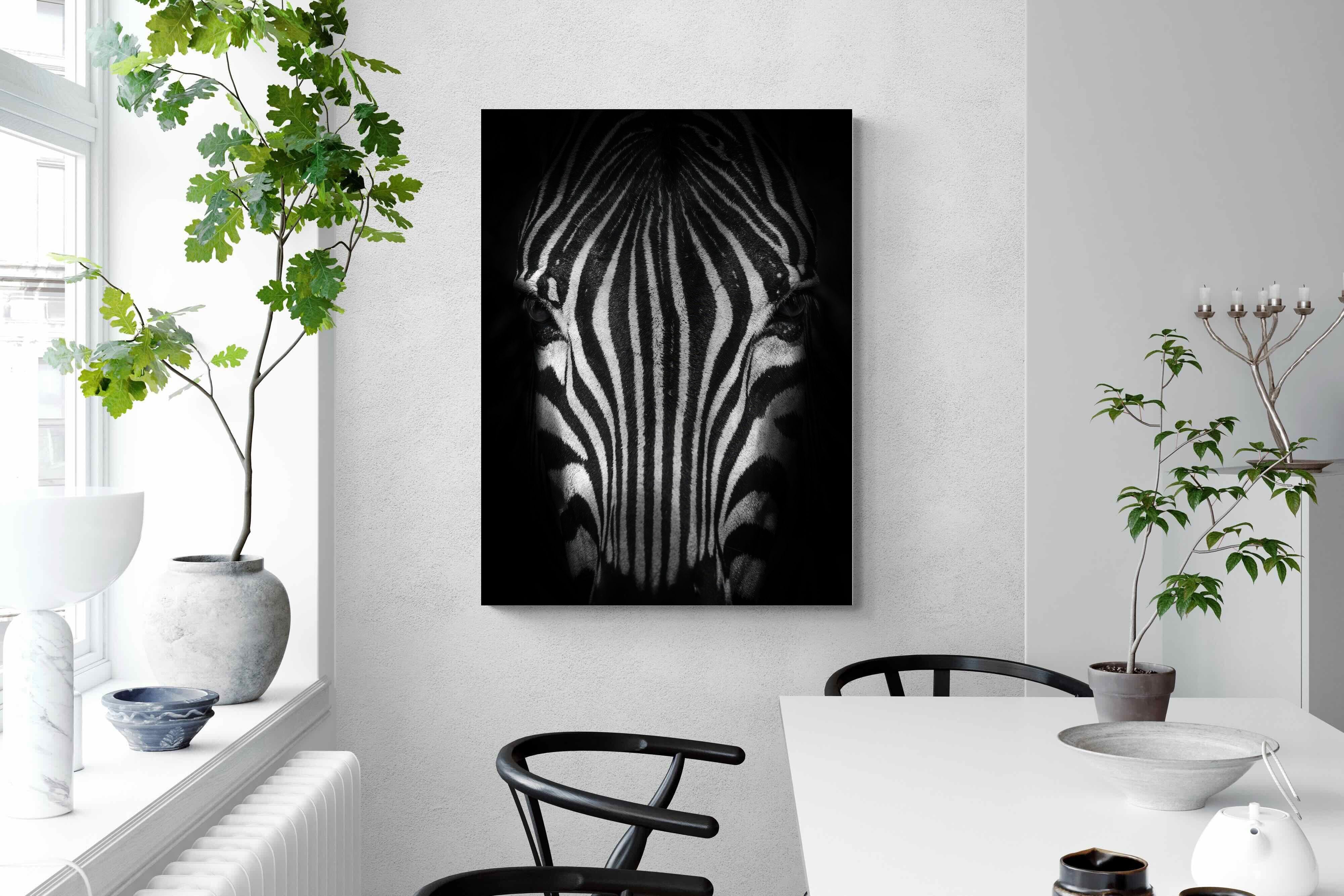 This powerful close-up of a zebra’s face, captured in striking black and white, creates an almost abstract visual with its bold symmetry and fine detail. The intense contrast and darkened edges draw you into the quiet, watchful presence of the animal. Perfect for contemporary interiors, safari-inspired decor, or minimalist spaces, it adds sophistication and a touch of the wild. Ideal for monochrome schemes or rooms that favour clean lines and strong visual impact.