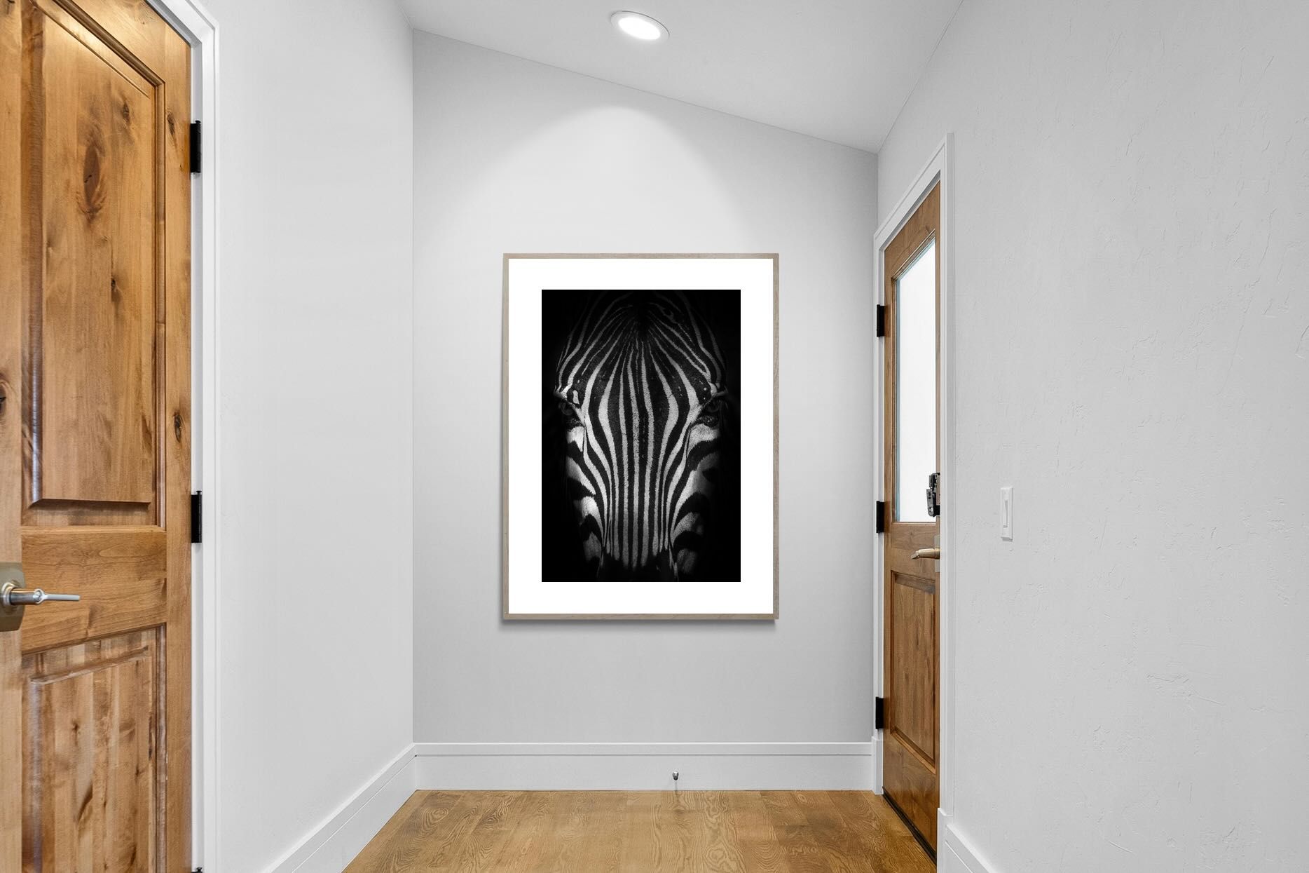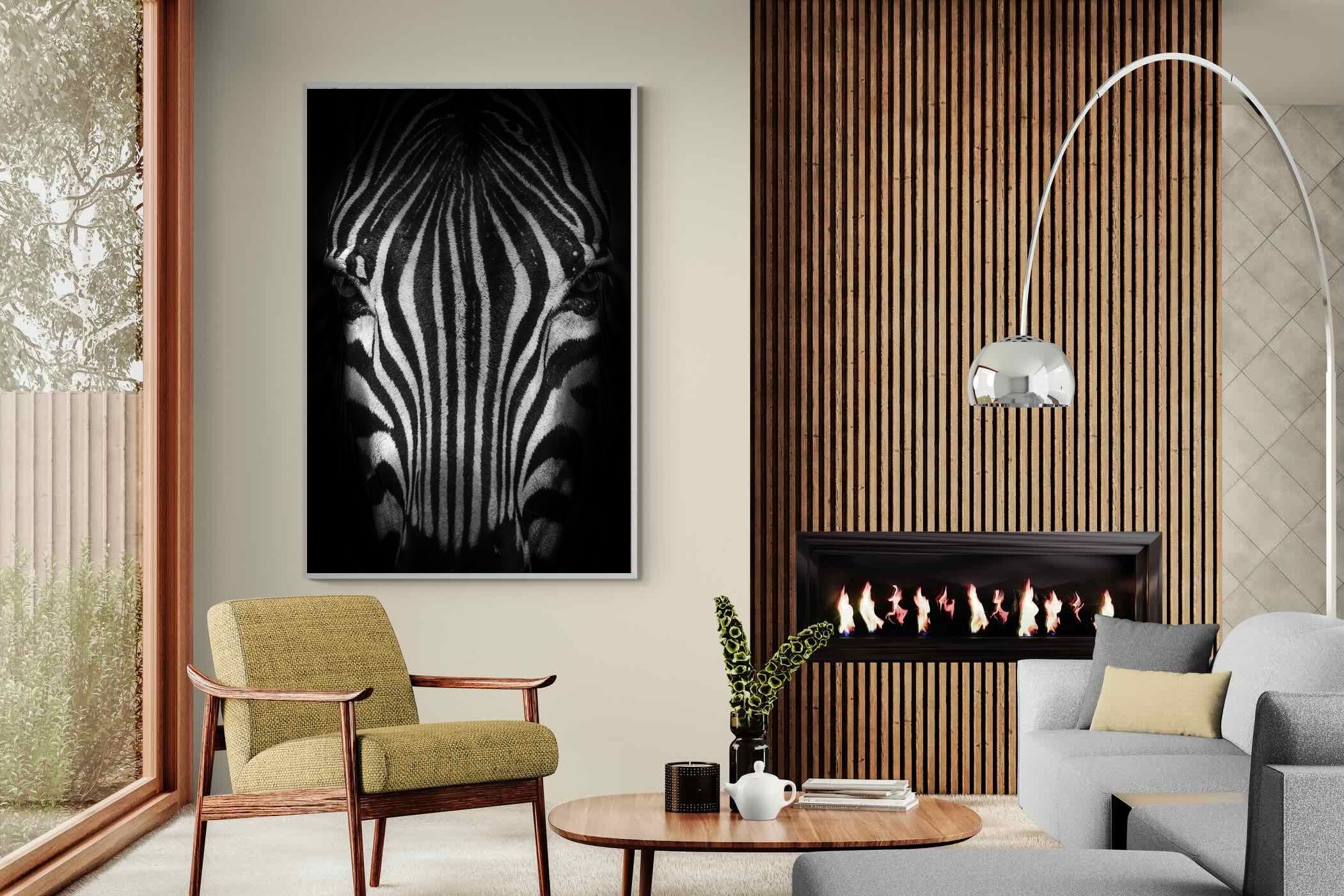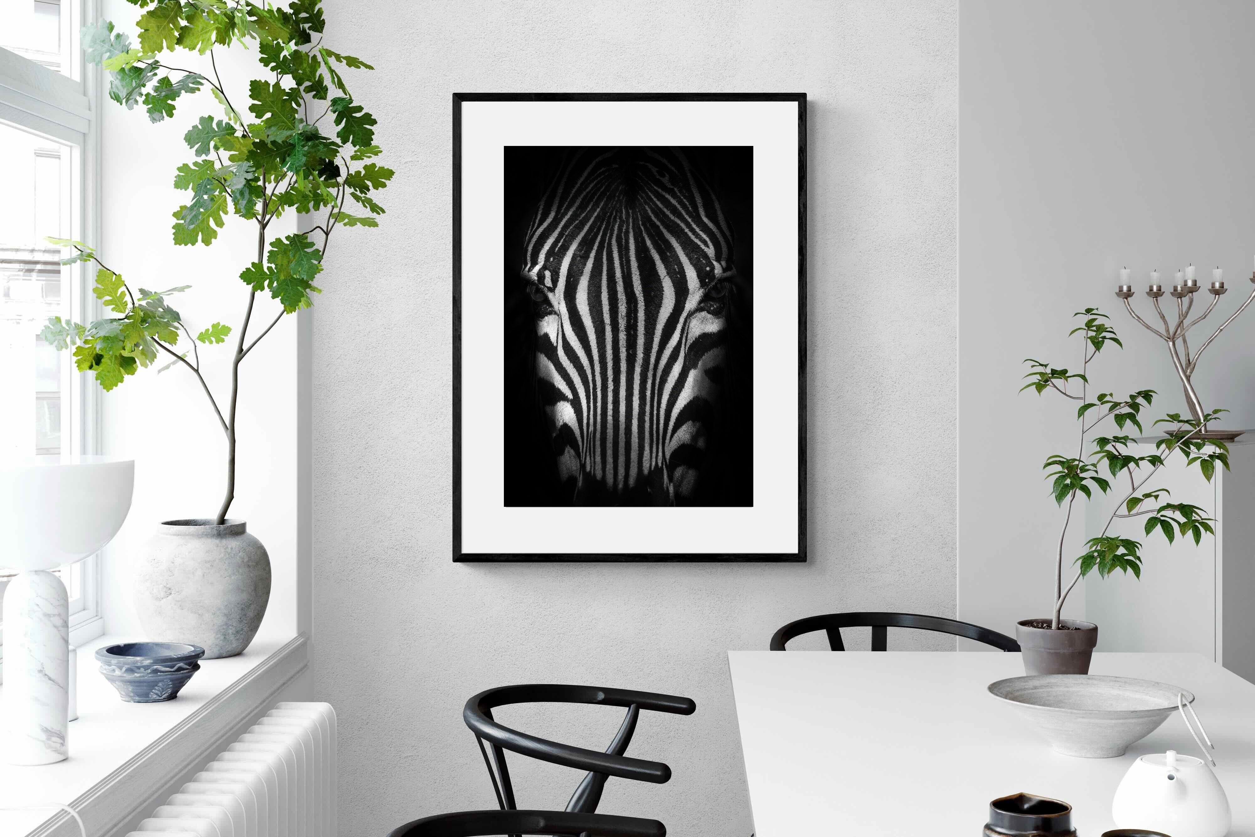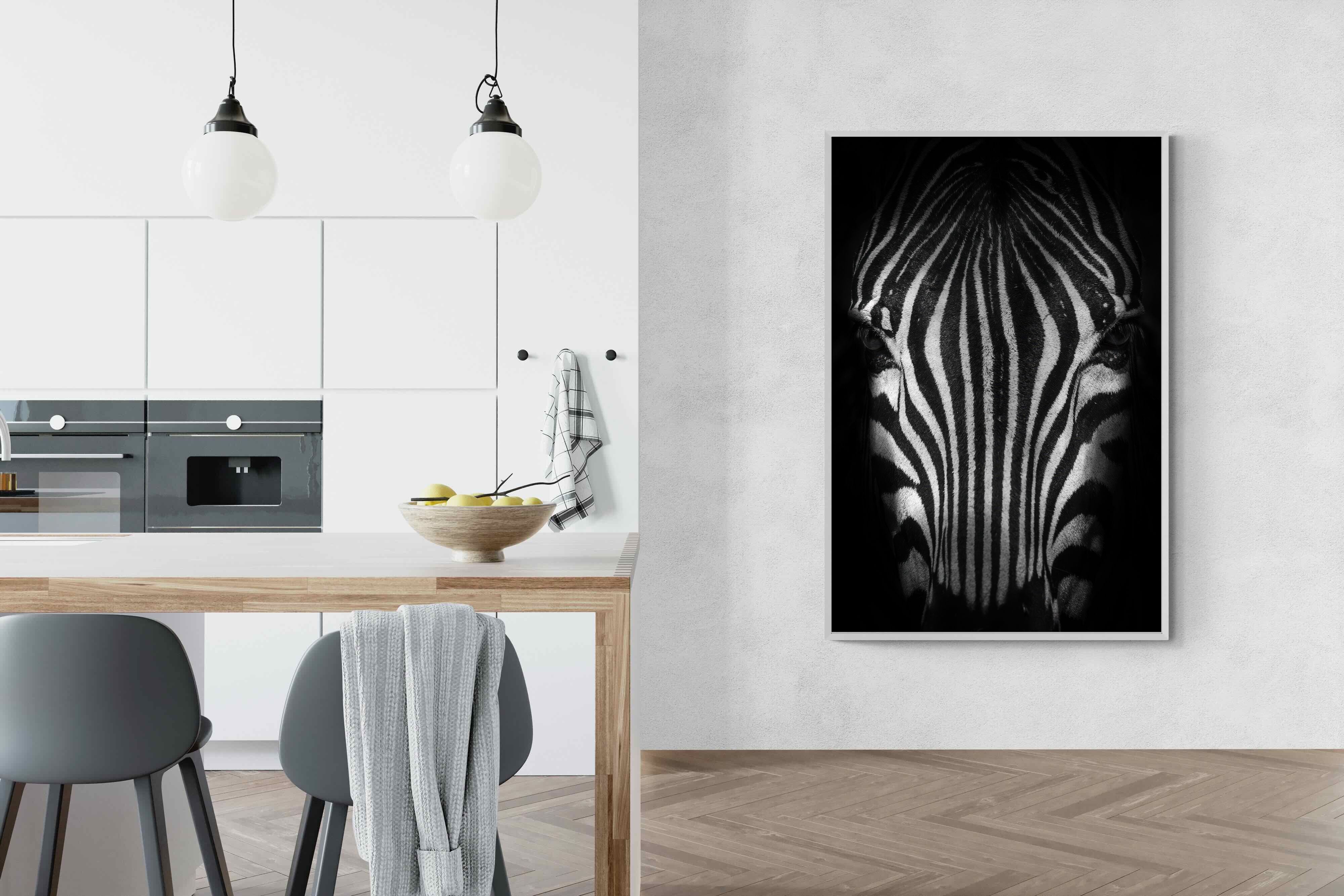 This powerful close-up of a zebra’s face, captured in striking black and white, creates an almost abstract visual with its bold symmetry and fine detail. The intense contrast and darkened edges draw you into the quiet, watchful presence of the animal. Perfect for contemporary interiors, safari-inspired decor, or minimalist spaces, it adds sophistication and a touch of the wild. Ideal for monochrome schemes or rooms that favour clean lines and strong visual impact.