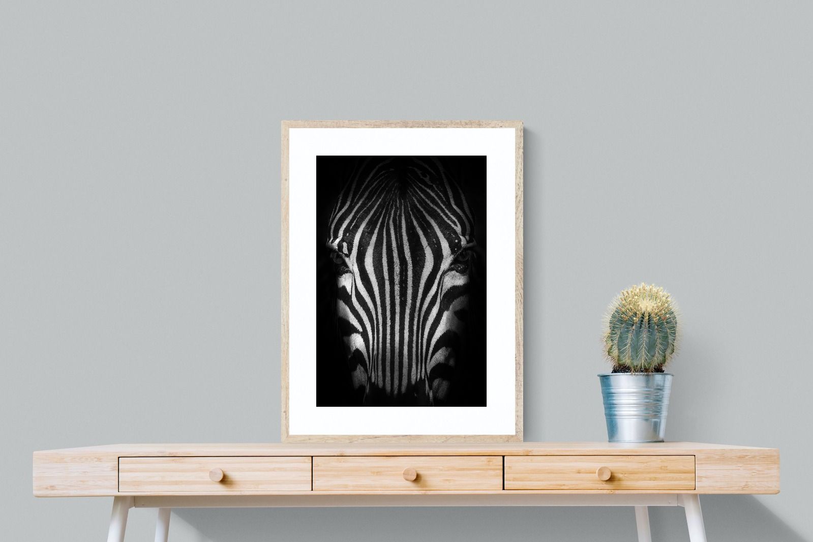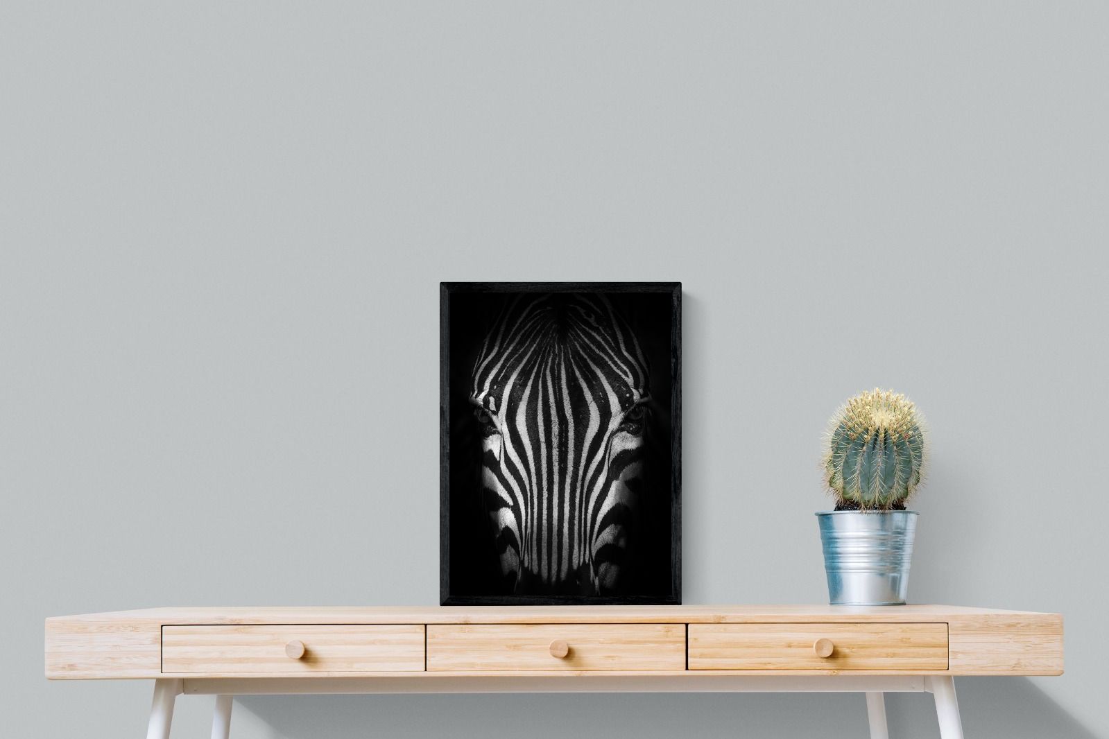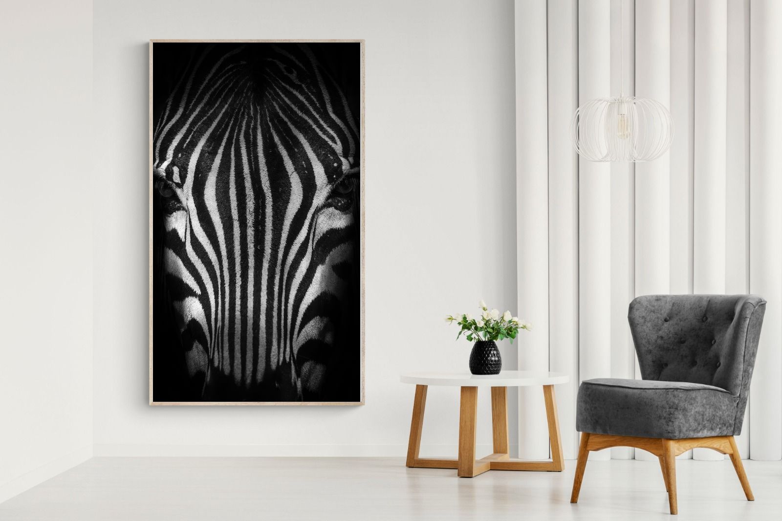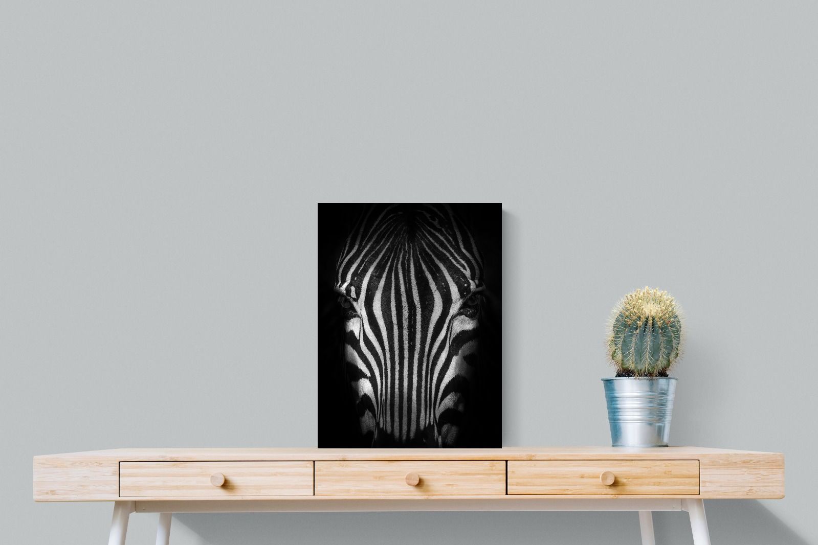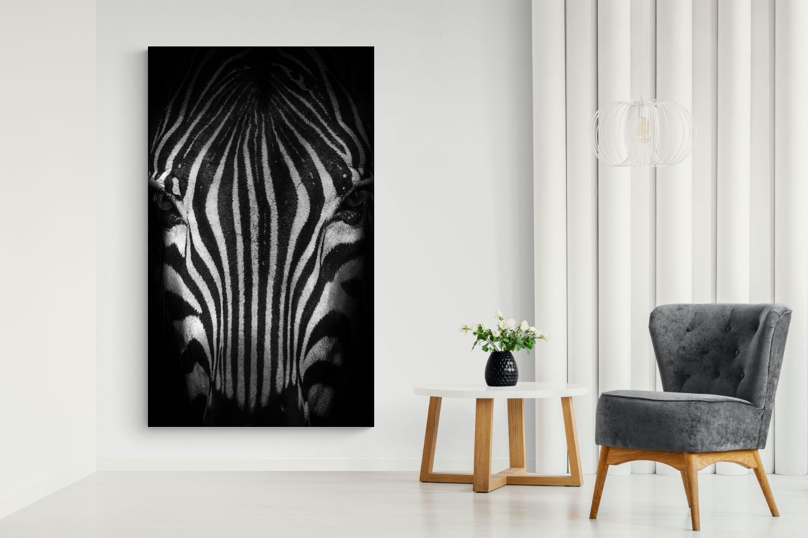 This powerful close-up of a zebra’s face, captured in striking black and white, creates an almost abstract visual with its bold symmetry and fine detail. The intense contrast and darkened edges draw you into the quiet, watchful presence of the animal. Perfect for contemporary interiors, safari-inspired decor, or minimalist spaces, it adds sophistication and a touch of the wild. Ideal for monochrome schemes or rooms that favour clean lines and strong visual impact.