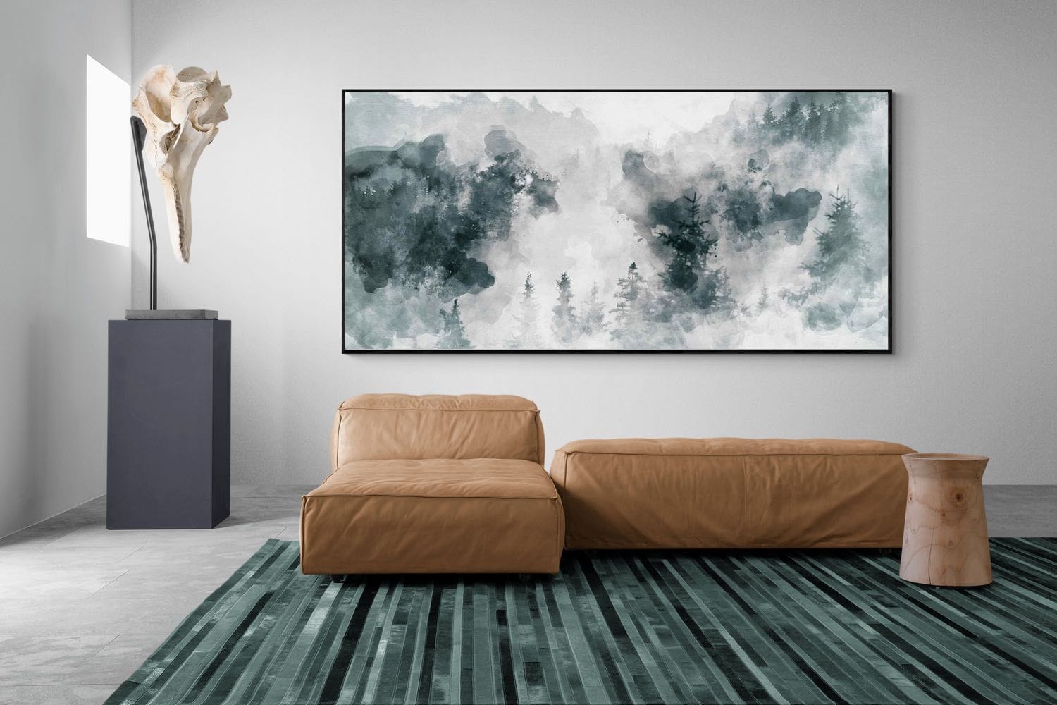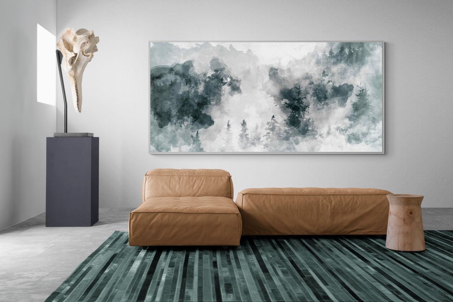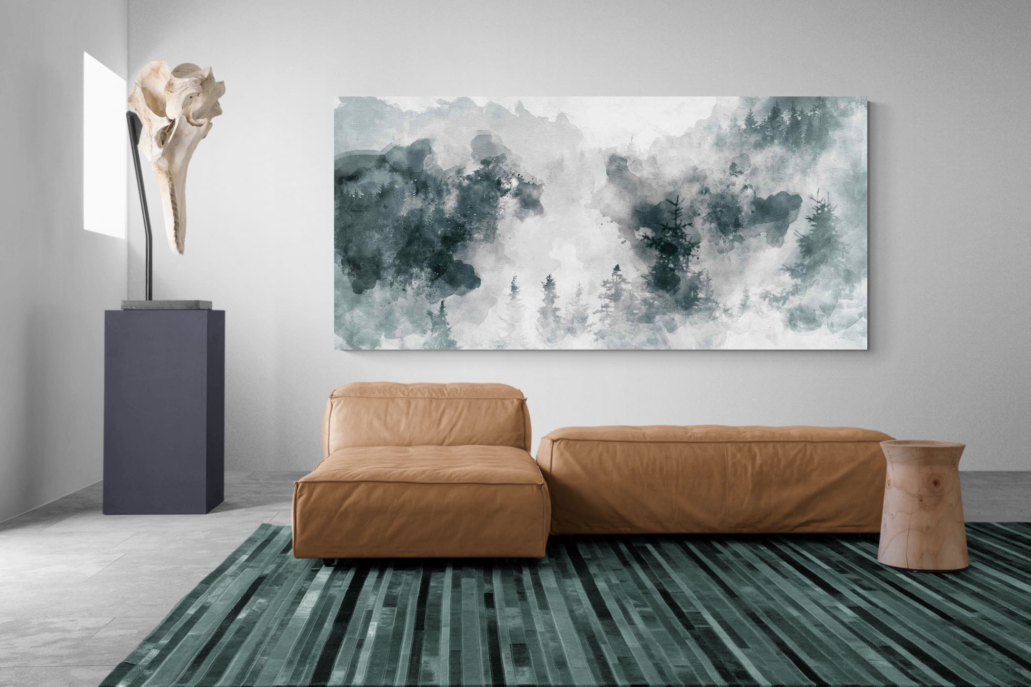 Soft washes of grey and muted green form a dreamlike forest landscape where distant mountains and delicate pine trees emerge through drifting mist. The painterly watercolour style creates a calm, atmospheric composition that feels both contemporary and timeless. Ideal for bedrooms, modern living rooms, offices or Scandinavian-inspired interiors, this artwork brings a quiet sense of nature and tranquillity to a wall while complementing minimalist décor and neutral palettes.