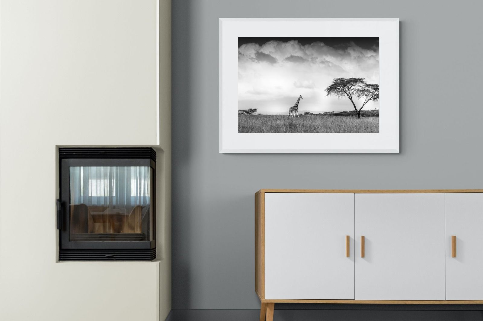 Introducing "Stormy Africa" Wall Art by Pixalot, a powerful black and white image that captures the expansive Serengeti landscape with a giraffe and an acacia tree in the middle distance. Storm clouds overhead add to the dramatic atmosphere of this stunning piece. Available as both a framed glass piece and a mounted canvas, "Stormy Africa" can effortlessly adapt to any home decor style.