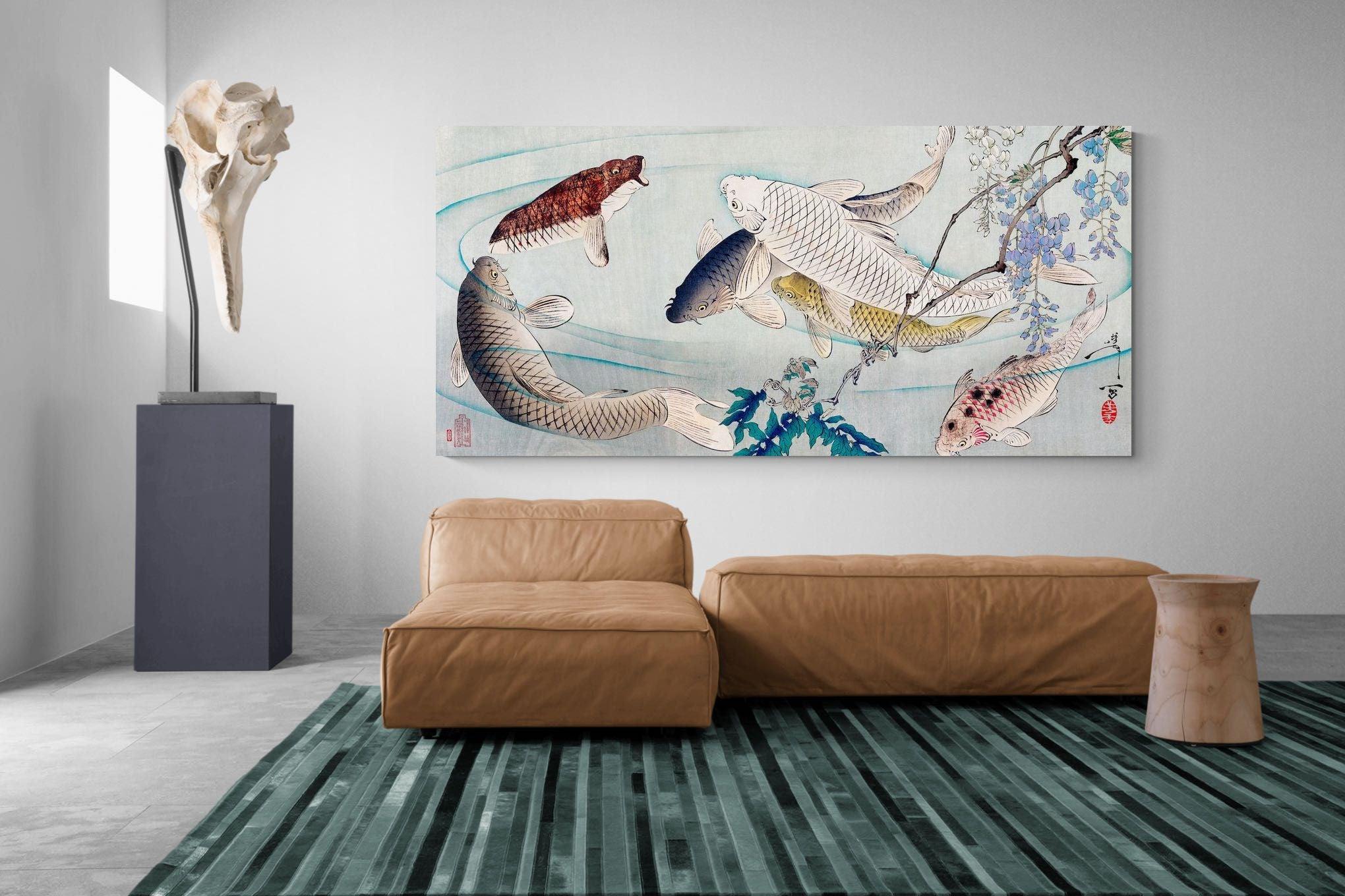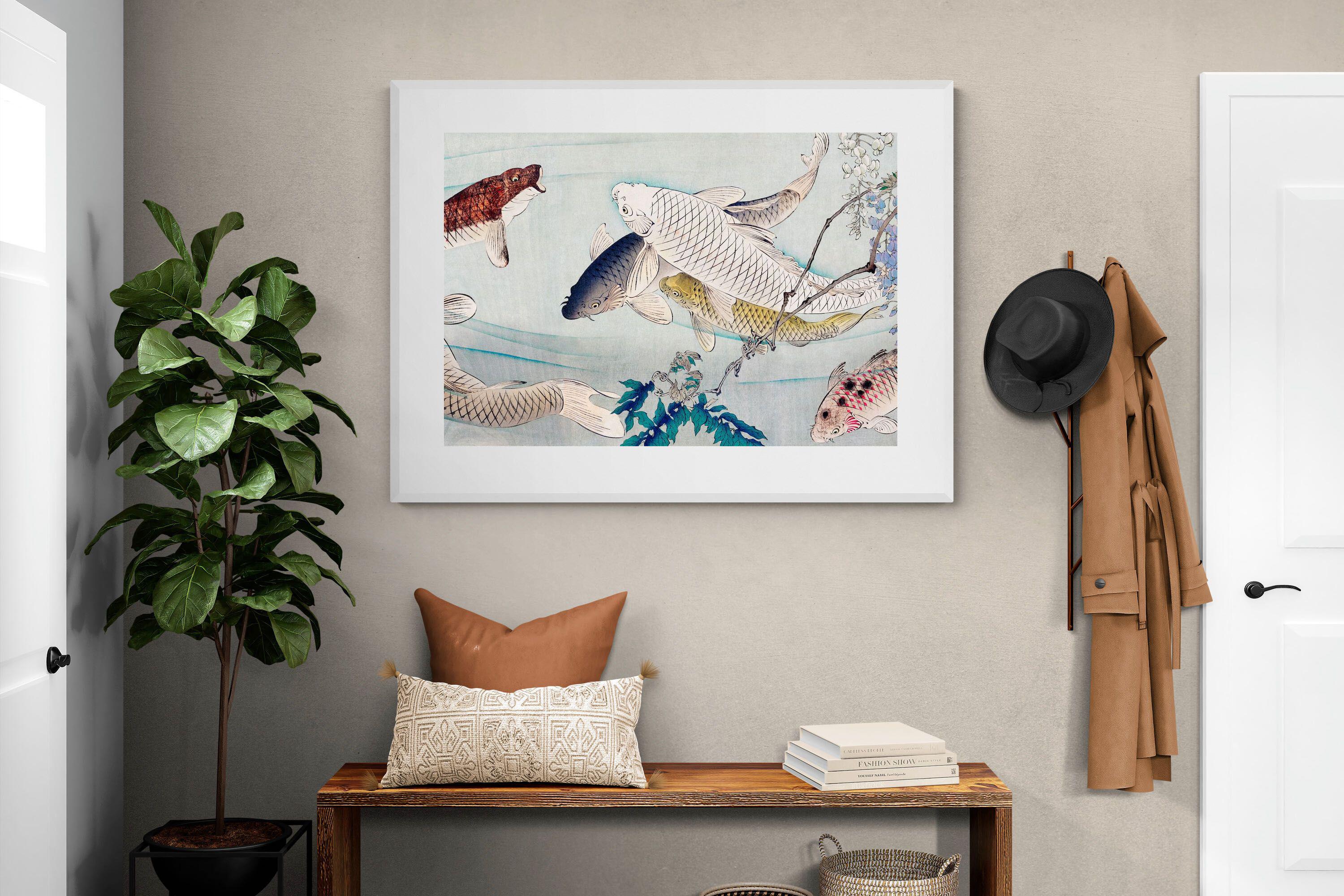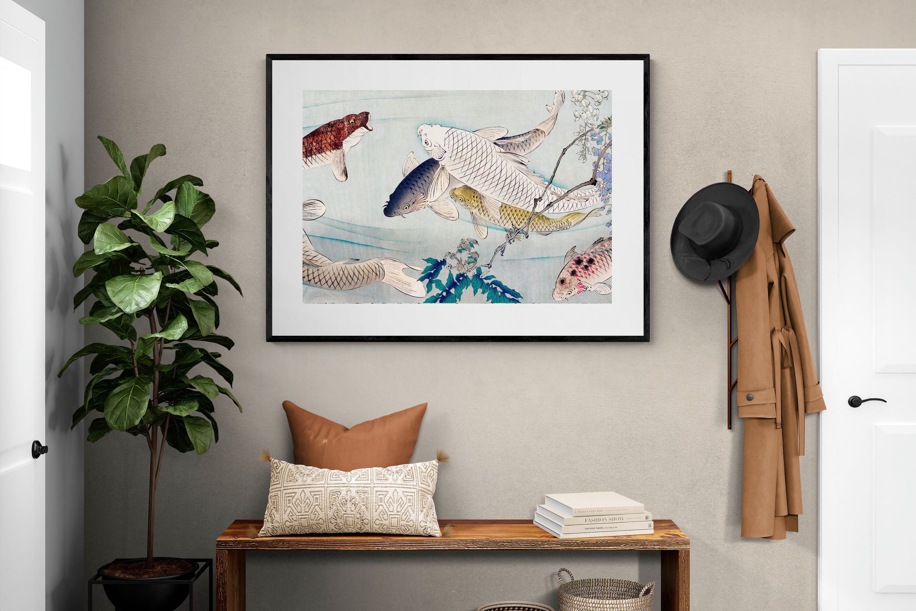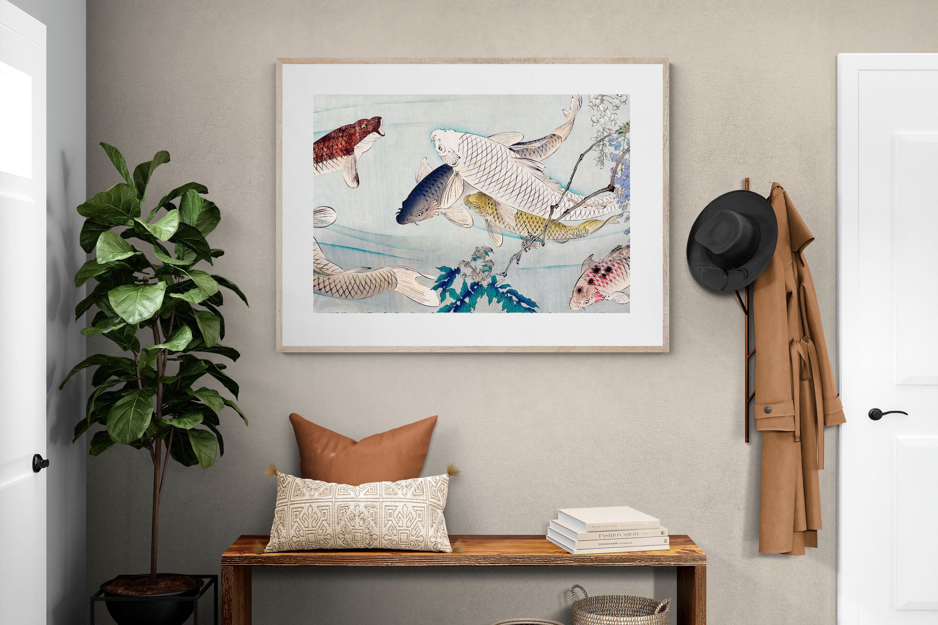 Six Carp Swimming Beneath Wisteria by Tsukioka Yoshitoshi is a captivating woodblock print depicting six graceful carp gliding through water, accompanied by delicate wisteria blossoms. The carp symbolise perseverance and strength, while the flowing composition conveys movement and serenity. The harmonious blend of nature and symbolism makes this piece a striking addition to modern interiors, offering elegance and a reminder of resilience and tranquility in life.