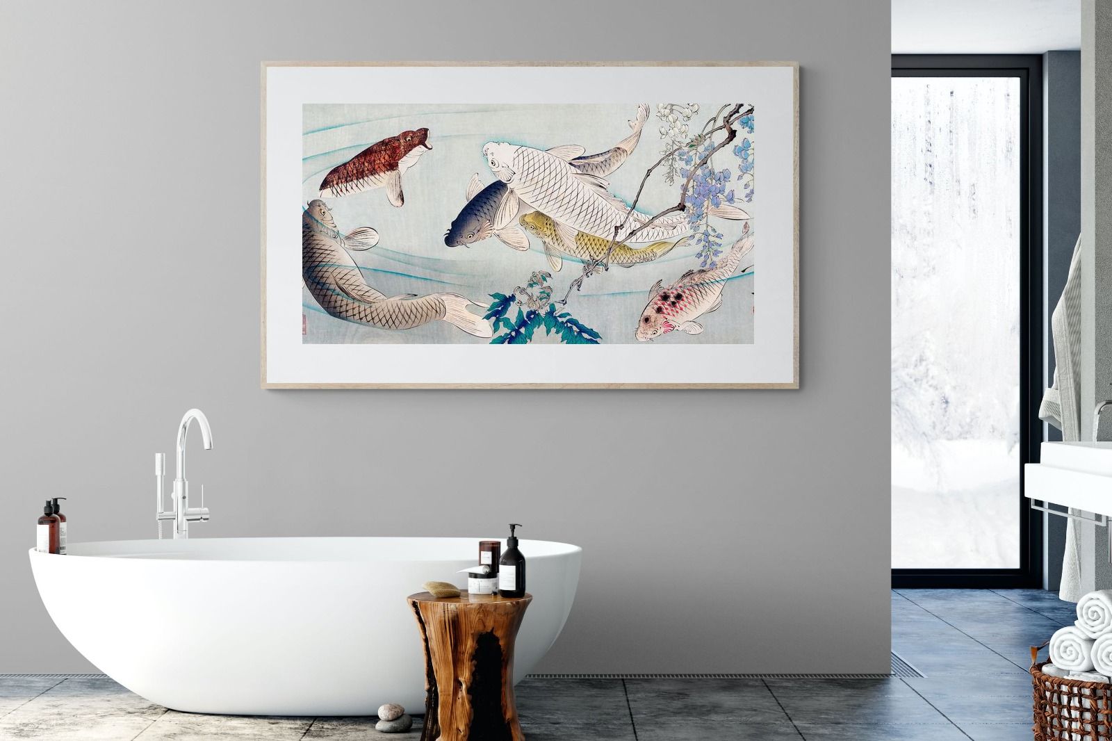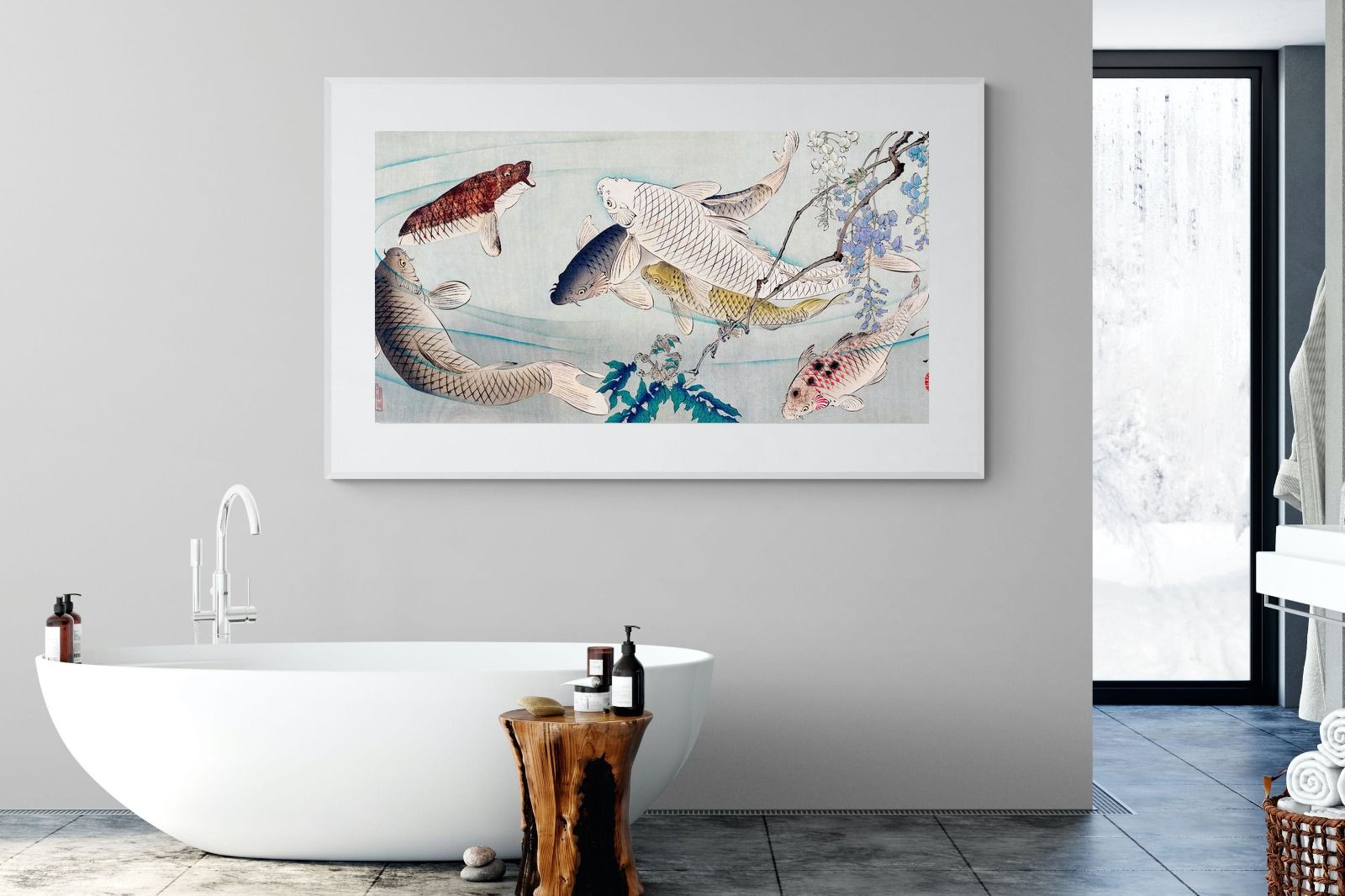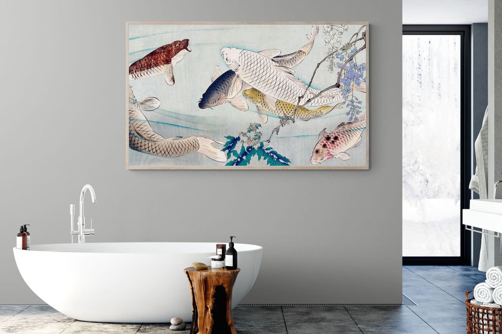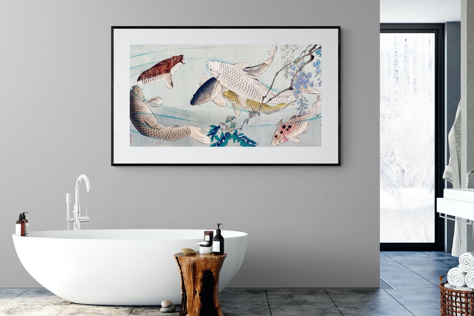Six Carp Swimming Beneath Wisteria by Tsukioka Yoshitoshi is a captivating woodblock print depicting six graceful carp gliding through water, accompanied by delicate wisteria blossoms. The carp symbolise perseverance and strength, while the flowing composition conveys movement and serenity. The harmonious blend of nature and symbolism makes this piece a striking addition to modern interiors, offering elegance and a reminder of resilience and tranquility in life.
