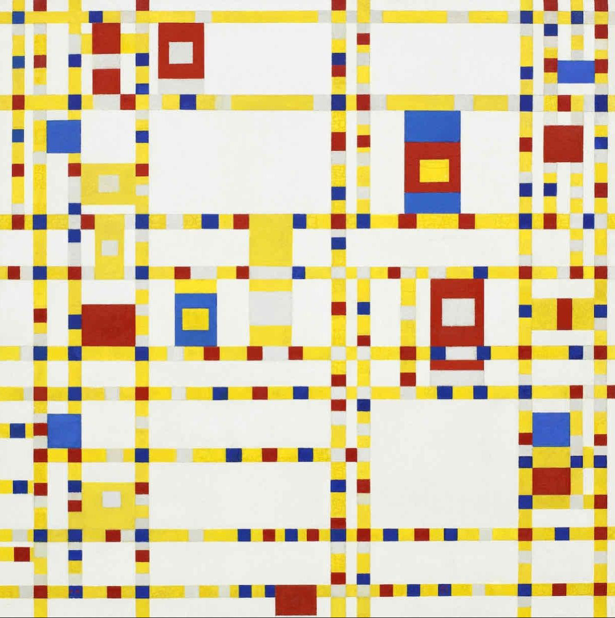Broadway Boogie Woogie is a painting by Piet Mondrian completed in 1943, after he had moved to New York in 1940. Compared to his earlier work, the canvas is divided into many more squares. Although he spent most of his career creating abstract work, this painting is inspired by clear real-world examples: the city grid of Manhattan, and boogie-woogie, an African-American Blues music Mondrian loved.
