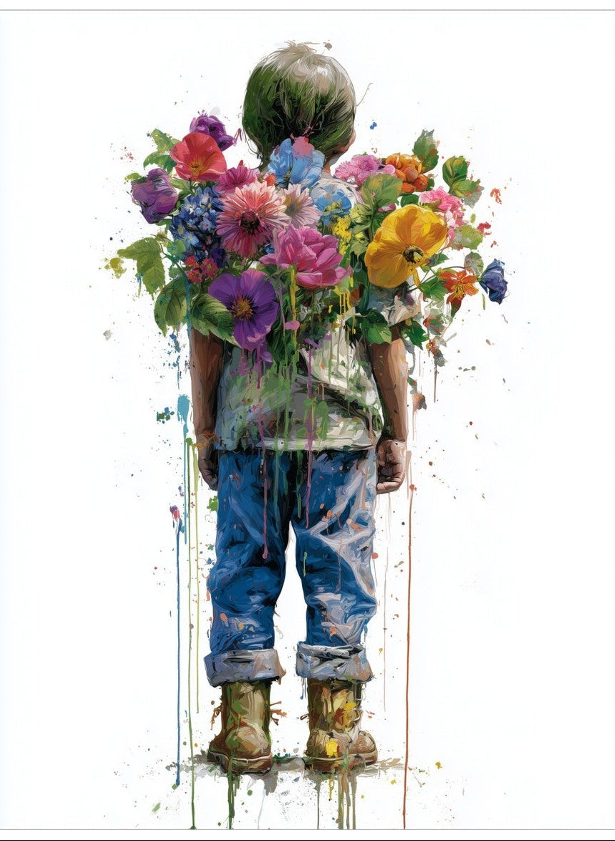 Burden of Beauty presents a poignant and imaginative figure carrying a vibrant cascade of flowers upon their back, blending realism with expressive abstraction. The artwork symbolises both weight and wonder, making it a deeply evocative choice for wall art. Its bold colours and dripping paint effect bring movement and emotional depth, ideal for eclectic homes, modern apartments, or creative workspaces. This piece adds narrative and intrigue, serving as a captivating focal point that encourages reflection while energising any interior.