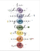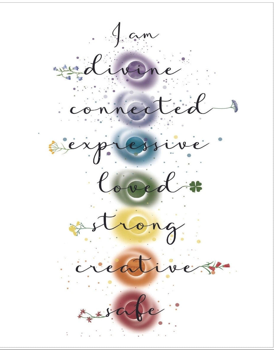 Chakras, the spinning wheels of energy, are fundamental to our well-being, and this artwork beautifully encapsulates their essence. The piece reminds viewers of the profound connection between the physical and spiritual realms, promoting balance, healing, and self-awareness. By placing emphasis on affirmations like "I am connected" and "I am safe," the artwork serves as a daily reminder of our intrinsic strengths and the divine energy within us.