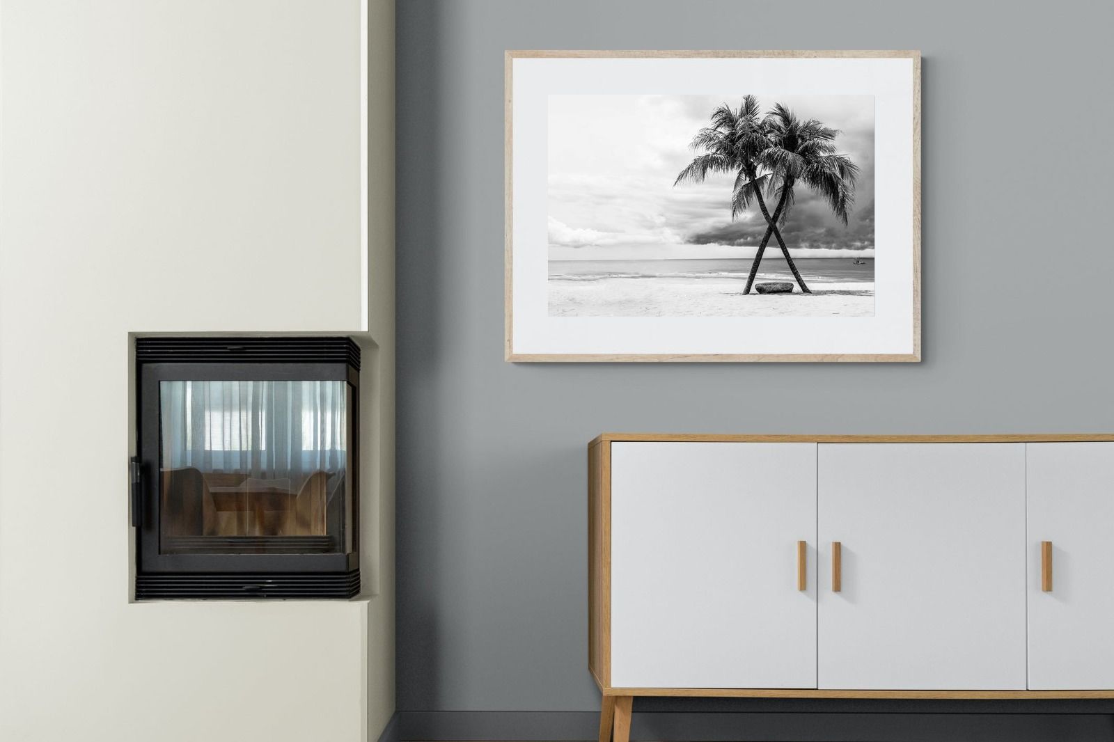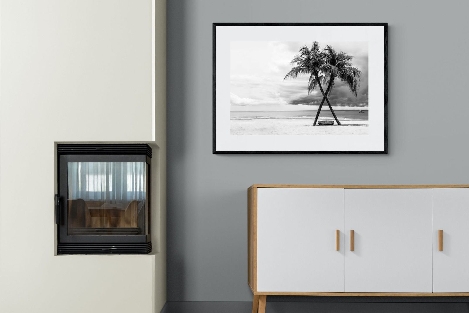 A striking black and white composition of two palm trees leaning into each other against a calm shoreline and dramatic sky. The contrast between soft sand, still water and textured clouds creates a timeless, atmospheric scene. Ideal for modern interiors, bedrooms or coastal homes, this piece adds depth, simplicity and a refined monochrome aesthetic.
