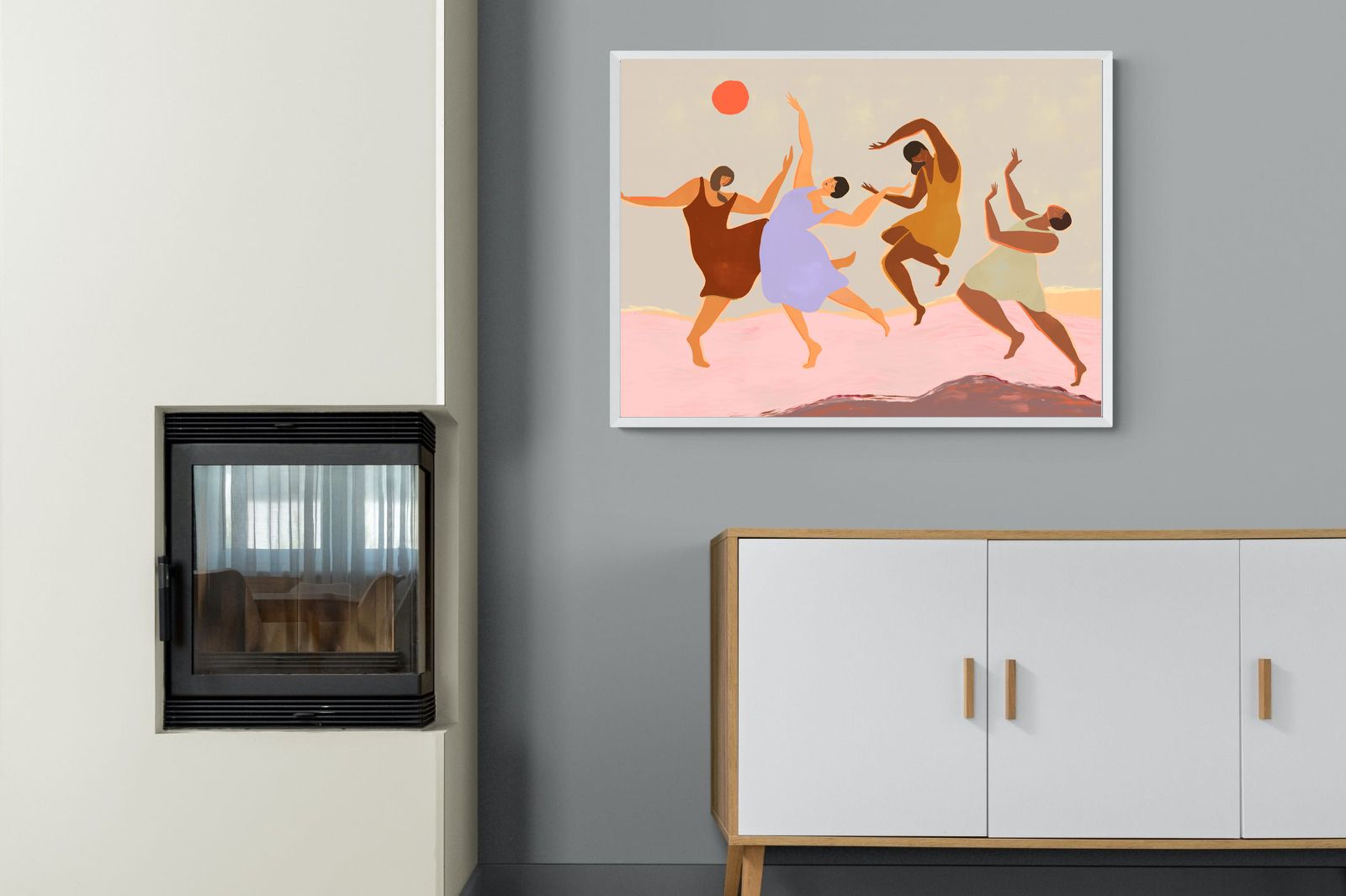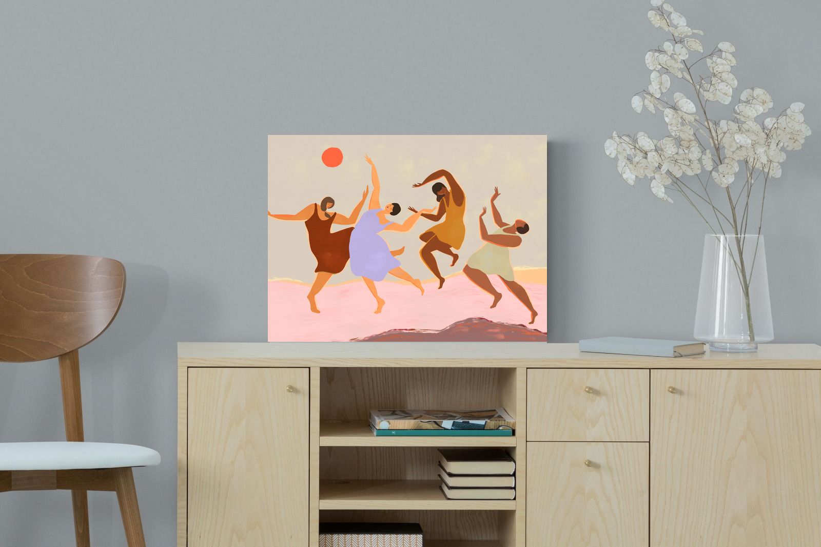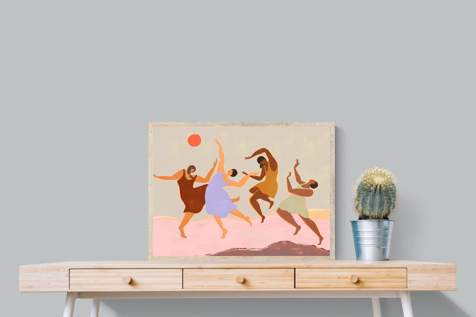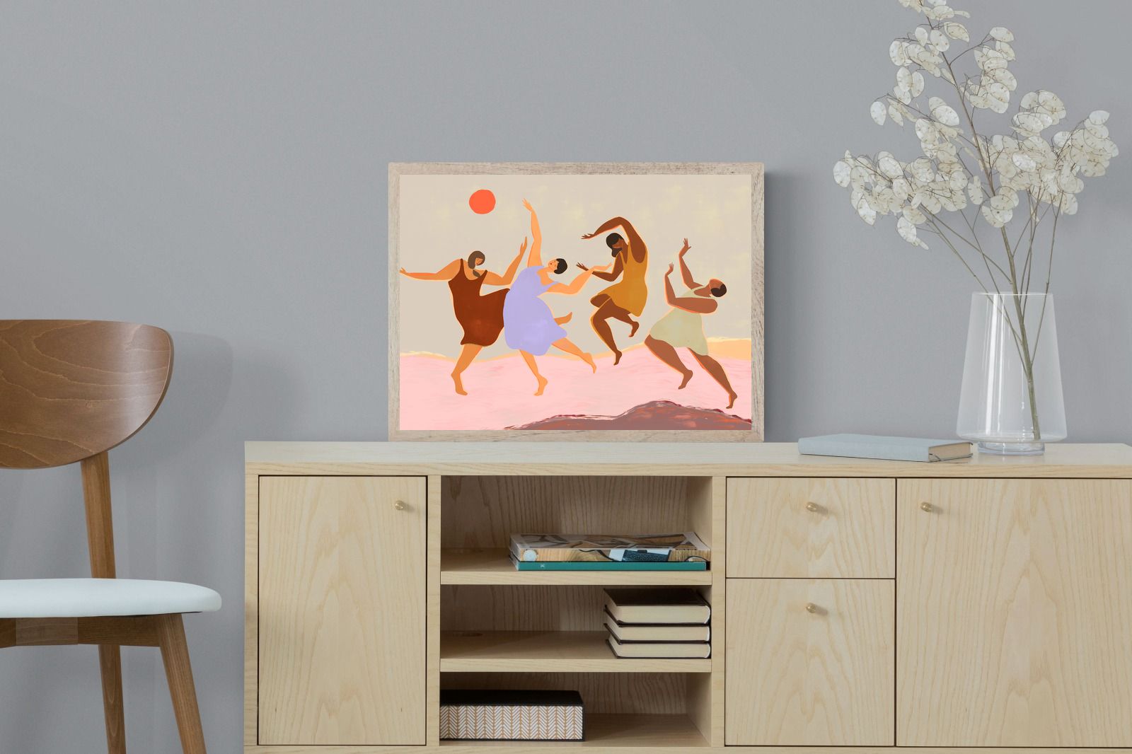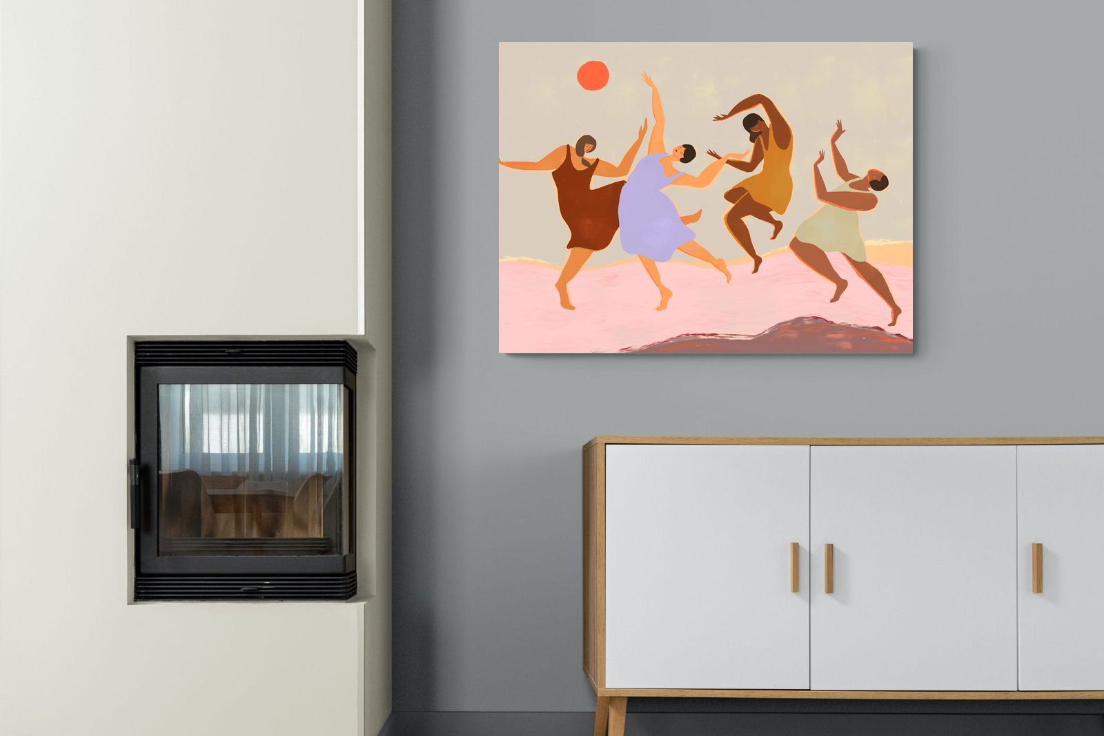 Featuring four figures in vibrant dresses dancing joyfully under the sun, this illustration exudes a sense of freedom and celebration. The warm colours and flowing movements create a lively and uplifting atmosphere, making it a wonderful choice for enlivening a living room or dining area with energy and positivity.