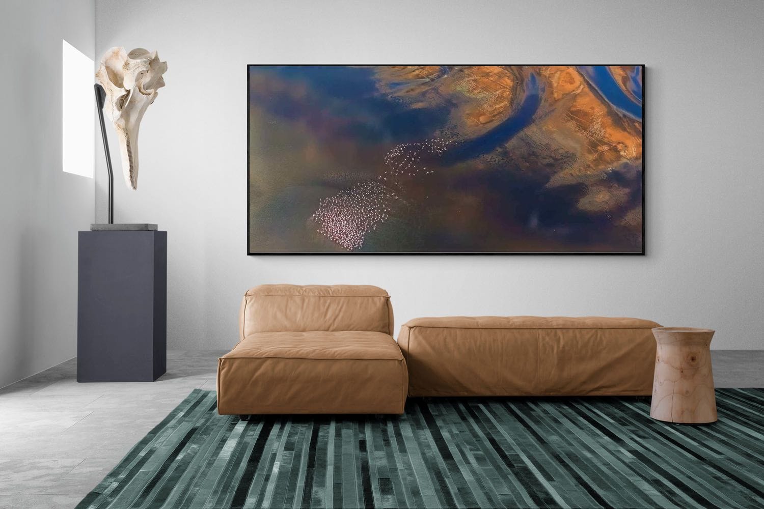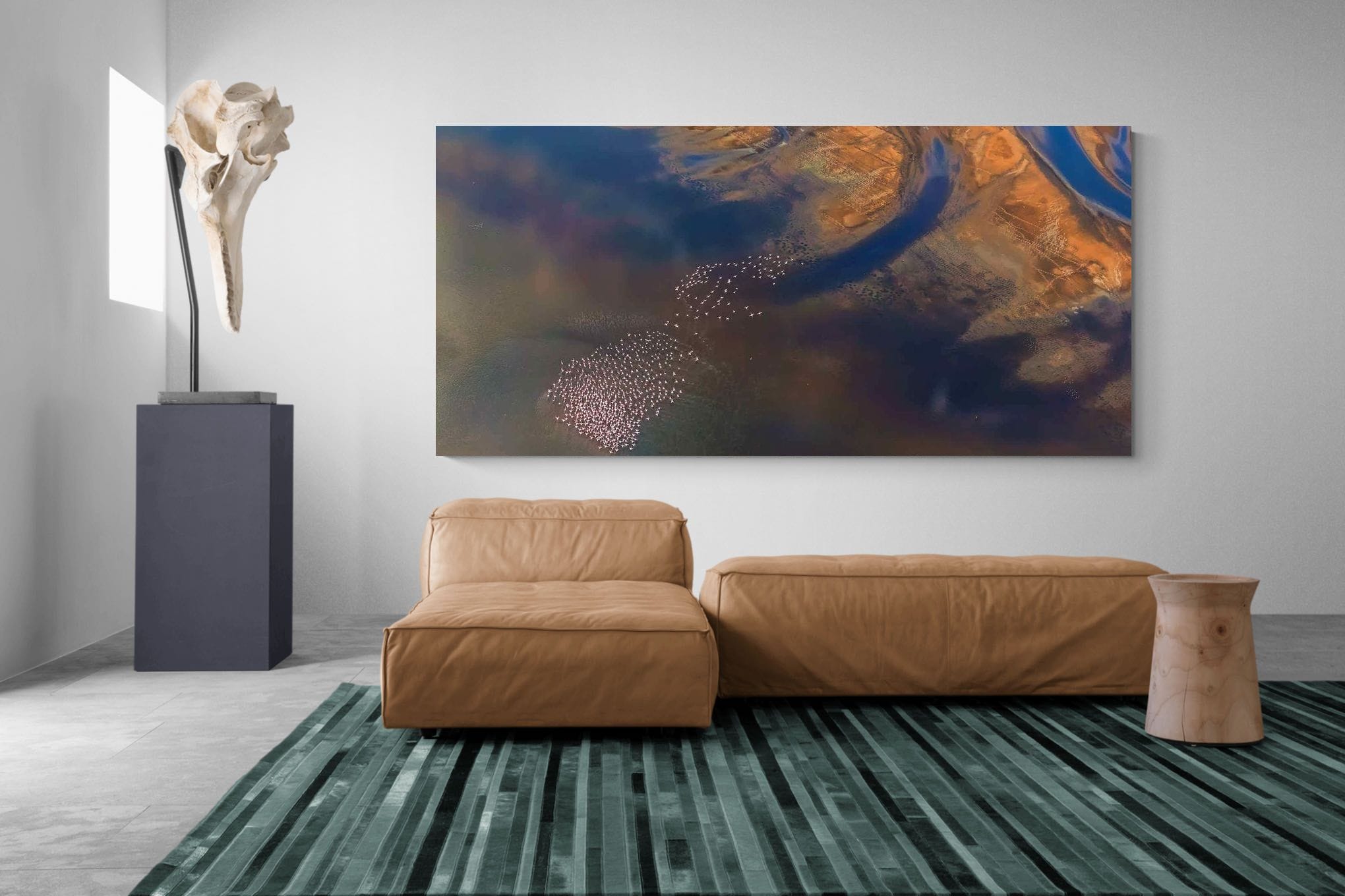 From high above, sweeping river channels cut through golden sandbanks while hundreds of flamingos gather in soft pink clusters across the water. The contrast between the dark estuary currents and warm earth tones creates a dramatic natural composition. This aerial photograph blends wildlife and landscape into a striking abstract scene, making it a captivating piece of wall art for contemporary interiors, nature-inspired spaces or sophisticated gallery walls.