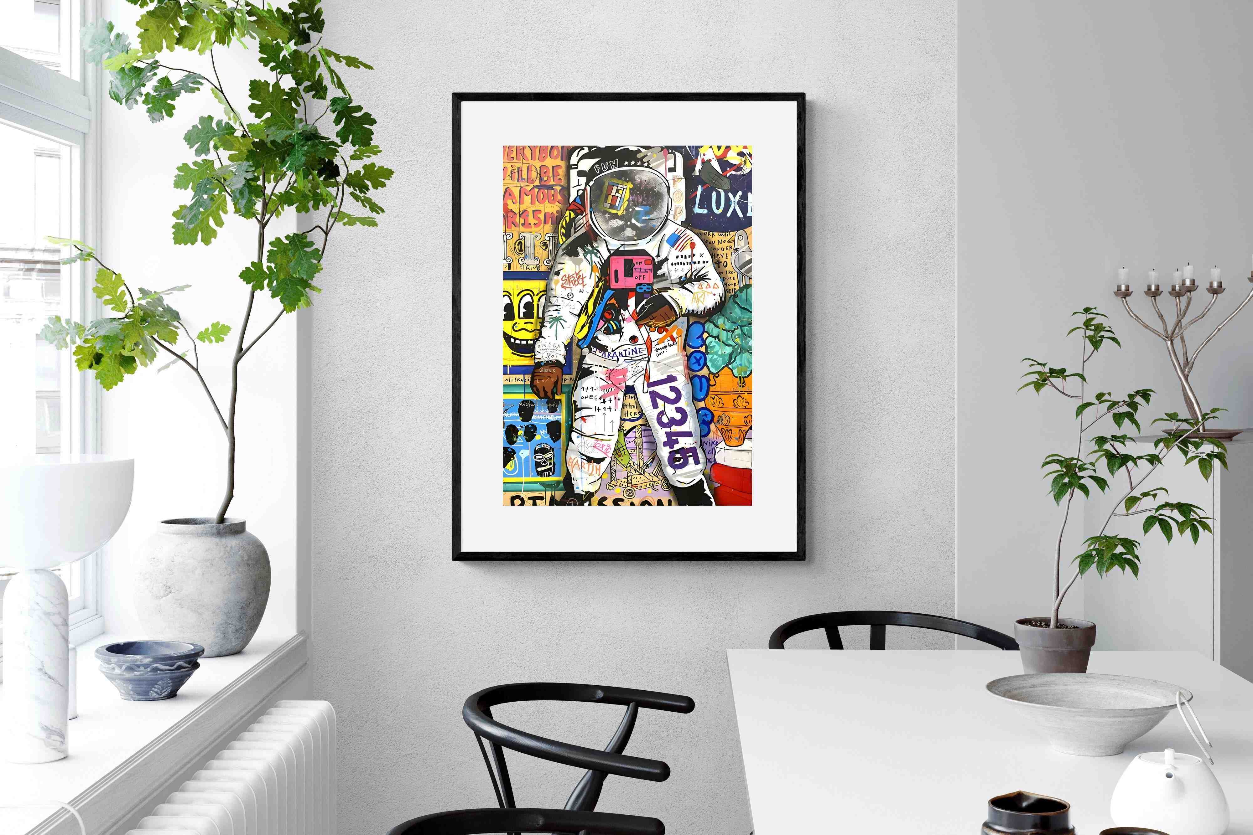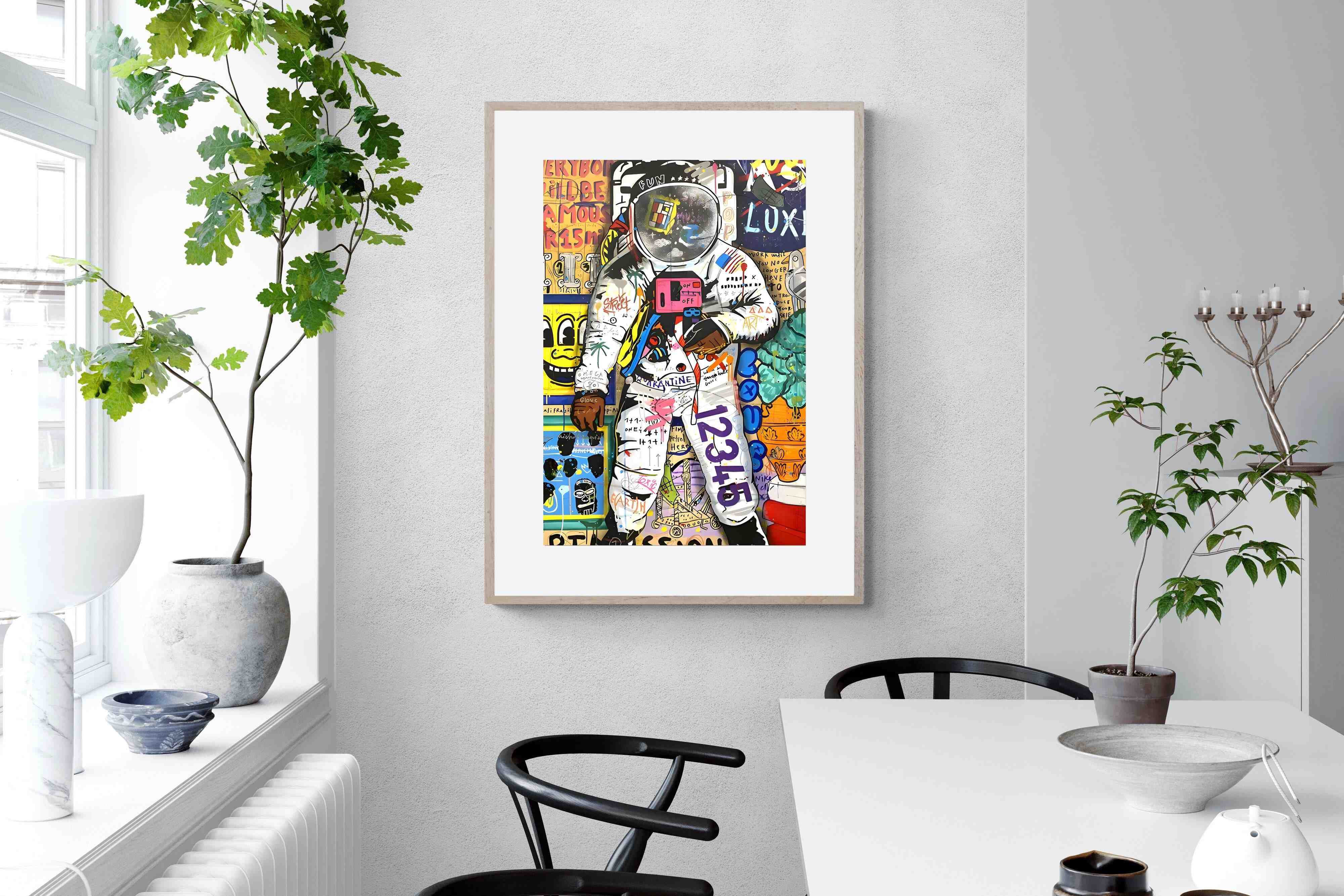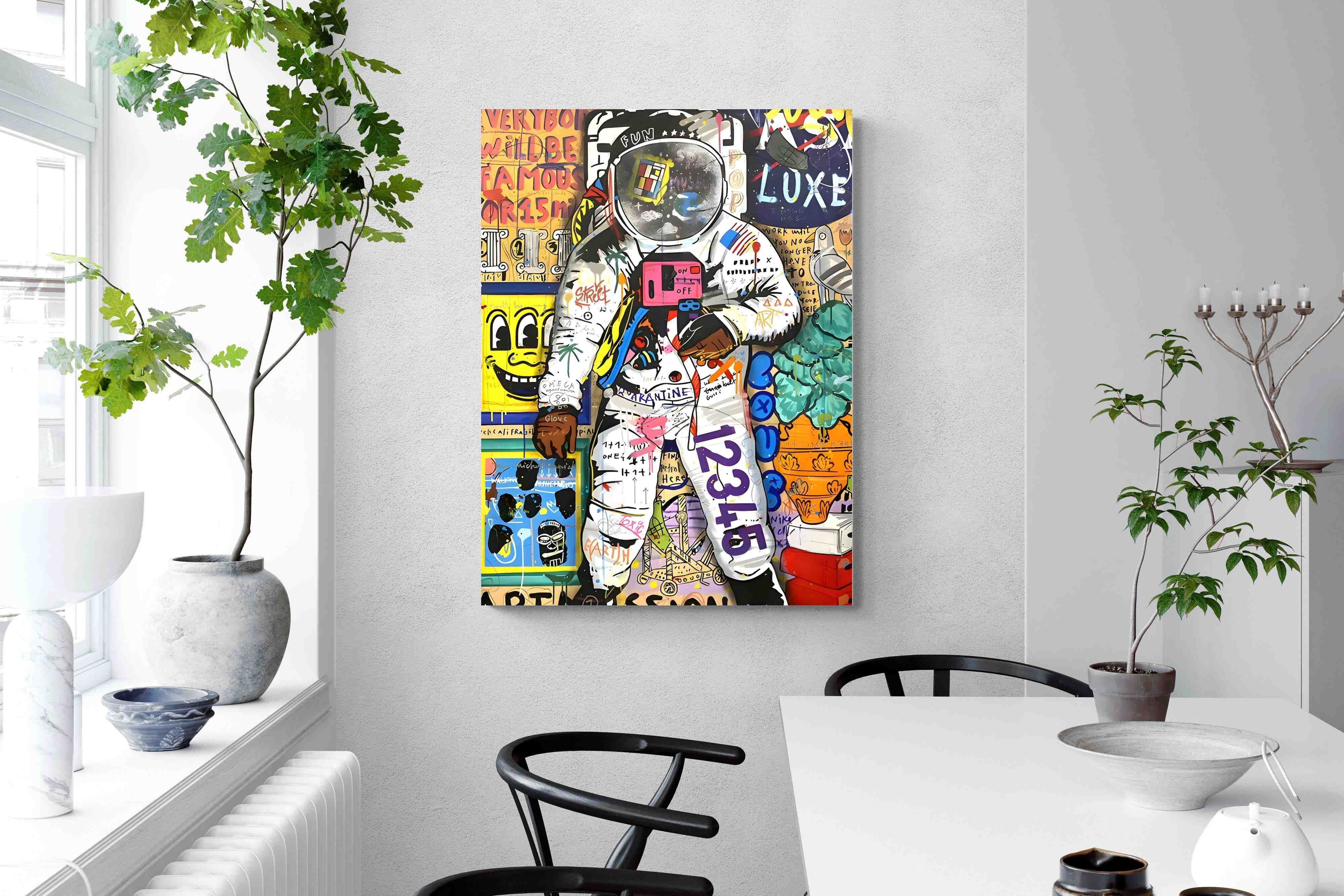Dive into a riotous explosion of colour and creativity with the "Graffiti Astronaut" masterpiece. This vibrant artwork is a mesmerising fusion of pop culture references, vivid hues, and street art panache, inviting viewers into a whimsical world of artistic brilliance and playful nostalgia.