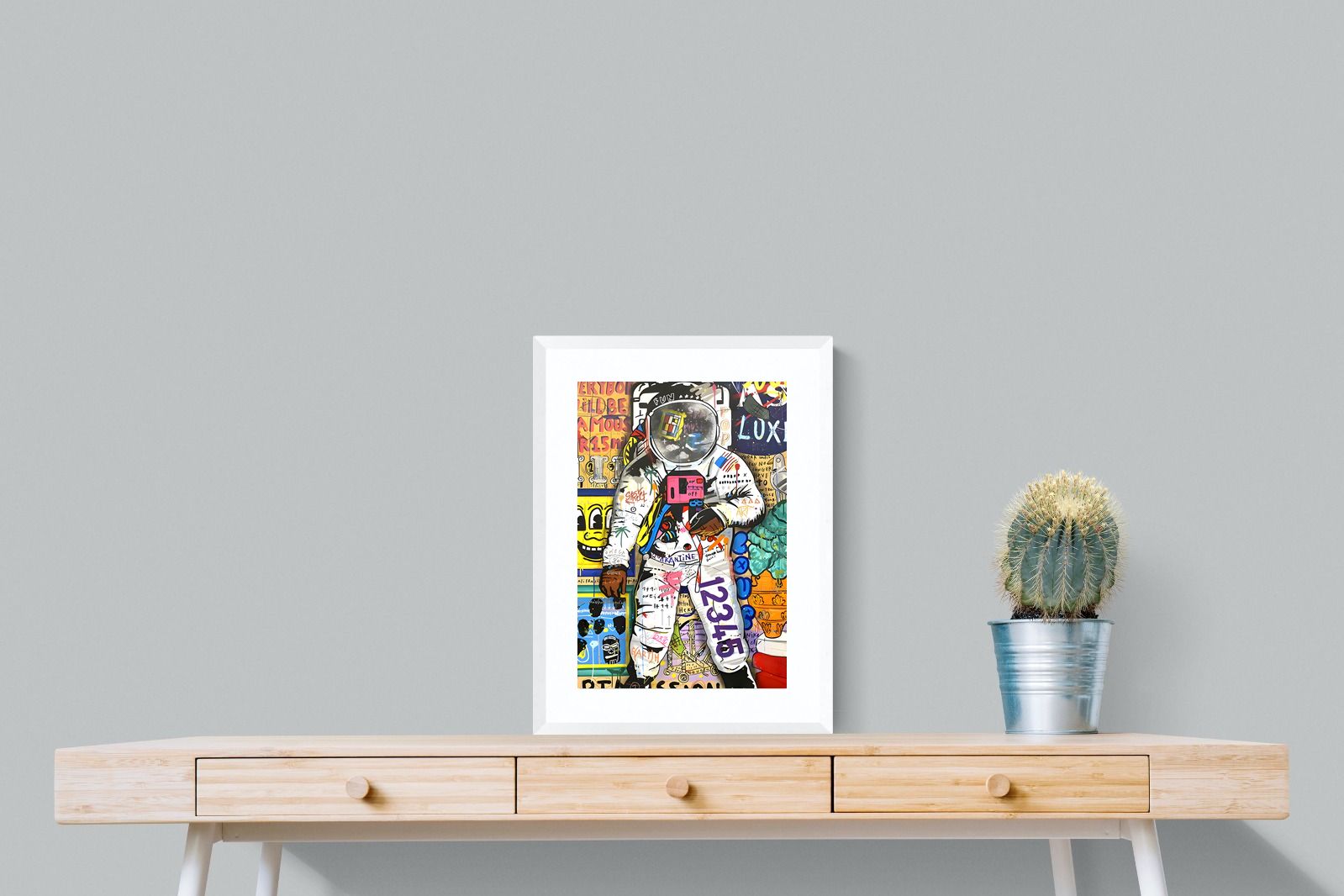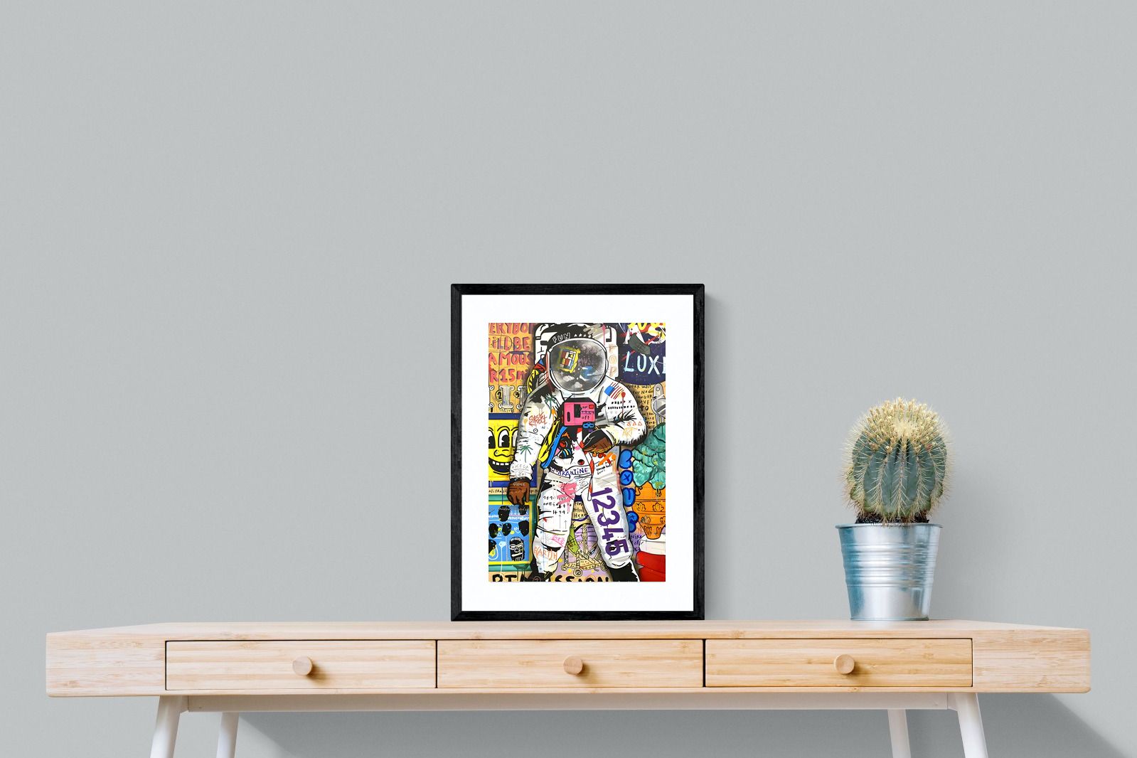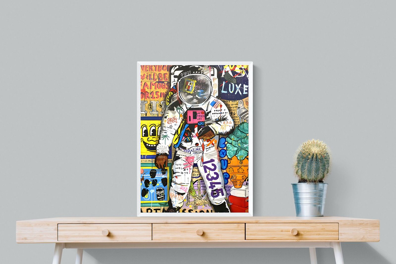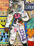 "Graffiti Astronaut" epitomises the pulsating energy of urban landscapes and the unending curiosity of human imagination. An astronaut, usually a symbol of the vastness of outer space, is playfully reimagined amidst iconic symbols and graffiti strokes. The intertwining of bright colours, recognisable motifs, and spontaneous brushwork creates a narrative that is both chaotic and harmonious, encapsulating the unpredictable essence of modern life.