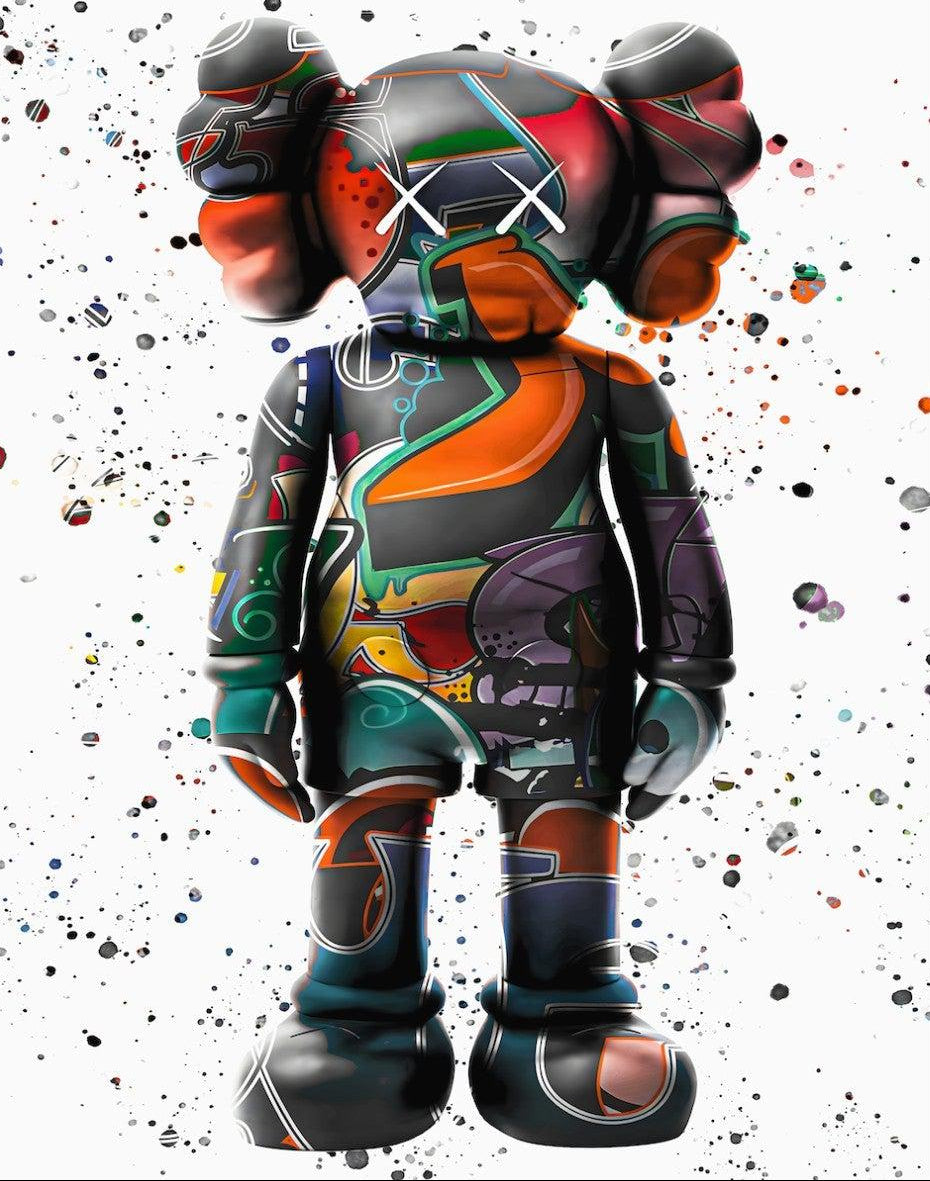 "Graffiti KAWS" features a black KAWS Companion figure overlaid with a multicoloured graffiti design. The figure stands against a white backdrop adorned with scattered paint splatters, creating a striking contrast. The bold use of colours in the graffiti design adds a layer of depth and intrigue to the piece.